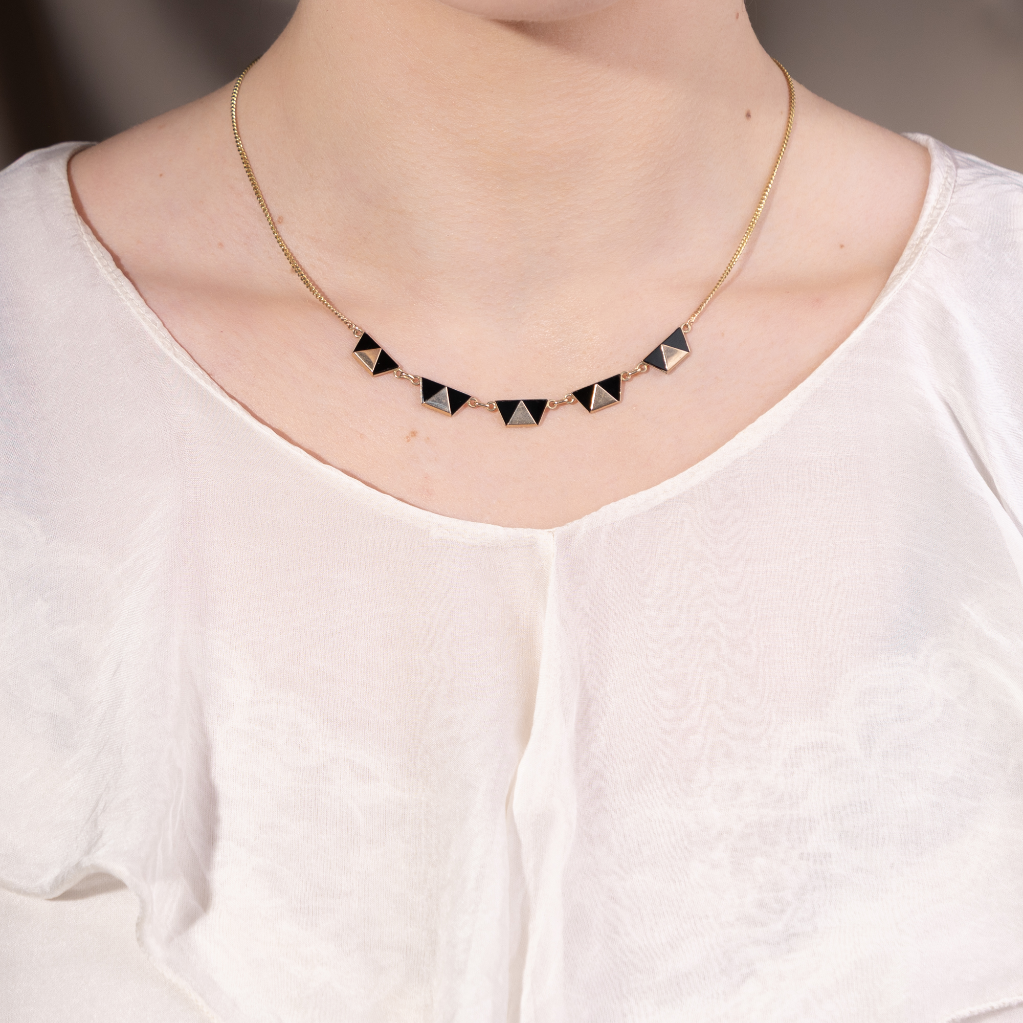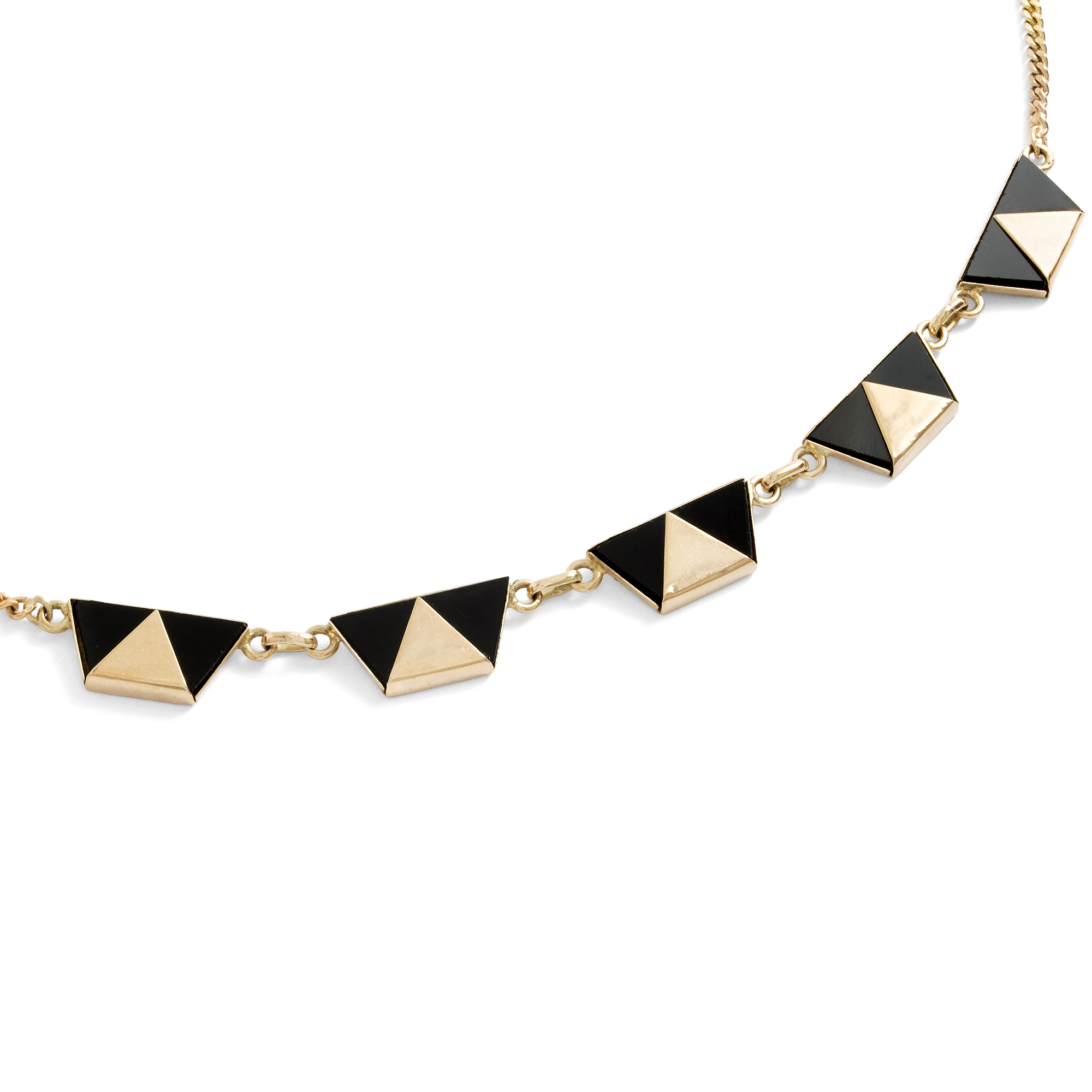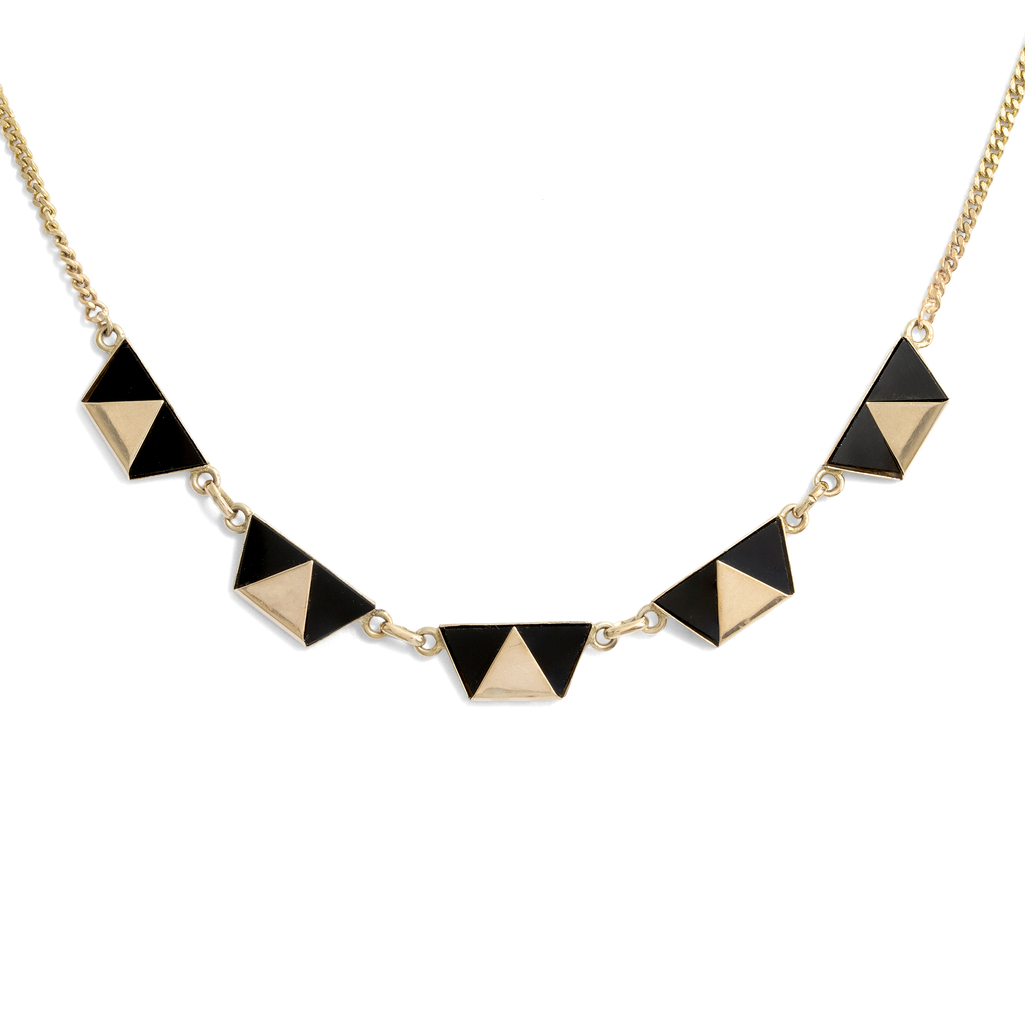 Mit dem Aufkommen der geometrischen Formensprache des Art Déco feierte auch der Onyx einen Siegeszug. Ab Beginn der 1920er Jahre lassen sich in alten Schmuckkatalogen ganze Seiten finden, die nur dem Onyxschmuck gewidmet sind. Doch gehörte eine Portion Mut dazu! Denn noch kurz zuvor und im ganzen 19. Jahrhundert waren schwarze Materialien vornehmlich für den Trauerschmuck reserviert. Erst langsam lösten sie sich aus diesem Kontext und begannen, als chic und understated zu gelten. So konnte man noch 1922 im amerikanischen The Jewelers’ Circular lesen: „Die Daily Mail gibt zu bedenken, dass Frauen sich bei der Wahl ihrer Juwelen nicht länger vom Aberglauben leiten lassen. Jett und Onyx sind nun sehr beliebt.“ (22. Februar 1922, S. 49) Auch das vorliegende Collier stammt aus dieser Epoche und ist ganz den ästhetischen Idealen seiner Zeit verpflichtet. Als Schaustück zeigt es eine Reihe von fünf Trapezen aus Onyx, die in Gold gefasst sind, sodass eine Reihe von sich abwechselnden Dreiecken entsteht. Ein wenig erinnern sie an die Mode der Pierrots, welche zur selben Zeit Europa begeisterten, z. B. in den Gemälden Picassos. Wir haben das Collier in Ostwestfalen entdeckt.