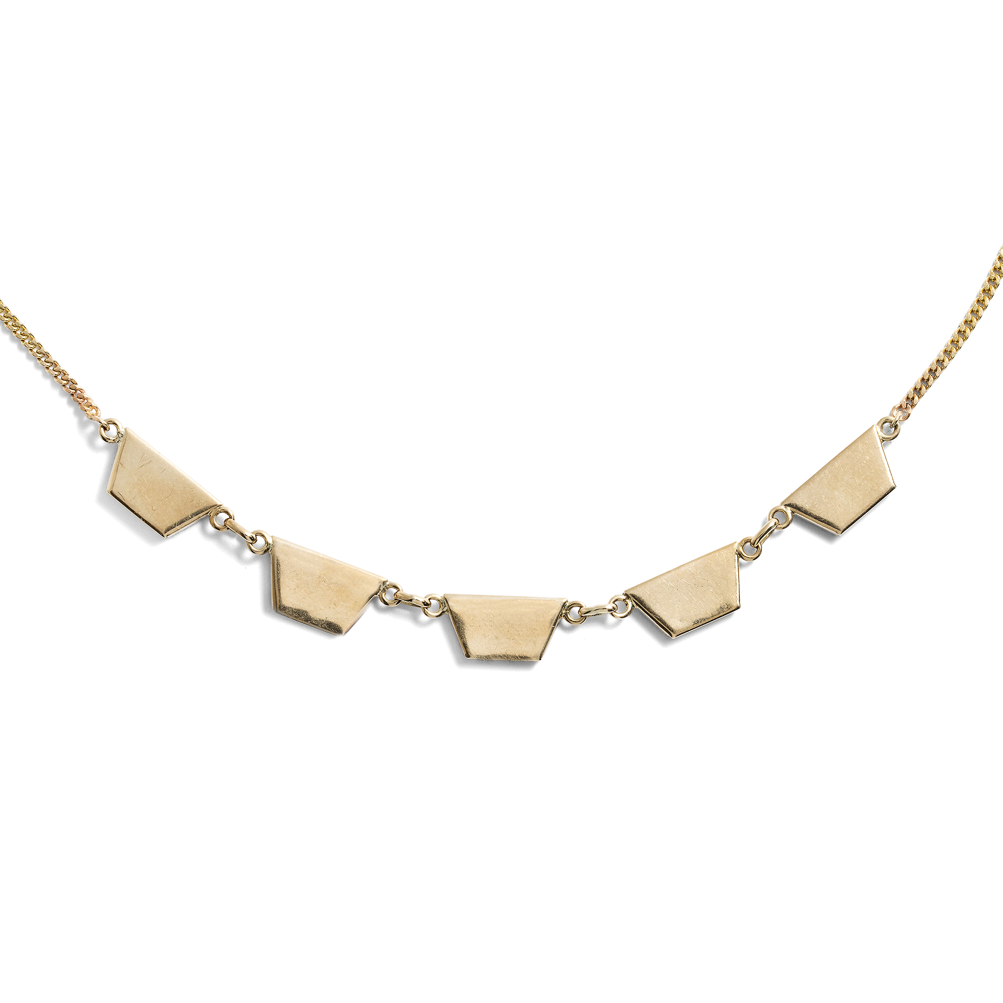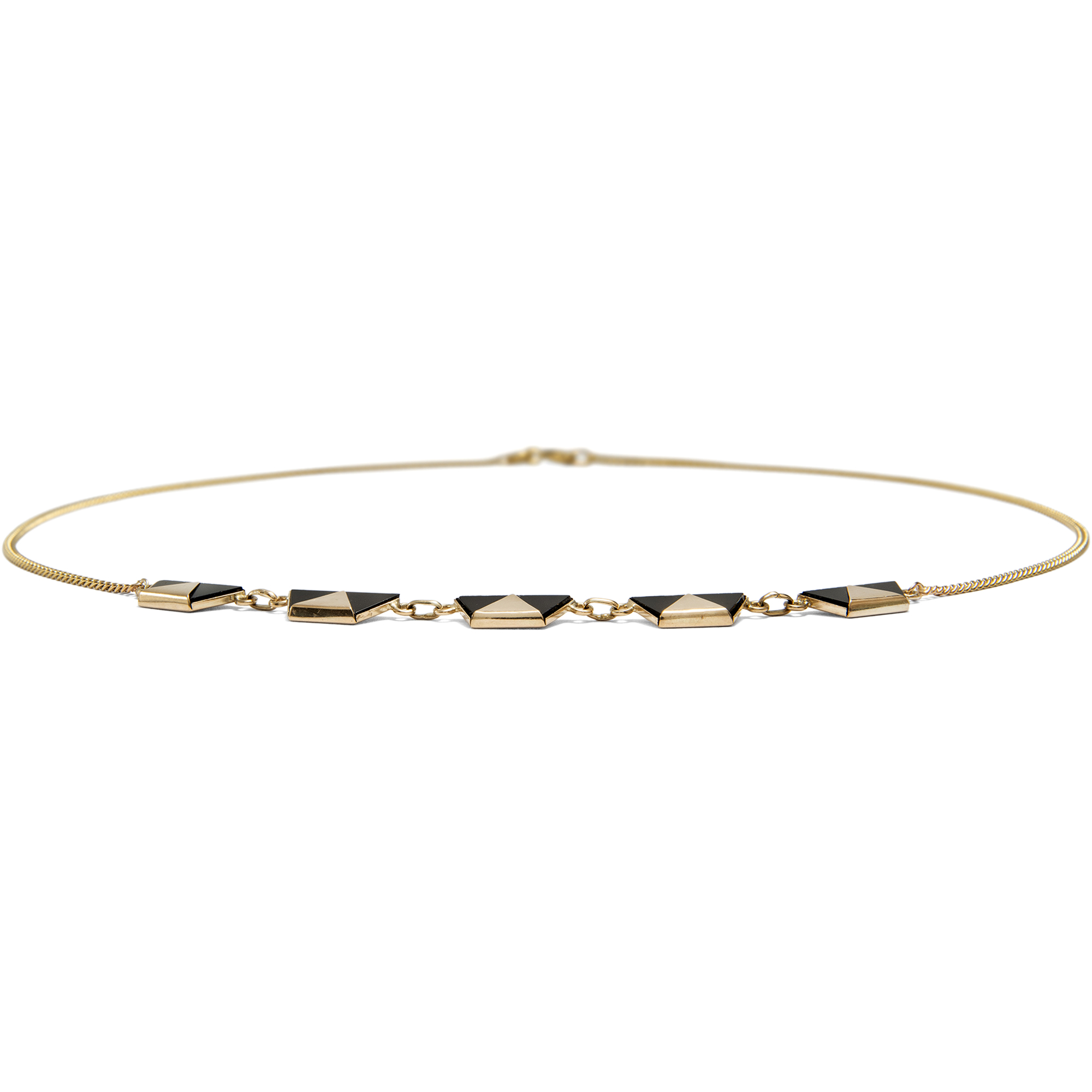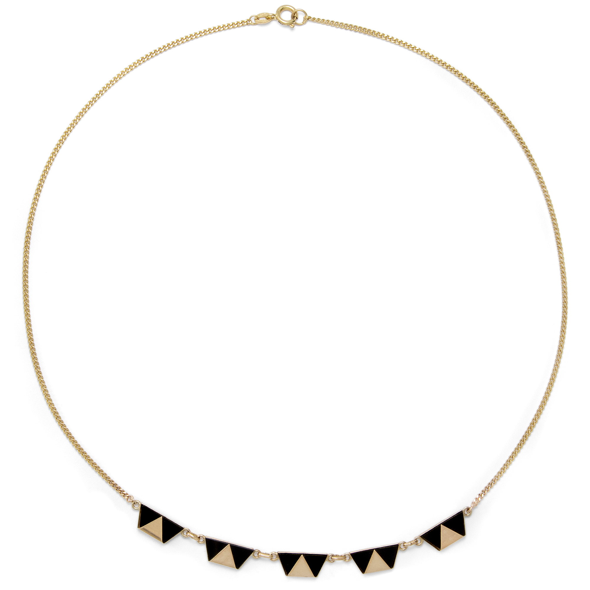 Mit dem Aufkommen der geometrischen Formensprache des Art Déco feierte auch der Onyx einen Siegeszug. Ab Beginn der 1920er Jahre lassen sich in alten Schmuckkatalogen ganze Seiten finden, die nur dem Onyxschmuck gewidmet sind. Doch gehörte eine Portion Mut dazu! Denn noch kurz zuvor und im ganzen 19. Jahrhundert waren schwarze Materialien vornehmlich für den Trauerschmuck reserviert. Erst langsam lösten sie sich aus diesem Kontext und begannen, als chic und understated zu gelten. So konnte man noch 1922 im amerikanischen The Jewelers’ Circular lesen: „Die Daily Mail gibt zu bedenken, dass Frauen sich bei der Wahl ihrer Juwelen nicht länger vom Aberglauben leiten lassen. Jett und Onyx sind nun sehr beliebt.“ (22. Februar 1922, S. 49) Auch das vorliegende Collier stammt aus dieser Epoche und ist ganz den ästhetischen Idealen seiner Zeit verpflichtet. Als Schaustück zeigt es eine Reihe von fünf Trapezen aus Onyx, die in Gold gefasst sind, sodass eine Reihe von sich abwechselnden Dreiecken entsteht. Ein wenig erinnern sie an die Mode der Pierrots, welche zur selben Zeit Europa begeisterten, z. B. in den Gemälden Picassos. Wir haben das Collier in Ostwestfalen entdeckt.