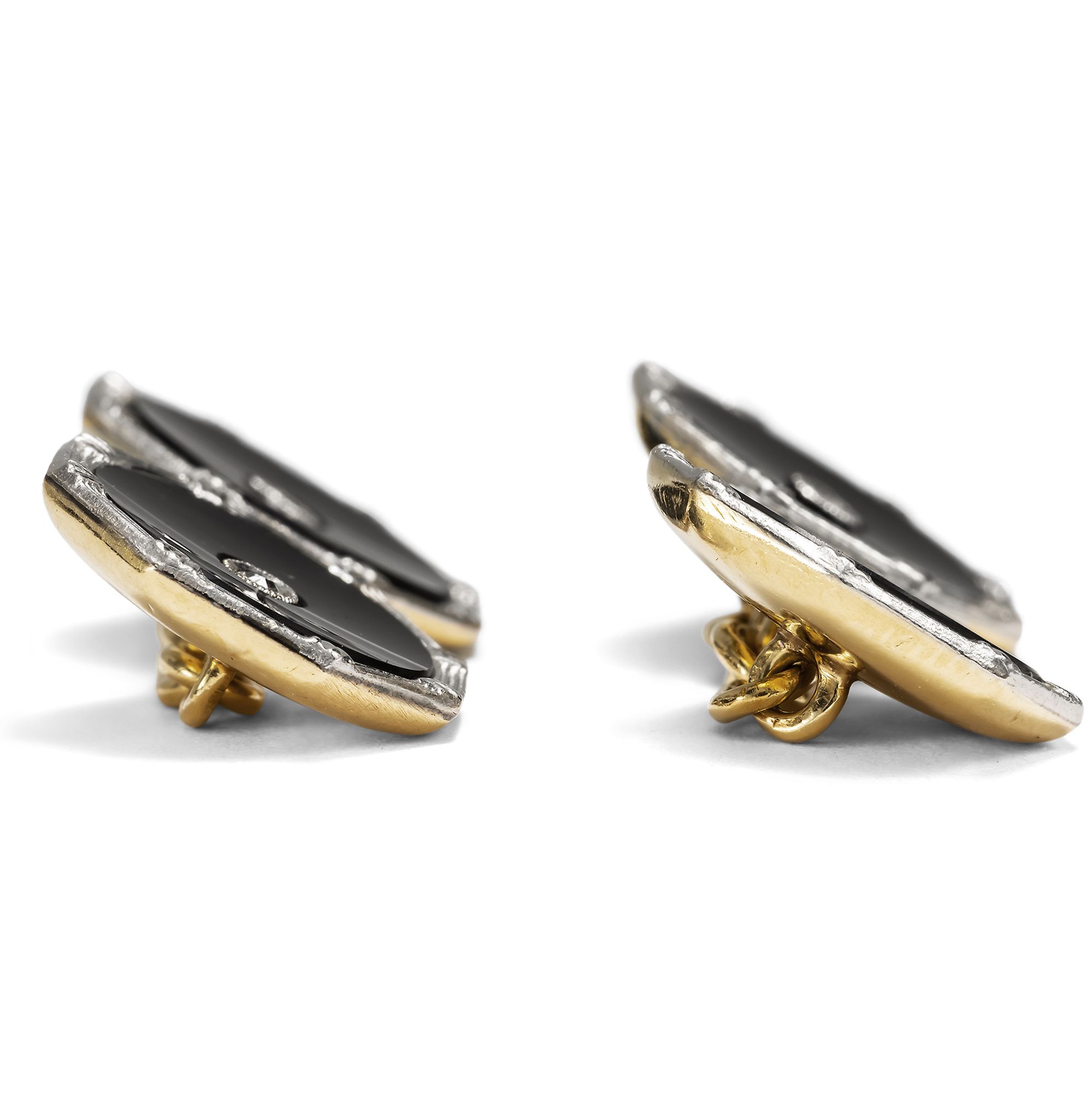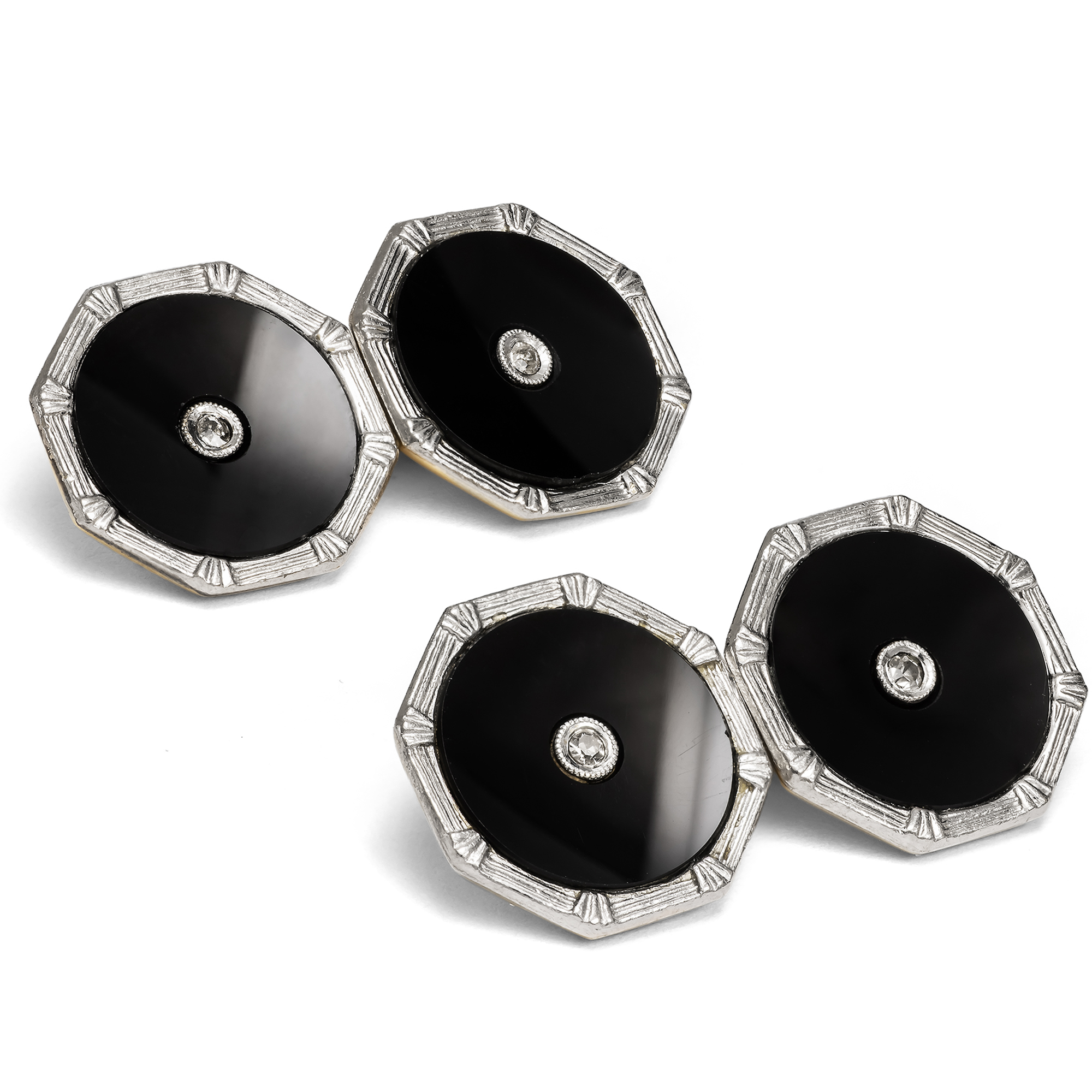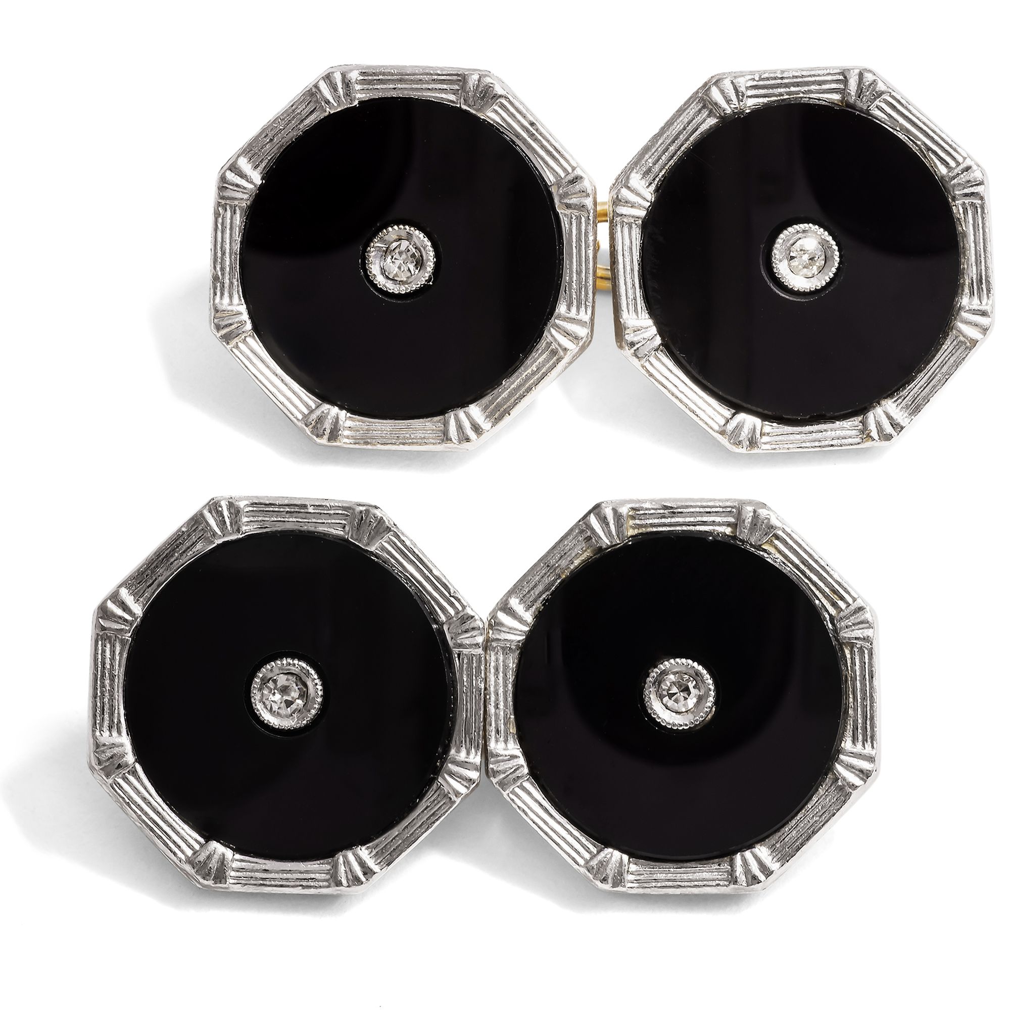 Manschettenknöpfe zählen zu den wenigen Schmuckstücken der klassischen Herrengarderobe. Zunächst kamen sie in der zweiten Hälfte des 19. Jahrhunderts auf, als gestärkte Hemden zum Schließen mit gewöhnlichen Knöpfen zu starr wurden; doch schon bald entwickelten sich zahlreiche Formen des Manschettenknopfs, die allesamt mit der Schmuckmode ihrer Zeit gingen. Das vorliegende Paar lässt sich in die Jahre um 1920 datieren, denn erst in den ersten Dekaden des vorigen Jahrhunderts kam Onyx als Hauptstein auch im rein dekorativen Schmuck in Mode; zuvor war er dem Trauerschmuck vorbehalten. Doch nun, mit dem Beginn der klassischen Moderne, legte man alle Vorbehalte gegenüber dieser Nichtfarbe ab und schätzte sie für ihre klassische Eleganz. In einer zeitlos eleganten Komposition treffen hier Gegensätze aufeinander. Vier runde Scheiben aus tiefschwarzem Onyx, gleich konkav gebogen, umrahmen jeweils einen kleinen Achtkantdiamanten. Gefasst sind die Onyxe und die Diamanten in hellem Platin. Rückseitig bestehen die Knöpfe und die zugehörigen Kettchen aus hochkarätigem Gelbgold. Wir bilden zur Datierung eine Seite aus dem Katalog des Juweliers Kind & Sons aus Philadelphia aus dem Jahr 1920 ab, die vergleichbare Knöpfe zeigt. Die Manschettenknöpfe sind sehr gut erhalten und fanden aus München zu uns. Ausweislich ihrer Punzierung sind die Knöpfe in Großbritannien entstanden.