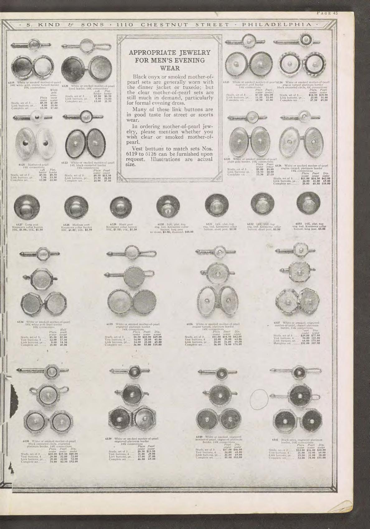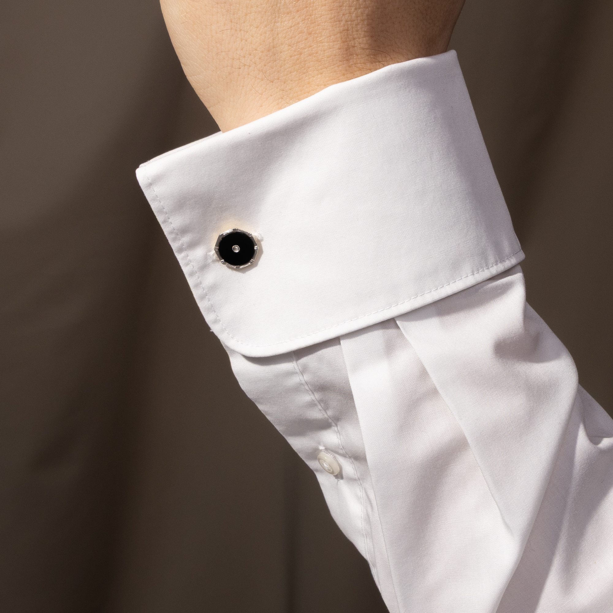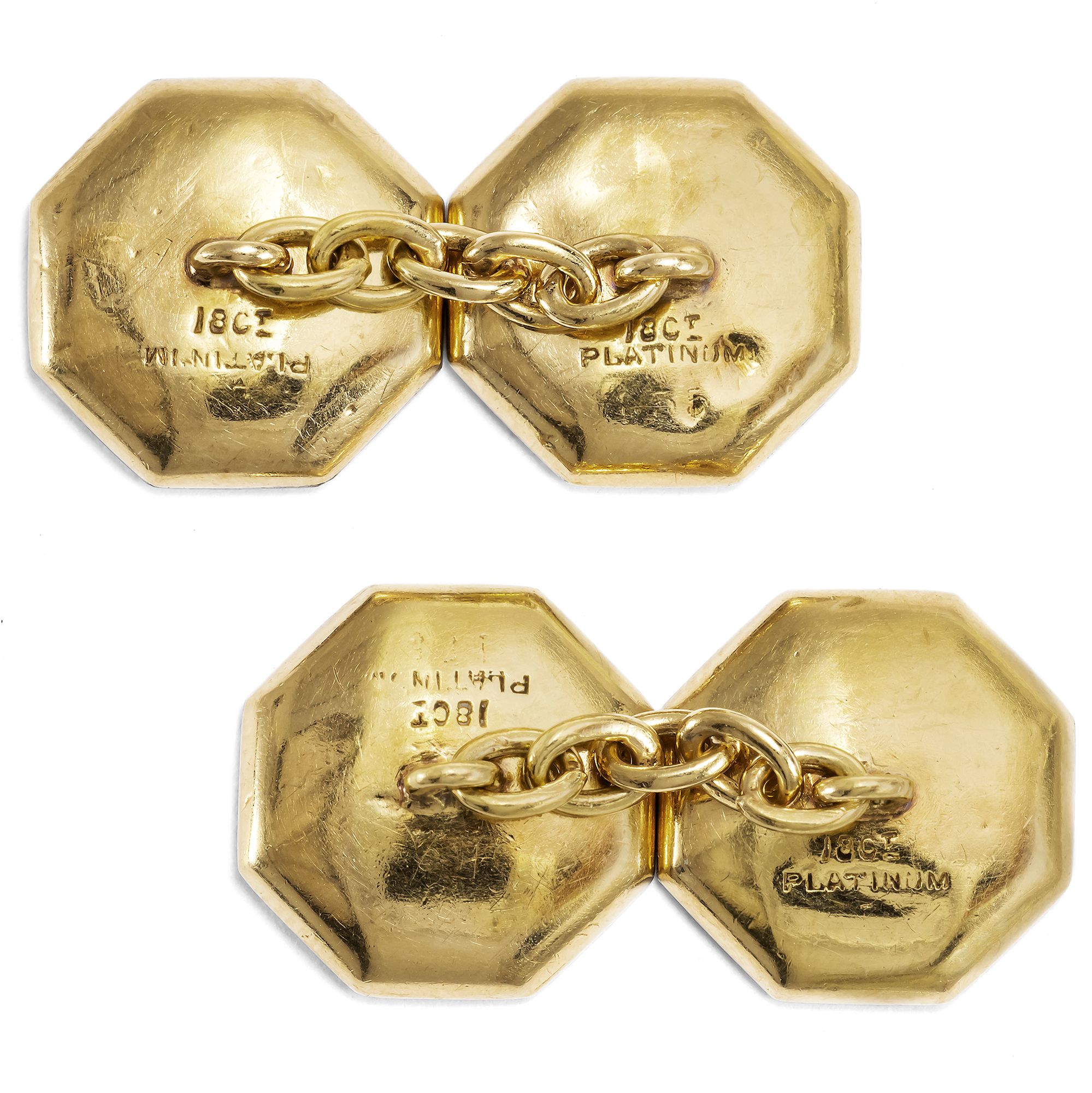 Manschettenknöpfe zählen zu den wenigen Schmuckstücken der klassischen Herrengarderobe. Zunächst kamen sie in der zweiten Hälfte des 19. Jahrhunderts auf, als gestärkte Hemden zum Schließen mit gewöhnlichen Knöpfen zu starr wurden; doch schon bald entwickelten sich zahlreiche Formen des Manschettenknopfs, die allesamt mit der Schmuckmode ihrer Zeit gingen. Das vorliegende Paar lässt sich in die Jahre um 1920 datieren, denn erst in den ersten Dekaden des vorigen Jahrhunderts kam Onyx als Hauptstein auch im rein dekorativen Schmuck in Mode; zuvor war er dem Trauerschmuck vorbehalten. Doch nun, mit dem Beginn der klassischen Moderne, legte man alle Vorbehalte gegenüber dieser Nichtfarbe ab und schätzte sie für ihre klassische Eleganz. In einer zeitlos eleganten Komposition treffen hier Gegensätze aufeinander. Vier runde Scheiben aus tiefschwarzem Onyx, gleich konkav gebogen, umrahmen jeweils einen kleinen Achtkantdiamanten. Gefasst sind die Onyxe und die Diamanten in hellem Platin. Rückseitig bestehen die Knöpfe und die zugehörigen Kettchen aus hochkarätigem Gelbgold. Wir bilden zur Datierung eine Seite aus dem Katalog des Juweliers Kind & Sons aus Philadelphia aus dem Jahr 1920 ab, die vergleichbare Knöpfe zeigt. Die Manschettenknöpfe sind sehr gut erhalten und fanden aus München zu uns. Ausweislich ihrer Punzierung sind die Knöpfe in Großbritannien entstanden.