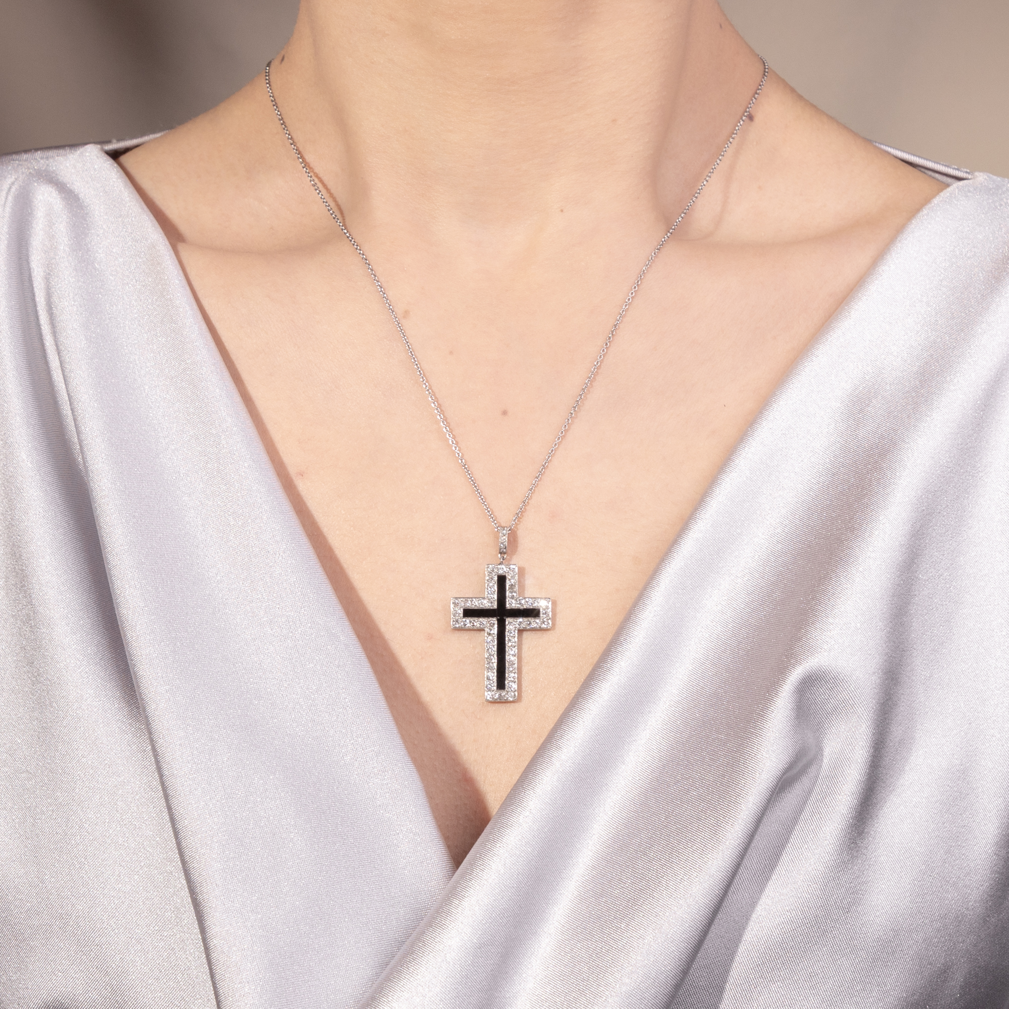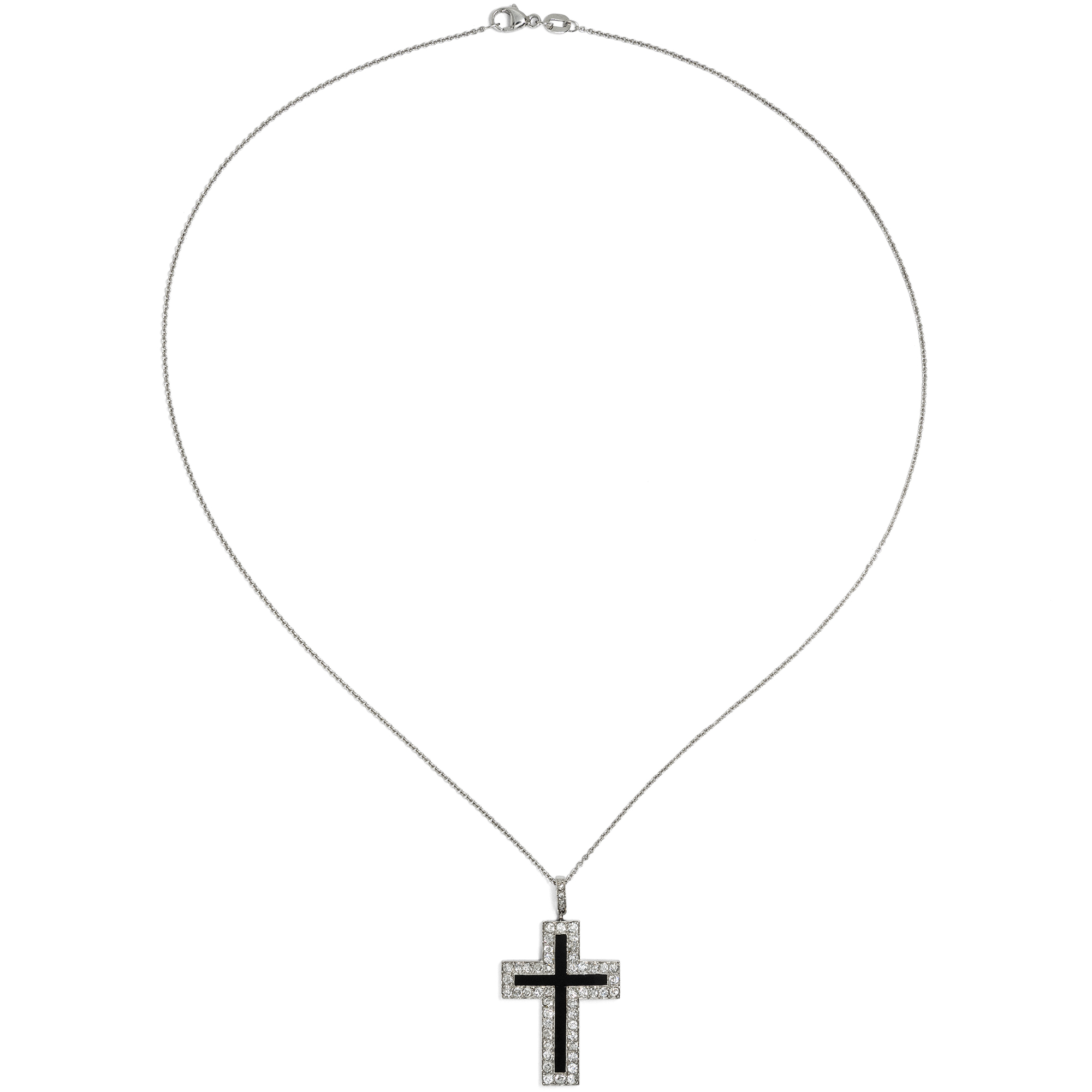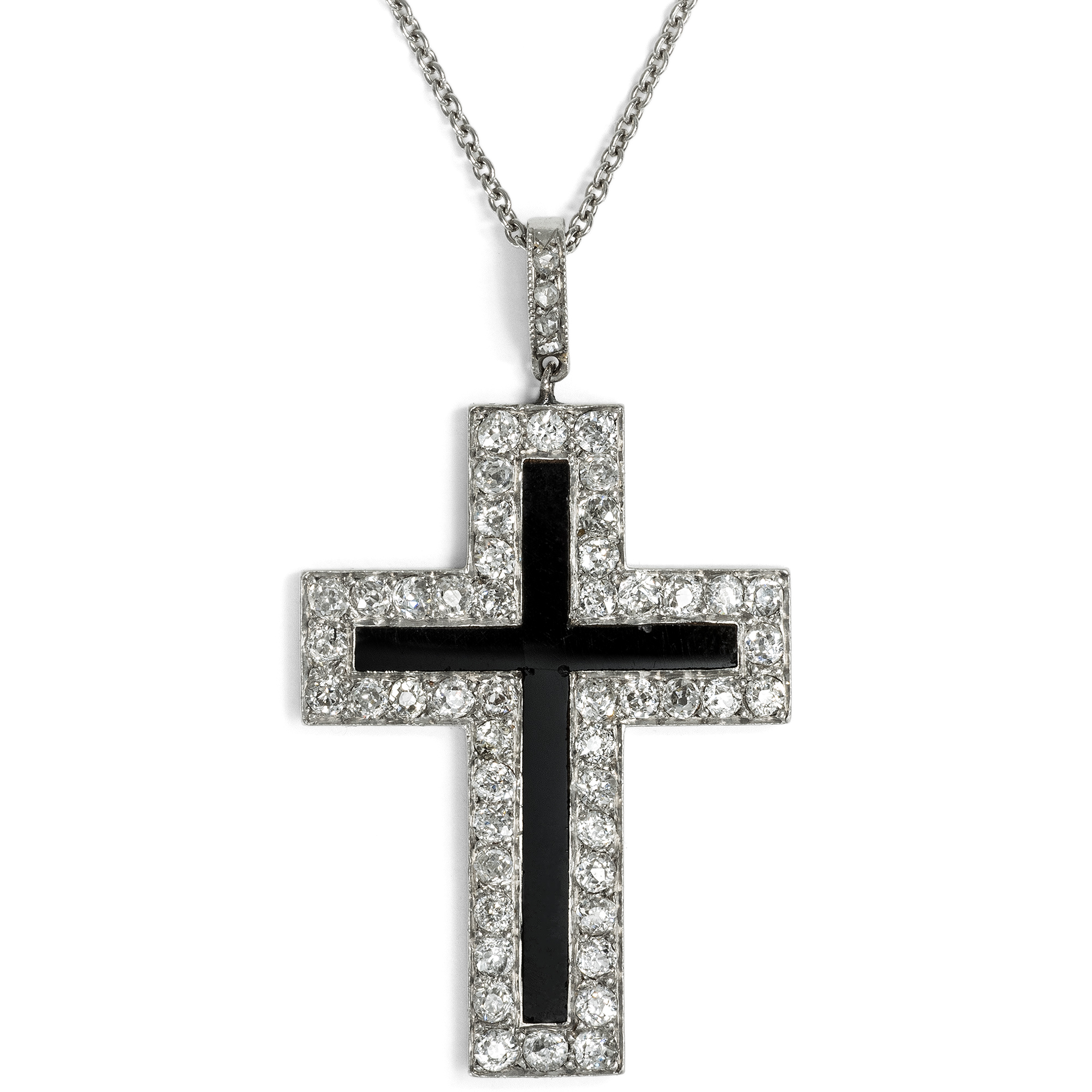 Das Kreuz ist in der westlichen Schmuckgeschichte eine stete Konstante: Ob als prachtvoll ausgestattetes Exemplar mit Rubinen und Diamanten im Rokoko, von einer Hofdame am Samtband getragen – oder ob in den vielfachen Varianten des bürgerlichen Schmucks des 19. Jahrhunderts. An die wechselnden Geschmäcker angeglichen, war der Kreuz-Anhänger oftmals Bekenntnis zum Glauben und zur Mode zugleich. Selbst im avantgardistischen Art Déco der 1920er Jahre entstanden Exemplare, die dieser grafischen, geometrischen Formensprache huldigten. Das vorliegende Kreuz fand aus Paris zu uns, und in Frankreich ist es auch entstanden. Es zeigt sich in eleganter Schwarz-Weiß-Monochromie aus massivem Platin und einer Einlage aus tiefschwarzem Onyx. Ein Kranz aus achtundvierzig Diamanten von über einem Karat rahmt den schwarzen Stein. Eine Schlaufe mit vier Diamantrosen leitet zur modernen Platinkette über, die wir zu dem Kreuz ergänzt haben. So kann es sofort um den Hals getragen werden. Das Schmuckstück ist von ausgesprochen feiner Qualität und ein Kreuz, das man sicherlich gern trägt!