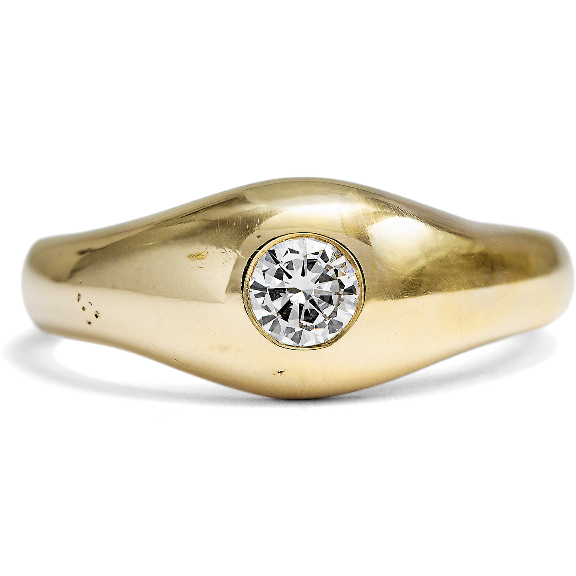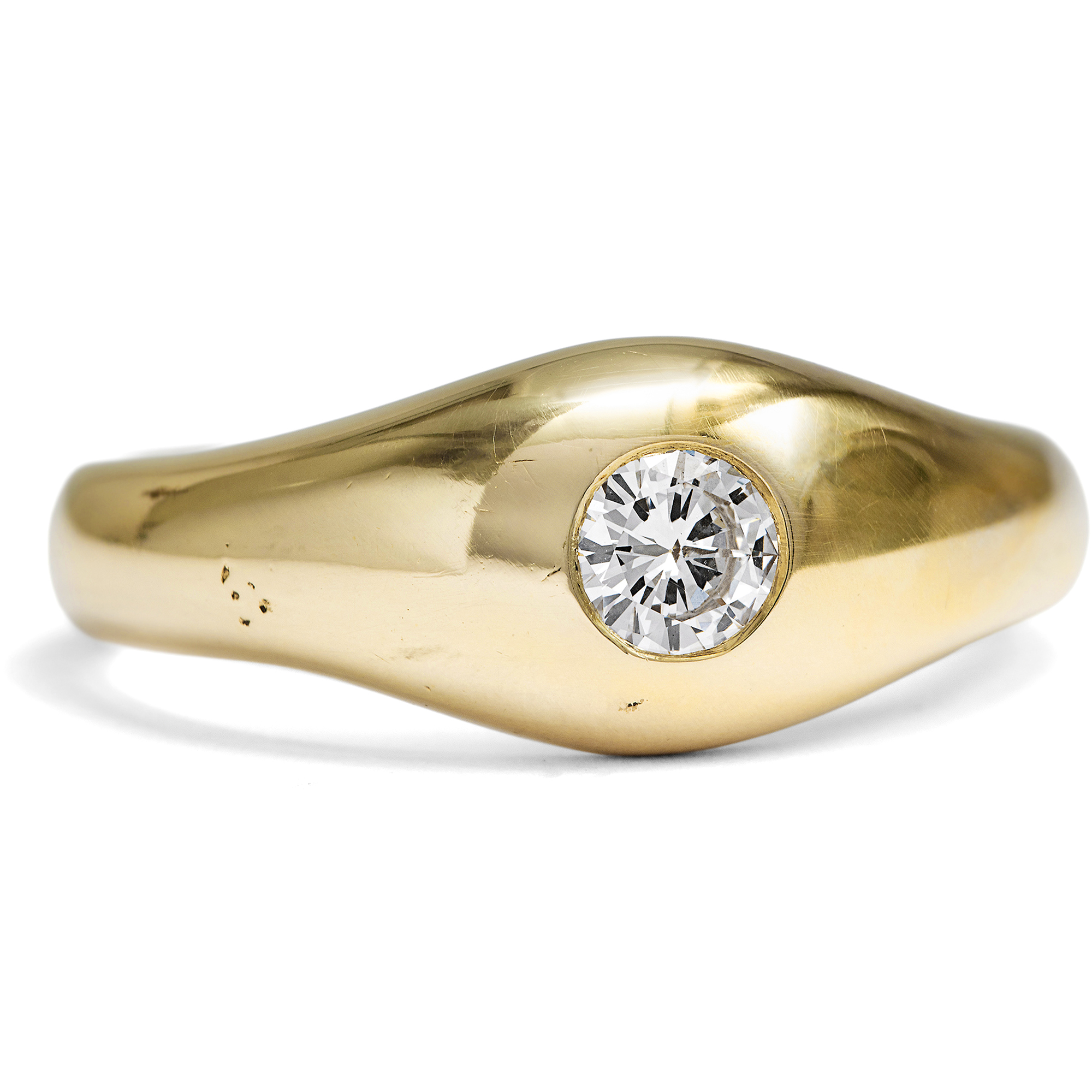 Einige Schmuckstücke gewinnen durch opulente Formen und reiches Detail – andere glänzen durch Zurückhaltung und fokussieren den Blick auf das Wesentliche. Solch ein Schmuckstück ist auch dieser Ring. Schlicht, massiv und zugleich ungemein effektvoll zeigt sich der gegen Ende des 20. Jahrhunderts entstandene Ring. Der glatte Bandring ist aus 14-karätigem Gelbgold gearbeitet und präsentiert einen schönen Brillanten als Solitär. Der Diamant hat ein Gewicht von etwa 0,33 Karat und leuchtet in reinem Weiß mit schönem Lichtspiel und sehr guter Reinheit. Der schlichte Ring besticht durch seine edlen Materialien, seine schöne Verarbeitung und überzeugende Formensprache. Zu uns kam er aus dem Rheinland.