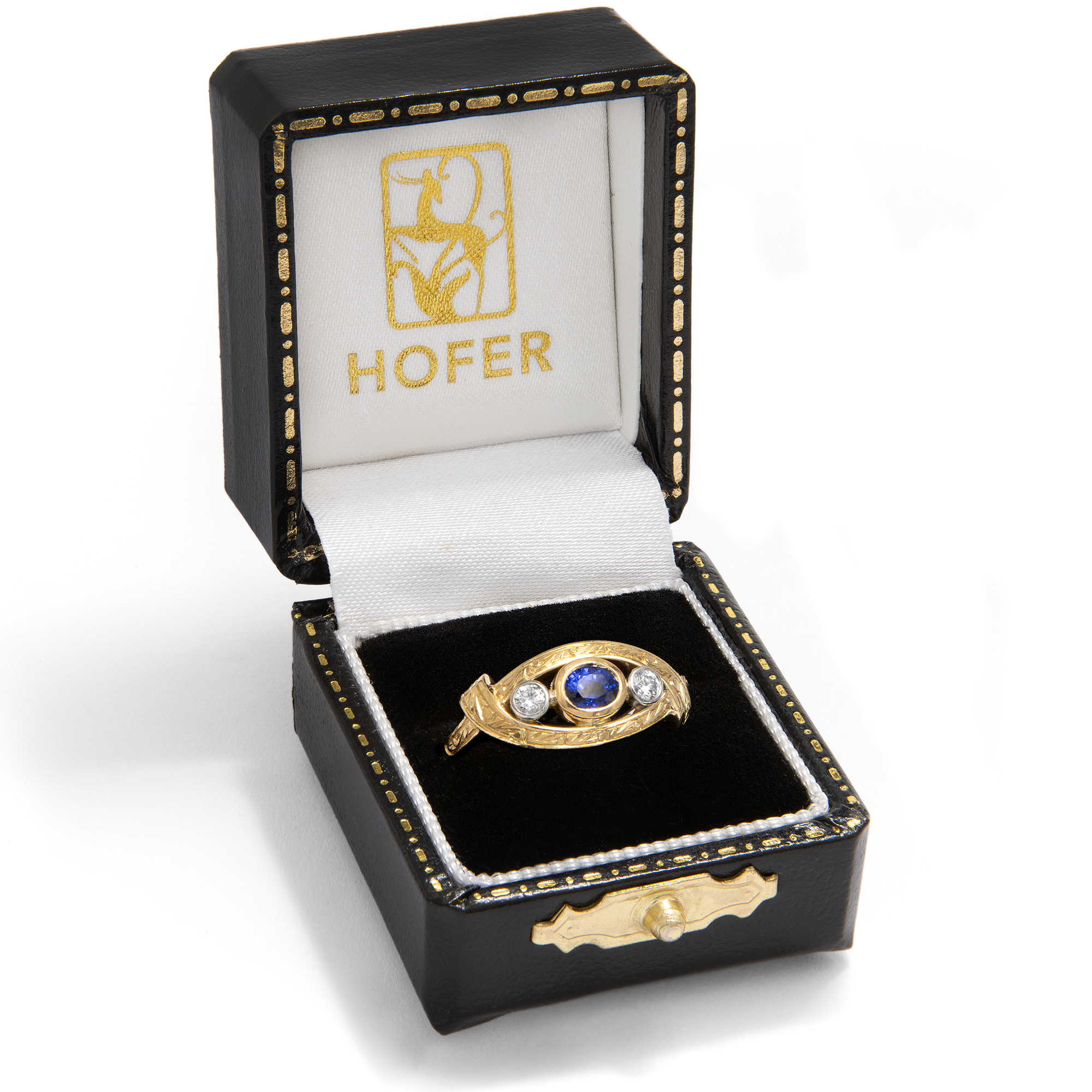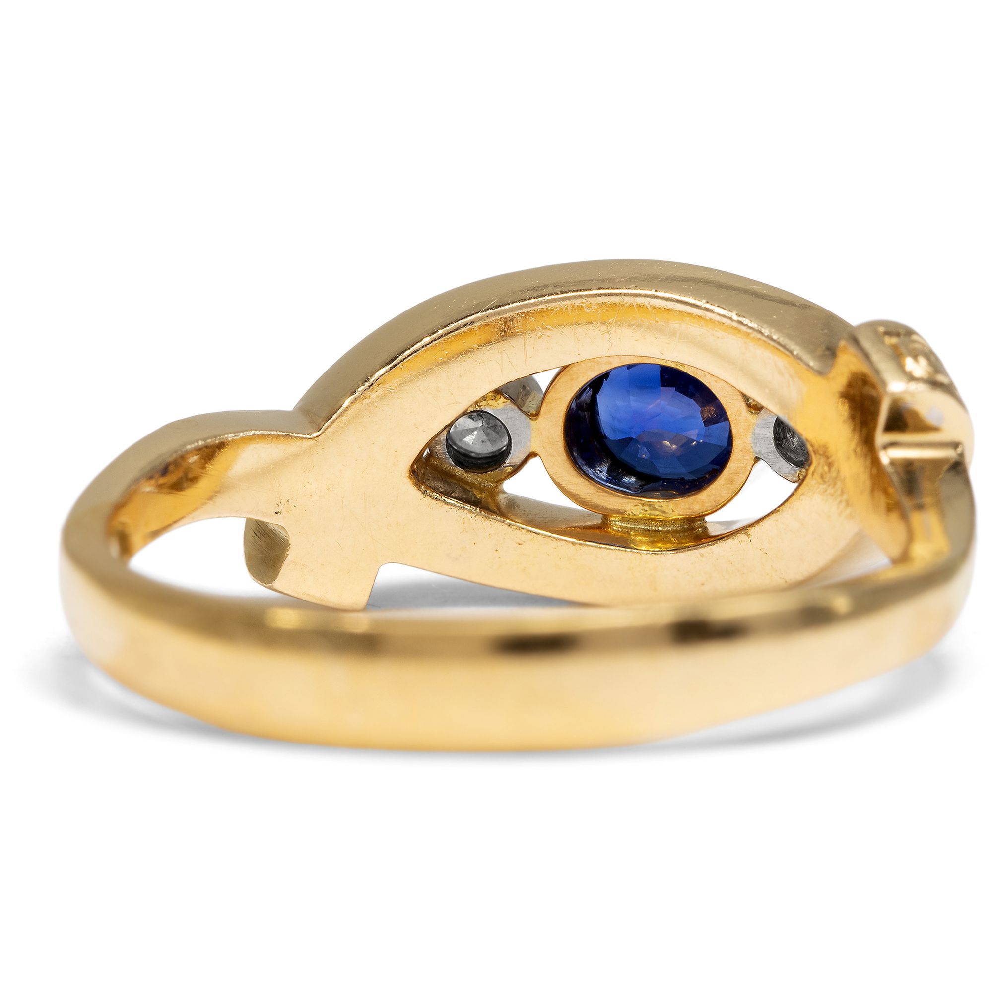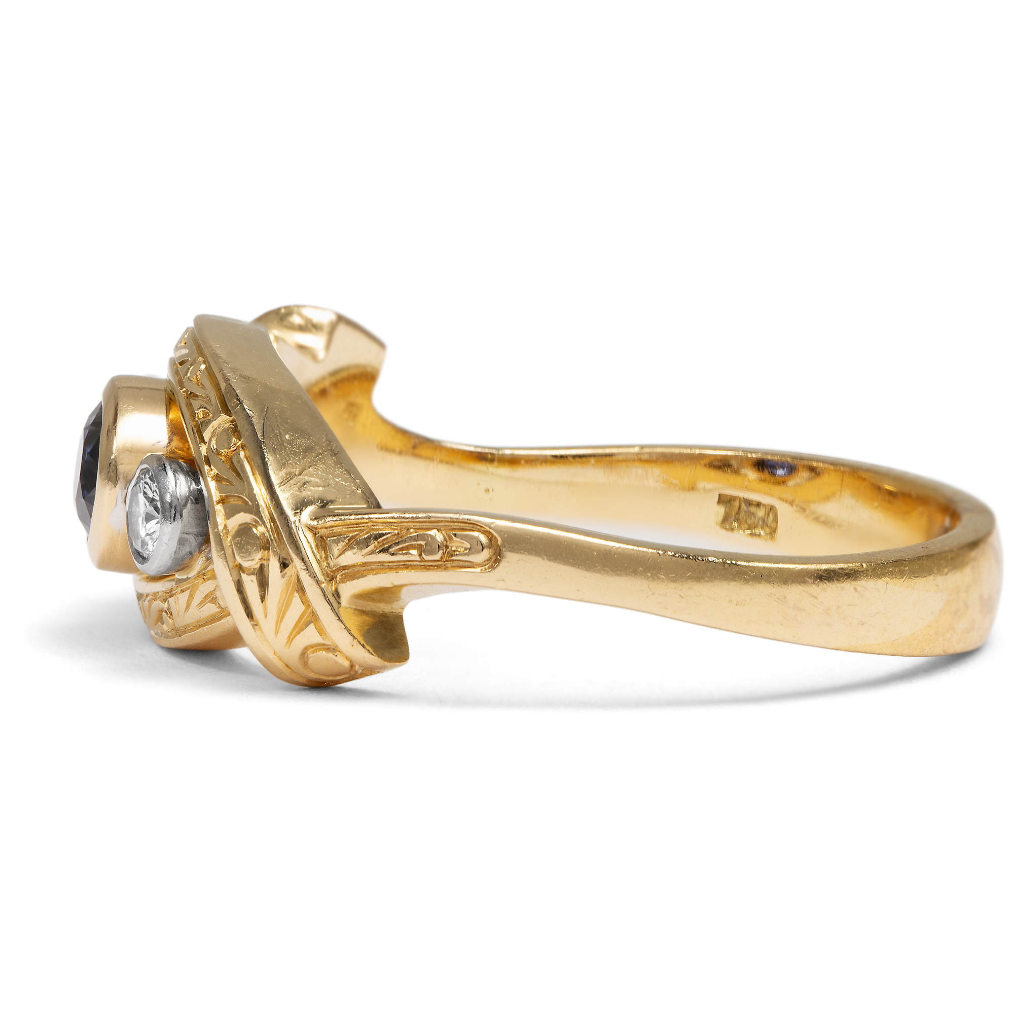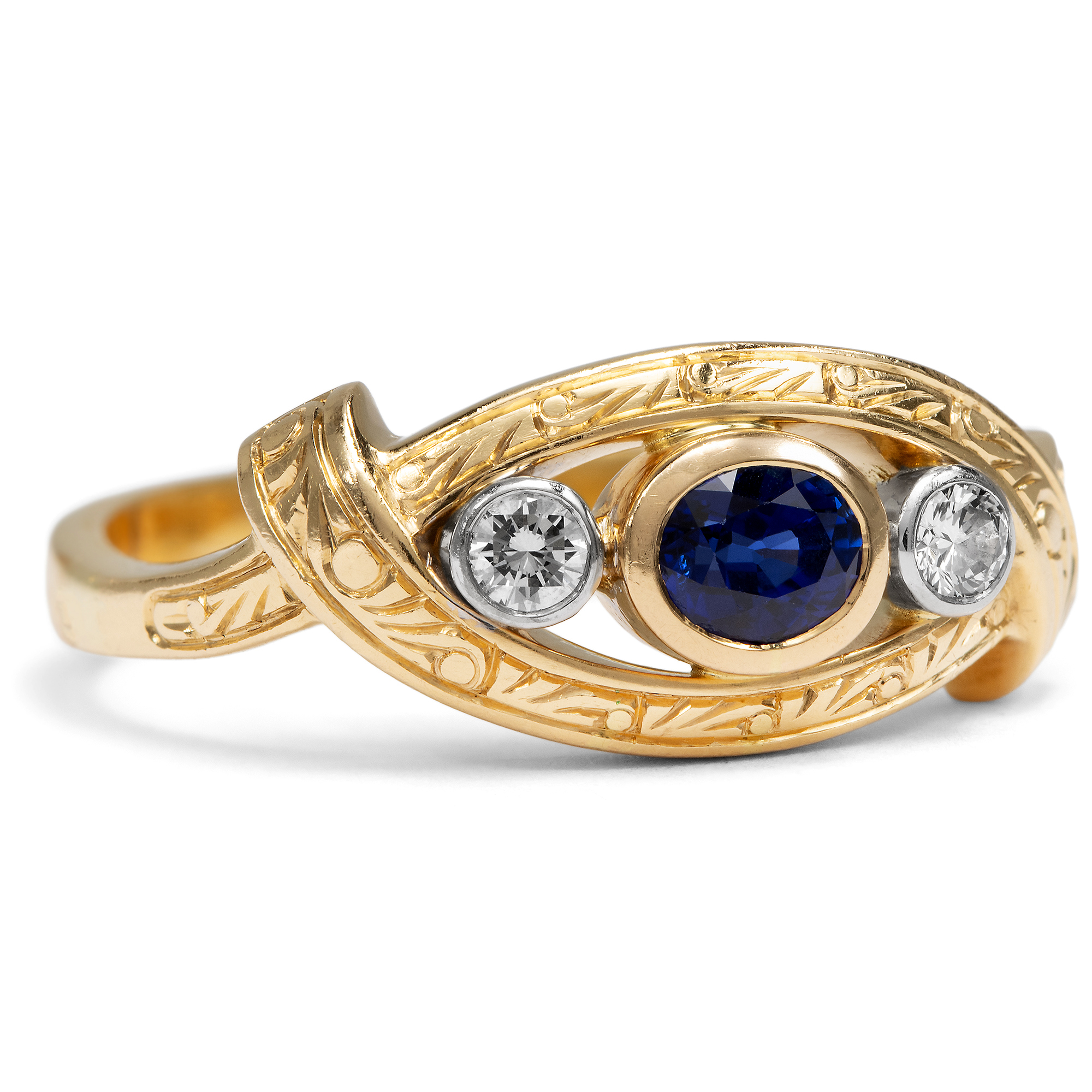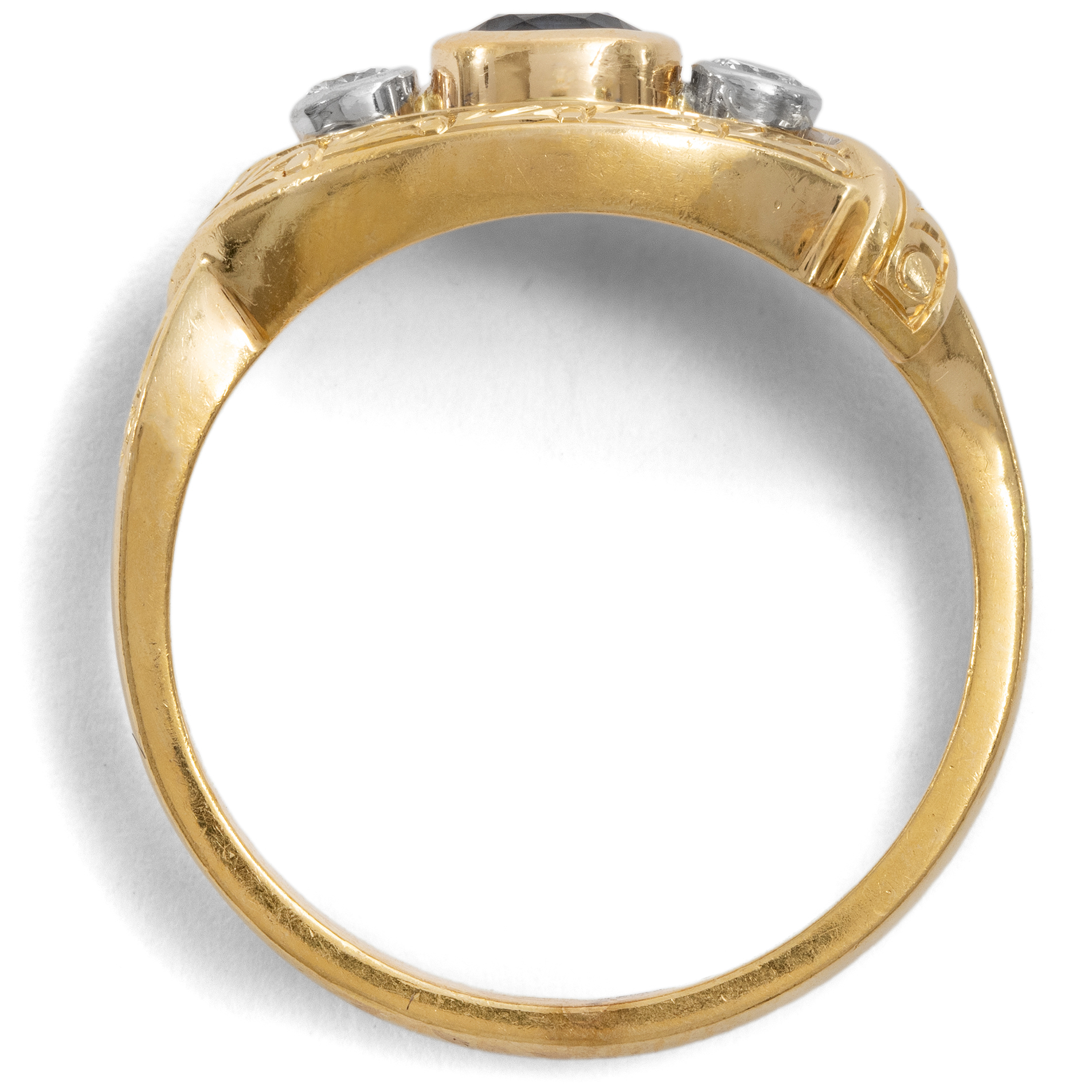 Dieser luxuriöse Ring aus den Jahren um 1985 vereint Farbe und handwerkliche Präzision. Der Ring aus hochkarätigem Gelbgold trägt auf seiner breiten Schiene drei kostbare Edelsteine: Ein tiefblauer Saphir steht im Mittelpunkt, begleitet von zwei qualitätvollen Brillanten. Ihr klares, weißes Licht den Glanz der Farbsteine noch verstärkt. Die Edelsteine werden von stabilen Zargen gehalten, die beim Tragen keine Fäden ziehen. Die Fassungen der Diamanten sind dabei aus Platin gearbeitet. Feine florale Gravuren beleben die ovale Rahmung der Edelsteingruppe. Die kraftvolle Formensprache, die Freude an der Farbe und das kompakte Erscheinungsbild machen den Ring zu einem zeittypischen Schmuckstück der 1980er Jahre. Der farbenfrohe Begleiter vereint Qualität und Schönheit. Wir haben ihn hier in Berlin entdeckt.