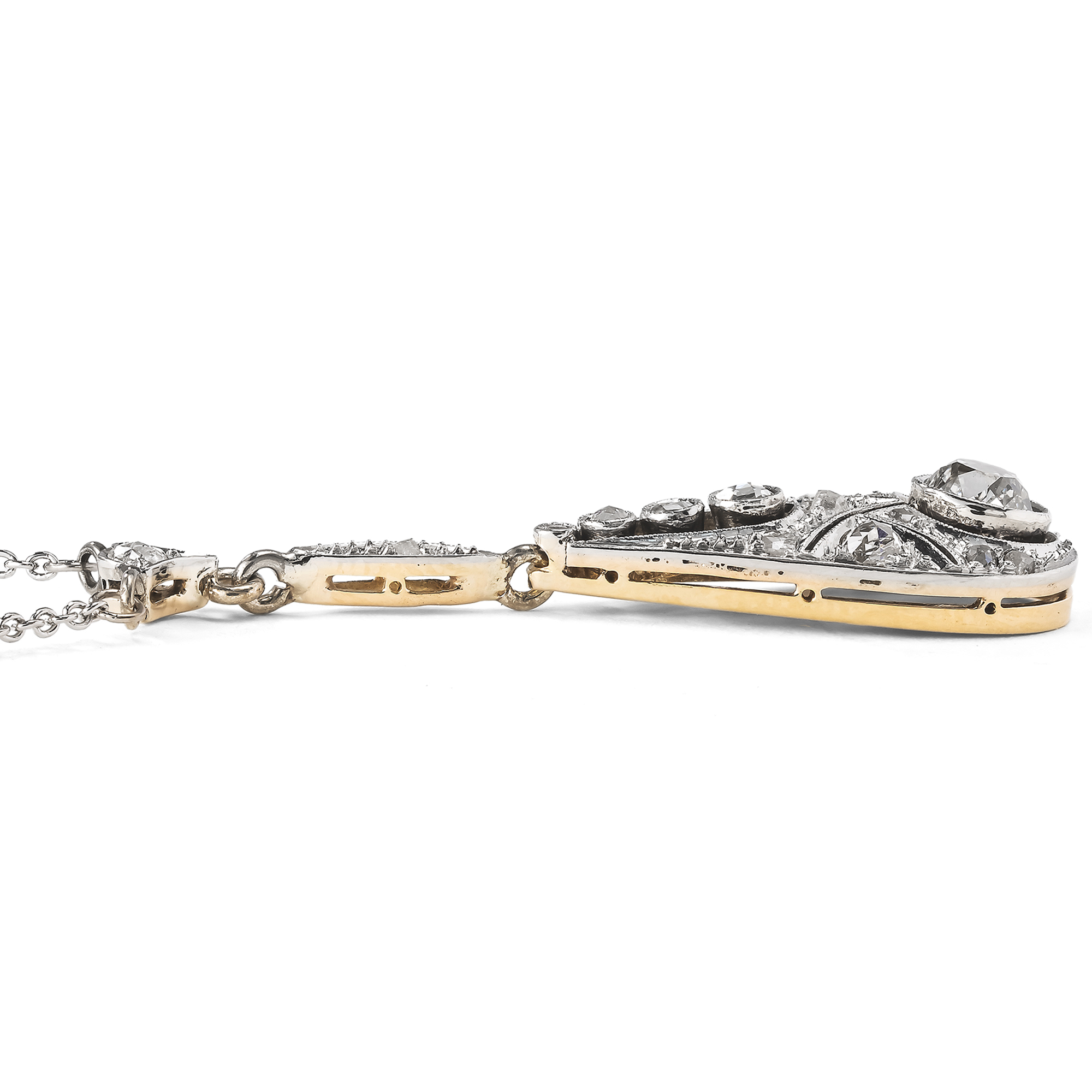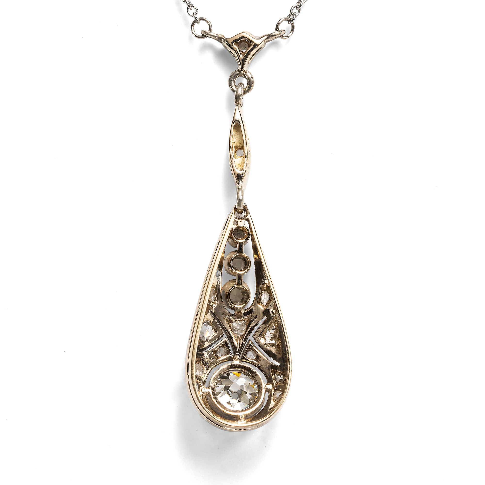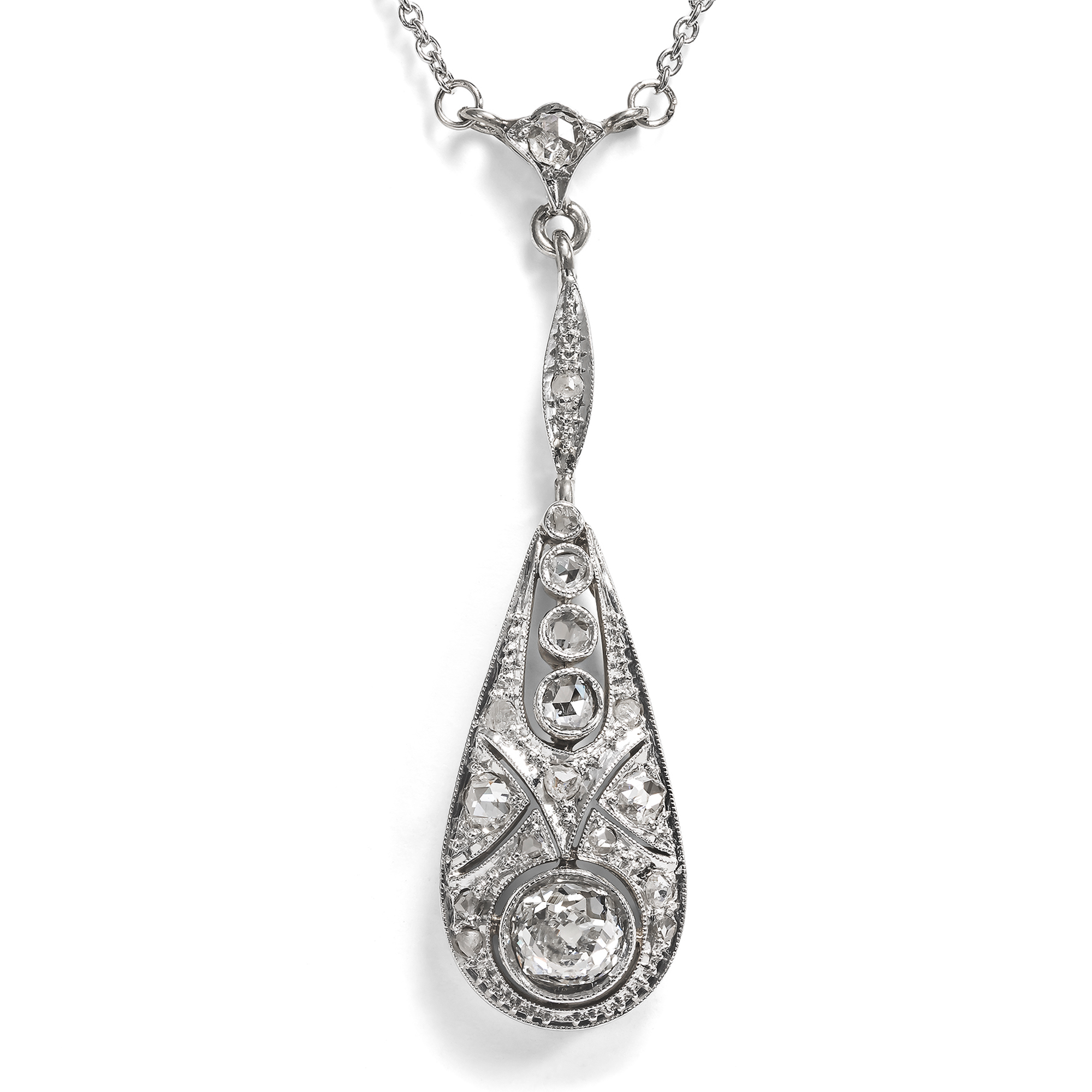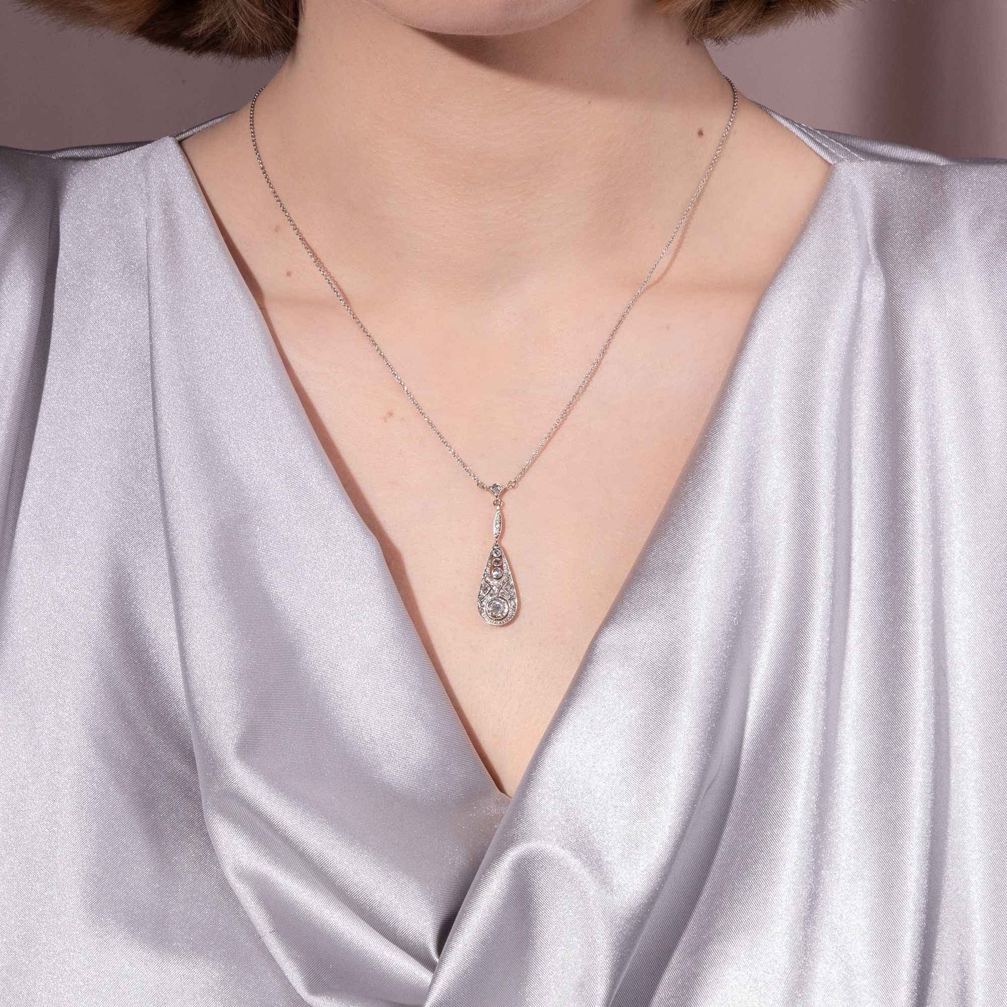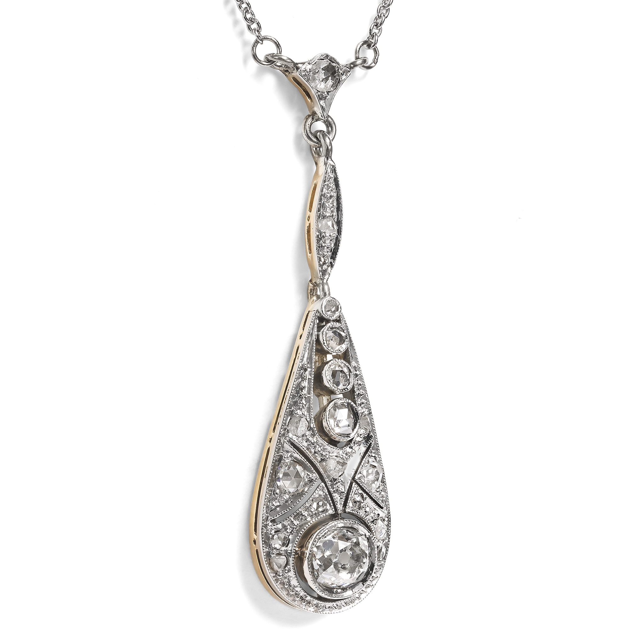 Kaiserliche Juwelen, dutzende Karat schwere Diamanten und ebensolche Naturperlen liegen heute in Museen hinter Stahl und Glas, als stumme Zeugen einer vergangenen Zeit. Dabei waren es nicht diese Stücke, die einst das Bild der uns heute fernen Epochen prägten: Es waren die kleineren, tragbaren, doch nicht weniger schön gearbeiteten Juwelen, welche den Geschmack einer Epoche prägten. Solche vielleicht, die man einer jungen Mutter schenkte, welche die Debütantin zum ersten Ball trug oder auf die man lange sparte, um sie endlich der Angebeteten zu verehren. Diese Colliers, Ringe und Armreife wurden geliebt und getragen, man sah sie in den Salons der gehobenen Bürger, auf Bällen und zu Festtagen. In diesem Sinne schon 1904 die Deutsche Goldschmiede-Zeitung, „wo anders als im Privatbesitz sind dann die lebendigen Zeugen der Schönheit unserer Zeit und ihres Strebens aufzuheben und zu bewahren?“ (DGZ 1904, S. 154). Ein solcher lebendiger Zeuge, wie aus der Zeit gegriffen, ist das hier vorliegende Collier. Es ist fein und zart gearbeitet, war schon damals ein kostbarer Abendschmuck; doch ist es im Format dezent genug, um nicht nur Sammlerstück, sondern auch tragbar zu sein. Das Collier ist mit einem fest montierten Anhänger in Y-Form gestaltet, der unter einer feinen Platinkette pendelt. In der Mitte des tropfenförmigen Anhänger leuchtet ein kissenförmiger Altschliff-Brillant von etwa 0,44 ct und versprüht bei jeder Bewegung Feuer. Frostig glitzernde Diamantrosen und feine Millegriffes lassen das gesamte Arrangement wie eine Komposition aus Licht erscheinen. Das Collier entstand, ausweislich seines Entwurfs und seiner Verarbeitung, in den wilden 1920er-Jahren. Es ist fein und zart gearbeitet und zugleich kostbar ausgestattet, doch im Format dezent genug, um nicht nur ein Sammlerstück zu sein, sondern auch tragbar zu bleiben. Dieses Collier fand hier in Berlin zu uns.