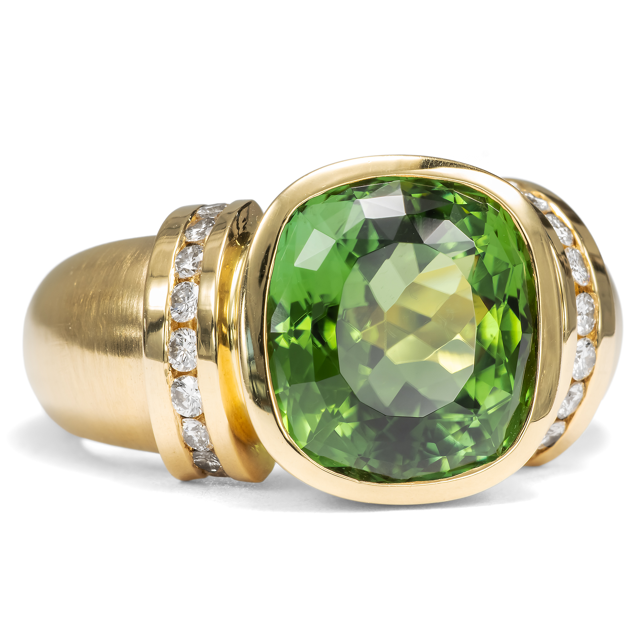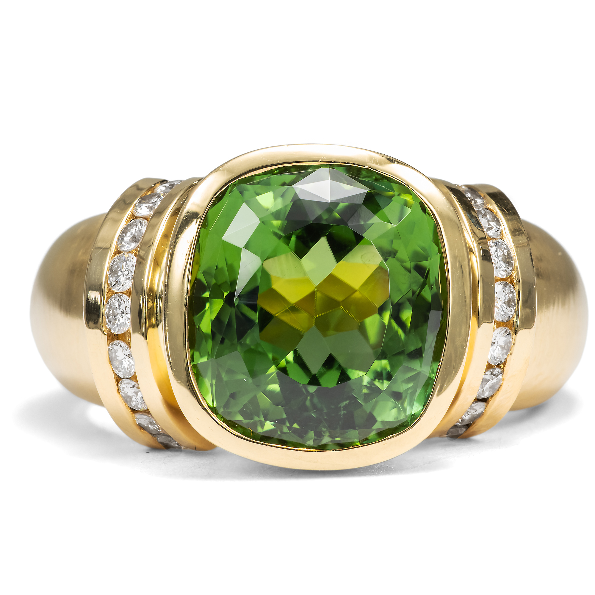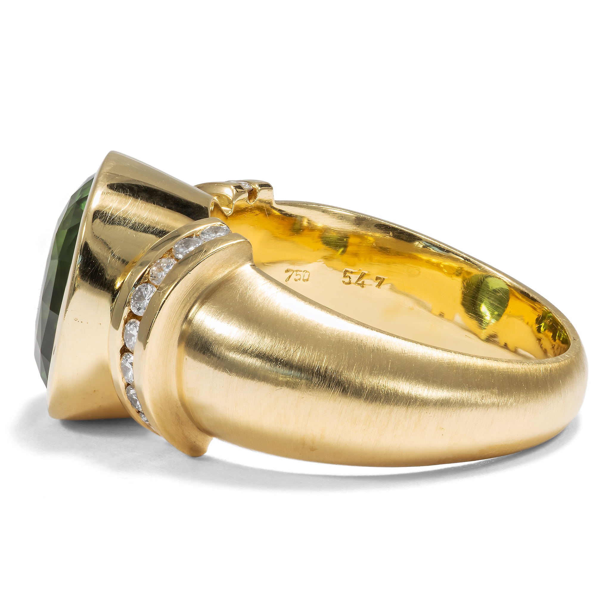 Wussten Sie, dass der Turmalin in der Natur in ganz unterschiedlichen Farben vorkommt? Bereits die Herkunft seines Namens verweist auf seine Farbenvielfalt: „Turmalin“ leitet sich vom singhalesischen Begriff „turmali“ ab, was so viel wie „Stein mit gemischten Farben“ bedeutet. Eine besonders schöne, grüne Variante des Turmalins, ein sog. Verdelith, ist in dem hier vorliegenden Ring eingefasst. Wie moosbedeckter Waldboden wirkt der dunkelgrüne Edelstein, wobei seine Farbe mal heller, mal dunkler wirkt und sich, je nach Betrachterwinkel, verändert. Der kissenförmig geschliffene Stein besitzt ein Gewicht von 5,47 Karat. Durch das warme Leuchten des Goldes ringsum erinnert er noch einmal mehr an einen Spaziergang an einem warmen Tag im Wald. Der Ring ist eine massiv und von Hand ausgeführte Goldschmiedearbeit, die durch eine kleine Meistermarke im Innern der Ringschiene der Werkstatt von Harry Ehrmann in Idar-Oberstein zugeordnet werden kann. Insgesamt 18 kleine Brillanten mit einem Gesamtgewicht von 0,26 ct bilden in zwei eleganten Reihen die Schulterpartie des Ringes und leiten zur satinierten Schiene über. Mit einem Gewicht von mehr als 15 Gramm ist bei diesem Ring nicht gespart worden, weder am Gold noch an der Qualität der verwendeten Edelsteine. Ein unabhängiges Gutachten liegt dem Ring bei, der hier in Berlin zu uns fand.