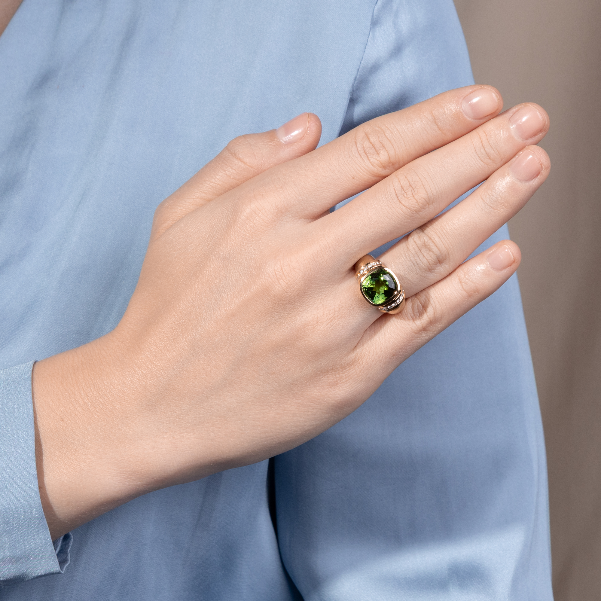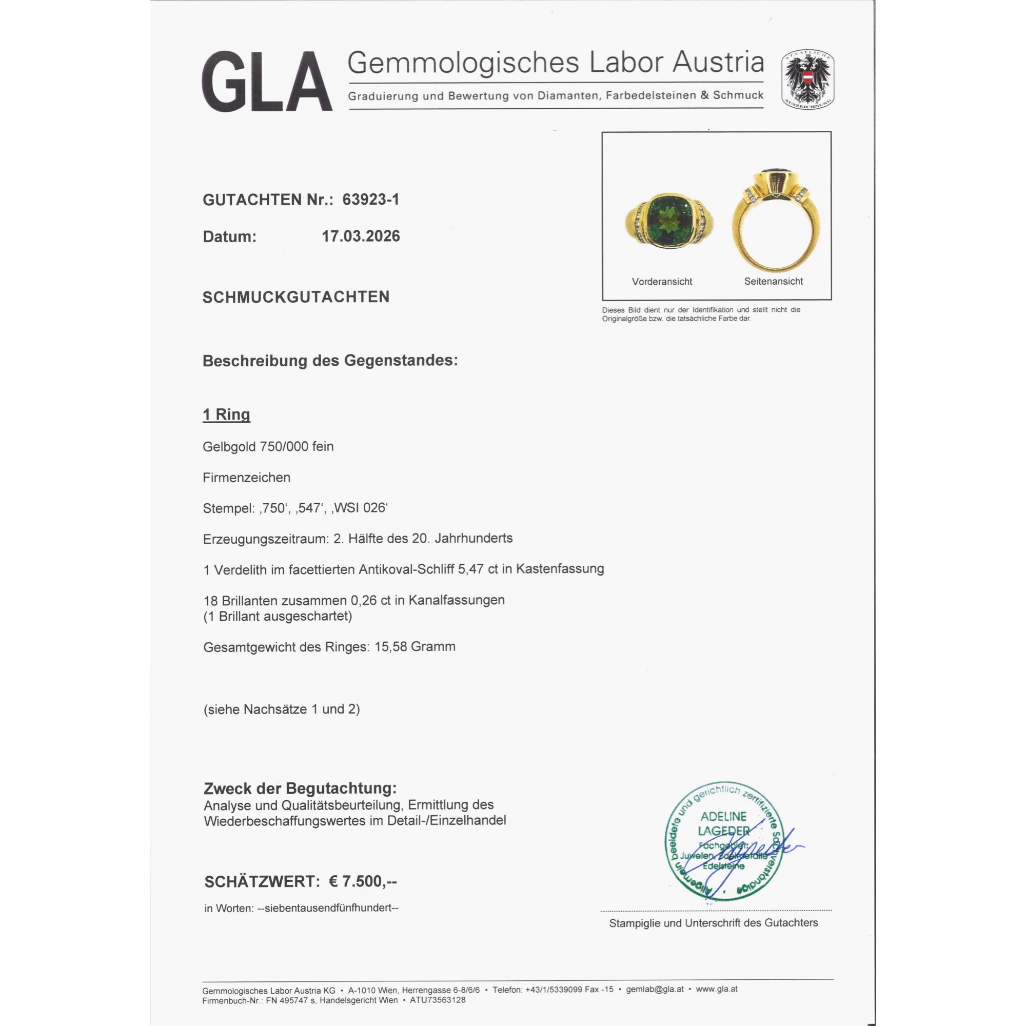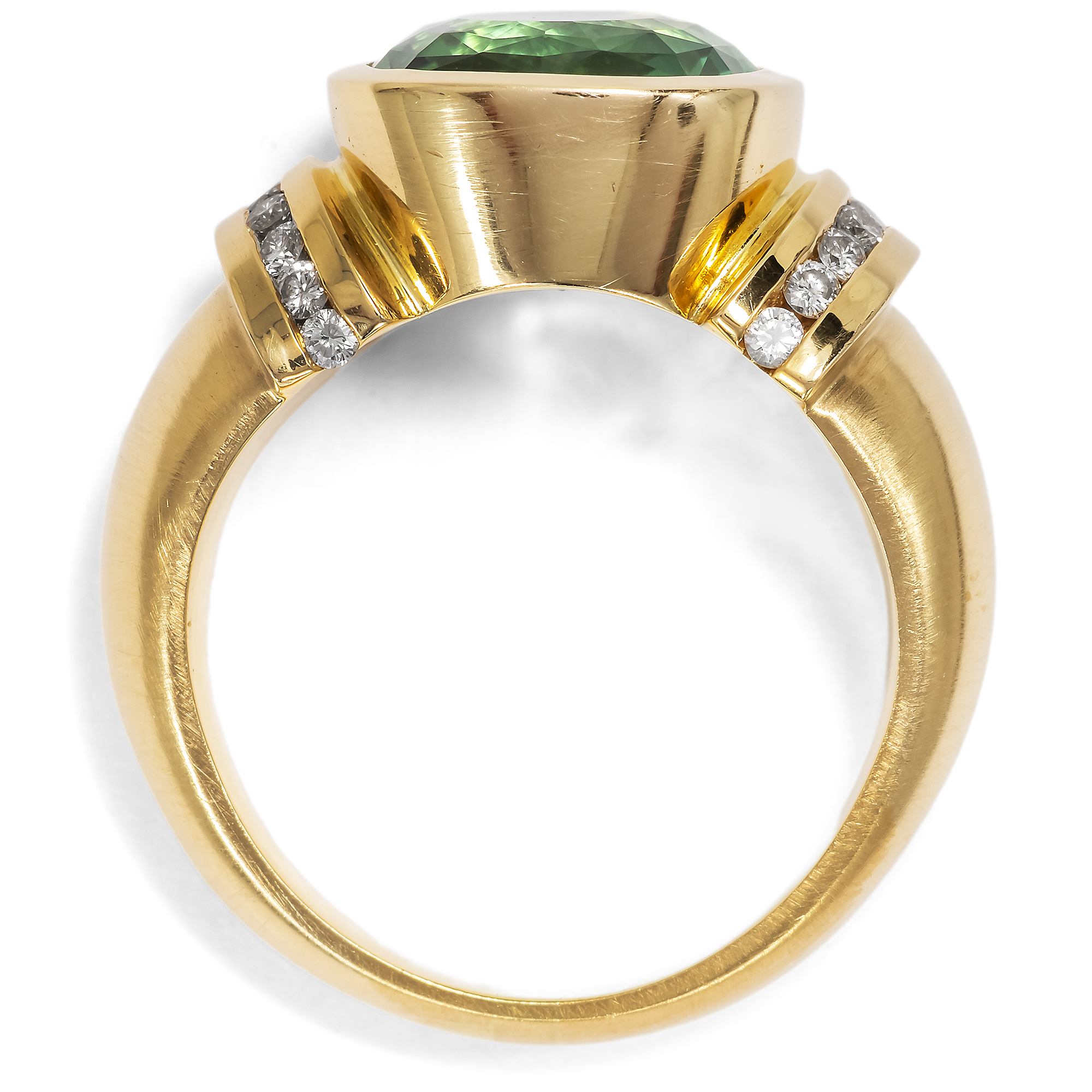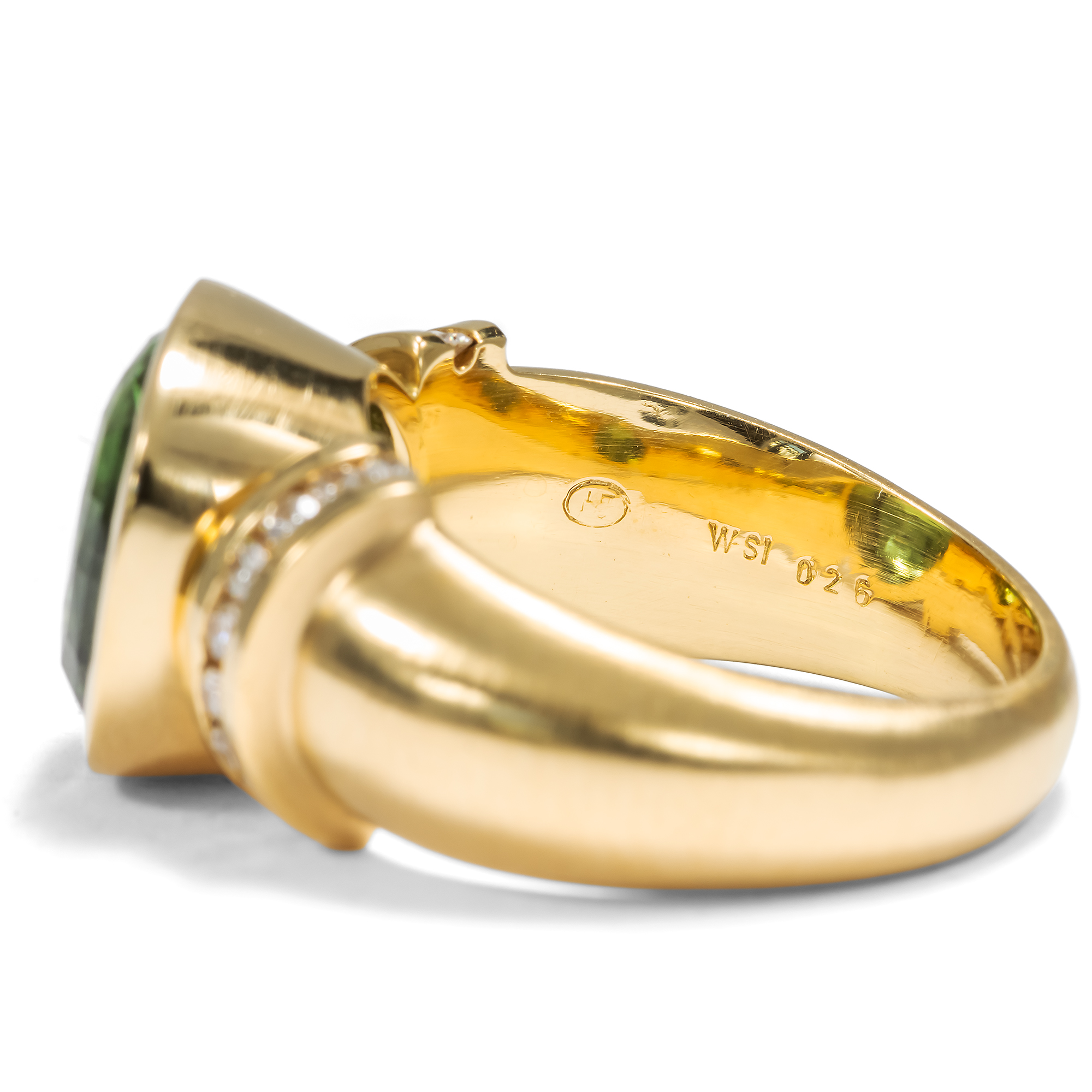 Wussten Sie, dass der Turmalin in der Natur in ganz unterschiedlichen Farben vorkommt? Bereits die Herkunft seines Namens verweist auf seine Farbenvielfalt: „Turmalin“ leitet sich vom singhalesischen Begriff „turmali“ ab, was so viel wie „Stein mit gemischten Farben“ bedeutet. Eine besonders schöne, grüne Variante des Turmalins, ein sog. Verdelith, ist in dem hier vorliegenden Ring eingefasst. Wie moosbedeckter Waldboden wirkt der dunkelgrüne Edelstein, wobei seine Farbe mal heller, mal dunkler wirkt und sich, je nach Betrachterwinkel, verändert. Der kissenförmig geschliffene Stein besitzt ein Gewicht von 5,47 Karat. Durch das warme Leuchten des Goldes ringsum erinnert er noch einmal mehr an einen Spaziergang an einem warmen Tag im Wald. Der Ring ist eine massiv und von Hand ausgeführte Goldschmiedearbeit, die durch eine kleine Meistermarke im Innern der Ringschiene der Werkstatt von Harry Ehrmann in Idar-Oberstein zugeordnet werden kann. Insgesamt 18 kleine Brillanten mit einem Gesamtgewicht von 0,26 ct bilden in zwei eleganten Reihen die Schulterpartie des Ringes und leiten zur satinierten Schiene über. Mit einem Gewicht von mehr als 15 Gramm ist bei diesem Ring nicht gespart worden, weder am Gold noch an der Qualität der verwendeten Edelsteine. Ein unabhängiges Gutachten liegt dem Ring bei, der hier in Berlin zu uns fand.