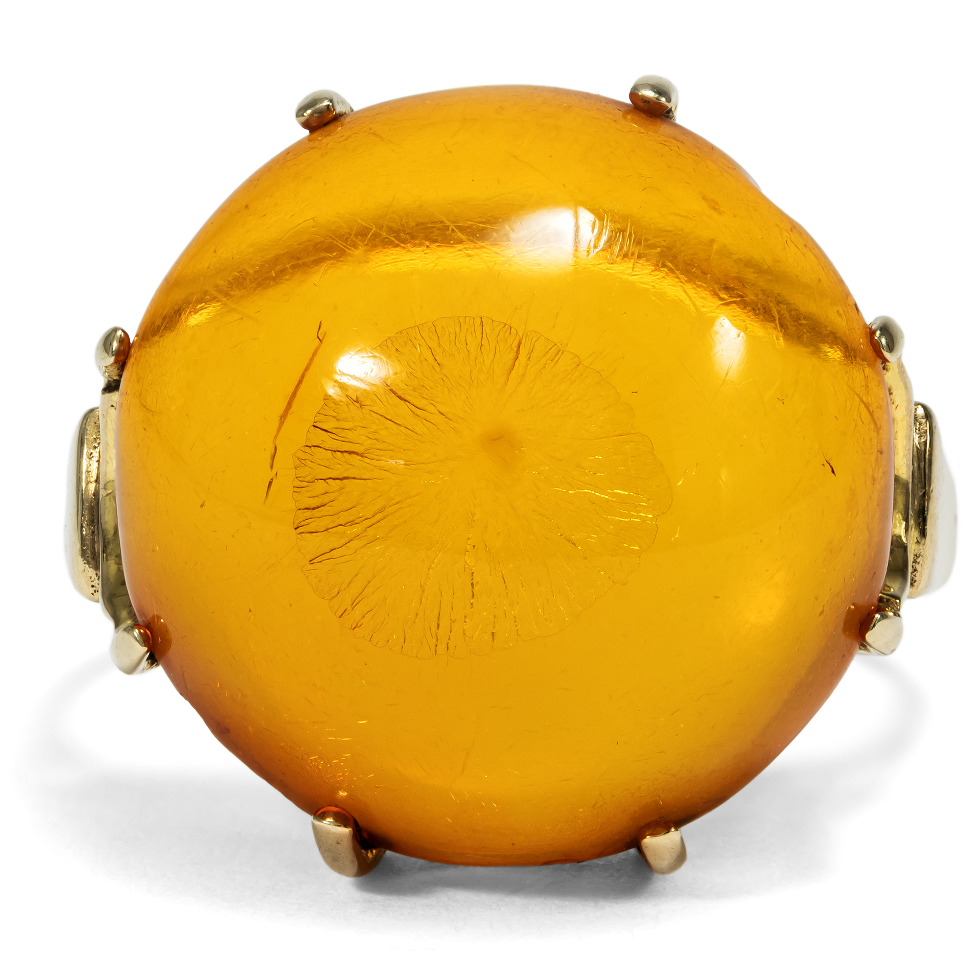 Bernstein zählt zu den ältesten Schmuckmaterialien des Menschen und wurde bereits vor Jahrtausenden über weite Entfernungen gehandelt. Über die sogenannte Bernsteinstraße gelangte das fossile Baumharz von den Küsten der Ostsee bis ans Mittelmeer – und darüber hinaus: Selbst im Grab des Pharaos Tutanchamun fand sich ein Skarabäus aus baltischem Bernstein. Bis zum Zweiten Weltkrieg war Deutschland das Zentrum der europäischen Bernsteinschmuckproduktion. Die bedeutendsten Vorkommen lagen im damaligen Ostpreußen, wo Bernstein teils sogar im Tagebau gefördert wurde. Besonders hervorzuheben ist die 1926 in Königsberg gegründete Staatliche Bernsteinmanufaktur (SBM), die bis zu ihrem Ende 1945 als innovatives Zentrum galt und viele namhafte Gestalter anzog. In dieser Tradition steht auch der hier vorliegende, eindrucksvolle Ring. Er präsentiert einen klaren, runden Bernstein in kräftigem Cognacton. Eine Sonnenflinte im Inneren des Steins belebt seine warme Farbe und verleiht ihm Tiefe und Charakter. Die offene Fassung aus 8-karätigem Gold verleiht dem Stück eine leichte Anmutung und macht den Bernstein als Ring tragbar. Zu uns kam der schöne Ring hier in Berlin.