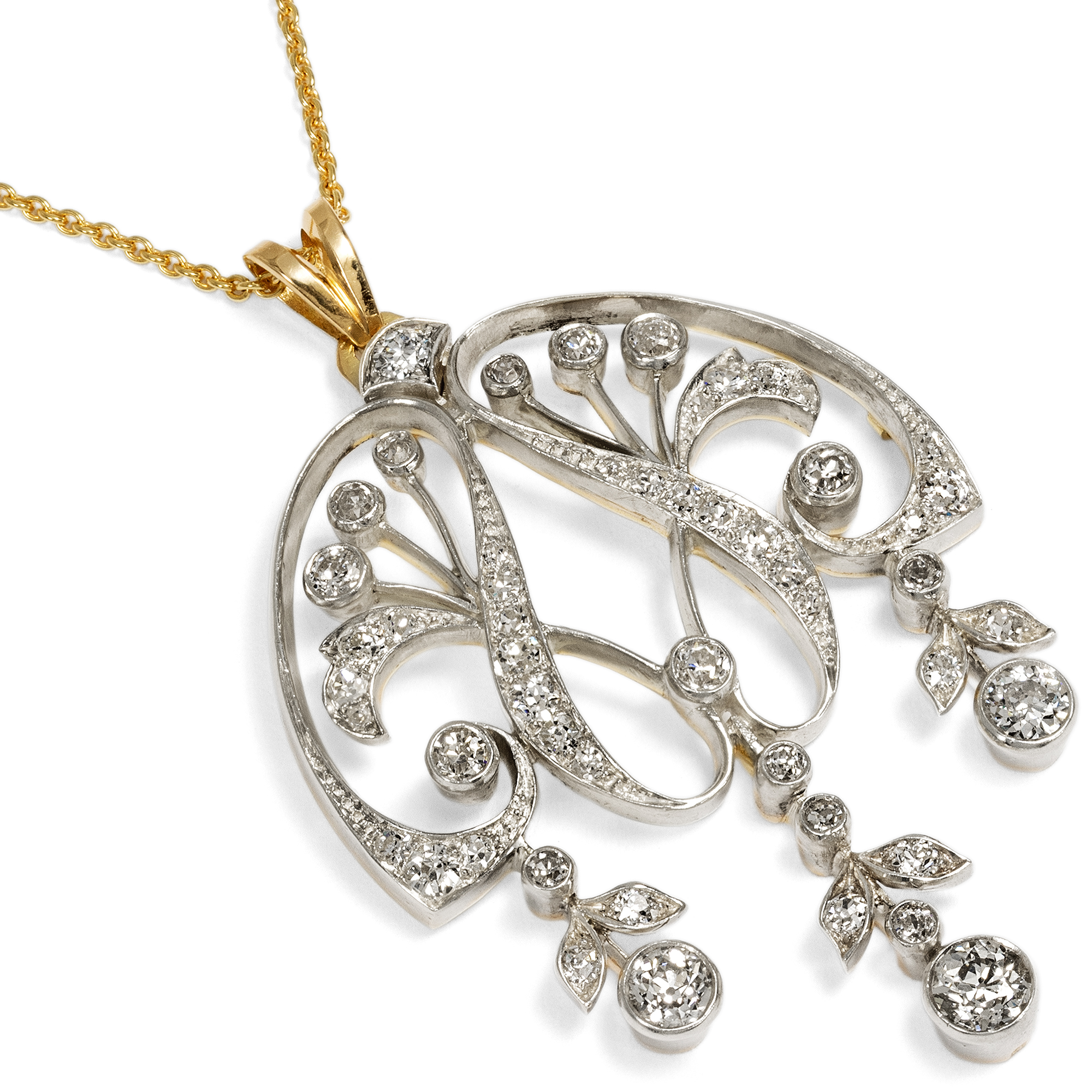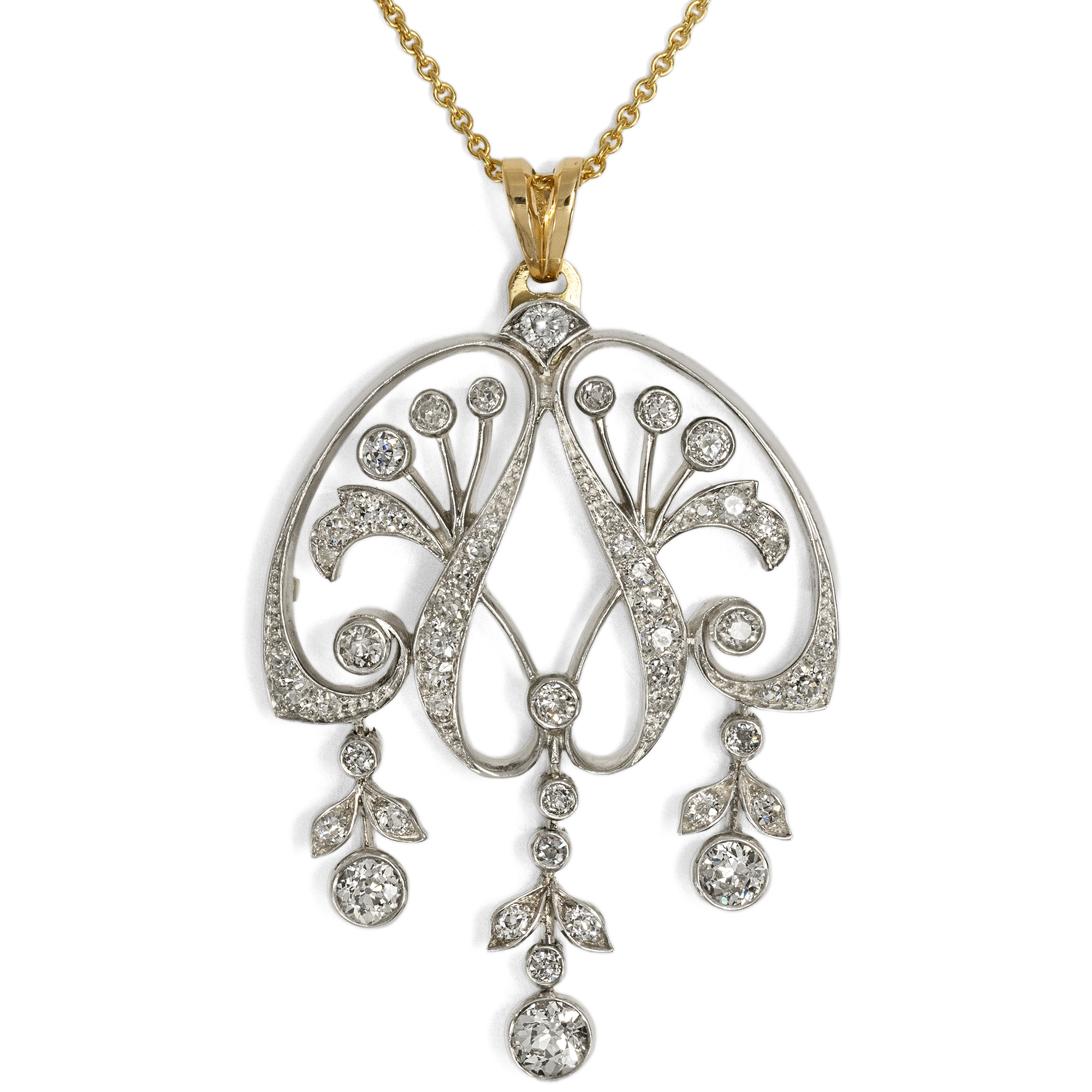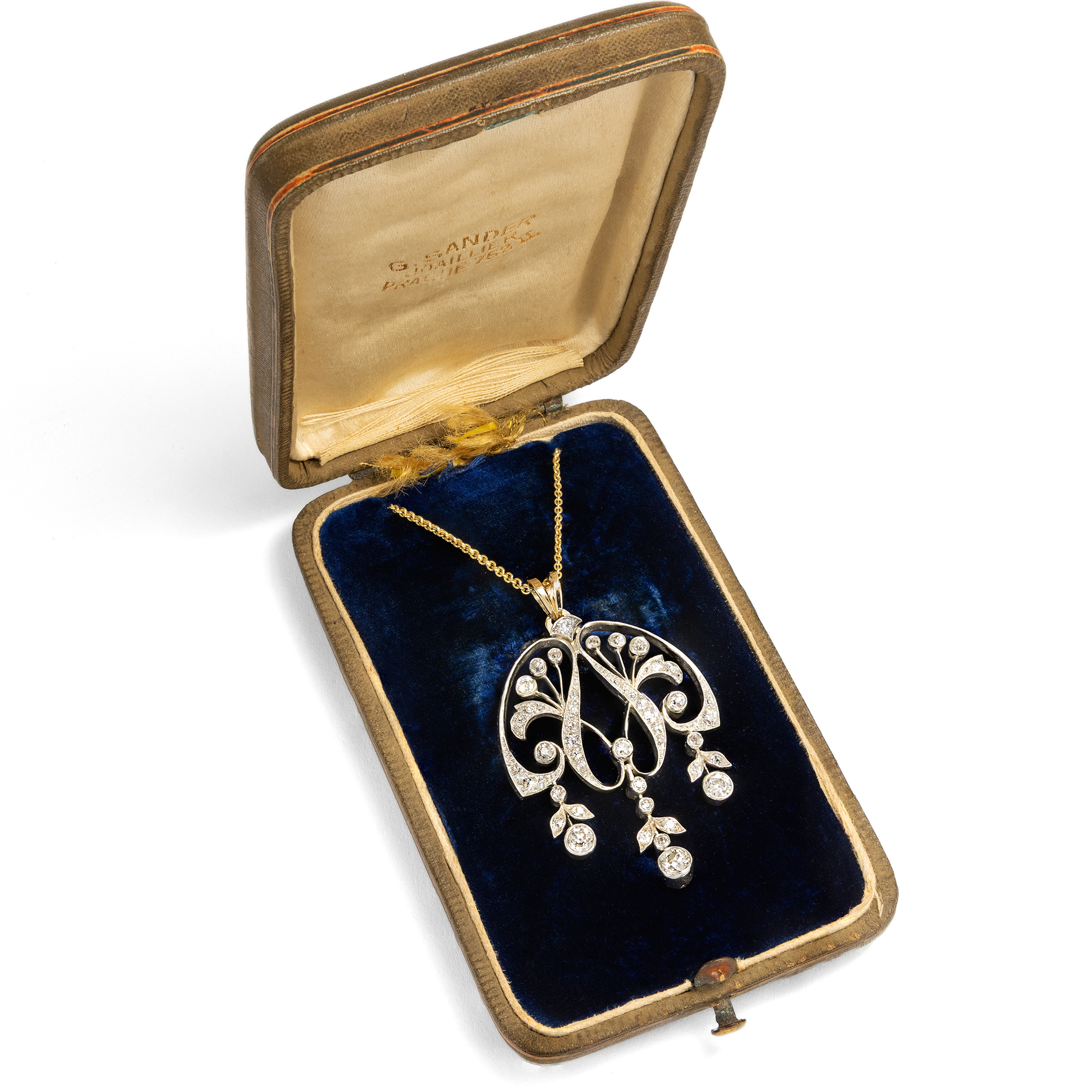 Elegante Linien, mit funkelnden Diamanten ausgefasst, verschränken sich in perfekter Symmetrie. Nach außen bilden sie einen filigranen Rahmen, nach innen weiten sie sich und erscheinen in vegetabilen Formen: Wir sehen Blätter und Blüten, abstrahiert, aber voller Schwung. Nach unten dann sind drei größere Diamanten unter kleinen Blättern pendelnd angehängt. Sie wirken wie die köstlichen Früchte einer geheimnisvollen Pflanze. Das hier vorliegende Schmuckstück ist ein ganz typischer Entwurf im Jugendstil der Jahre kurz nach 1900. Von Frankreich ausgehend hatte dieser neue Stil ganz Europa erobert. In Mitteleuropa beruhigten sich die Formen ein wenig und eine neue Liebe zur Symmetrie trat hinzu. Zugleich verbanden sich die Formen mit der zeitgleichen Mode der Weißjuwelen: Kompositionen aus weißen Edelmetallen und dem weißen Licht der Diamanten. Das Besondere an diesem Schmuckstück ist, dass es als Anhänger und als Brosche getragen werden kann. Die Nadel und Nadelaufnahme können dazu an- und abgeschraubt werden. Dies war um 1900 ein oft geübter Luxus der Ausstattung, um das Schmuckstück zu vielen Gelegenheiten tragen zu können: Wir finden es auch heute noch sehr praktisch. Luxuriös ist auch die materielle Ausstattung. Insgesamt sind hier mehr als eineinhalb Karat Diamanten verarbeitet. Die Steine sind dabei in Silber gefasst, rückseitig ist das Schmuckstück aber mit Gold verbödet, damit das Silber nicht an den Kleidern abfärben kann. Das Schmuckstück hat sich in seinem originalen Etui erhalten, das unter der blauen Samteinlage Platz bietet für einen Schmuckschraubendreher und die Broschierung. Das Etui ist mit dem Firmeneindruck des Juweliers G. Sander aus Prag versehen. Dort wurde das Stück offenbar erstmals verkauft. Die Punzen auf dem Anhänger und der Broschierung verraten zudem, dass alle Teile in Wien hergestellt wurden. Die Anhängerschlaufe wurde in jüngerer Zeit erneuert. Sie kann nicht abgenommen werden, aber klappt unauffällig nach hinten, wenn die Broschierung angebracht wird und das Schmuckstück als Brosche getragen werden soll. Die moderne, ungetragene Kette haben wir zu dem Schmuckstück ergänzt. Sie passt farblich wunderbar zur Anhängerschlaufe.