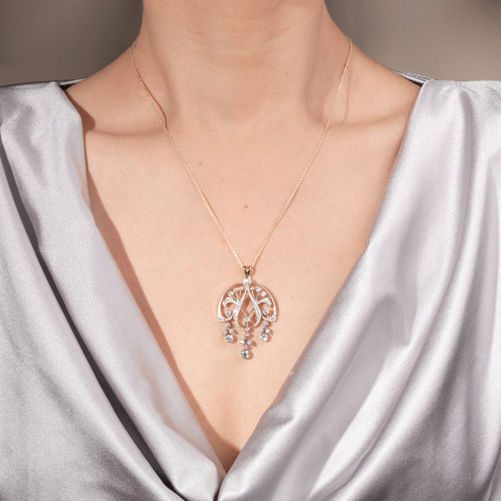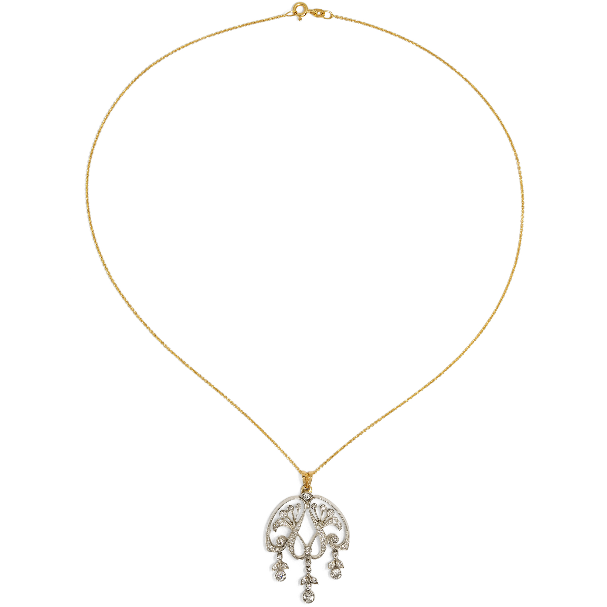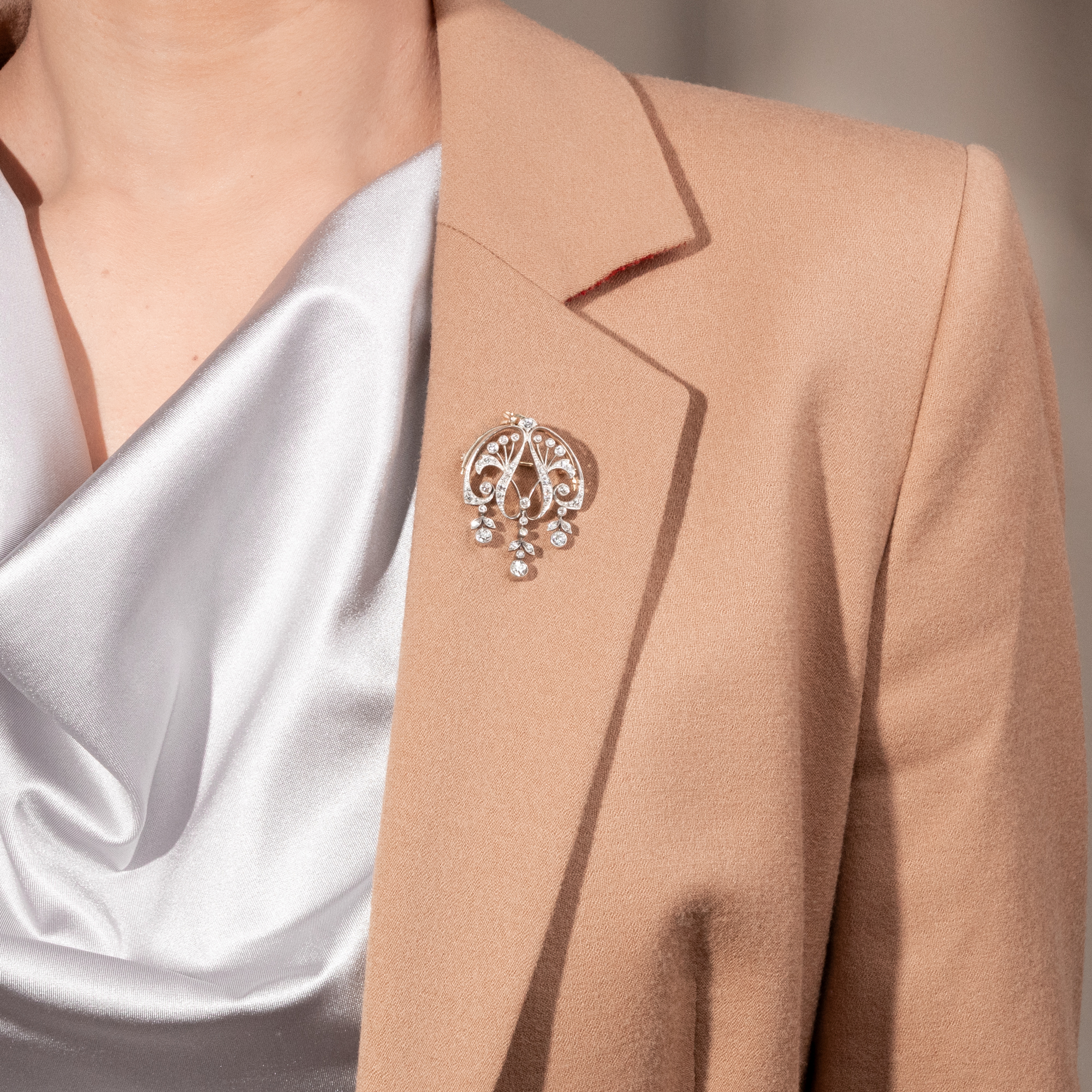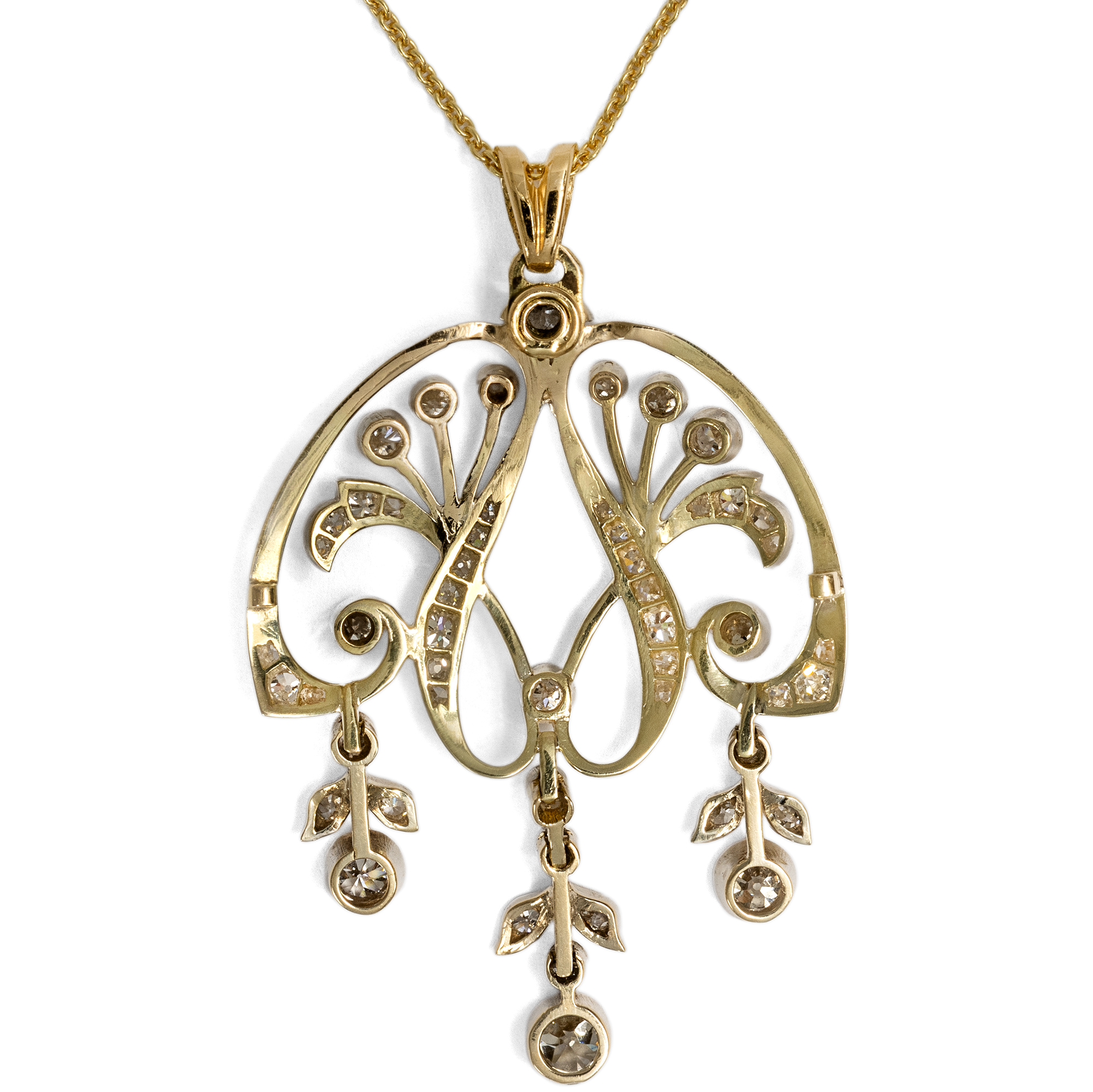 Elegante Linien, mit funkelnden Diamanten ausgefasst, verschränken sich in perfekter Symmetrie. Nach außen bilden sie einen filigranen Rahmen, nach innen weiten sie sich und erscheinen in vegetabilen Formen: Wir sehen Blätter und Blüten, abstrahiert, aber voller Schwung. Nach unten dann sind drei größere Diamanten unter kleinen Blättern pendelnd angehängt. Sie wirken wie die köstlichen Früchte einer geheimnisvollen Pflanze. Das hier vorliegende Schmuckstück ist ein ganz typischer Entwurf im Jugendstil der Jahre kurz nach 1900. Von Frankreich ausgehend hatte dieser neue Stil ganz Europa erobert. In Mitteleuropa beruhigten sich die Formen ein wenig und eine neue Liebe zur Symmetrie trat hinzu. Zugleich verbanden sich die Formen mit der zeitgleichen Mode der Weißjuwelen: Kompositionen aus weißen Edelmetallen und dem weißen Licht der Diamanten. Das Besondere an diesem Schmuckstück ist, dass es als Anhänger und als Brosche getragen werden kann. Die Nadel und Nadelaufnahme können dazu an- und abgeschraubt werden. Dies war um 1900 ein oft geübter Luxus der Ausstattung, um das Schmuckstück zu vielen Gelegenheiten tragen zu können: Wir finden es auch heute noch sehr praktisch. Luxuriös ist auch die materielle Ausstattung. Insgesamt sind hier mehr als eineinhalb Karat Diamanten verarbeitet. Die Steine sind dabei in Silber gefasst, rückseitig ist das Schmuckstück aber mit Gold verbödet, damit das Silber nicht an den Kleidern abfärben kann. Das Schmuckstück hat sich in seinem originalen Etui erhalten, das unter der blauen Samteinlage Platz bietet für einen Schmuckschraubendreher und die Broschierung. Das Etui ist mit dem Firmeneindruck des Juweliers G. Sander aus Prag versehen. Dort wurde das Stück offenbar erstmals verkauft. Die Punzen auf dem Anhänger und der Broschierung verraten zudem, dass alle Teile in Wien hergestellt wurden. Die Anhängerschlaufe wurde in jüngerer Zeit erneuert. Sie kann nicht abgenommen werden, aber klappt unauffällig nach hinten, wenn die Broschierung angebracht wird und das Schmuckstück als Brosche getragen werden soll. Die moderne, ungetragene Kette haben wir zu dem Schmuckstück ergänzt. Sie passt farblich wunderbar zur Anhängerschlaufe.