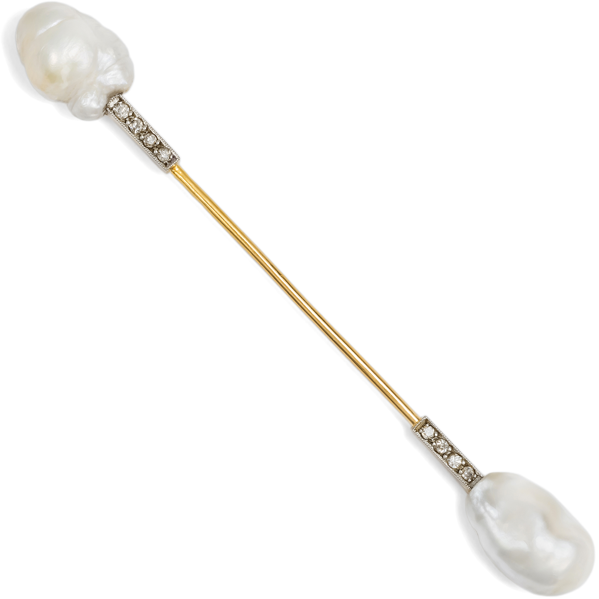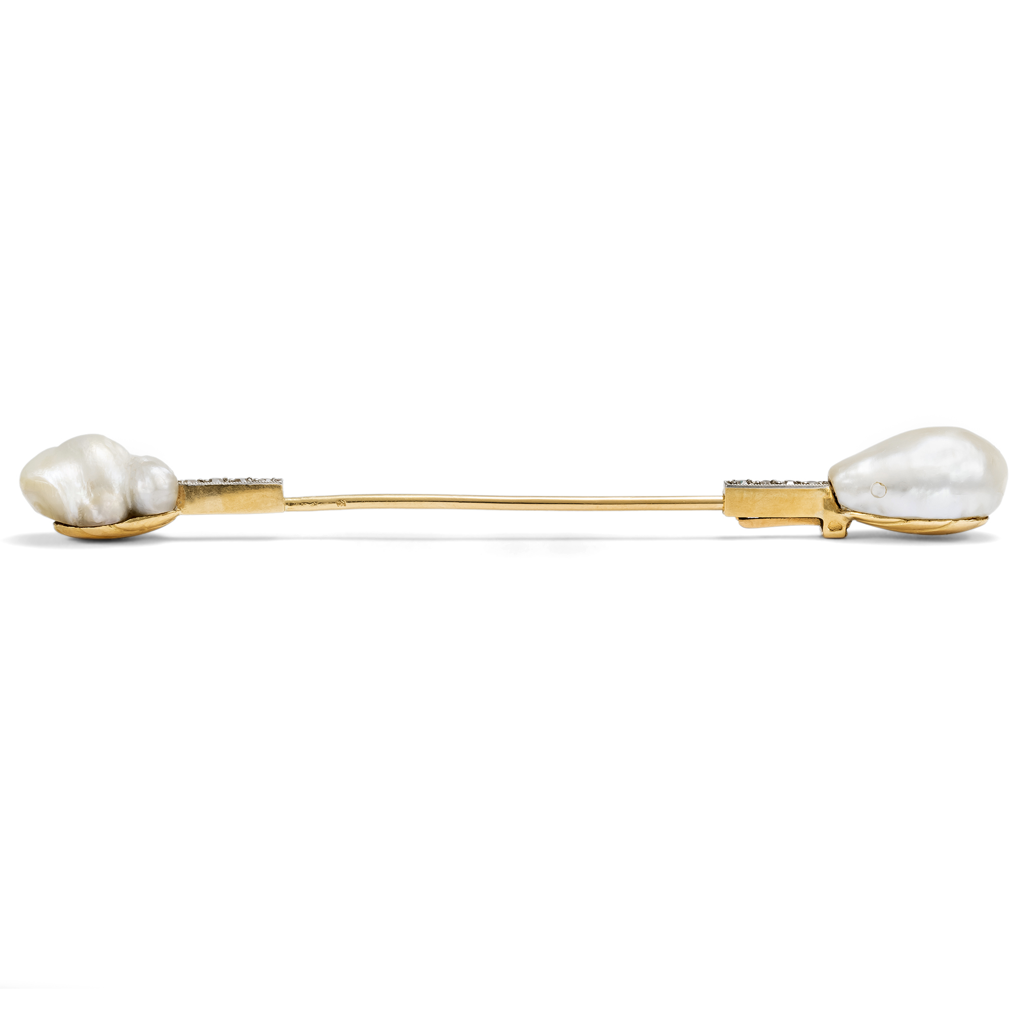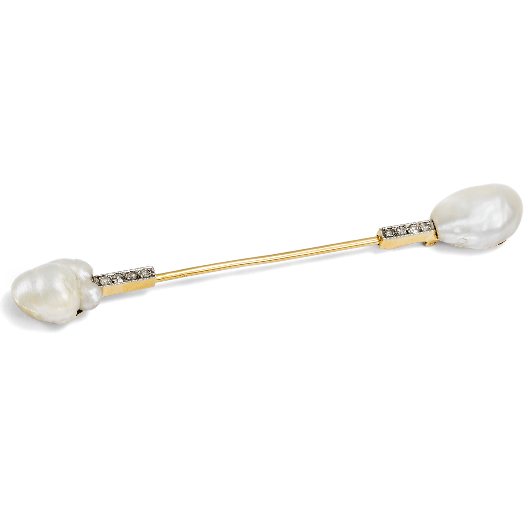 Die Jabotnadel, épingle de jabot, ist eine besondere Art der Brosche aus zwei Teilen. Getragen verschwindet der Mittelteil und allein die zwei Enden sind auf der Kleidung zu sehen. Sie dienten ursprünglich dazu, den Jabot, ein aus Batist oder Spitze bestehendes Lätzchen, am Halsansatz des Kleides festzustecken. Im späten 19. Jahrhundert waren sie gern in Form von Pfeilen oder Schwertern entworfen. Im frühen 20. Jahrhundert wurden sie wieder modern und nahmen nun geometrische, ungegenständliche Formen an. Die hier vorliegende Brosche präsentiert an ihren zwei Schaustücken jeweils eine große, natürliche Perle. Jede der Perlen wird von einem geometrischen Element mit vier Diamanten in Platin gehalten: Größer könnte ein Gegensatz wohl nicht sein als zwischen der strengen, geometrischen Form der Goldschmiedearbeit und den von der Natur ganz frei geformten, barocken Perlen! Uns hat die Nadel gerade auf Grund der besonderen Perlen so gut gefallen: In einer Zeit, als es noch keine Zuchtperlen gab, waren große Perlen wie diese besondere Kostbarkeiten – dass sie so prominent inszeniert wurden wie hier, erklärt sich vor allem vor diesem Hintergrund. Und gerade barocke Perlen haben in der Schmuckgeschichte eine besondere Tradition: Sie markieren genau den Spagat zwischen Kunst und Natur, der jedes Schmuckstück betrifft: Mit Naturmaterialien zu schmücken, die dennoch einer absichtsvollen Gestaltung unterliegen. Kennen Sie z. B. die kleinen Tierfiguren mit Barockperlen in der Sammlung des Grünen Gewölbes? Hier fand die Lust an der Barockperle ihre schönste Ausprägung. Wir haben die Nadel in Paris entdeckt. Ihre Punzierung belegt, dass sie auch in Paris bereits entstanden ist. Auf Grund der Verwendung von Diamanten im Single-Cut und der Art der Verarbeitung datieren wir die Brosche in die 1910er Jahre.