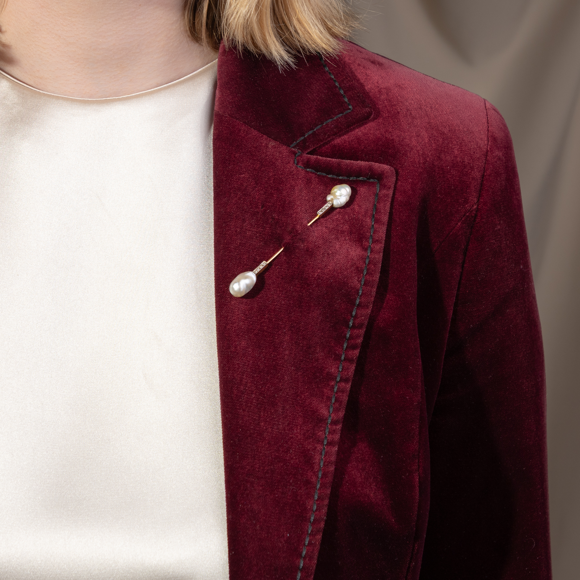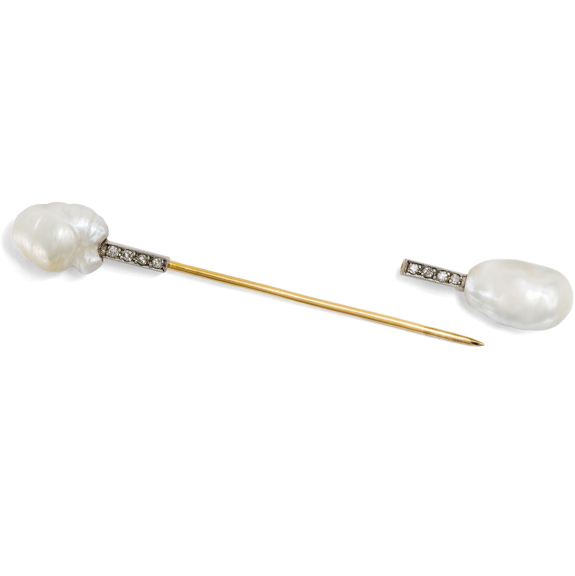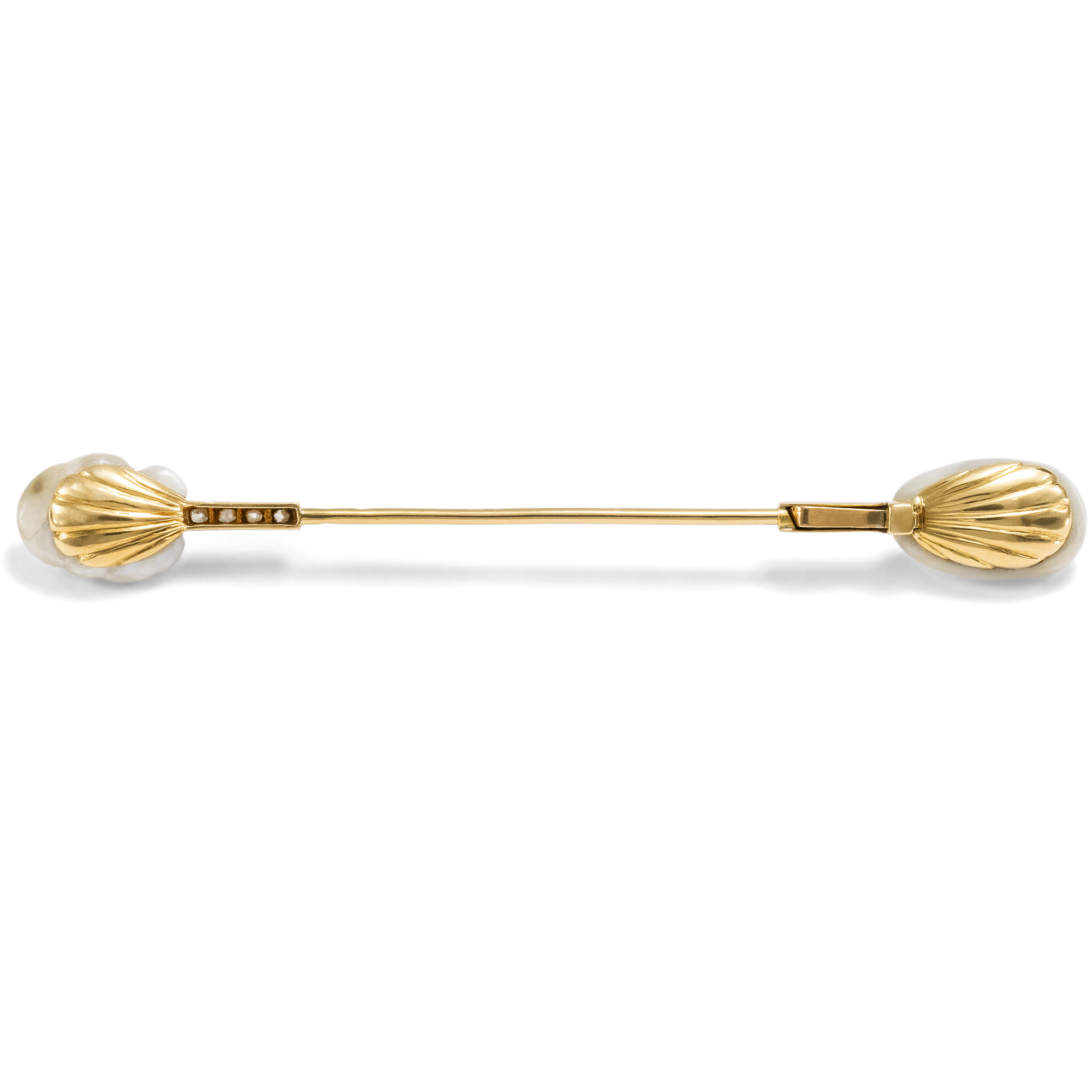 Die Jabotnadel, épingle de jabot, ist eine besondere Art der Brosche aus zwei Teilen. Getragen verschwindet der Mittelteil und allein die zwei Enden sind auf der Kleidung zu sehen. Sie dienten ursprünglich dazu, den Jabot, ein aus Batist oder Spitze bestehendes Lätzchen, am Halsansatz des Kleides festzustecken. Im späten 19. Jahrhundert waren sie gern in Form von Pfeilen oder Schwertern entworfen. Im frühen 20. Jahrhundert wurden sie wieder modern und nahmen nun geometrische, ungegenständliche Formen an. Die hier vorliegende Brosche präsentiert an ihren zwei Schaustücken jeweils eine große, natürliche Perle. Jede der Perlen wird von einem geometrischen Element mit vier Diamanten in Platin gehalten: Größer könnte ein Gegensatz wohl nicht sein als zwischen der strengen, geometrischen Form der Goldschmiedearbeit und den von der Natur ganz frei geformten, barocken Perlen! Uns hat die Nadel gerade auf Grund der besonderen Perlen so gut gefallen: In einer Zeit, als es noch keine Zuchtperlen gab, waren große Perlen wie diese besondere Kostbarkeiten – dass sie so prominent inszeniert wurden wie hier, erklärt sich vor allem vor diesem Hintergrund. Und gerade barocke Perlen haben in der Schmuckgeschichte eine besondere Tradition: Sie markieren genau den Spagat zwischen Kunst und Natur, der jedes Schmuckstück betrifft: Mit Naturmaterialien zu schmücken, die dennoch einer absichtsvollen Gestaltung unterliegen. Kennen Sie z. B. die kleinen Tierfiguren mit Barockperlen in der Sammlung des Grünen Gewölbes? Hier fand die Lust an der Barockperle ihre schönste Ausprägung. Wir haben die Nadel in Paris entdeckt. Ihre Punzierung belegt, dass sie auch in Paris bereits entstanden ist. Auf Grund der Verwendung von Diamanten im Single-Cut und der Art der Verarbeitung datieren wir die Brosche in die 1910er Jahre.