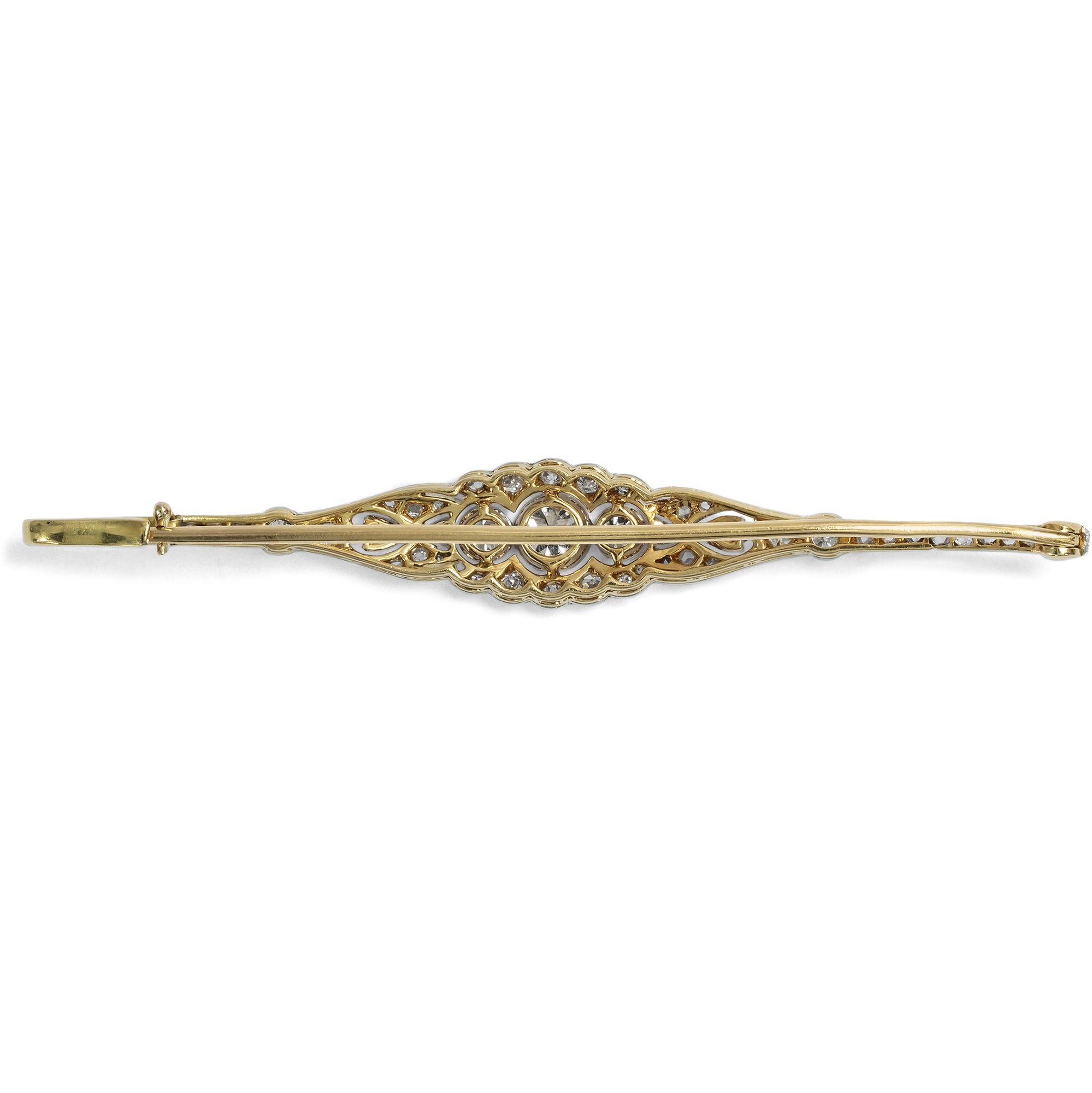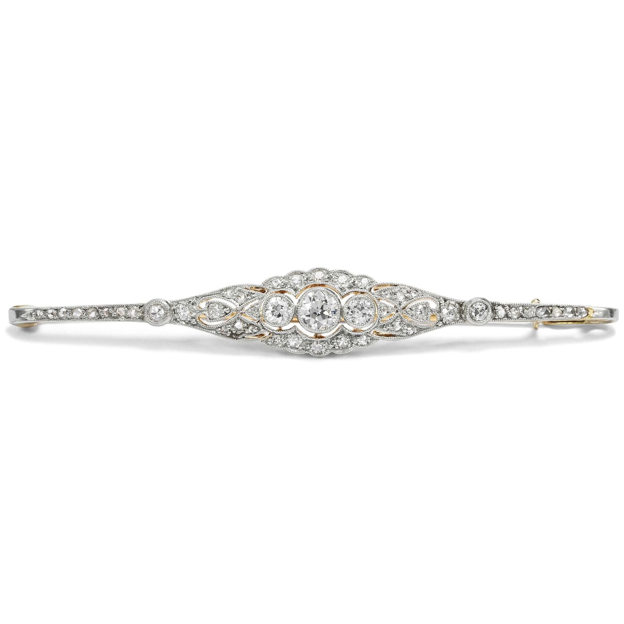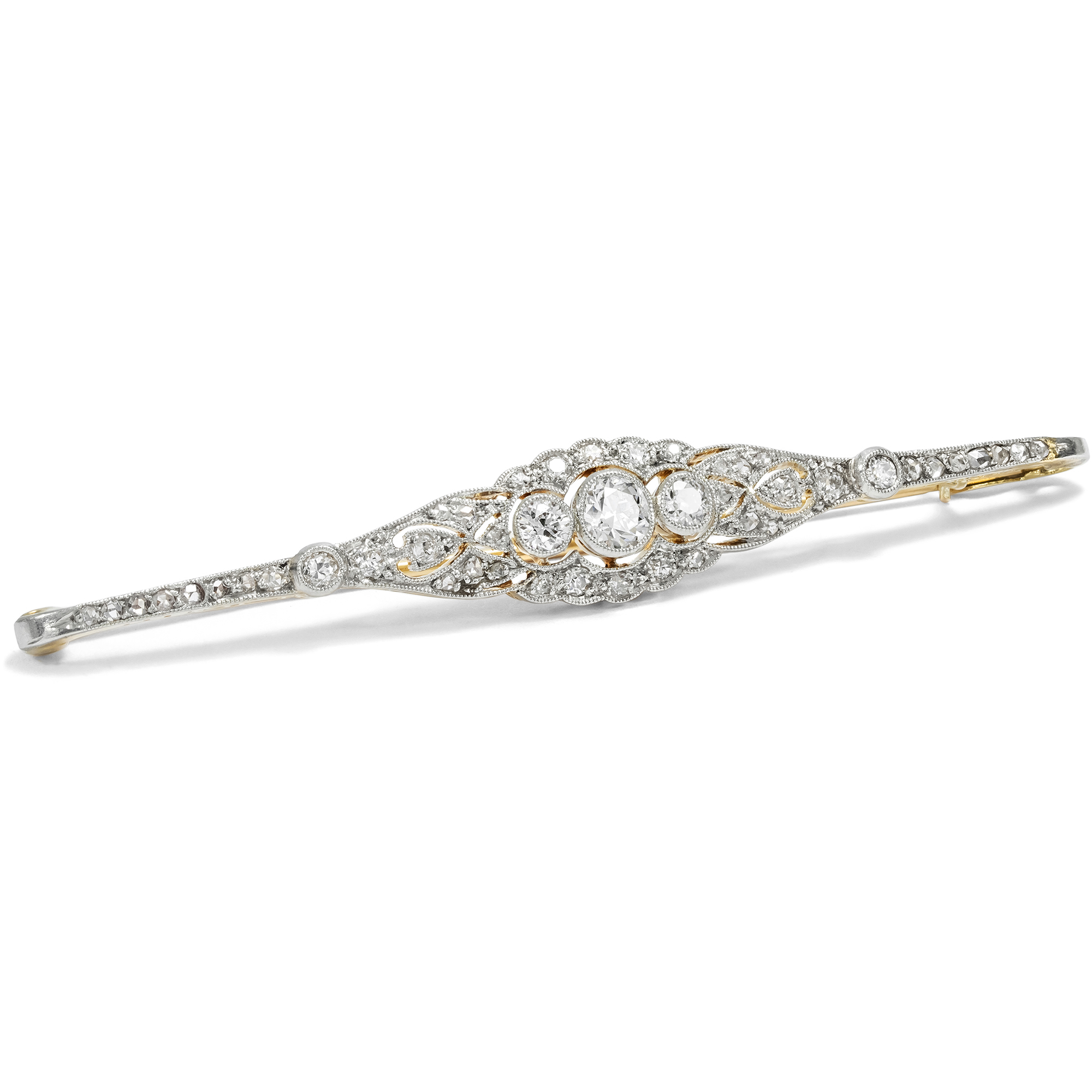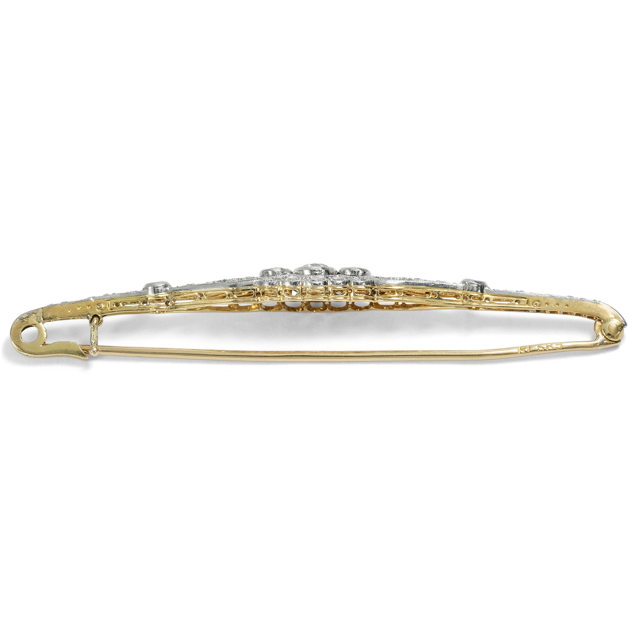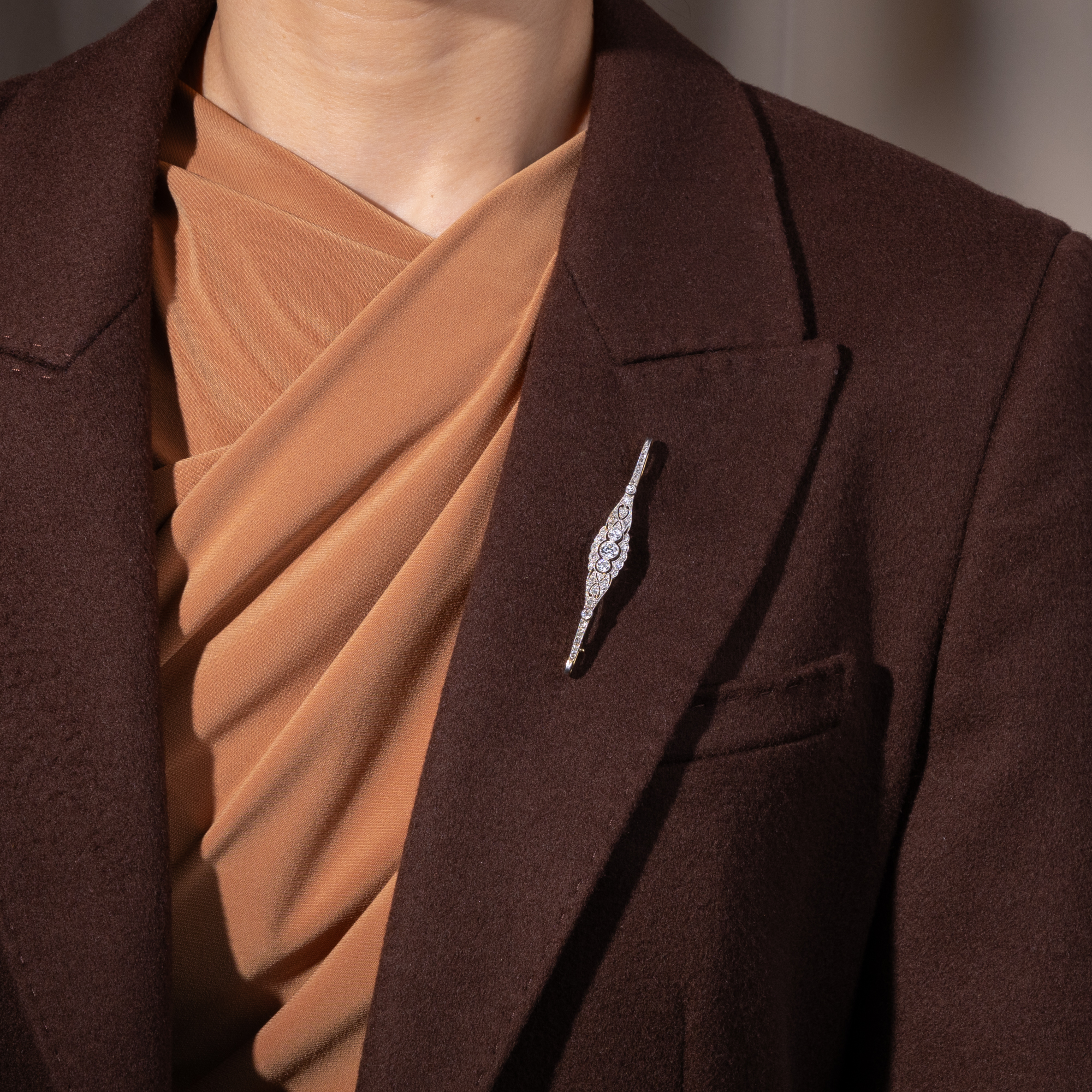 Mit jeder Kleidermode entstanden (und verschwanden) auch besondere, dazu passende Schmuckformen. In den Jahren kurz nach 1900, als die Damen sich gern mit großen Schals und Krägen aus Spitze und anderen leichten Stoffen schmückten, kam eine besondere Art der Brosche auf, welche diese locker umgelegten Accessoires fest- und zusammenhalten sollte. „Die Sicherheitsnadel, als kleinstes, zierlichstes Toilettestück [...] ist in allen Formen zu brauchen zu der Toilette einer Dame. Wer ahnt überhaupt die Grenze der Verwendbarkeit solcher Nadel? Für Kravattenschleifen und Schlipse, für Jabots und Kragen sind sie notwendig, in größerer Form für Gürtel, Rock- und Jackenschluß, zum Aufraffen der weiten Ärmel [...].“ So pries die Deutsche Goldschmiedezeitung im Jahre 1904 in einem Artikel namens „Der Schmuck als Geschenk“ die Nützlichkeit einer Anstecknadel an. Die hier vorliegende Brosche ist solch eine Sicherheitsnadel. Sie ist in Platin auf Gold ausgeführt und mit insgesamt fünfzig Diamanten in verschiedenen historischen Schliffen besetzt. Gesägte Schattenfuge und funkelnde Millegriffes gliedern die Oberfläche und nehmen dem Stück die Schwere. Klugerweise sind die Steine in geschlossenen Zargen gefasst, damit sich in einem Schal aus empfindlichem Stoff hier nichts verhaken konnte. Die ätherische Formensprache in gleißendem Weiß ist ganz typisch für die 1920er Jahre und den Stil des Art Déco. Wir haben sie hier in Berlin entdeckt. Sie ist sehr gut erhalten.
