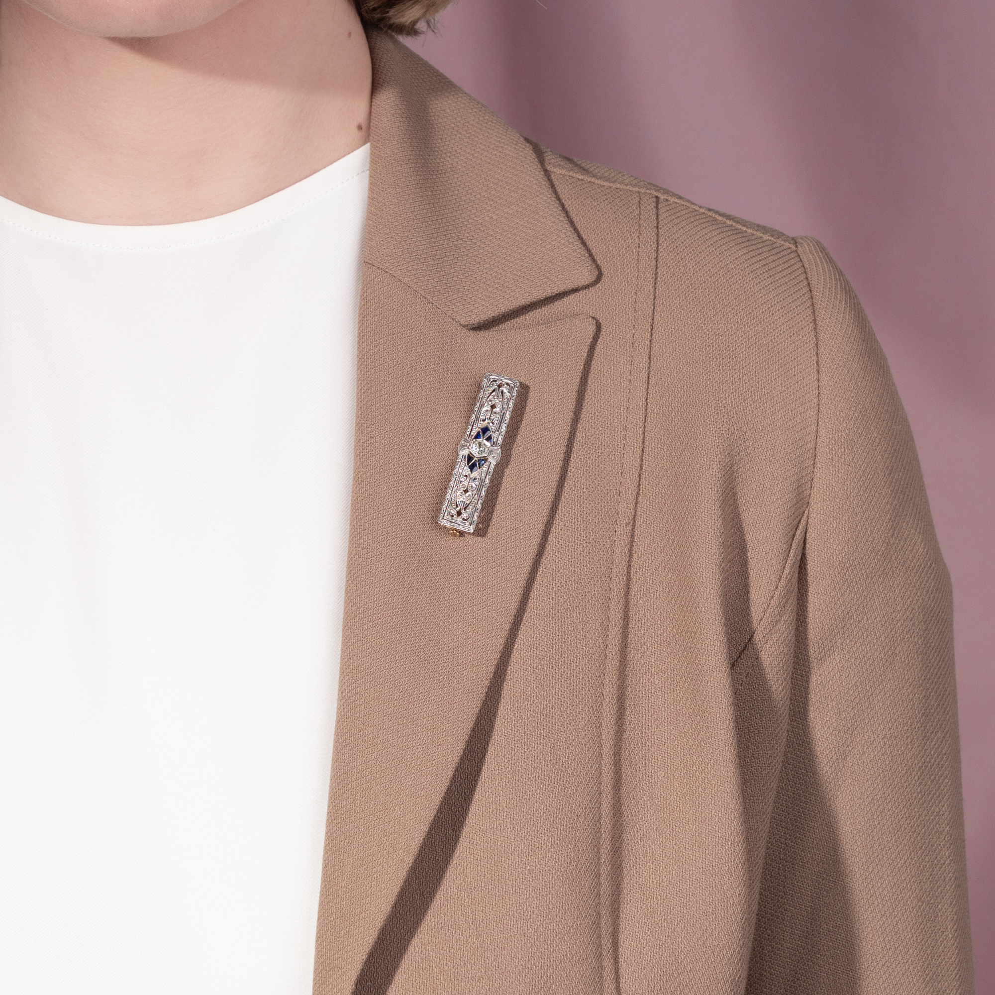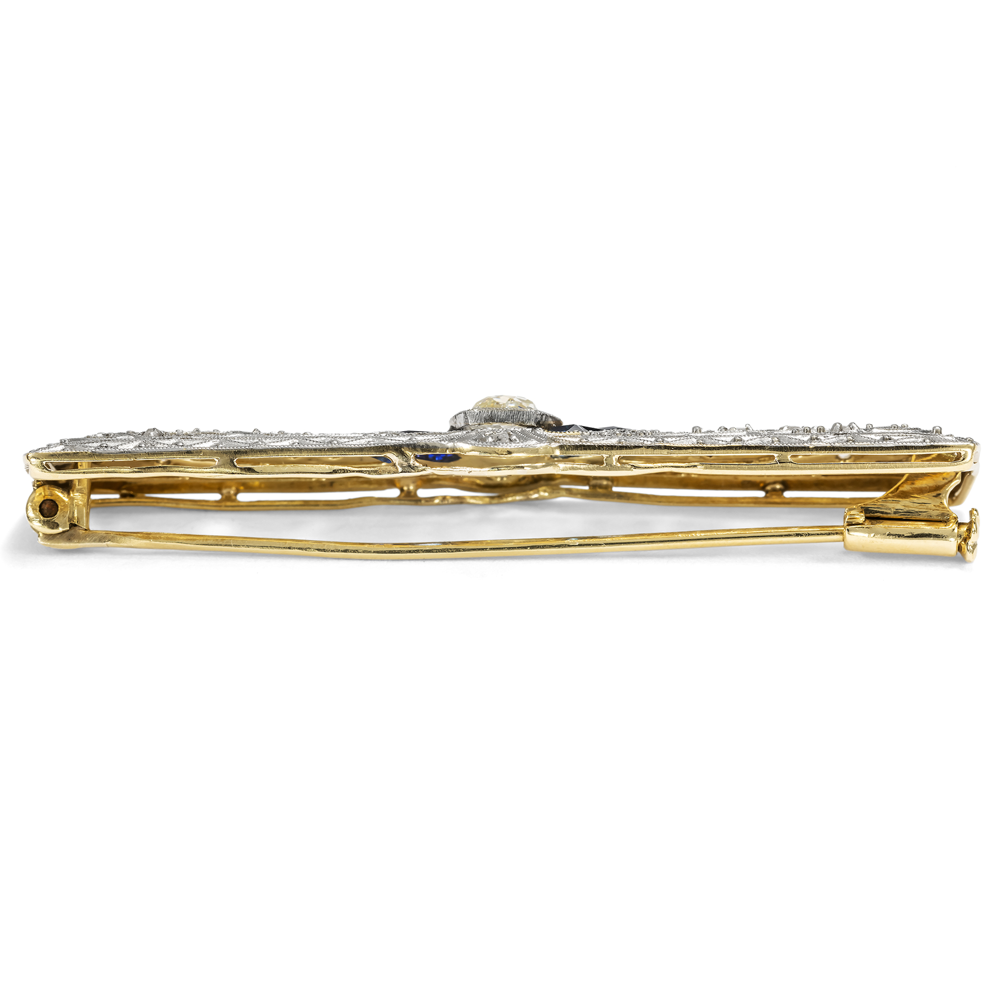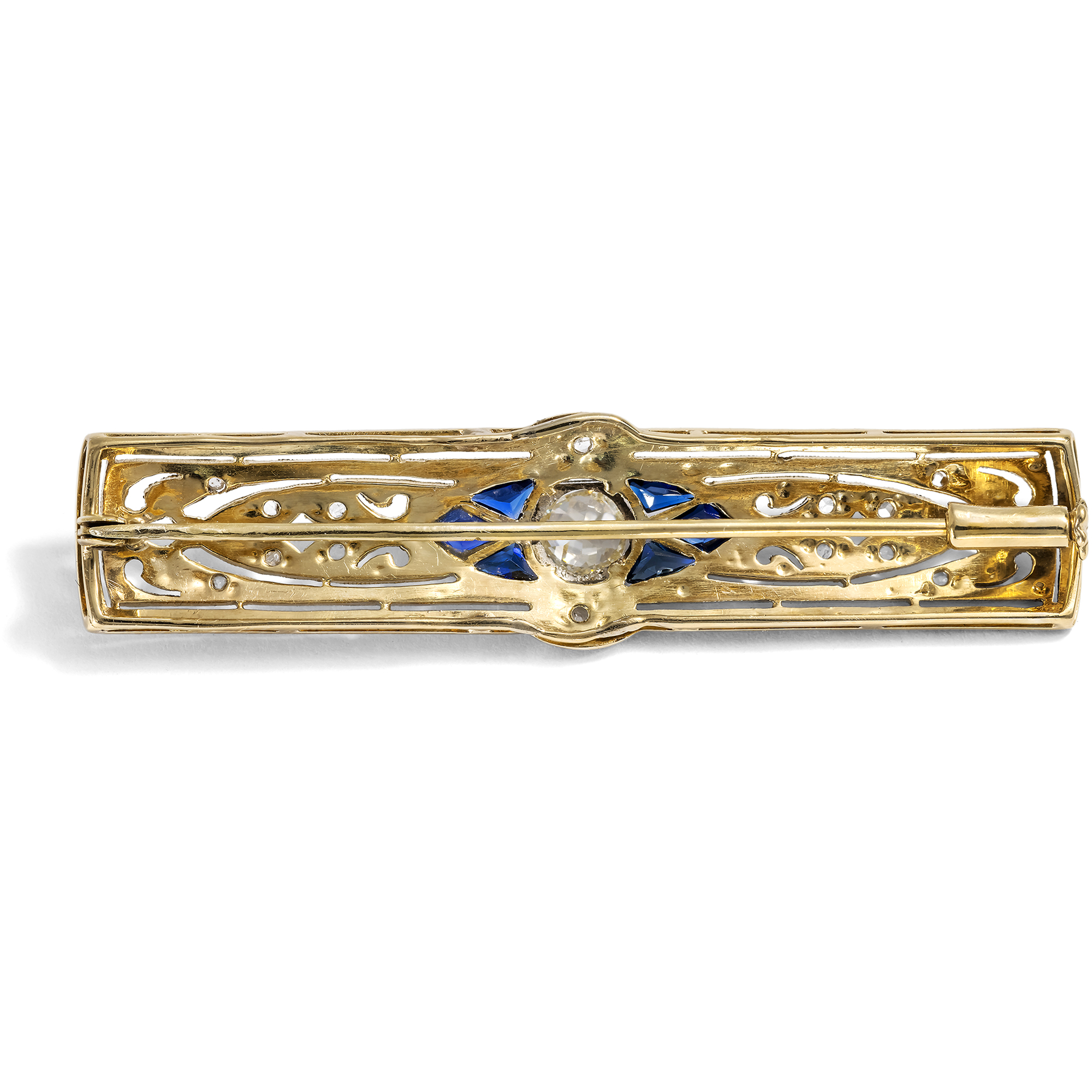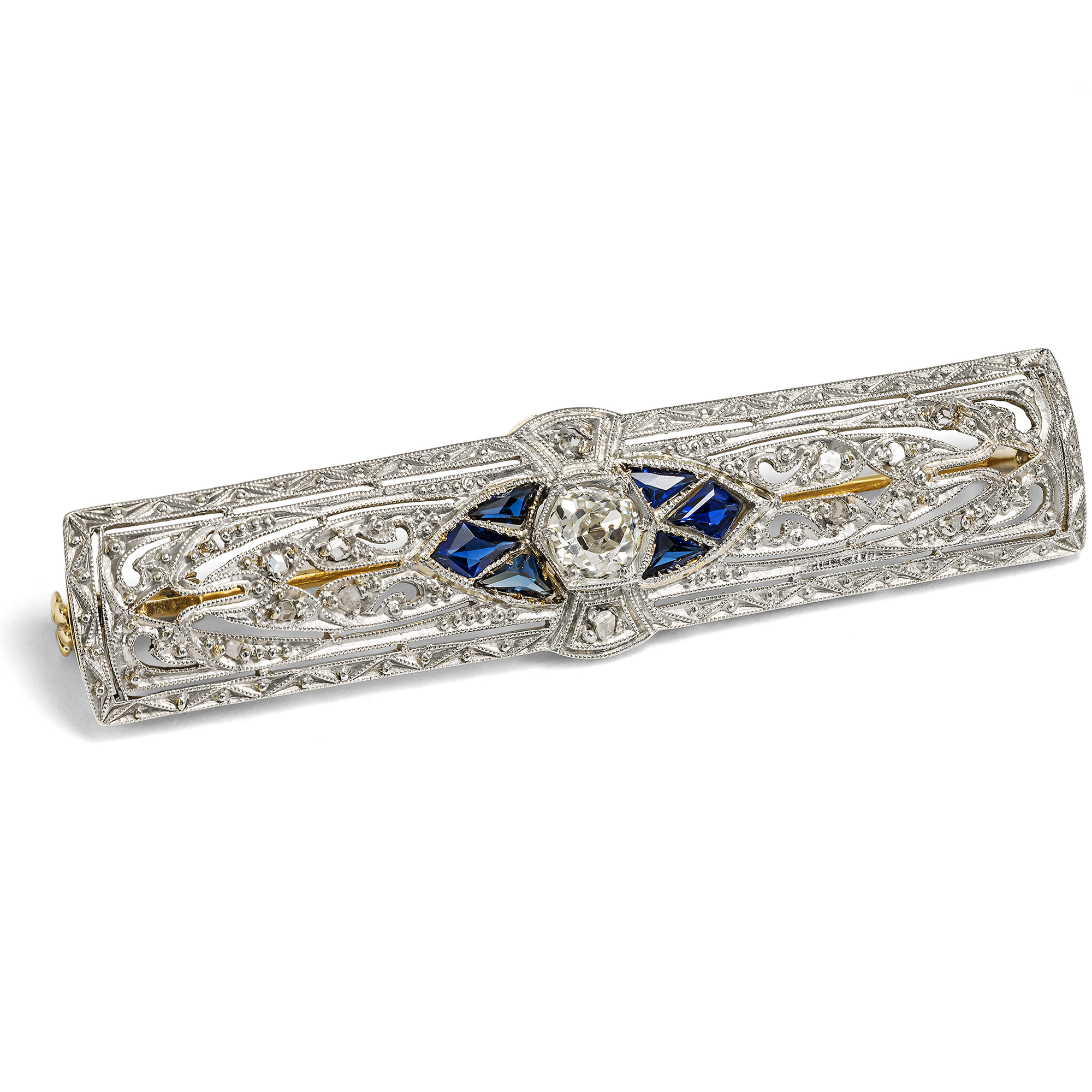 „Die neue Frau“ war das Ideal der 1920er und frühen 1930er Jahre. Sie hatte sich das Wahlrecht erstritten, bewegte sich selbstbewusst in Beruf und Gesellschaft und war selbstverständlicher Teil des pulsierenden Nachtlebens der Weimarer Republik. Was kaum anderthalb Jahrzehnte zuvor noch undenkbar schien, wurde nun gelebte Realität. Wie sich dieses neue Selbstverständnis auch ästhetisch ausdrückte, davon zeugen Beiträge in einflussreichen deutschen Modejournalen wie Die Dame. Die dort porträtierten Frauen trugen Bubikopf und betont geschminkte Lippen, locker fallende Kleider und verkörperten doch weit mehr als bloße Stilikonen – sie waren zugleich Autorinnen, Künstlerinnen und Gestalterinnen ihrer Zeit. Die neue Frau hingegen suchte auch eine neue Formensprache. Klarlinig und geometrisch, bewusst frei von allem Süßlichen, entstand eine kühle, präzise Eleganz, die den Schmuck jener Jahre prägte. Die hier vorliegende Brosche, oder wie man sie damals nannte „Broschette“, ist ein schönes Zeugnis dieser Entwicklung. Schlank und horizontal angelegt, erinnert sie noch an die Stabnadeln früherer Jahrzehnte, ist jedoch bereits breiter gefasst und bietet Raum für eine zeitgemäße, streng gegliederte Gestaltung. Feine Sägearbeiten und präzise ausgeführte Millegriffes strukturieren die Oberfläche, die in der für die Zeit typischen Kombination aus Platin auf Gold gearbeitet ist. Im Zentrum steht ein Diamant im Altschliff, dessen lebendiges Licht den Blick sofort auf sich zieht. Sechs kalibriert eingeschliffene, tiefblaue Saphire formen um ihn eine elegante Navette und verleihen dem Entwurf eine klare, spannungsvolle Kontur. Es handelt sich um zeittypische Verneuil-Synthesen, die im Labor hergestellt wurden und damals als ausgesprochen modern galten. Sechs weitere Diamanten im Rosenschliff setzen feine Lichtpunkte und verstärken das Spiel von Kontrast und Brillanz. Vor dem dunklen Blau der Saphire erscheint das Leuchten der Diamanten umso heller und klarer. Die Brosche ist sehr gut erhalten und hat das vergangene Jahrhundert wunderbar überstanden. Zu uns fand sie hier in Berlin.