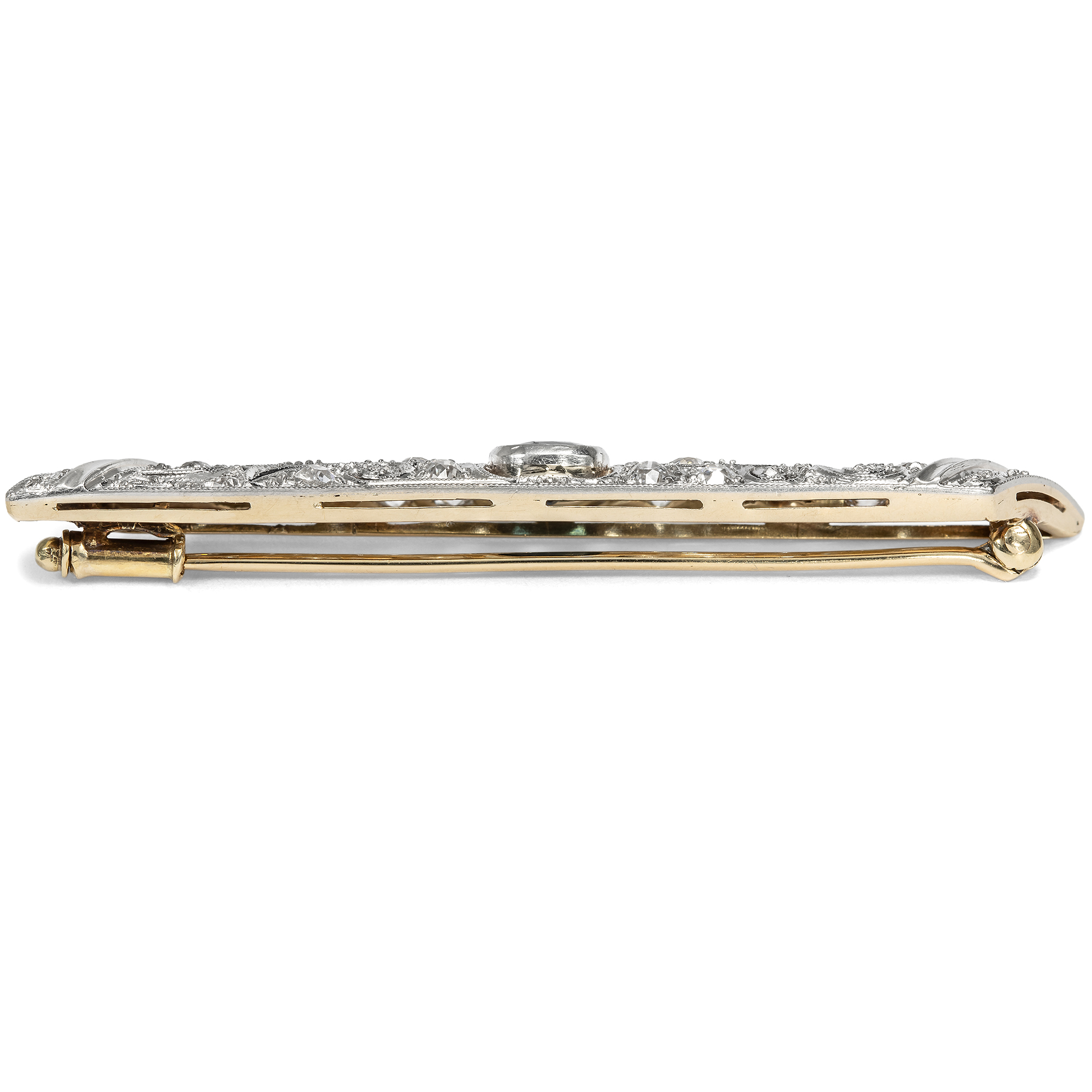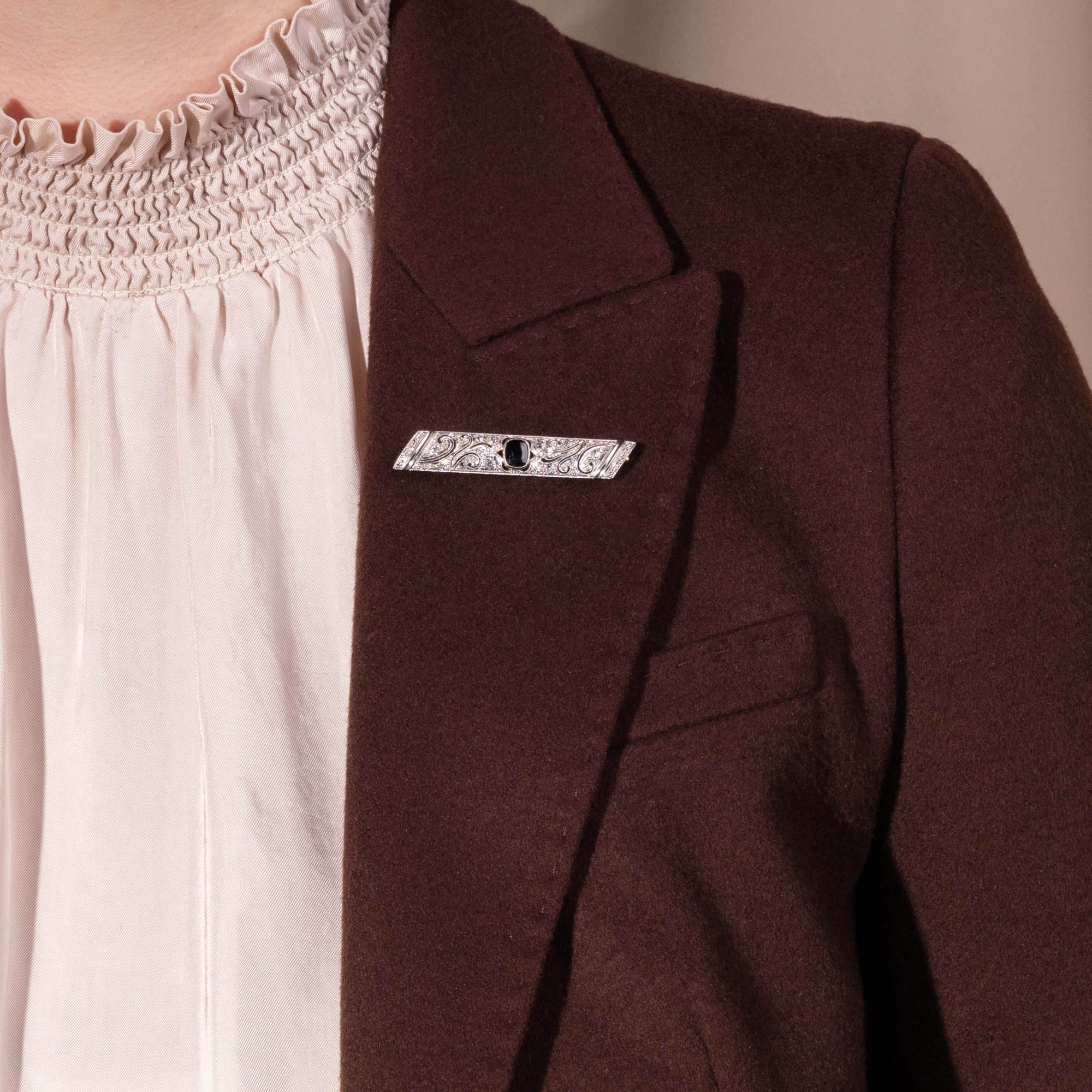 Stabbroschen, Broschetten, Anstecknadeln – all dies sind Bezeichnungen für eine Schmuckform, die sich in den ersten Dekaden des 20. Jahrhunderts großer Beliebtheit erfreute. Man trug sie auf vielerlei Weise, und insbesondere in der Zeit des Art Déco besonders kreativ. So ließ das deutsche Mode-Journal Die Dame in den Mode-Notizen des Jahres 1925 verlauten, man trüge nun „ziemlich voluminöse Anstecknadeln, die immer vorn an der Taille als Verschluß oder Abschluß eines Einsatzes am besten aussehen.“ Doch auch als Abschluss eines Blusenkragens konnte man sie sehen, oder sogar über die Krawatten der Garçonnes gepinnt. Hier liegt ein besonders charakteristischer Entwurf des Art Déco in Form eines gestreckten Parallelogramms vor. Geometrisch und kontrastreich, vereint die Brosche einige der liebsten Gestaltungsmerkmale und Materialien ihrer Epoche. Zwölf Diamanten im Altschliff und vier Diamantrosen besetzen die Oberfläche. Zart gesägte Schattenfugen und funkelnde Millegriffes bilden um sie herum ein florales Dekor. Im Zentrum bildet ein tiefblauer Saphir, der die weißen Edelsteine im Kontrast noch heller erscheinen lässt, den Höhepunkt des Entwurfs.. Zeittypisch ist auch die Kombination der Metalle, denn dem Grundmetall Gelbgold wurde hier vorderseitig eine feine Schicht aus Platin aufgelegt. Dieses Vorgehen finden wir häufig bei Schmuckstücken des frühen 20. Jahrhunderts, war doch Platin damals deutlich teurer als Gold. Die Brosche ist hervorragend erhalten. Ein mustergültiges Juwel des Art Déco!