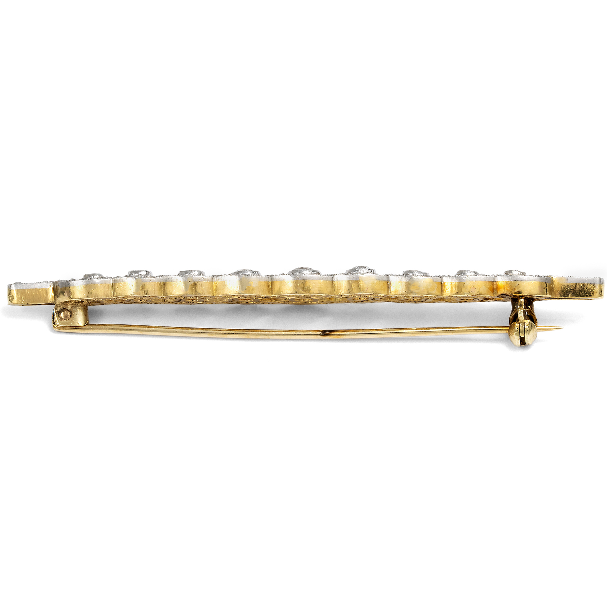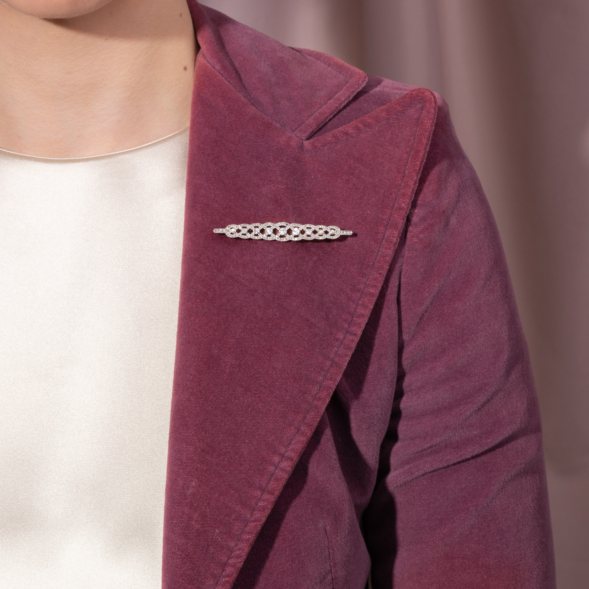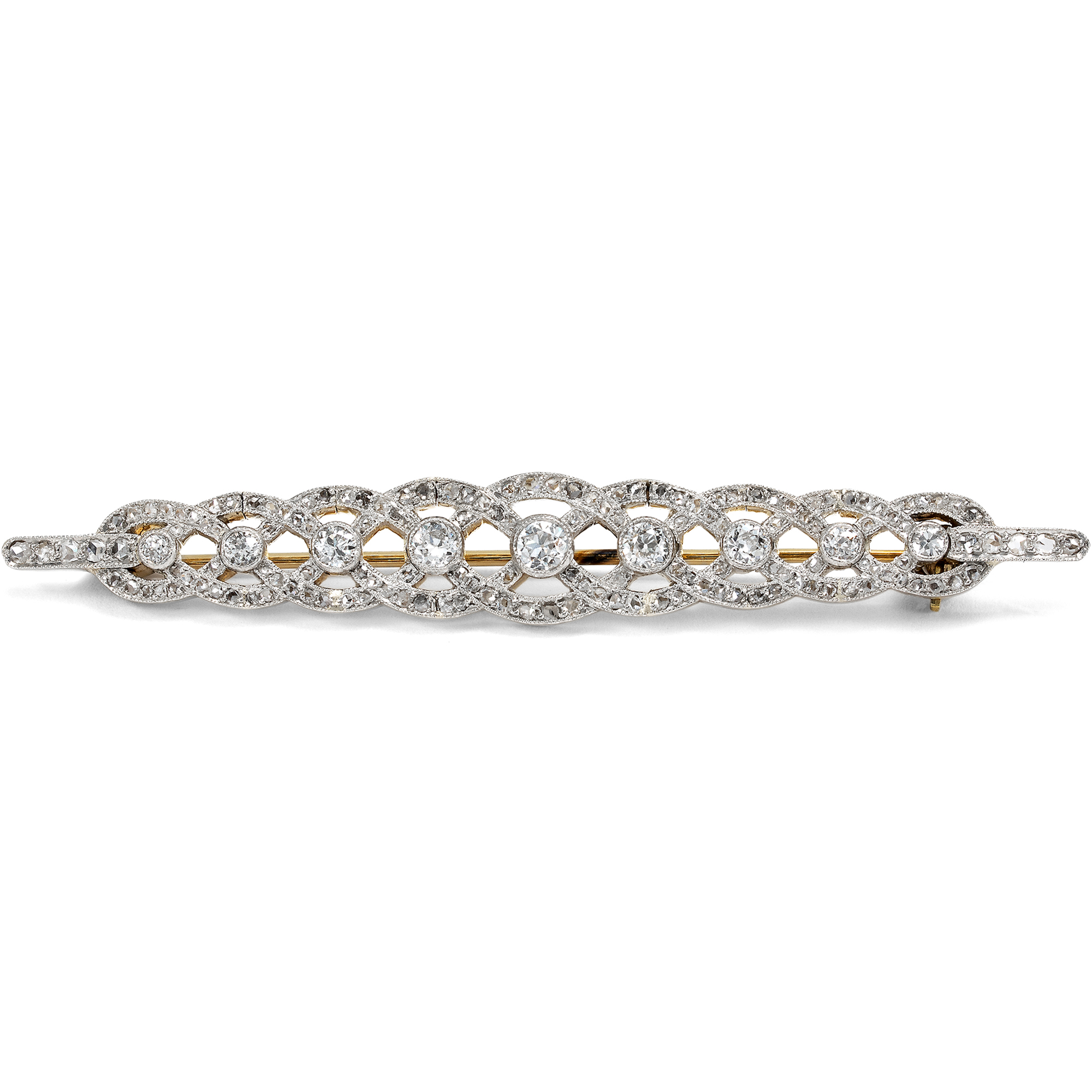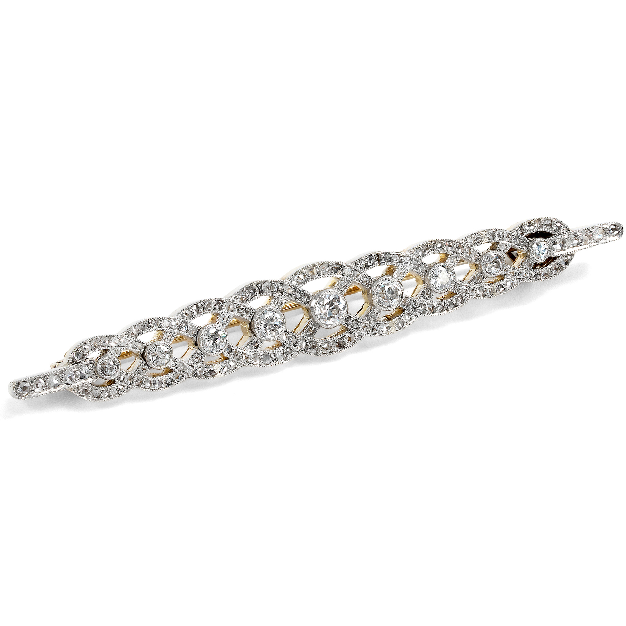 Diese Brosche aus Diamanten in Platin leuchtet hell und weiß. Ihr Entwurf ist aus scheinbar miteinander verwobenen Bändern gebildet. Größere Diamanten besetzten die Punkte, an denen die Bänder übereinander gelegt sind. Rund 150 kleine Diamanten im Rosenschliff jeden möglichen Teil der Oberfläche der Bänder. Insgesamt sind hier rund 1,10 ct Diamanten verarbeitet. Die Brosche ist symmetrisch entworfen, mit einer leichten Betonung der Mitte. Sie erinnert an keltische Ornamente ebenso wie elegante Handarbeiten. Ihre gelängte Form ist typisch für sog. Stabbroschen oder „Broschetten“ des frühen 20. Jahrhunderts. Man trug sie auf vielerlei Weise, und insbesondere in der Zeit des Art Déco besonders kreativ. So ließ das deutsche Mode-Journal Die Dame in den Mode-Notizen des Jahres 1925 verlauten, man trüge nun „ziemlich voluminöse Anstecknadeln, die immer vorn an der Taille als Verschluß oder Abschluß eines Einsatzes am besten aussehen.“ Doch auch als Abschluss eines Blusenkragens konnte man sie sehen, oder sogar über die Krawatten der Garçonnes gepinnt. Interessant ist bei dem hier vorliegenden Exemplar, dass das Schmuckstück ursprünglich nicht als Brosche, sondern als ein Armband aus beweglichen Gliedern entstanden ist. Erst in einem zweiten Schritt, doch wohl nur kurz nach seiner Entstehung in den Jahren um 1910, wurde das Armband dann zur Brosche. Ein geschickter Goldschmied hat die rechts und links angesetzten, schmalen Kettchen entfernt und die Gelenke der diamantbesetzten Glieder miteinander verlötet. Von vorn und getragen ist dies nicht zu sehen. Allein in der Seiten und vor allem in der Rückansicht lassen sich die nun fest verbundenen, ehemaligen Gelenke noch erkennen. Wir haben die Brosche so wie sie ist hier in Berlin ankaufen können.