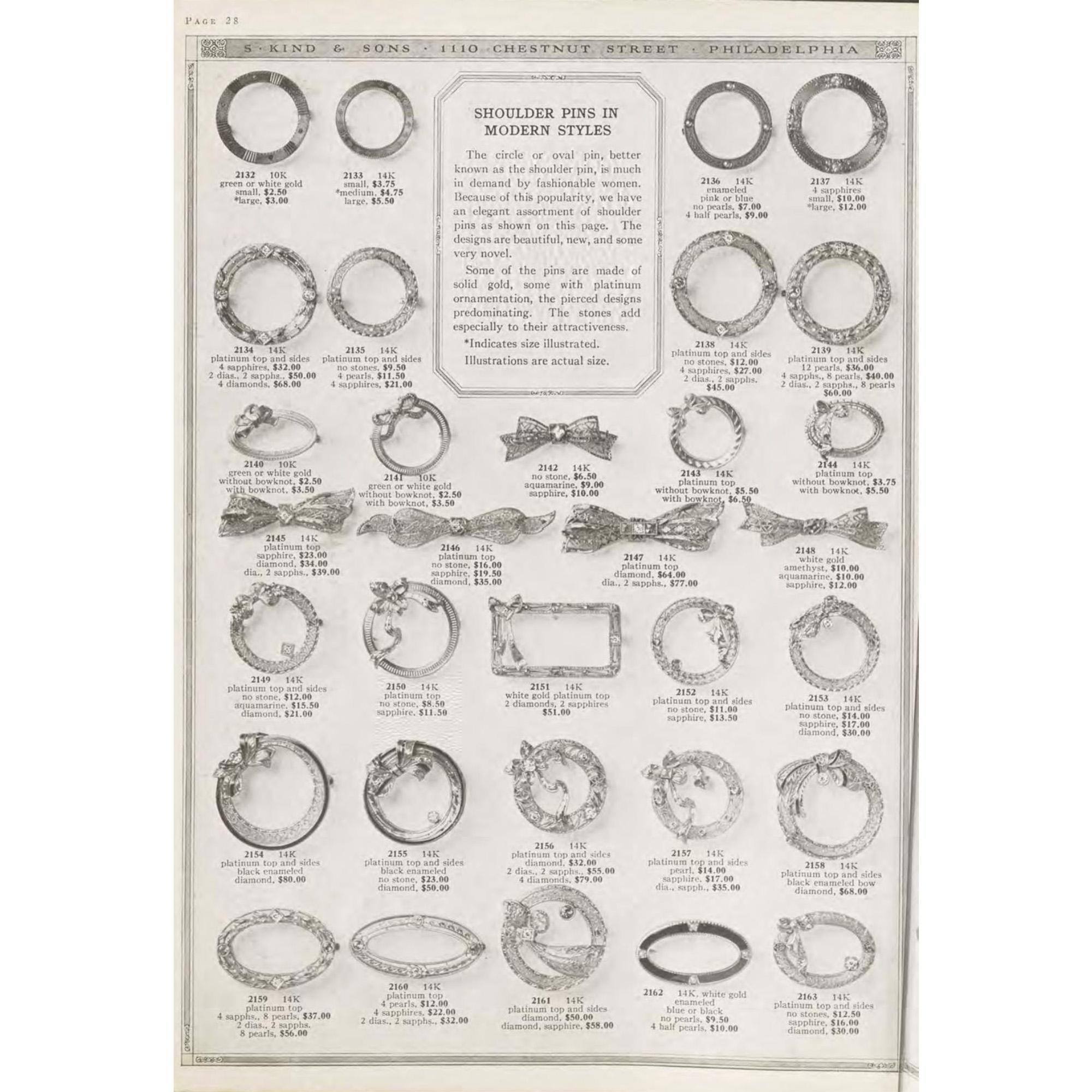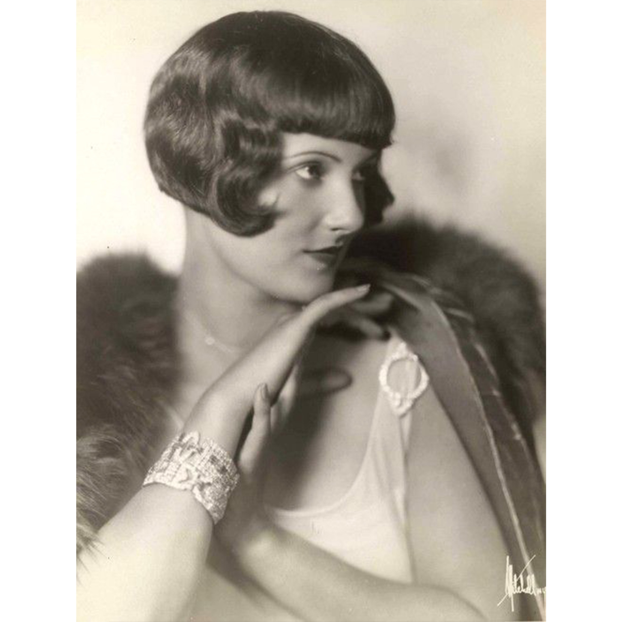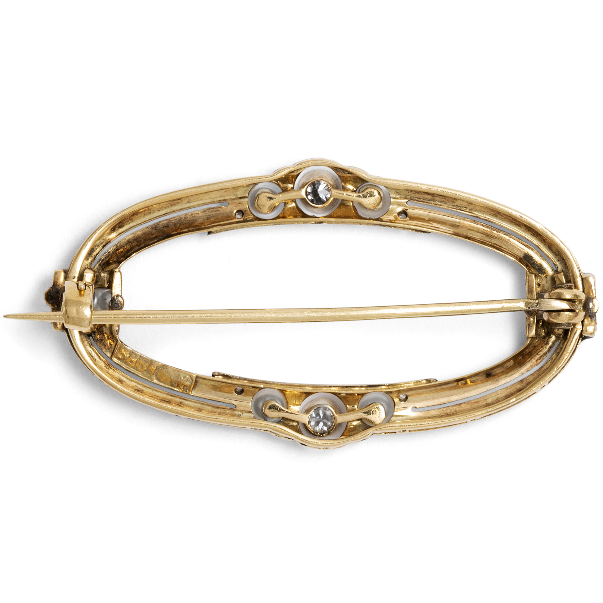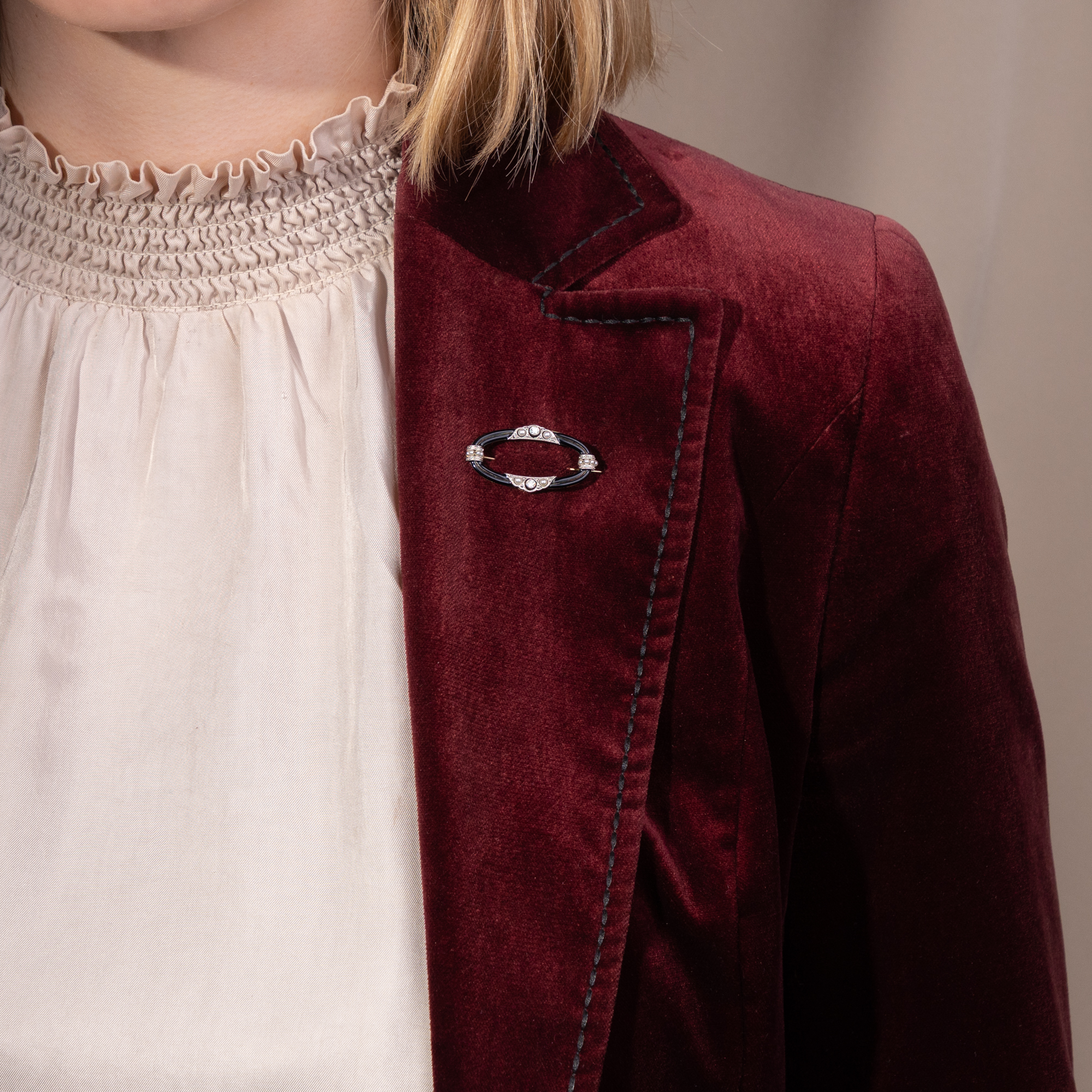 Heute ist sie oftmals zu Unrecht vergessen. In früheren Zeiten aber waren Brosche unverzichtbarer Bestandteil einer jeden Schmuckgarderobe. Wie man sie trug, entschied sich dabei je nach der vorherrschenden Mode, denn kein Schmuckstück ist so eng mit der Kleidung verknüpft wie die Brosche. Um 1900 waren Kragenbrosche zur hochgeschlossenen Bluse modern, in den 1920er Jahren waren sie bereits veraltet. Statt hochgeschlossener Blusen waren nun Kleider mit schmalen Trägern modern, die nach einer neuen Art Brosche verlangten: Dem sog. „shoulder pin“, wie es in amerikanischen Schmuckkatalogen der Zeit heißt. „The shoulder pins are probably the most admired pieces of jewellery to-day“, schrieb etwa die Juweliersfirma S. Kind & Sons aus Philadelphia 1924. Wir bilden anbei eine Annonce derselben Firma des Jahres 1925 ab. Diese „shoulder pins“ zeichneten sich dadurch aus, dass sie einen schmalen runden, ovalen oder rechteckigen Rahmen und im Inneren einen Freiraum besitzen, durch den der seidene Träger des Kleides hindurchschimmern kann. Eine Fotografie der Schauspielerin und Ziegfeld Follies Revuetänzerin Betty Compton aus den 1920er Jahren etwa illustriert die Kleidsamkeit einer solchen Brosche wunderbar (vgl. letztes Foto). Auch unsere Brosche war einst als edler Blickfang für ein Abendkleid gedacht. Das aus Gold gearbeitete Oval ist mit schwarzem Email belegt. An den vier Enden setzten Platinelemente mit Naturperlen und Diamanten weiß-schimmernde Akzente welches nebst Millegriffes das Spiel von Licht und Schatten auf der monochromen Brosche verstärkt. Die Stempelung verrät, dass sie in der Bijouteriefabrik von Martin Mayer in Pforzheim entstanden ist. Das schöne Schmuckstück ist hervorragend erhalten und bereit, aufs Neue einen seidenen Träger, einen Schal oder ein anderes Kleidungsstück Ihrer Wahl zu zieren.