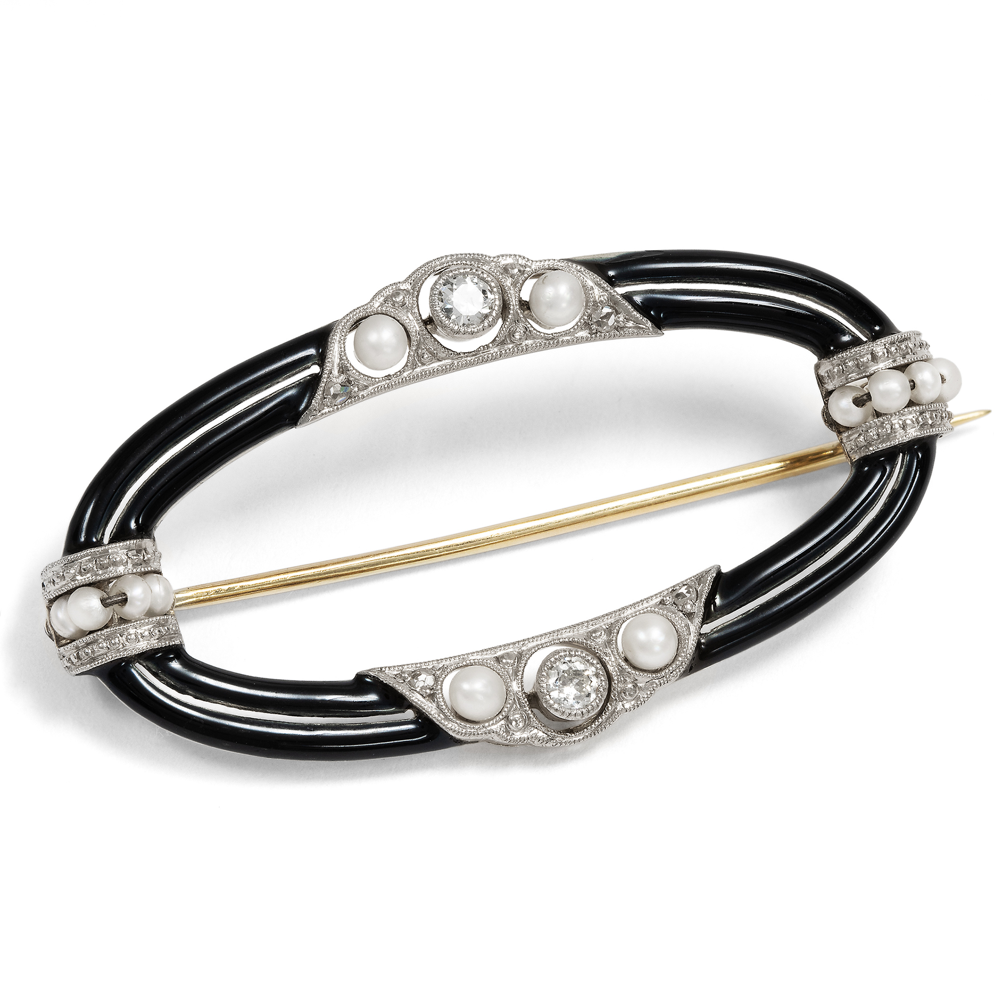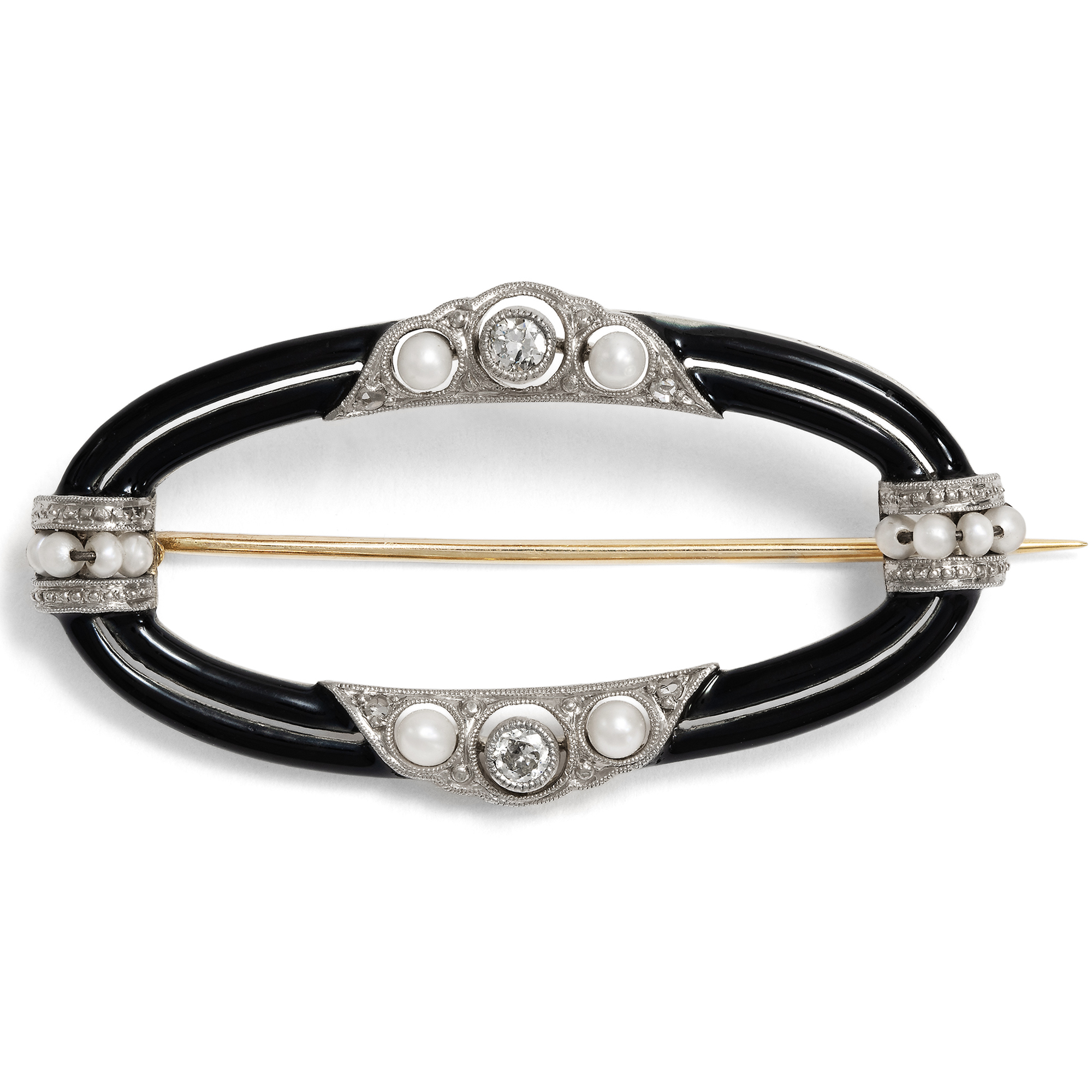 Elegante Brosche mit Diamanten, Perlen & schwarzen Email von Martin Mayer, Pforzheim um 1925
