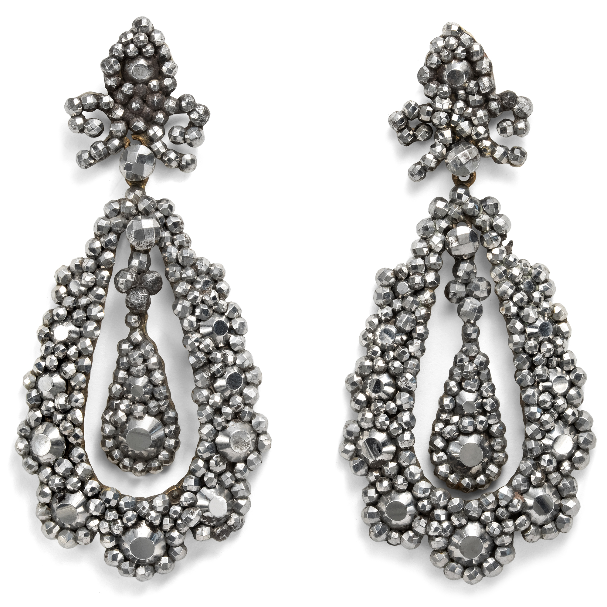 Wussten Sie, dass Eisen einst zu den geschätzten Materialien der Schmuckkunst gehörte? Und das nicht etwa im Mittelalter, sondern in vergleichsweise jüngerer Zeit. Besonders in England erregte fein verarbeiteter Eisenschmuck große Aufmerksamkeit, dort unter dem Namen „Cut Steel“ bekannt. Bei dieser bereits im 18. Jahrhundert entwickelten Technik wird gehärteter Stahl facettiert geschliffen und auf Hochglanz poliert, sodass das Licht in unzähligen kleinen Flächen reflektiert wird. So erhält das ursprünglich schlichte Material eine überraschend kostbare Wirkung. Hochwertige Cut-Steel-Arbeiten können in ihrem Funkeln beinahe an Diamanten erinnern. Aus zahllosen kleinen, sorgfältig vernieteten Elementen entstanden komplexe, oft mehrschichtig aufgebaute Kompositionen von großer Raffinesse und dekorativer Kraft. Die hier vorliegenden Ohrringe aus dem frühen 19. Jahrhundert sind ein besonders schönes Beispiel dieser heute selten gewordenen Technik. Unter einer fein gearbeiteten Schleife aus funkelnden Cut-Steel-Elementen hängt jeweils ein großzügig gestaltetes Pendel. Im Zentrum befindet sich ein großer, tropfenförmiger Körper aus facettiertem Stahl, umgeben von kleineren, präzise gearbeiteten Elementen. Gerade die weit ausladenden Flächen des Tropfens entfalten ein außergewöhnlich lebendiges Lichtspiel, das dem Schmuckstück eine fast überirdische Ausstrahlung verleiht. Das Paar, sehr wahrscheinlich in England entstanden, kam aus Köln zu uns und begeistert durch seine feine Ausführung ebenso wie durch seine ungewöhnliche Materialität.