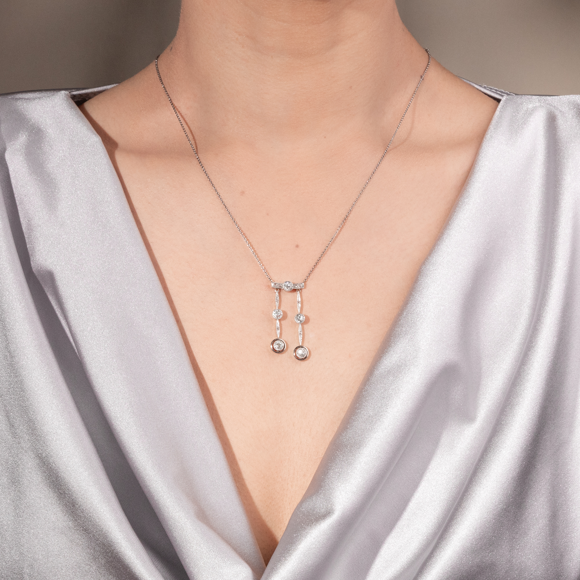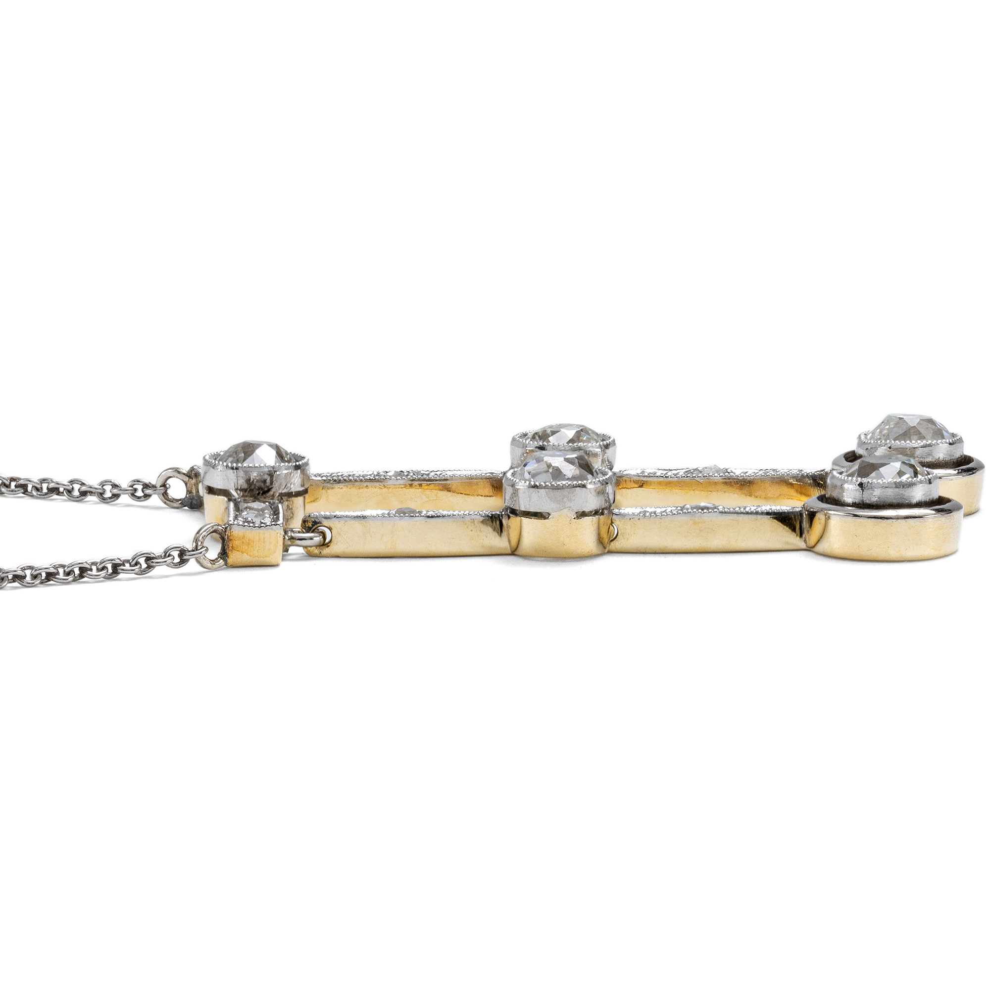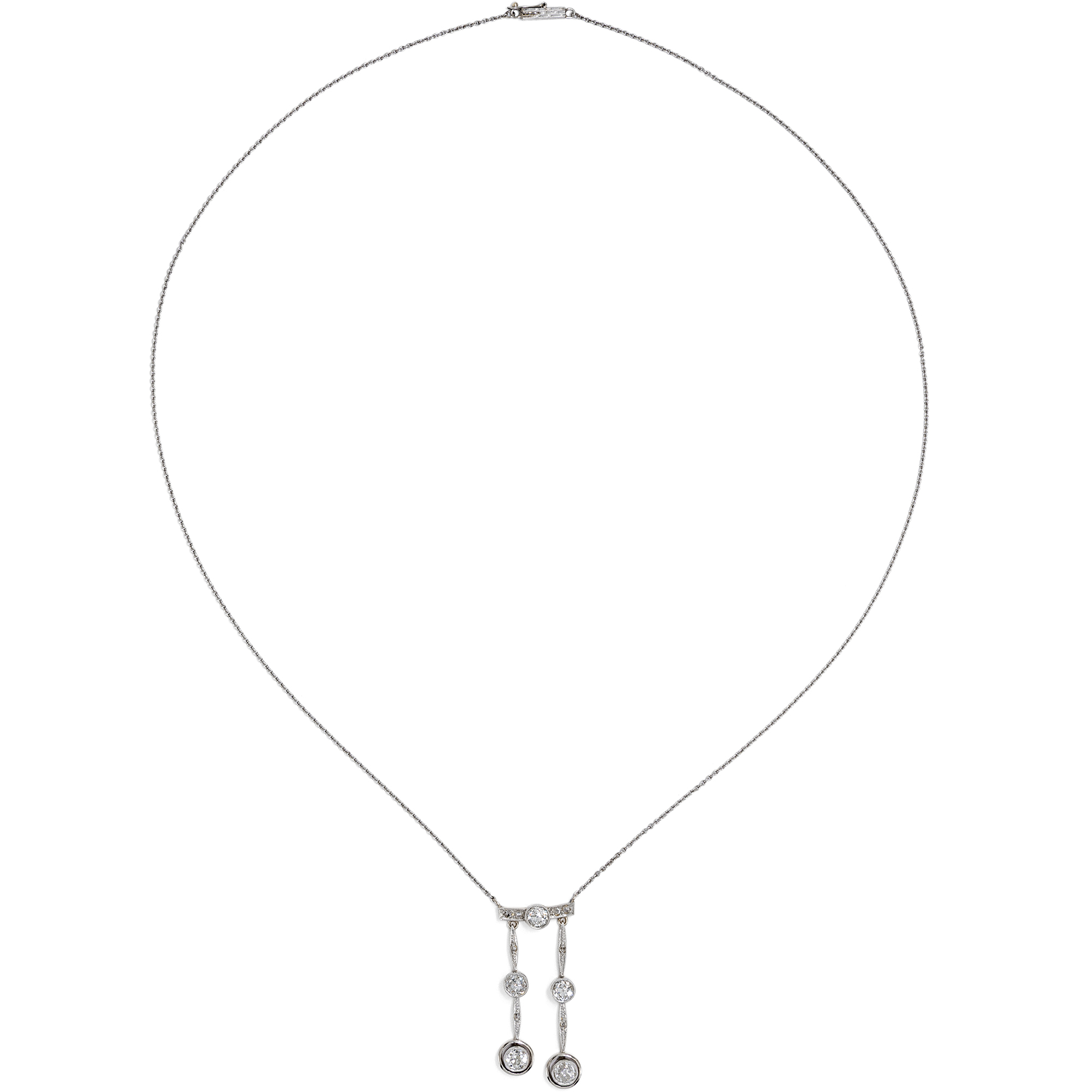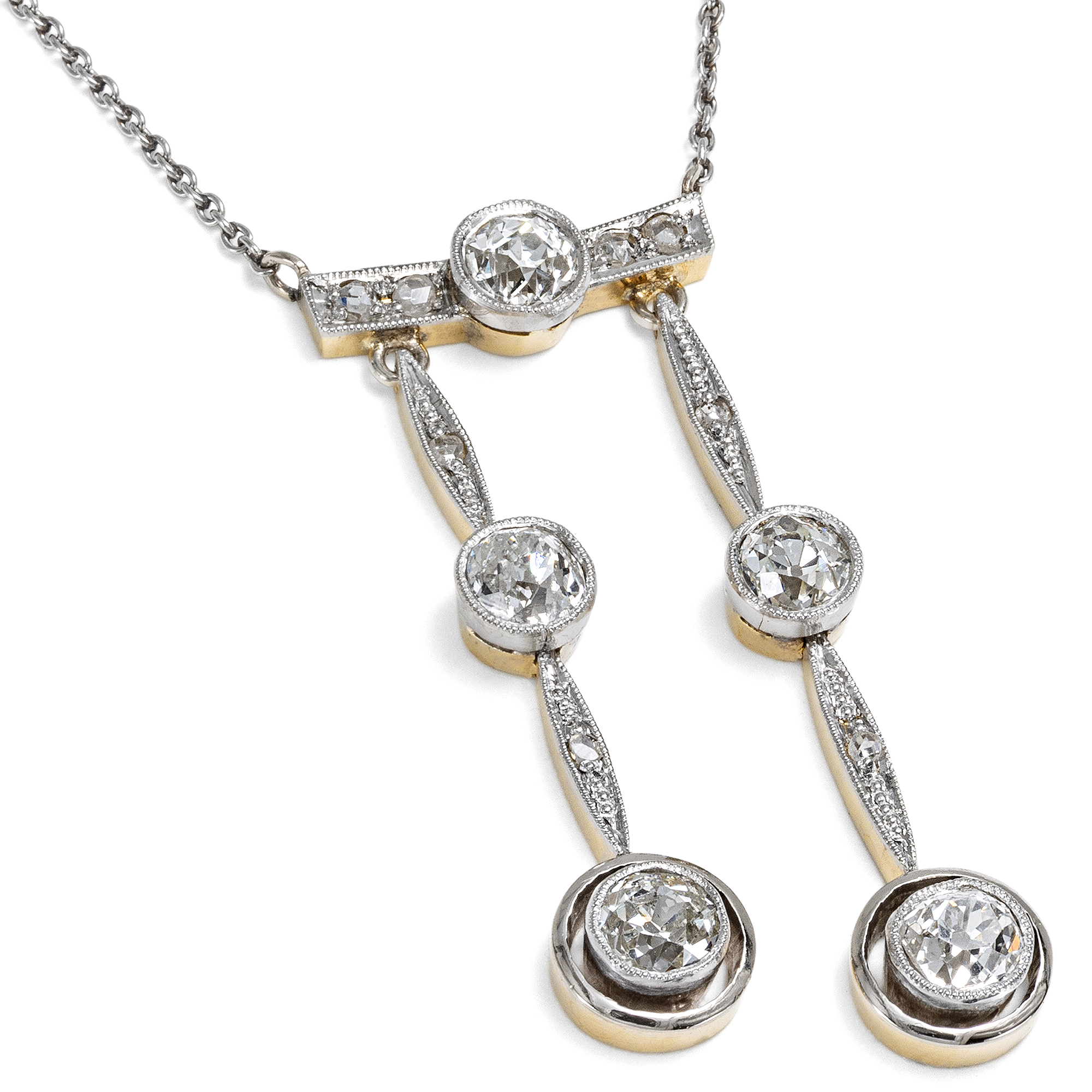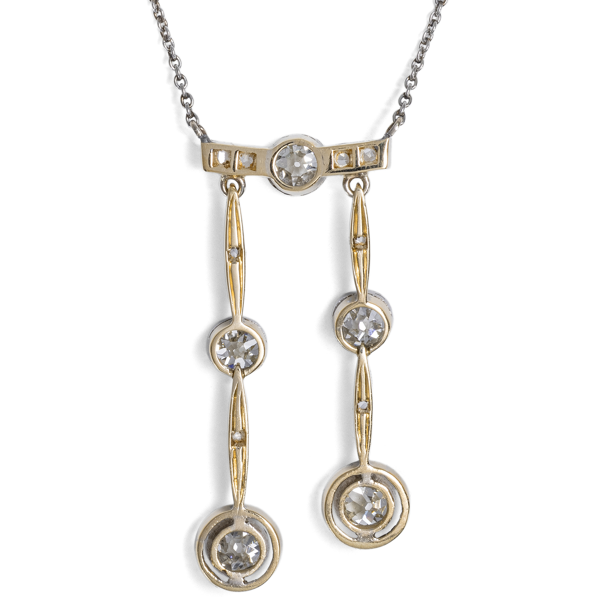 Mit der Jahrhundertwende wurde die Mode leicht und optimistisch, ganz so, als habe der Neubeginn des Jahrhunderts auch einen Neubeginn im Bereich des Geschmacks gebracht. Der Blick in zeitgenössische Schmuckkataloge zeigt diesen Wandel. Wo zuvor noch schwere Entwürfe in Gelbgold dominiert hatten, begegnen nun seitenweise „Moderne Colliers“. Der Katalog des Juweliers F. Todt aus Pforzheim für das Jahr 1913/14 zeigt eine große Auswahl entsprechender Entwürfe; wir bilden eine beispielhafte Doppelseite ab. Zu dieser Zeit ist auch das hier vorliegende Collier entstanden. Es ist aus Gold mit einer Schauseite aus Platin gefertigt und präsentiert an einer zarten Ankerkette einen mit Diamanten besetzten Steg, in den mittig ein großer Altschliffdiamant eingelassen ist. Zwei unterschiedlich lange Pendel sind daran angefügt. Auch diese beiden beweglichen Anhänger sind mit Diamanten ausgefasst: Neben kleinen Diamantrosen sind hier noch einmal vier größere Diamanten im sog. „Old Mine Cut“ eingesetzt, deren Schliffe vermutlich älter sind als das Collier selbst. In jenen Jahren warben zahlreiche Firmen damit, alte, unmodern gewordenen Juwelenstücke zu modernisieren oder alte Steine modern zu fassen. Wir vermuten also, dass das Collier Edelsteine hält, die vorher einmal ein anderes Schmuckstück zierten. Insgesamt wiegen die fünf großen Diamanten zusammen etwa ein Karat und überzeugen durch eine sehr schöne Qualität. Entdeckt haben wir das schöne und zeittypische Schmuckstück in Stuttgart.