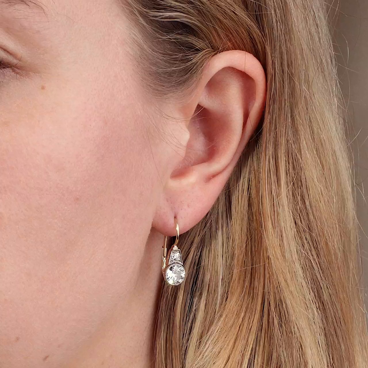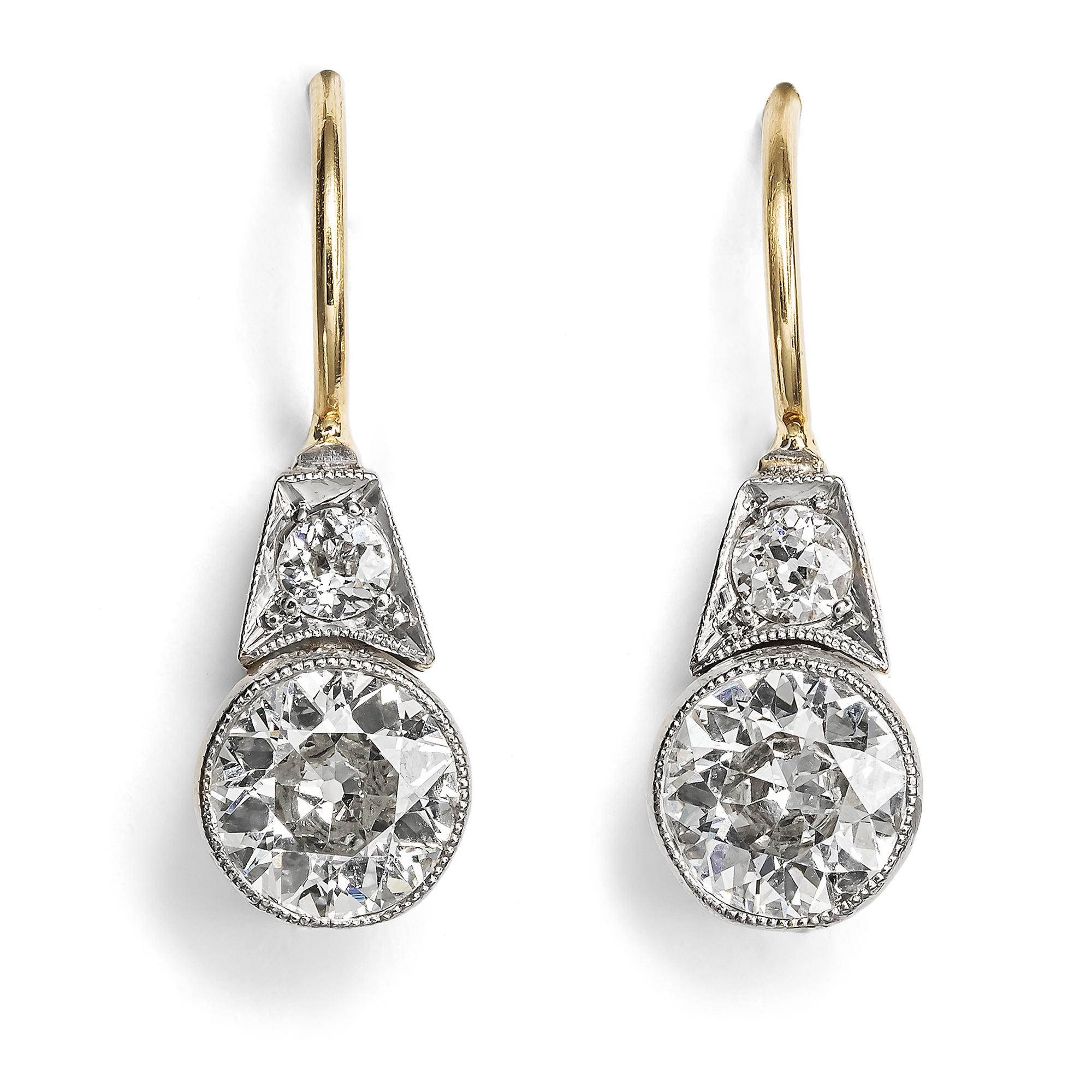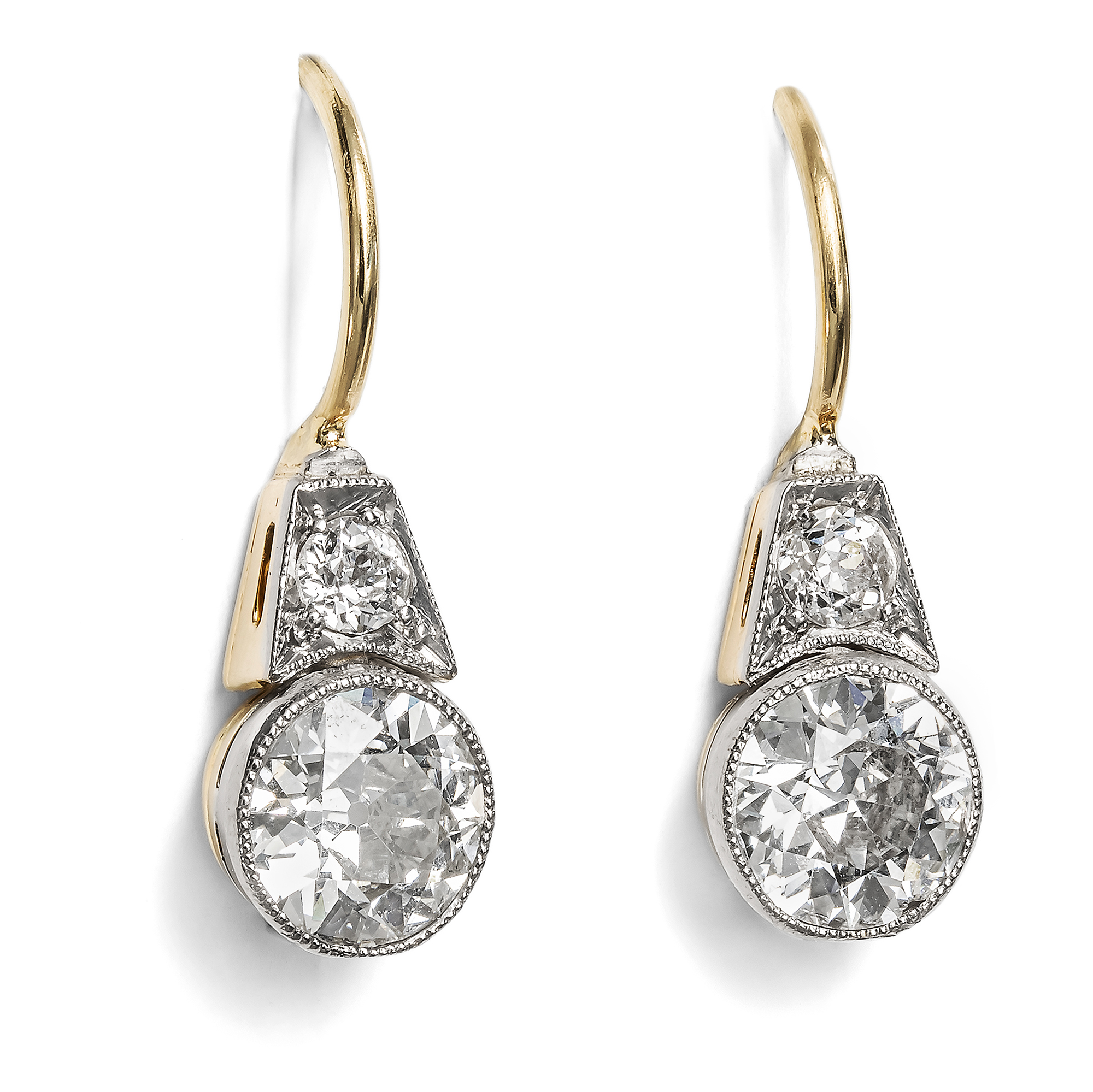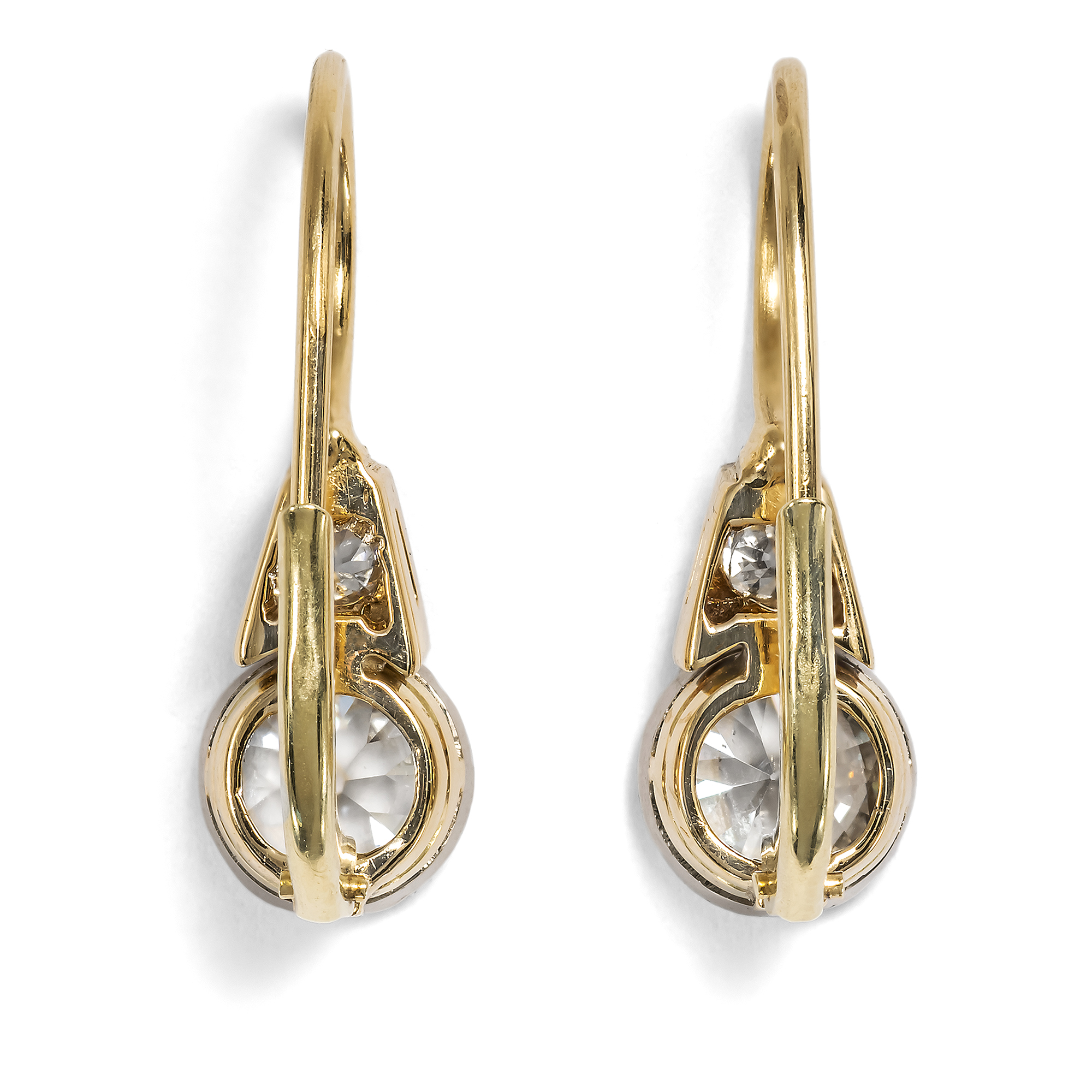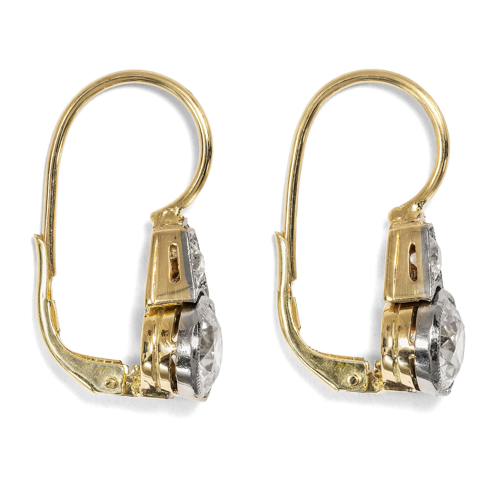 Für jede Epoche gibt es bestimmte Schmuckformen, die bis heute als besonders charakteristisch gelten. Für die Zeit des Art Déco sind dies neben Stabbroschen und flachen Ringen mit schildartigen Schauseiten vor allem Ohrhänger, die nach Jahren der Zurückhaltung wieder in Mode kamen. Zuvor hatten kleine Ohrstecker, Dormeusen oder sogar ungeschmückte Ohrläppchen das Bild bestimmt, doch mit den 1920er-Jahren kehrte die Freude an hängenden Ohrringen zurück. Diese neuen Ohrringe standen in engem Zusammenhang mit den modernen Bubikopf-Frisuren, dem vielleicht sichtbarsten Zeichen der emanzipierten Frau jener Zeit. Sie rahmten das Gesicht, betonten die klaren Linien der Frisur und wurden so zu einem Sinnbild der neuen Ästhetik der Zwanzigerjahre. Das hier vorliegende Paar Ohrhänger folgt dieser Mode in besonders schöner Weise, ohne zu groß oder schwierig zu tragen zu sein. An einem Ohrbügel aus Gold, der auf der Schauseite einen Diamanten in trapezförmiger Zargenfassung trägt, ist jeweils ein Diamant im sogenannten Old European Cut in schlichter, runder Zargenfassung angebracht. Diese großen Steine wiegen zusammen etwa 1,85 ct, sodass in diesem Paar insgesamt mehr als zwei Karat Diamanten in alten Schliffen verarbeitet sind. Die Ohrringe gelangten aus Hamburg zu uns; die Bügel aus hochkarätigem Gold haben wir erneuert.