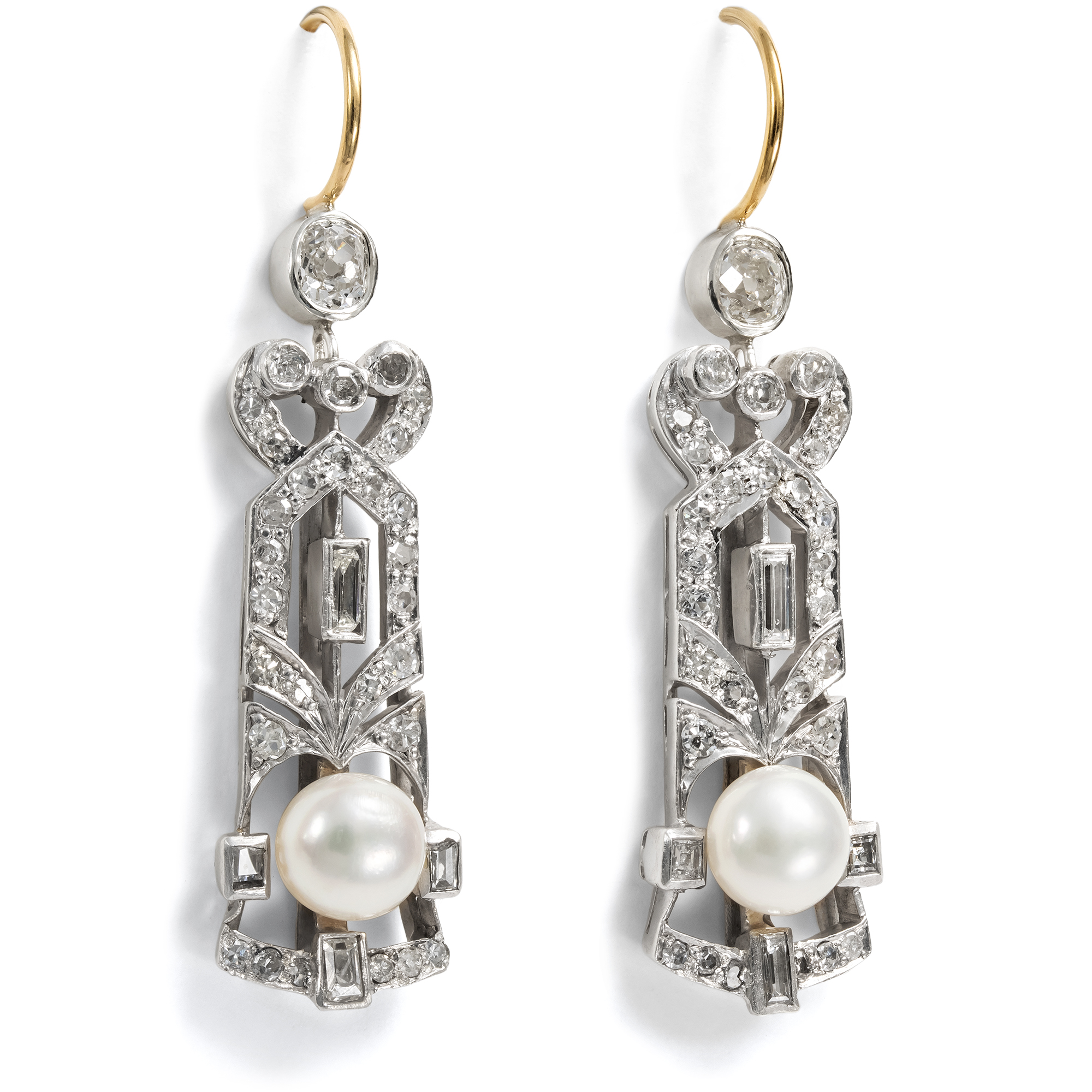 Zu Beginn des 20. Jahrhunderts veränderte sich das Bild der Frau in Europa mit nie gekannter Geschwindigkeit. Mit dem Erwachen der Moderne wandelten sich Haltung, Kleidung und Selbstverständnis, und auch in der Kunst fand diese neue Freiheit ihren Ausdruck. Architektur, Malerei und Schmuckdesign strebten nach Klarheit, nach Form, nach einer neuen Schönheit jenseits des Überladenen. Das Zeitalter des Jugendstils war angebrochen. Aus dieser Epoche stammen die hier vorliegenden Ohrhänger, die in ihrer Eleganz und grafischen Strenge ganz den Geist des mitteleuropäischen Jugendstils atmen. Gefertigt aus später rhodiniertem Gold und Silber, verbinden sie meisterhafte Handarbeit mit einem feinen Sinn für Proportion. In geometrischen Fassungen sitzen insgesamt sechsundsechzig Diamanten im Altschliff und im Baguetteschliff, deren Gesamtgewicht etwa 2,48 Karat beträgt. Ihre kühle Brillanz bildet einen harmonischen Kontrast zum sanften Schimmer zweier natürlicher Perlen, die das Ensemble mit einem leichten, irisierenden Glanz vollenden. Die Gestaltung folgt klaren Linien, die typisch sind für Entwürfe des Wiener Jugendstils der Jahre um 1910. In der Balance zwischen dekorativer Strenge und sinnlicher Eleganz zeigt sich der Einfluss des Secessionsstils, jener künstlerischen Bewegung um Gustav Klimt, Koloman Moser und Josef Hoffmann, die das Ornament auf seine reine Form und die Kunst auf ihre Essenz zurückführte. Schmuckstücke wie diese Ohrhänger übersetzen jene Idee der „reinen Linie“ in Edelmetall und Licht – sie sind kleine Kunstwerke, die das Ideal der Schönheit durch Klarheit verkörpern. Wir haben die Ohrringe in Wien entdeckt.