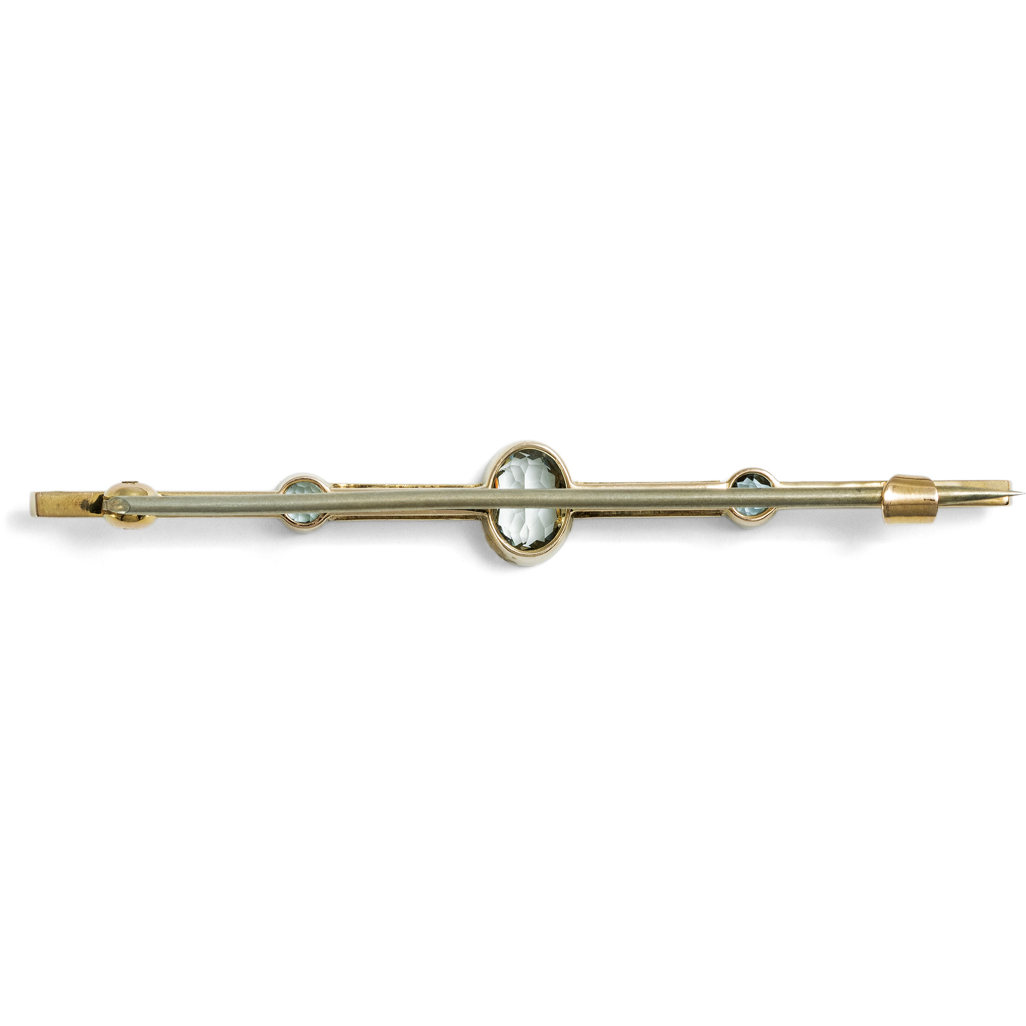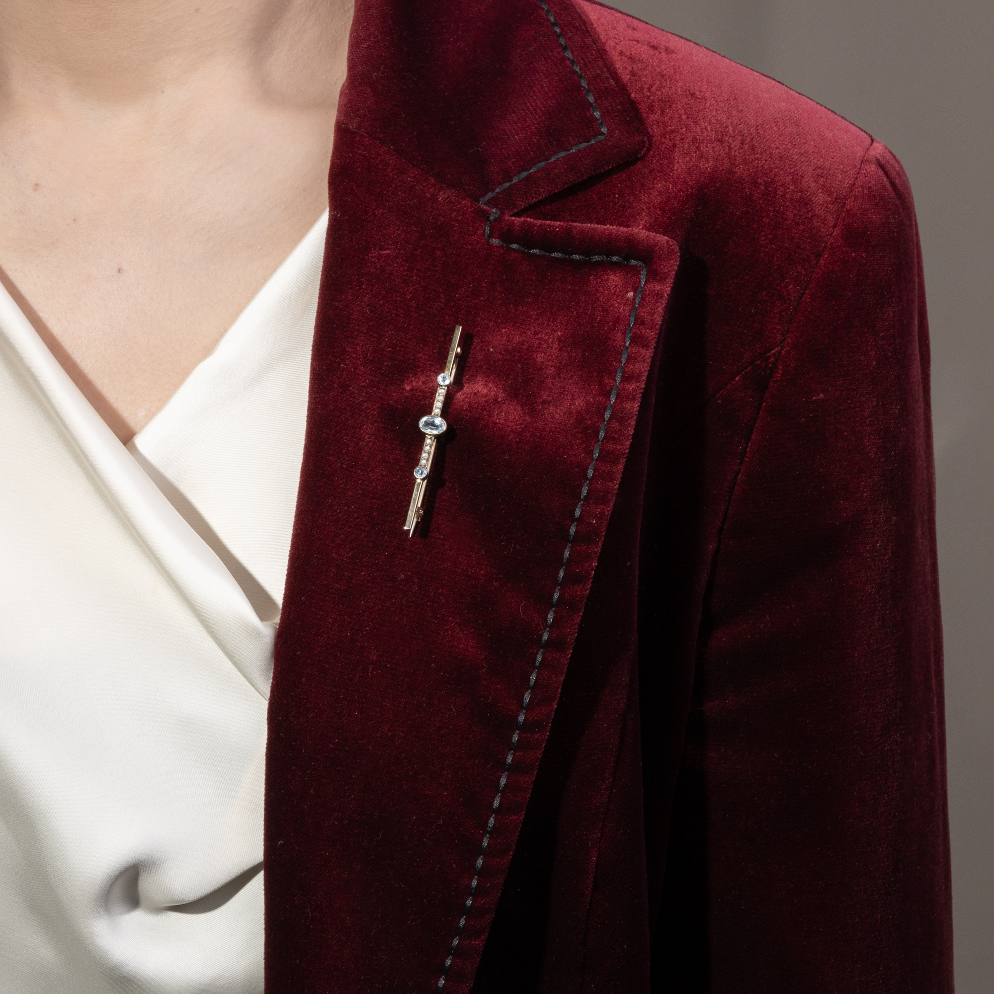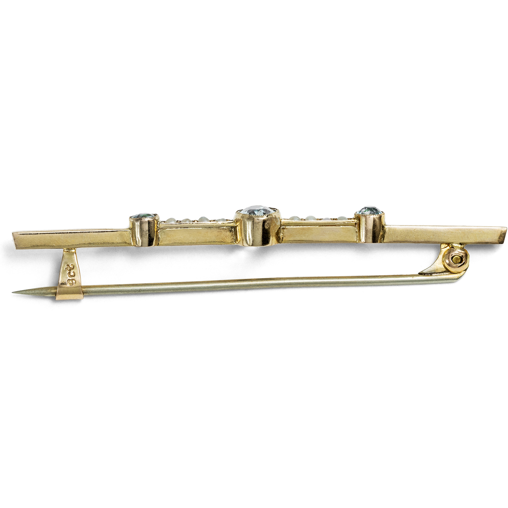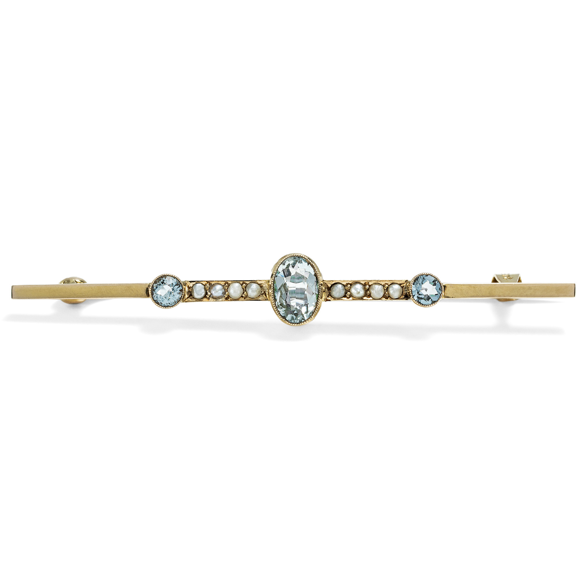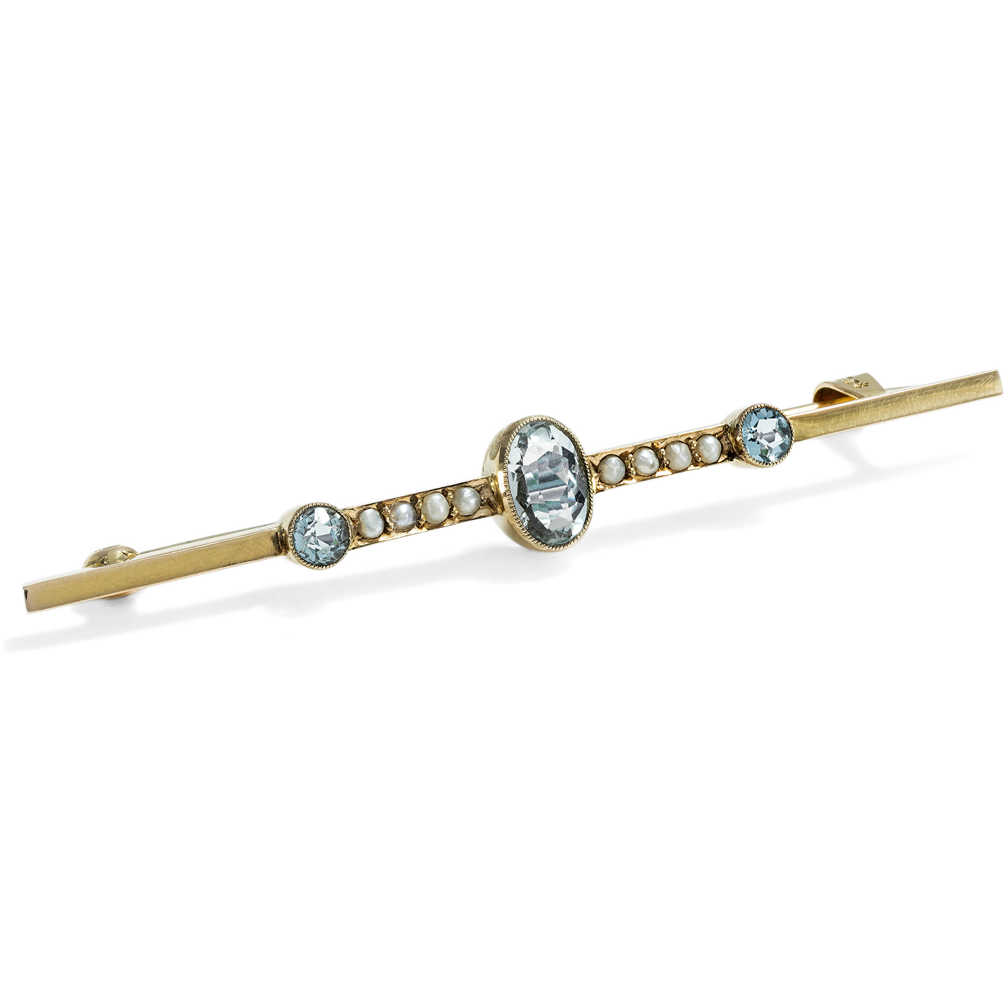 Heute kaum noch Teil des Repertoires der modernen Goldschmiede und Juweliere, zählte die Stabnadel einst zu den beliebtesten Schmuckstücken des frühen 20. Jahrhunderts und war in der Schmuckgarderobe einer jeden vornehmen Dame vorzufinden. Von Exemplaren für den Tag, in Gold und mit Perlen oder bunten Edelsteinen besetzt, bis hin zu qualitätvollen Diamantnadeln für den Abend nahm die Stabbrosche viele Formen an. Die hier vorliegende Brosche ist ein typischer Vertreter dieses Schmucktypus und entstand in den Jahren um 1920. Sie zeigt sich als schlichter Stab, der in der Mitte mit einem Arrangement aus drei hellblauen Aquamarinen und schimmernden Perlen besetzt ist. Laut Stempelung ist das zierliche Schmuckstück in Großbritannien aus Gold gefertigt worden. Der Wandel der Moden hat der Vielseitigkeit der Stabnadel keinen Abbruch getan, und so lässt sich das elegante Stück noch stets effektvoll an der Bluse, dem Revers eines Blazers oder eines Mantels tragen. Sie fand hier in Berlin zu uns.