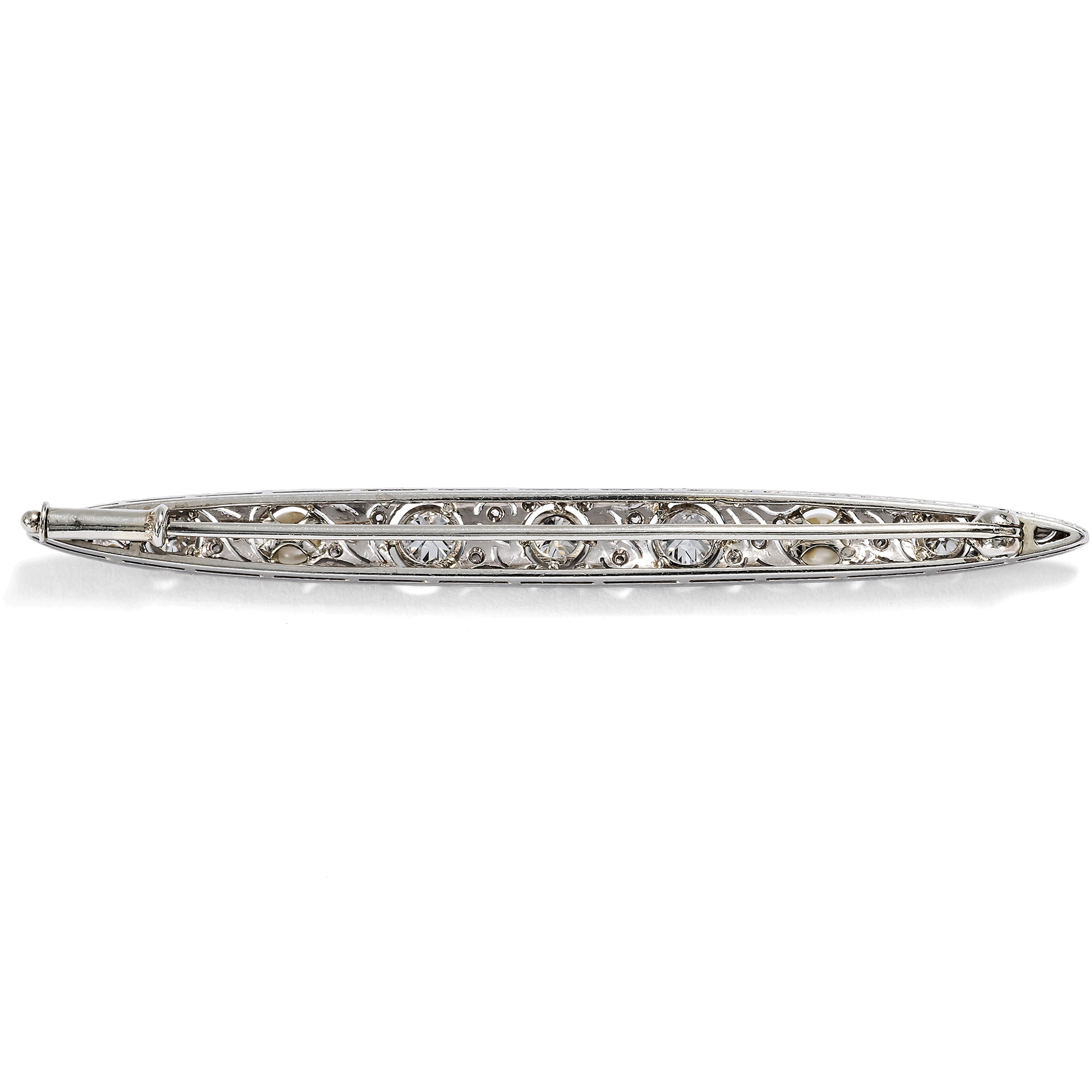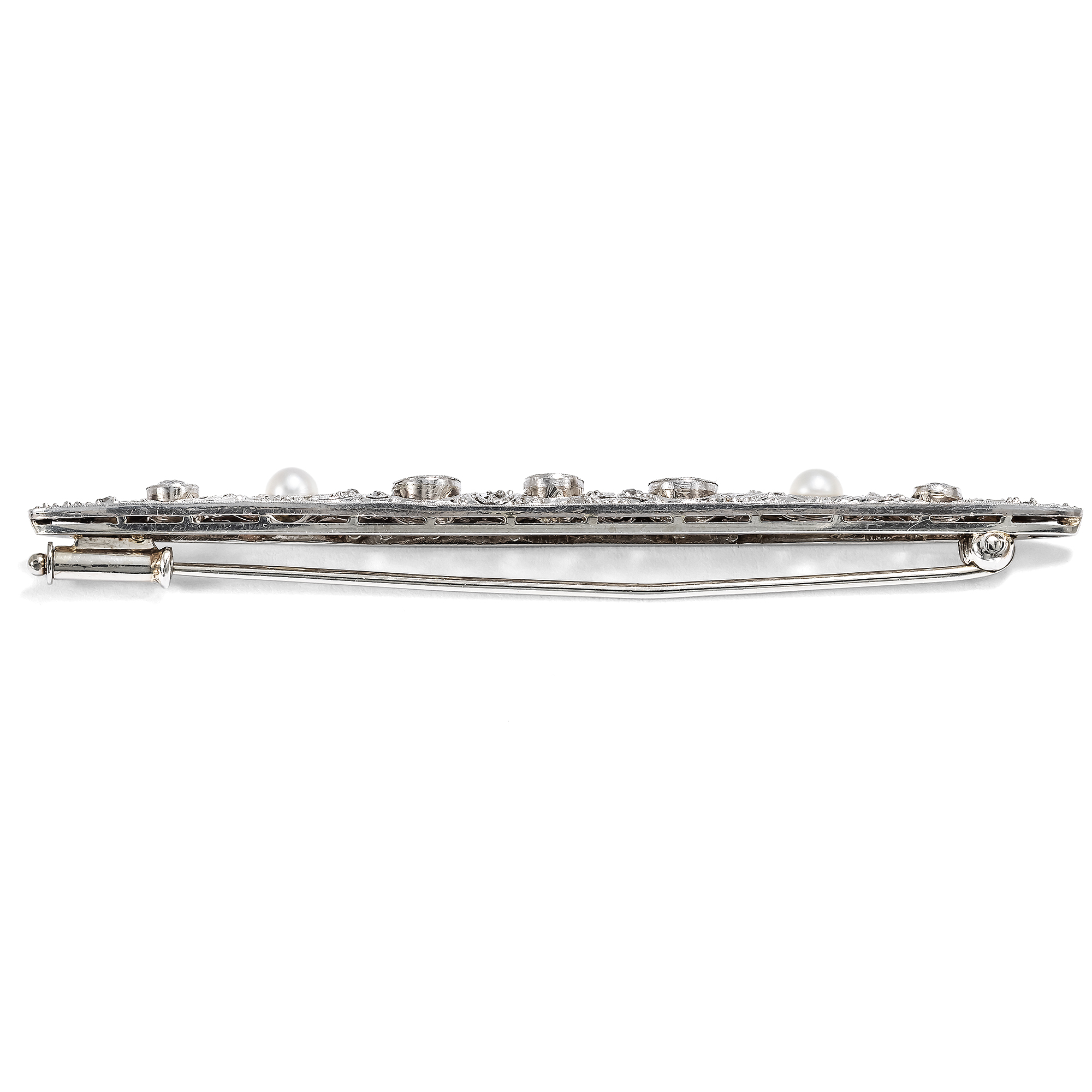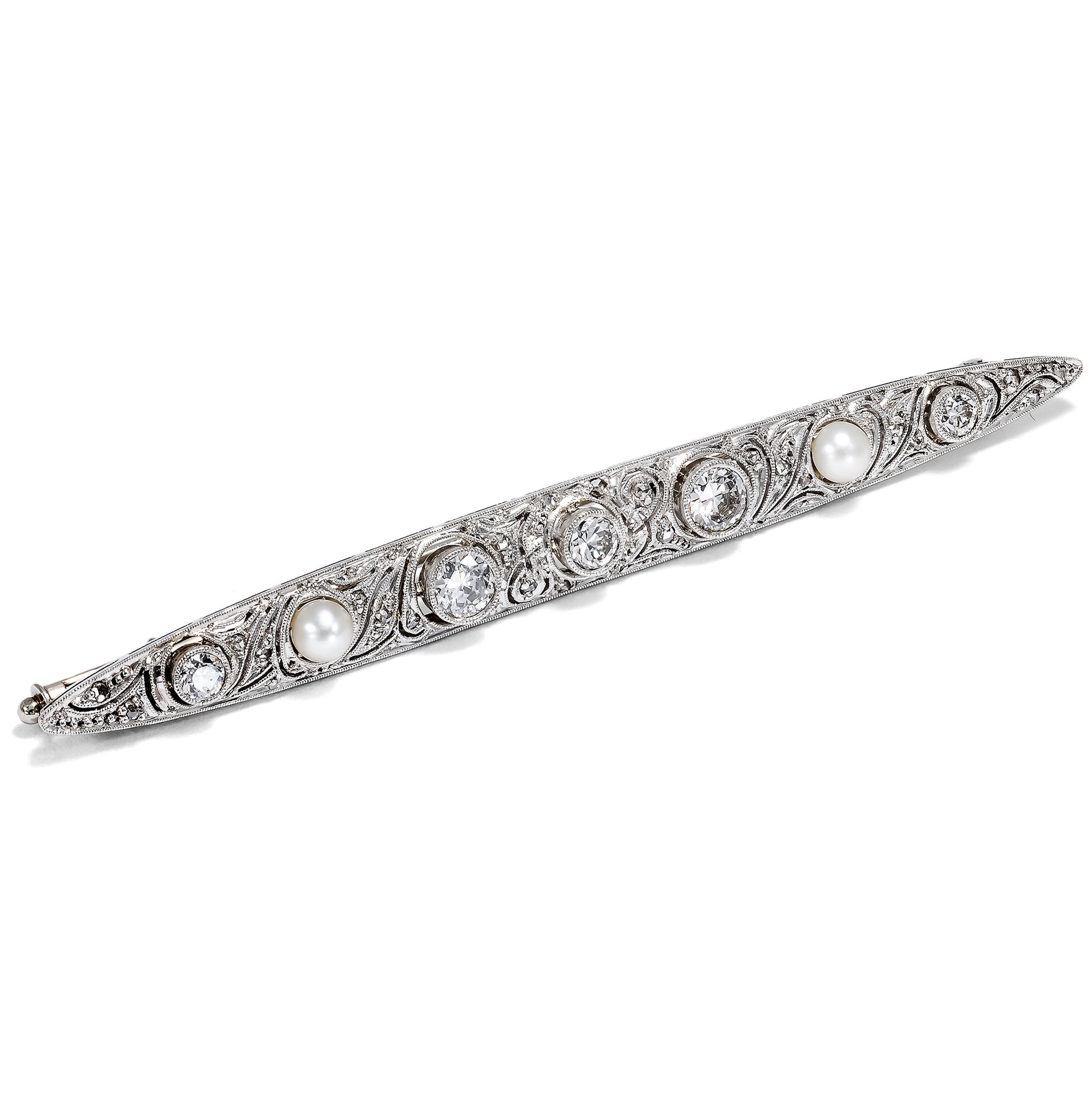 Weißjuwelen aus weißen Edelmetallen und ebensolchen Edelsteinen waren zu Beginn des 20. Jahrhunderts die Königsdisziplin des Schmucks und begleiteten die elegante Dame am Abend. So sind auch hier zwei natürliche Perlen zusammen mit feinen Diamanten arrangiert. Schimmernde Diamantrosen sind zusammen mit fünf größeren Altschiffdiamanten eingelassen, so dass insgesamt etwa 1,10 ct Diamanten verarbeitet sind. Die feine Brosche ist schauseitig aus Platin gefertigt, während die restliche Nadel aus Weißgold besteht – denn damals war Platin noch um ein Vielfaches teurer als Gold. So entspricht das schöne Schmuckstück in allen Details dem Anspruch des verfeinerten Geschmacks. Zu uns kam das feine Juwel der 1920er Jahre aus Hamburg. Geliefert wird es mit einem antiken, möglicherweise originalen Etui des Juweliers Wilhelm Fröhlich, Bremen.