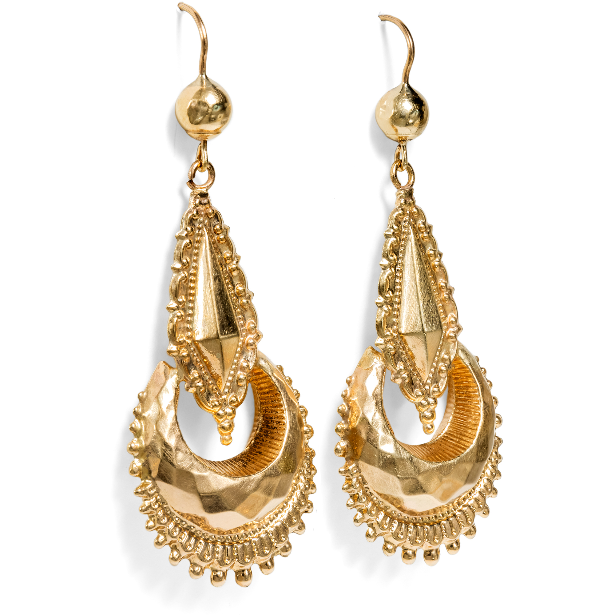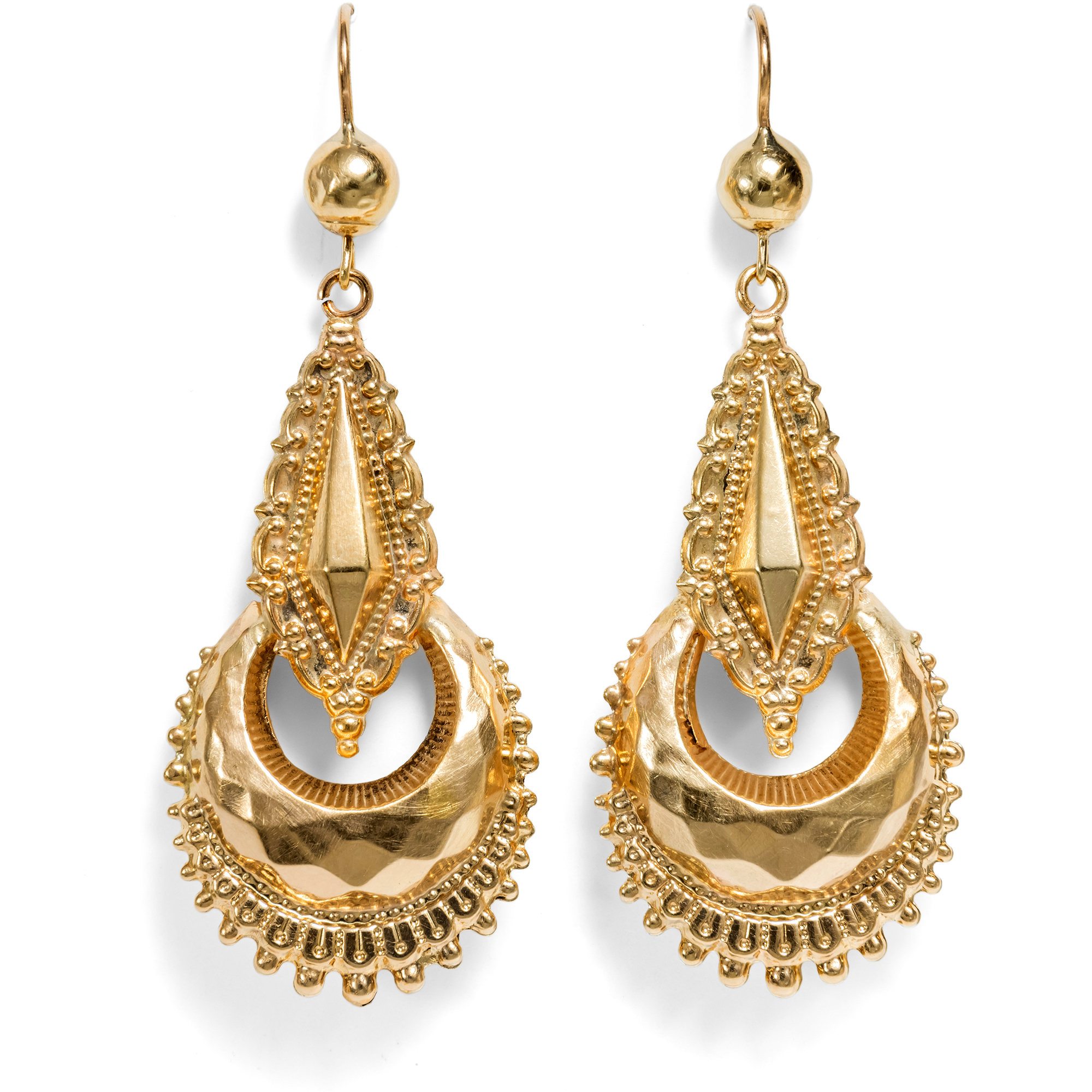 Die hier vorliegenden Ohrringe aus Großbritannien beeindrucken durch ihre Größe. Unter den zarten Ohrbügeln, die in einer Kugel enden, ist zunächst ein großes, rautenförmiges Element gehängt, dessen Oberfläche ein geprägtes Ornament aus randständigen Bögen zeigt. Große, facettiert wirkende Halbmonde schließen die Kreation nach unten ab. Die Ohrringe entsprechen in ihrer eindrucksvollen Größe der Mode der Jahre um 1870. Leuchtend golden und möglichst lang sollten die Ohrringe auch tagsüber sein. Da die Haare zu Korkenzieherlocken onduliert und im Nacken zusammengenommen wurden, kamen die derart geschmückten Ohrläppchen zudem hervorragend zur Geltung. In den 1880er und 1890er Jahren dagegen galt es dann plötzlich als unfein, am Tage lange und auffallende Ohrringe zu tragen und die eben noch modischen Ohrringe landeten ganz hinten im Schmuckkästchen. Ein zeitgenössischer Katalog der Londoner Firma Streeter aus dem Jahr 1870 zeigt, in welcher Vielfalt der Formen solche Stücke damals entstanden, vgl. online auch hier. Diesem Wandel der Moden haben wir heute auch zu verdanken, dass die hier vorliegenden Ohrringe sich gut erhalten haben. Da die Ohrringe der Zeit um 1870 oft sehr lang waren, wurden sie in der Regel hohl gefertigt. So ist auch dieses Paar trotz seiner Länge von mehr als sechs Zentimetern äußerst leicht und angenehm zu tragen. Bei uns warten Sie nun darauf, ein zweites Leben anzutreten.
