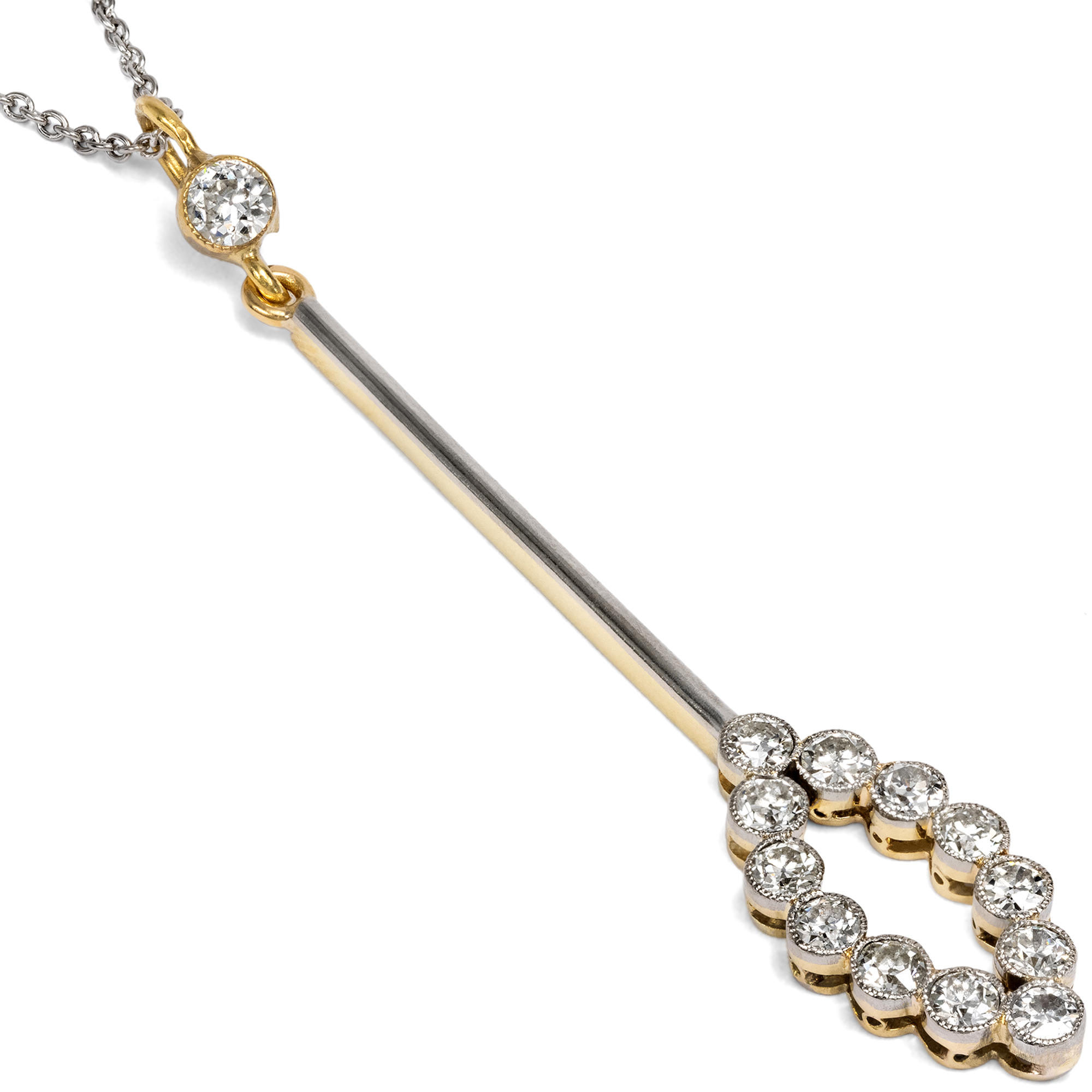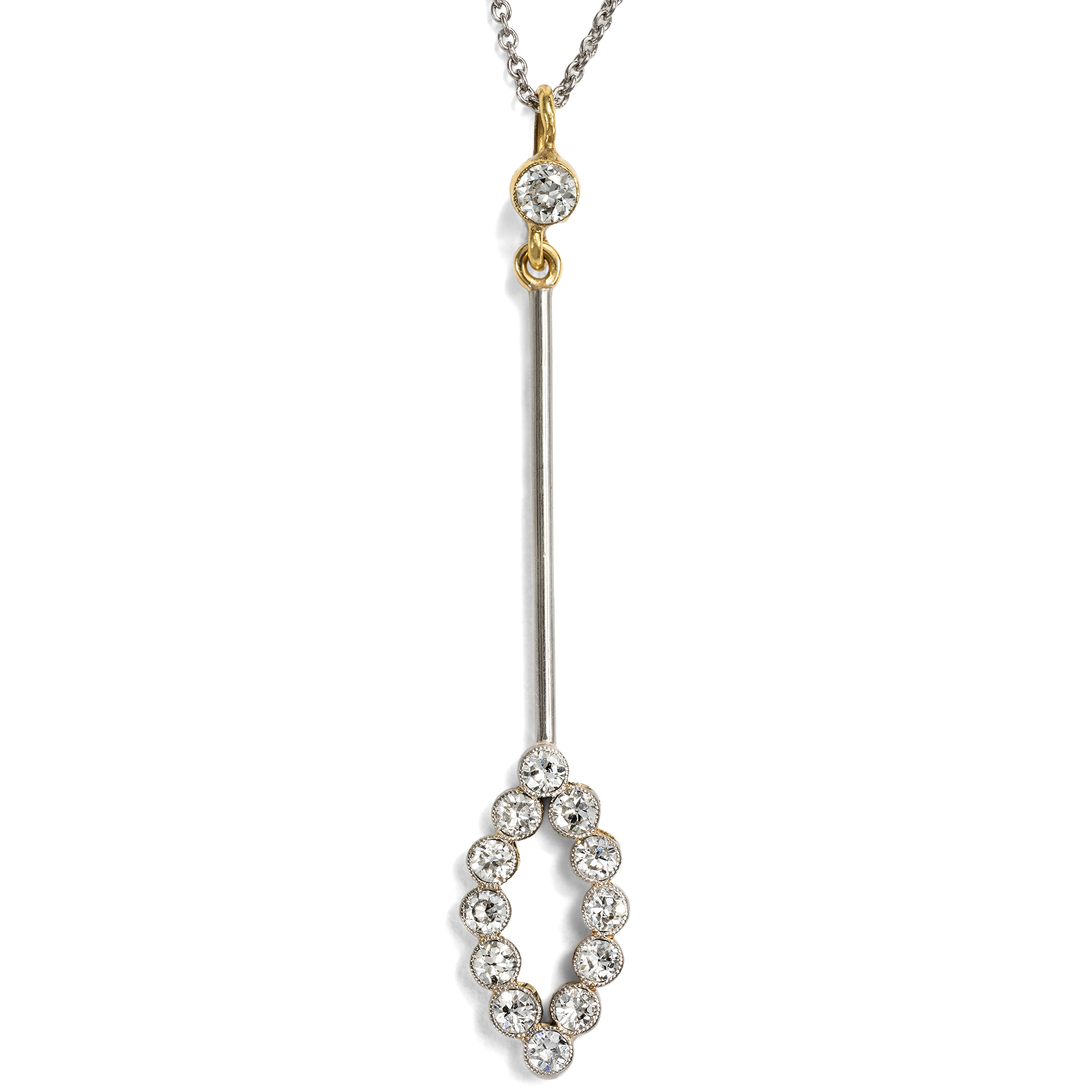 Zart, schlank und elegant sollten die Juwelen des frühen 20. Jahrhunderts sein. Der vorliegende Anhänger entspricht diesem Stil und zeigt sich als langes Pendel, besetzt mit funkelnden Diamanten. Der Entwurf ist zweigeteilt. An einer zarten Kette ist zunächst ein einzelner Diamant in einer Zargenfassung aus Gold und Platin montiert. Daran schließt sich, beweglich angefügt, ein glänzender Stab an, der unten schließlich eine Ellipse aus Diamanten im runden Altschliff trägt. Der Verzicht auf jedes historische Ornament zeigt die Modernität des Entwurfs. Leitfaden war die Geometrie und die Lust daran, kostbare Geschenke der Natur so zu präsentieren, dass sie ihre eigene Schönheit bestmöglich präsentieren können. Kunstfertig gestaltet ist der Anhänger gleichwohl: Die Materialien ergeben ein bezauberndes, festliches Funkeln. Wir haben den Anhänger in London entdeckt und glauben, dass es sich dabei im Ursprung um eine Stabbrosche gehandelt hat, die im Verlauf des 20. Jahrhunderts zum Anhänger umgebaut wurde. Entwurf und Verarbeitung lassen uns das Schmuckstück in die Jahre um 1915 datieren.