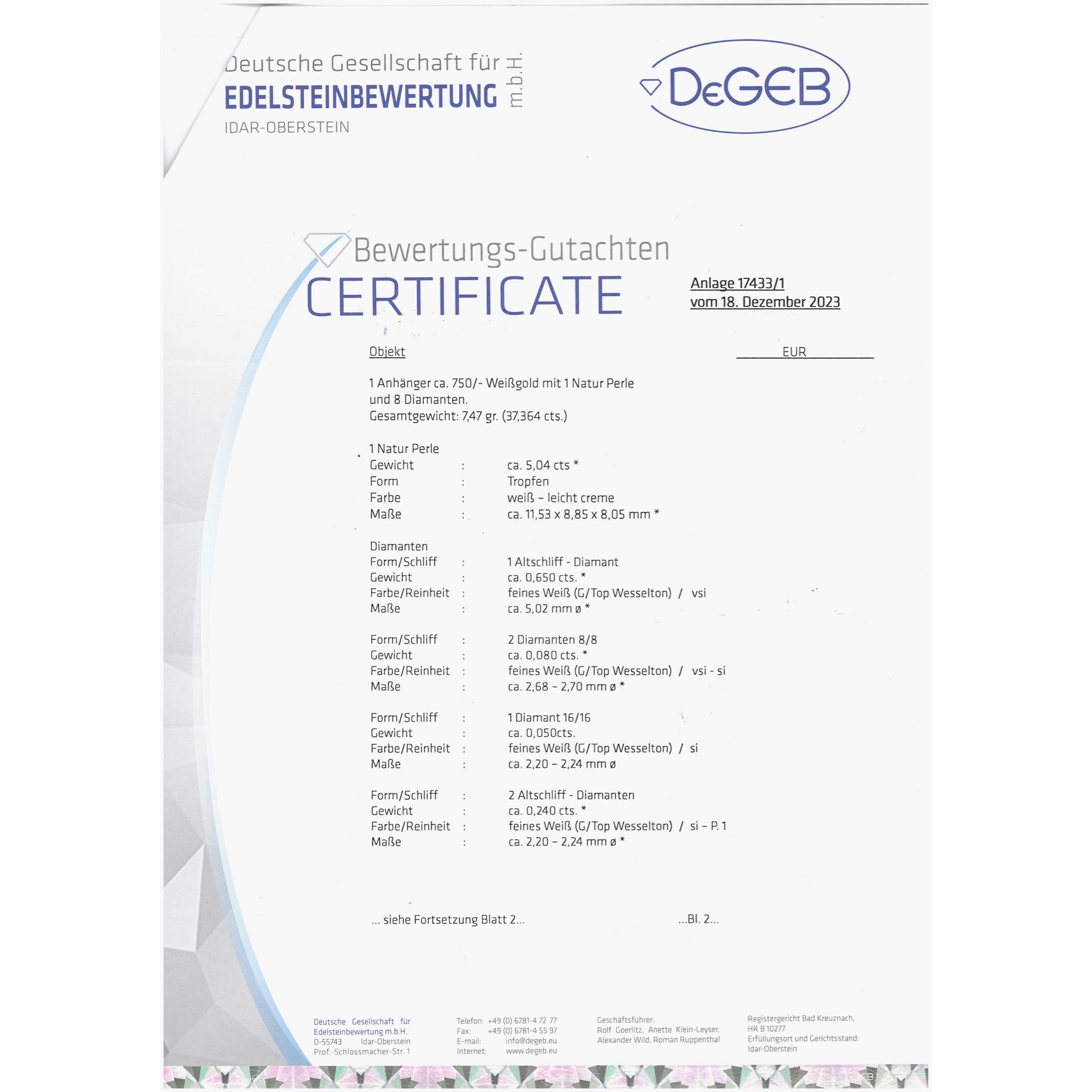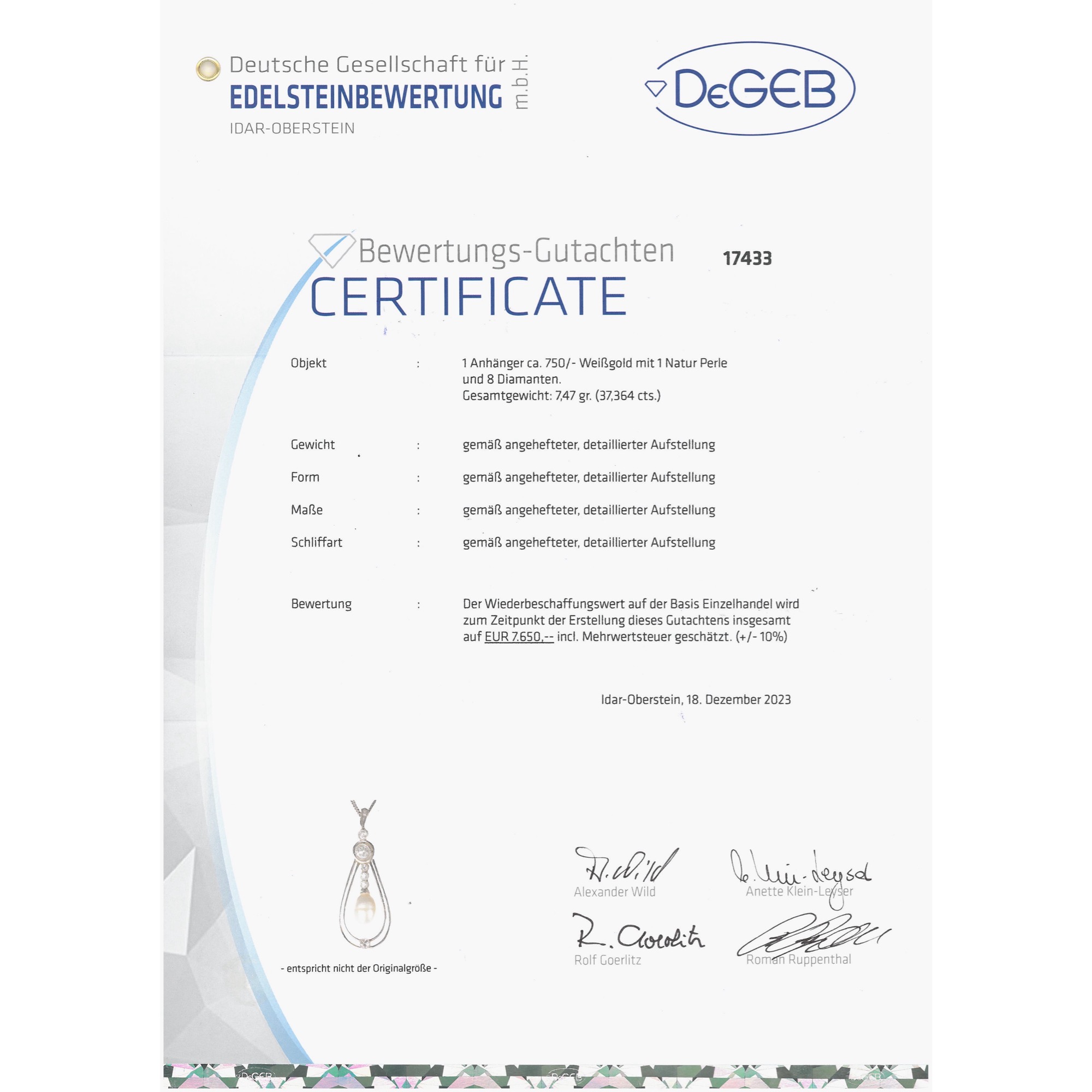 Wie reich beschenkt uns die Natur – und welche Chancen bietet sie, ihre Geschenke zu etwas Eigenem, zu einem Kunstwerk werden zu lassen! Dieser schon aus der Antike überlieferte Topos über das Verhältnis von Natur und Kunst mag auch dem anonymen Goldschmied durch den Kopf gegangen sein, der zu Beginn der 1920er Jahre den hier vorliegenden, großen Anhänger schuf. Der Entwurf nimmt seinen Auftakt mit einer Reihe funkelnder Diamanten. Insgesamt sind hier mehr als ein Karat weißer Diamanten in alten Schliffen eingesetzt. Sie besetzen die Schlaufe und setzen sich darunter in einer senkrechten Reihe fort. Die größeren Steine sind einzeln in Zargen gefasst. Der größte Stein, er wiegt rund 0,65 ct, wird zudem von einer Schattenfuge und einem umlaufenden polierten Rahmen weiter akzentuiert. Unterhalb des größten Diamanten weitet sich der Entwurf in einem doppelten Rahmen. Er umfängt dabei ein bewegliches Pendel, das eine große, grauweiß schimmernde Perle hält. Es ist eine echte Naturperle. Die Goldschmiedearbeit besteht aus hochkarätigem Weißgold. Damit sind drei ganz unterschiedliche Materialien eingesetzt, deren Gemeinsamkeit ihre Nicht-Farbe Weiß ist: Diamanten, die Perle und das Weißgold. Sie sind sich ähnlich und doch verschieden, die einen mit hartem Glanz, die anderen mit feurigem Funkeln, die Perle schließlich mit ihrem samtigen Lüster. So entsteht eine variantenreiche Wintermelodie – in Schmuckform. Der Anhänger ist ausweislich seiner Verarbeitung und Gestaltung in den 1920er Jahren entstanden. Wir haben ihn in Hamburg entdeckt. Er wird begleitet von einem unabhängigen Gutachten zur Qualität der Materialien.
