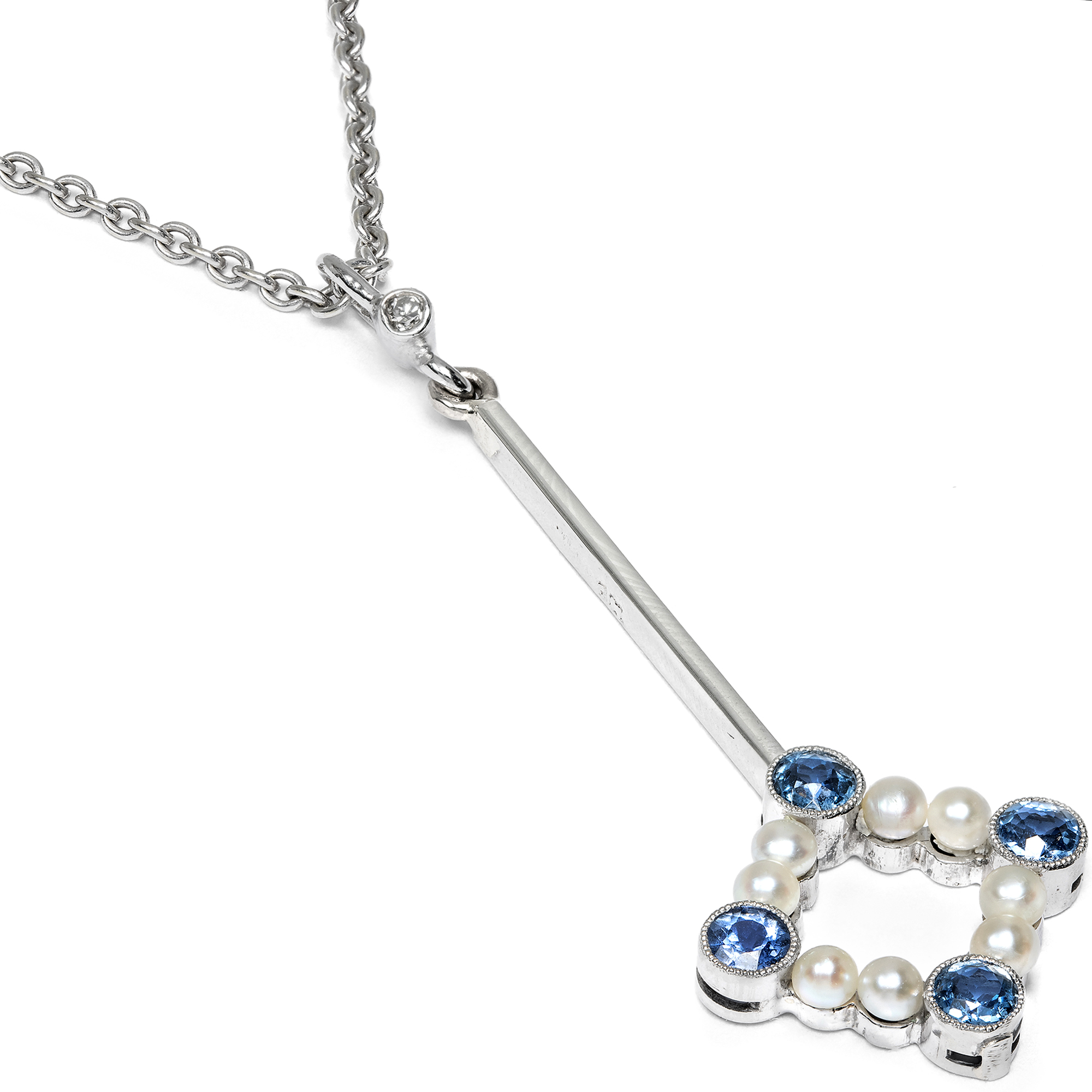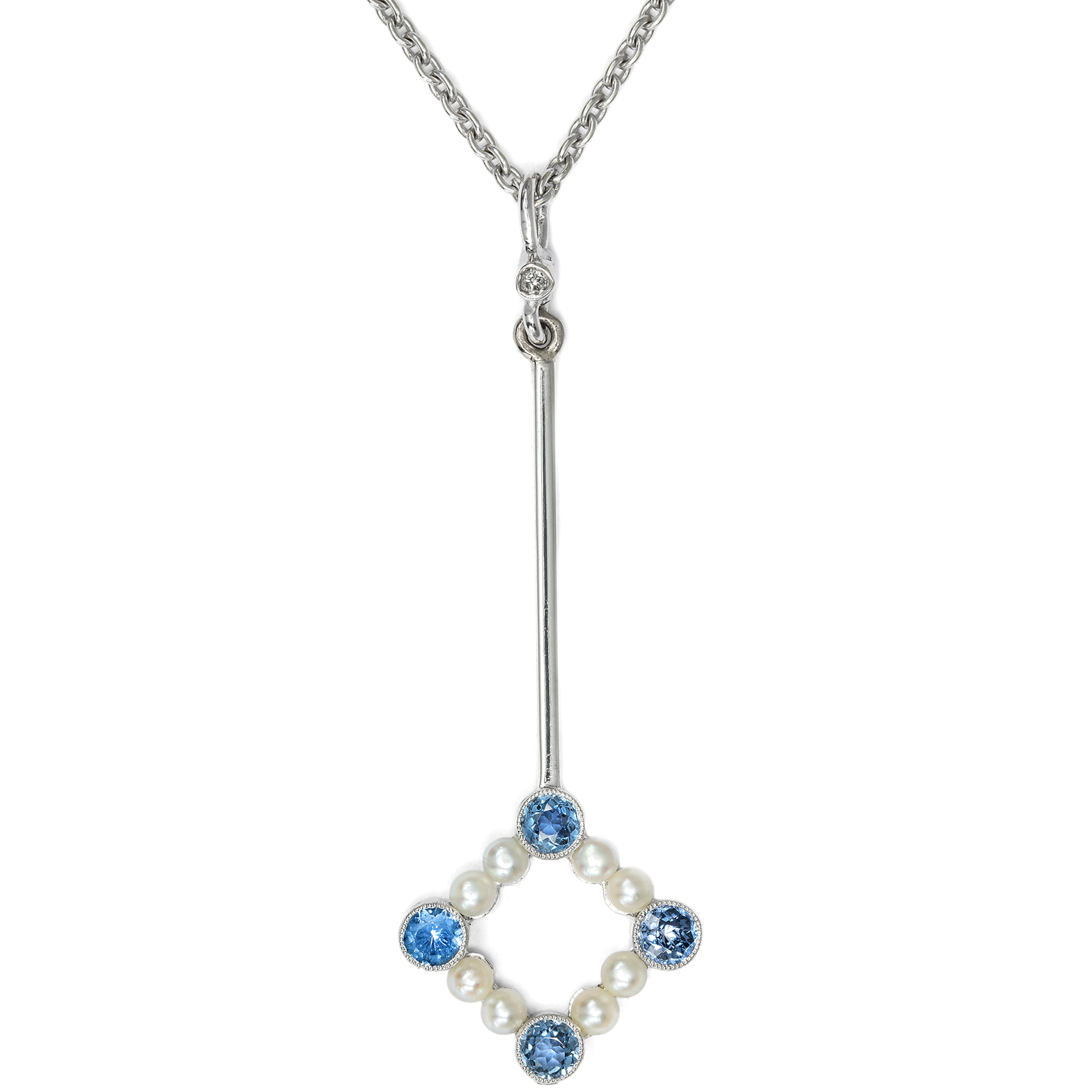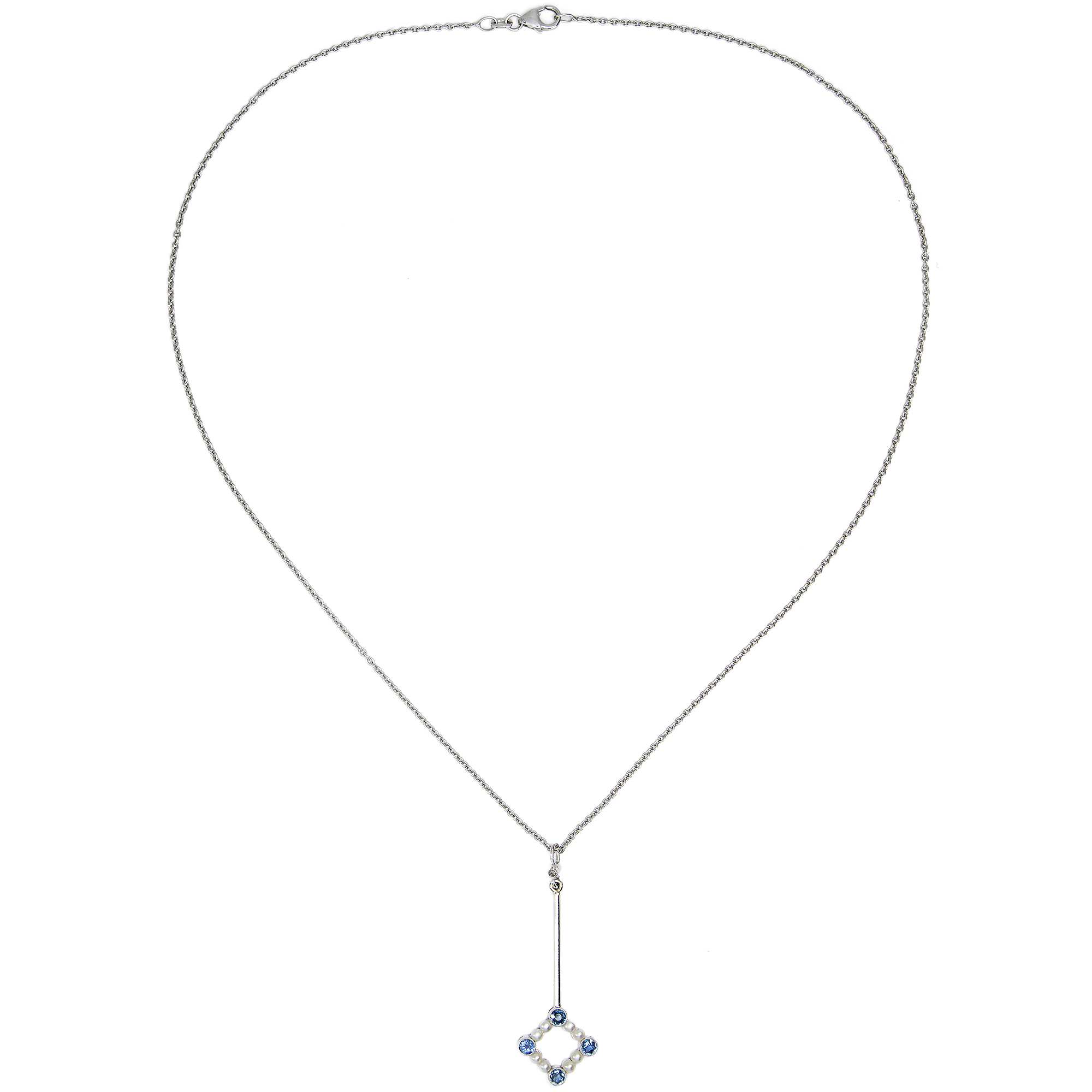 Zart, schlank und elegant sollten die Juwelen des frühen 20. Jahrhunderts sein. Der vorliegende Anhänger entspricht diesem Stil und zeigt sich als langes Pendel, besetzt mit Perlen und Saphiren. Der Entwurf ist zweigeteilt. Oben eine zarter Anhängeröse, die mit einem kleinen Diamanten besetzt ist. Daran schließt, beweglich angefügt, ein glänzender Stab an, der unten schließlich eine Raute aus Saphiren und Perlen trägt. Die himmelblauen Saphire leuchten hell und markieren die Ecken des Vierecks. Die Perlen besetzen den Raum dazwischen, jeweils zwei von ihnen verbinden die Saphire. Der Verzicht auf jedes historische Ornament zeigt die Modernität des Entwurfes. Leitfaden war die Geometrie und die Lust daran, kostbare Geschenke der Natur so zu präsentieren, dass sie ihre eigene Schönheit bestmöglich präsentieren können. Kunstfertig gestaltet ist der Anhänger gleichwohl: Die Materialien ergeben einen bezaubernden, winterlichen Farbklang, und die runden Formen der Edelsteine stehen in einem schönen Kontrast zur Geometrie der menschengemachten Formen. Entstanden ist das Schmuckstück ursprünglich wohl als eine Brosche, eine längliche Stabnadel mit zwei schlanken Stäben auf beiden Seiten des edelsteinbesetzten Quadrats. An ihrem unteren Ende kann man mit der Lupe erkennen, dass hier etwas abgesägt wurde. Bei der Veränderung zum Anhänger wurde dann auch die obere Schlaufe mit dem Diamanten ergänzt. Entwurf und Verarbeitung entsprechen den ersten Jahrzehnten nach 1900; die Verarbeitung in Weißgold weist dabei darauf hin, dass der Anhänger erst nach dem ersten Weltkrieg entstanden ist, da zuvor Weißgold noch keine weitere Verbreitung hatte. Wir datieren ihn daher in die Jahre um 1920. Der Umbau zum Anhänger erfolgte nur wenig später. Wir haben den Anhänger in London entdeckt. Die Feingehaltspunze auf der Seite verrät, dass er in Großbritannien entstanden ist. Die Kette haben wir zu dem Anhänger ergänzt: Sie ist für uns in Deutschland aus Weißgold neu angefertigt worden und passt in ihrer Finesse ganz wunderbar zu dem Anhänger.