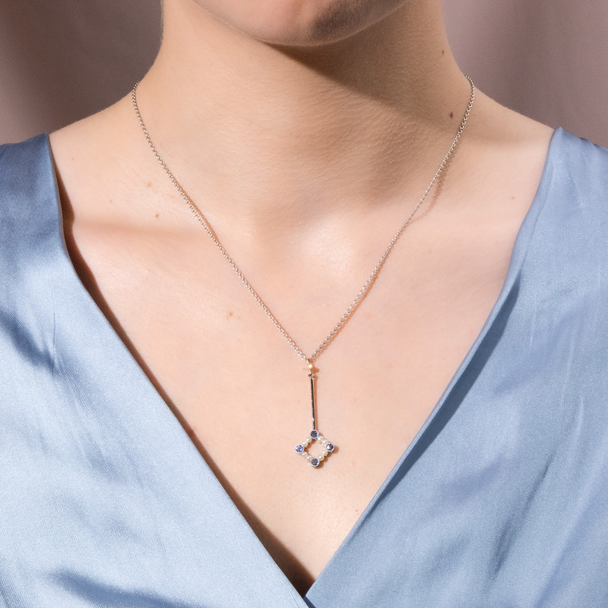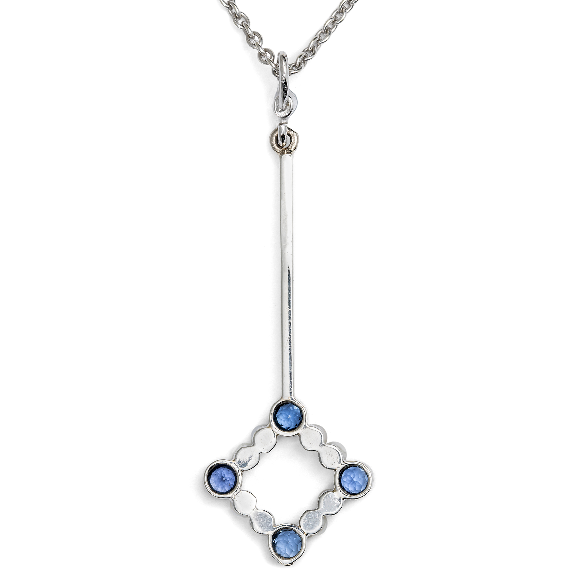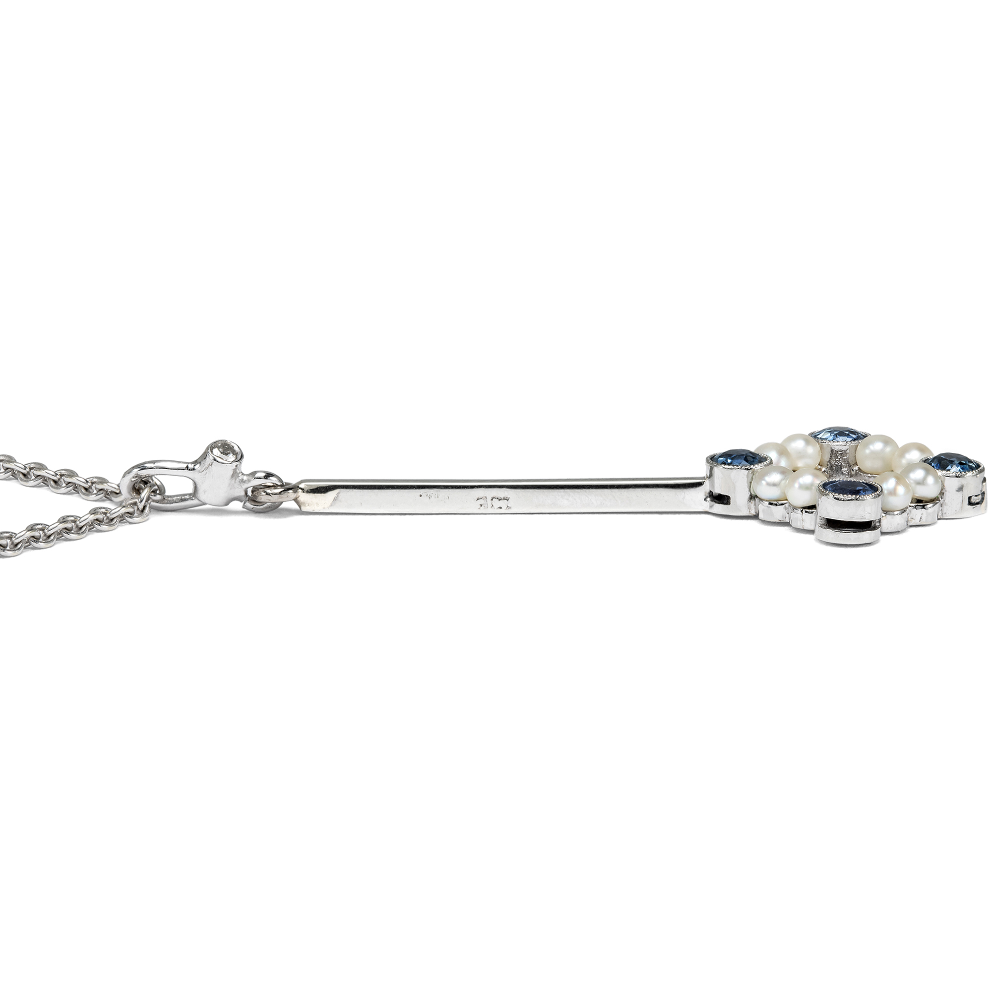Zart, schlank und elegant sollten die Juwelen des frühen 20. Jahrhunderts sein. Der vorliegende Anhänger entspricht diesem Stil und zeigt sich als langes Pendel, besetzt mit Perlen und Saphiren. Der Entwurf ist zweigeteilt. Oben eine zarter Anhängeröse, die mit einem kleinen Diamanten besetzt ist. Daran schließt, beweglich angefügt, ein glänzender Stab an, der unten schließlich eine Raute aus Saphiren und Perlen trägt. Die himmelblauen Saphire leuchten hell und markieren die Ecken des Vierecks. Die Perlen besetzen den Raum dazwischen, jeweils zwei von ihnen verbinden die Saphire. Der Verzicht auf jedes historische Ornament zeigt die Modernität des Entwurfes. Leitfaden war die Geometrie und die Lust daran, kostbare Geschenke der Natur so zu präsentieren, dass sie ihre eigene Schönheit bestmöglich präsentieren können. Kunstfertig gestaltet ist der Anhänger gleichwohl: Die Materialien ergeben einen bezaubernden, winterlichen Farbklang, und die runden Formen der Edelsteine stehen in einem schönen Kontrast zur Geometrie der menschengemachten Formen. Entstanden ist das Schmuckstück ursprünglich wohl als eine Brosche, eine längliche Stabnadel mit zwei schlanken Stäben auf beiden Seiten des edelsteinbesetzten Quadrats. An ihrem unteren Ende kann man mit der Lupe erkennen, dass hier etwas abgesägt wurde. Bei der Veränderung zum Anhänger wurde dann auch die obere Schlaufe mit dem Diamanten ergänzt. Entwurf und Verarbeitung entsprechen den ersten Jahrzehnten nach 1900; die Verarbeitung in Weißgold weist dabei darauf hin, dass der Anhänger erst nach dem ersten Weltkrieg entstanden ist, da zuvor Weißgold noch keine weitere Verbreitung hatte. Wir datieren ihn daher in die Jahre um 1920. Der Umbau zum Anhänger erfolgte nur wenig später. Wir haben den Anhänger in London entdeckt. Die Feingehaltspunze auf der Seite verrät, dass er in Großbritannien entstanden ist. Die Kette haben wir zu dem Anhänger ergänzt: Sie ist für uns in Deutschland aus Weißgold neu angefertigt worden und passt in ihrer Finesse ganz wunderbar zu dem Anhänger.