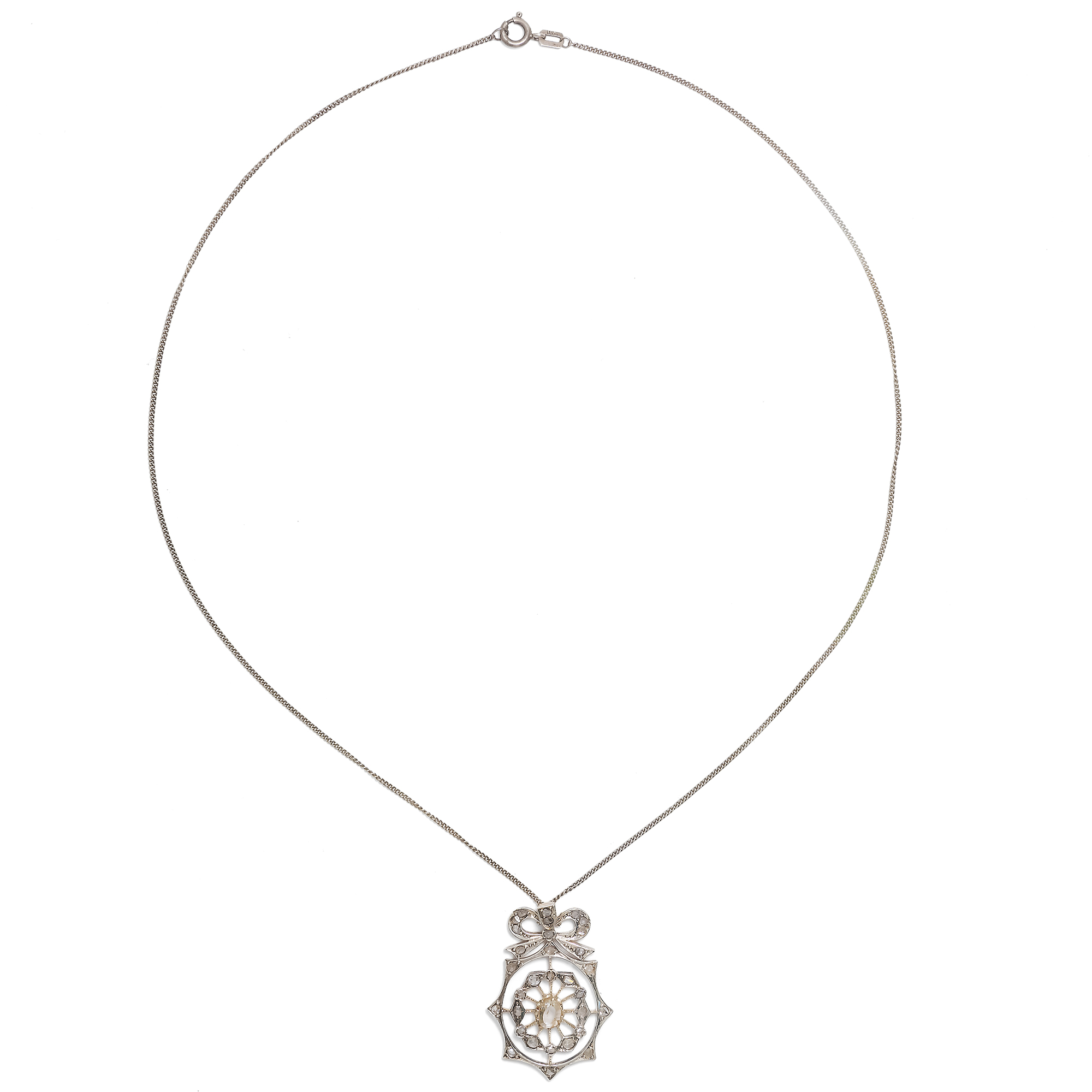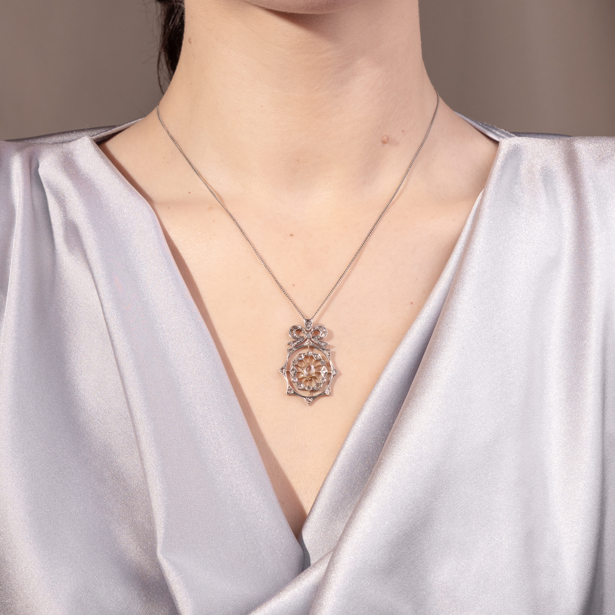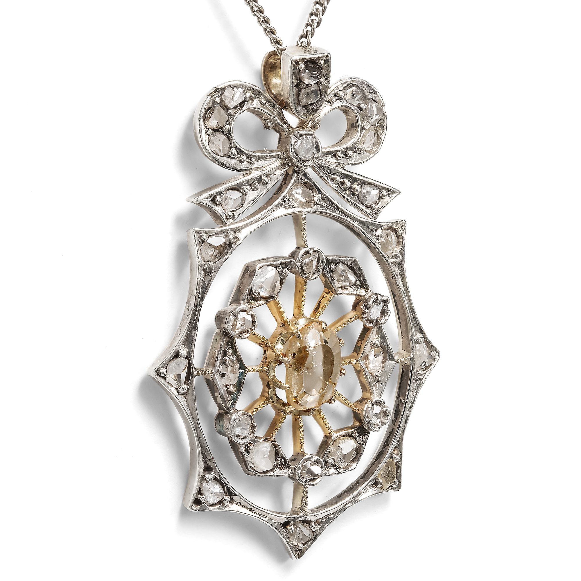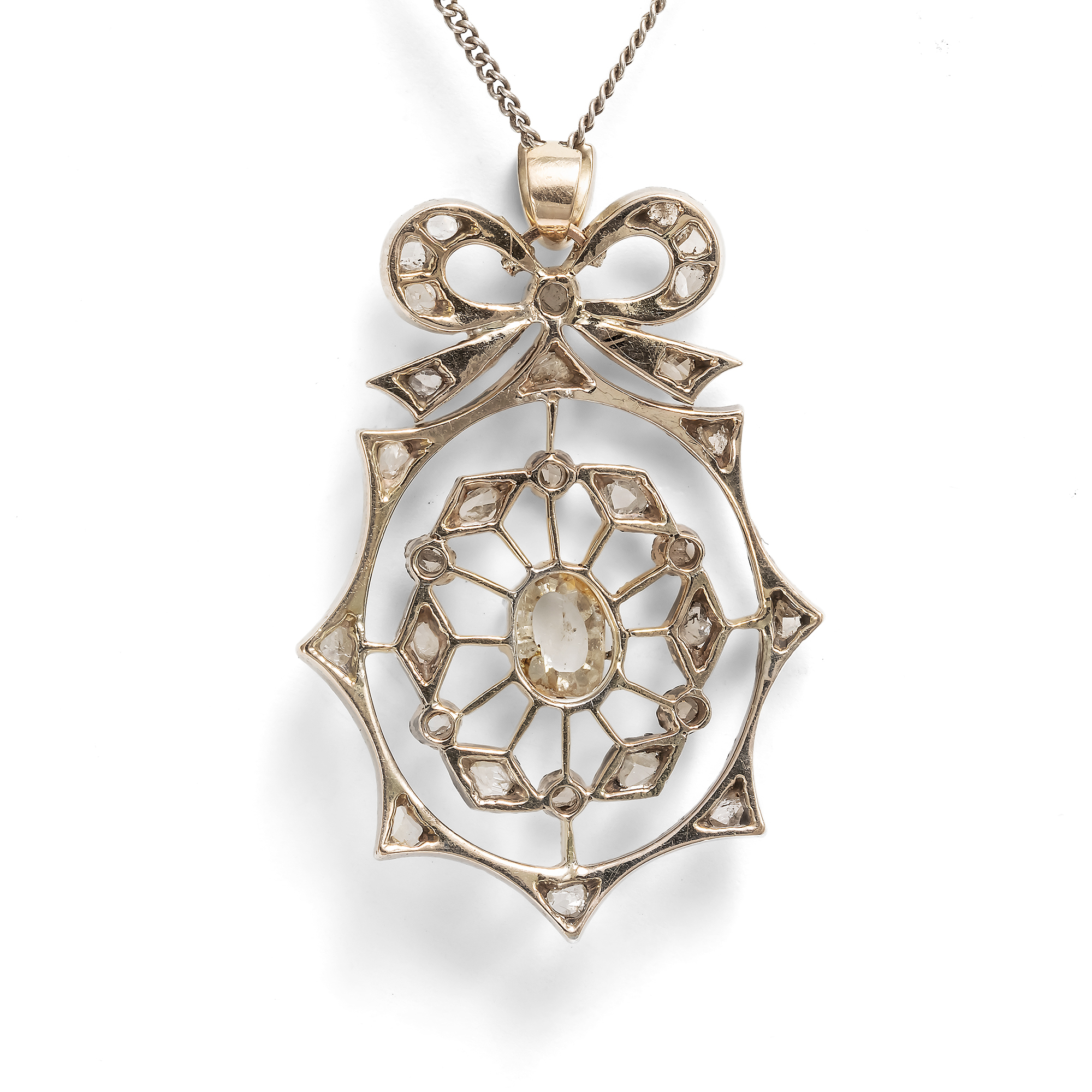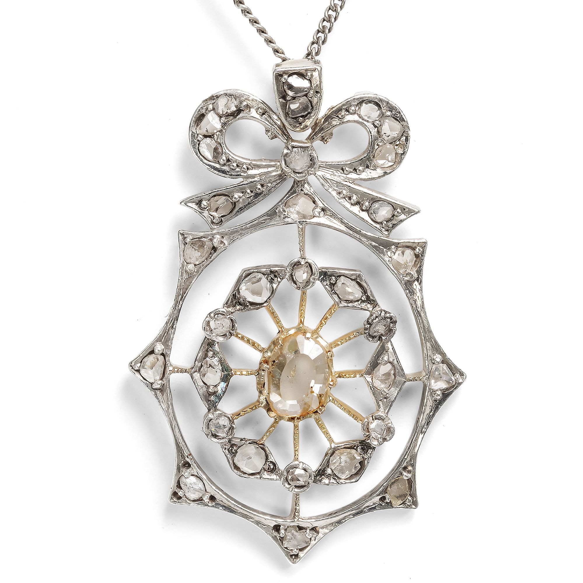 In den Jahren um 1900 waren die geschwungenen, naturbetonten Formen des Jugendstils vor allem mit Künstlernaturen assoziiert, mit der Bohème jener Zeit – kurzum, wer auffallende Jugendstil-Kreationen trug, mochte es eher gewagt. Insbesondere in Adelskreisen und in der wohlhabenden Bourgeoisie jener Zeit entwickelte sich die Mode stattdessen hin zu klassischeren, zeitloseren Formen. Man orientierte sich hierbei an dem galanten Formenschatz, welcher schon mehr als ein Jahrhundert zuvor die Regierungszeit des französischen Königs Louis XVI. bestimmt hatte: Lorbeerkränze, Girlanden und auch Schleifenmotive zierten hochwertigen Diamantschmuck – den sog. Juwelenschmuck – für den Abend. Der hier vorliegende Anhänger ist eine solche Reminiszenz an die Zeit der Marie Antoinette, im Stil der Belle Époque neu interpretiert. Sein Schaustück besteht aus einem Schleifenornament, das über und über mit Diamanten im Rosenschliff besetzt ist und in einen mit einem ausgestellten Rahmen versehenen Kranz übergeht. Mittig im Anhänger sitzt ein Diamant in einem ungewöhnlichen Tafelschliff. Der warm getönte Stein von etwa 0,45 ct Gewicht ist oval, flach und an den Seiten angeschrägt facettiert. Diamanten wie dieser waren in früheren Zeiten oft in Ringen als Abdeckung einer Miniatur eingesetzt, durchsichtig, doch haltbar. Sehr wahrscheinlich ist er hier in Zweitverwendung eingesetzt und wurde bereits im 17. oder 18. Jahrhundert geschliffen: Eben zur Zeit der Marie Antoinette, sodass sich Form und Material hier perfekt ergänzen. Wir denken, dass der Anhänger in den ersten Jahren kurz nach 1900 entstanden ist. Eine einfache Kette komplettiert den Anhänger, und so kann sich das Schmuckstück weich dem Dekolleté anschmiegen und wirkt bei aller Festlichkeit nicht starr.