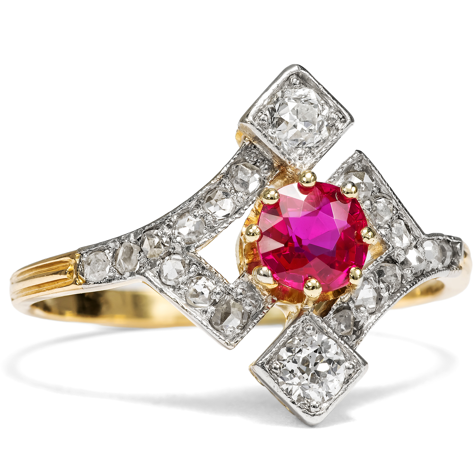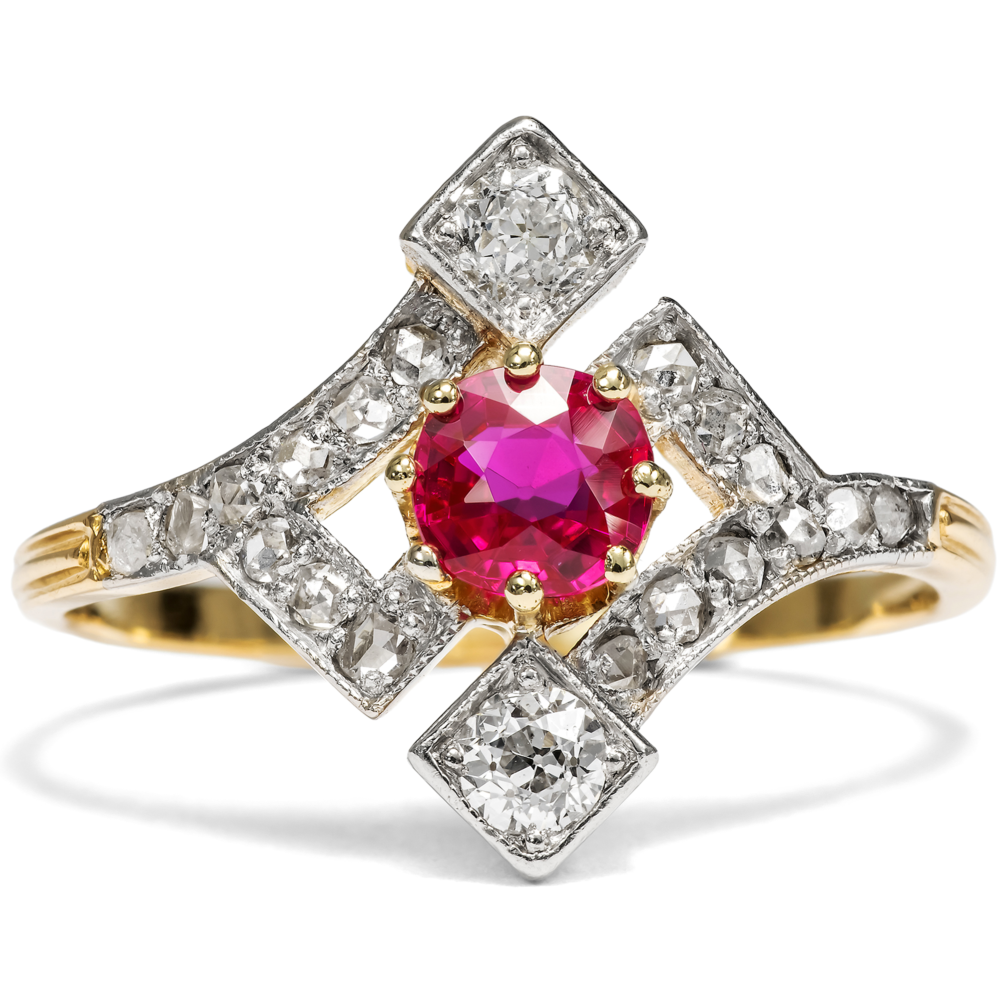 Als der Jugendstil in den Abendjahren des 19. Jahrhunderts versuchte, die ewig wiederholten Formen des Historismus zu überwinden und eine neue, der eigenen Zeit zugehörige Formensprache zu finden, stieß er nicht nur auf Begeisterung, sondern auch auf lauten Widerspruch. Vernichtend äußerte sich Hermann Muthesius noch 1904: „Der Jugendstil ist eine Kunst, die nicht von Künstlern, sondern von den Musterzeichnern der Fabrikanten aus der Taufe gehoben wurde, von Jenen, die aus der Froschperspektive auf das Gebaren der Großen hinaufschauten und sich merkten, wie diese sich räusperten und spuckten.“ Es war ein Stil der künstlerischen Avantgarde, getragen von der Bohème – verpönt hingegen unter Konservativen. Dies lässt sich auch am Schmuck ablesen: Die frühen Schmuckstücke des Jugendstil sind beinahe ausnahmslos in Gold gearbeitet, als Tagesschmuck und nicht als kostbare, diamantbesetzte Weißjuwelen für den Abend, die ihrer Natur nach eher formellen Charakter haben. Doch bald schon wendete sich das Blatt. Ab der zweiten Hälfte des neuen Jahrzehnts finden wir in Fachzeitschriften wie dem Journal der Goldschmiedekunst oder der Deutschen Goldschmiedezeitung zunehmend wunderbare Juwelen im Jugendstil, leuchtend weiß und mit kostbarem Besatz: Die Formen des neuen Stils waren salonfähig geworden. Nun schien es den Zeitgenossen, dass sich auch die Investition in kostbare Weißjuwelen in diesem Stil lohnen würde. Der vorliegende Ring ist ein Zeugnis dieser Entwicklung. Sein Ringkopf setzt sich ganz aus geometrischen Formen zusammen, wie sie nach 1905 modern wurden um den floralen Jugendstil abzulösen. Eine Schicht weißen Platins liegt dem Ringkopf auf, um den Diamantbesatz heller leuchten zu lassen. Zwei Diamanten im Altschliff sowie eine Vielzahl glitzernder Diamantrosen tauchen ihn in weißes Licht. In der Mitte dieses zarten Gebildes funkelt ein leuchtend pink-roter Rubin von 0,45 ct Gewicht. Der Stein ist unbehandelt, natürlich und stammt aus Burma – alles also, was man sich von einem Rubin wünscht. Entdeckt haben wir den Ring in München. Er ist sehr gut erhalten.