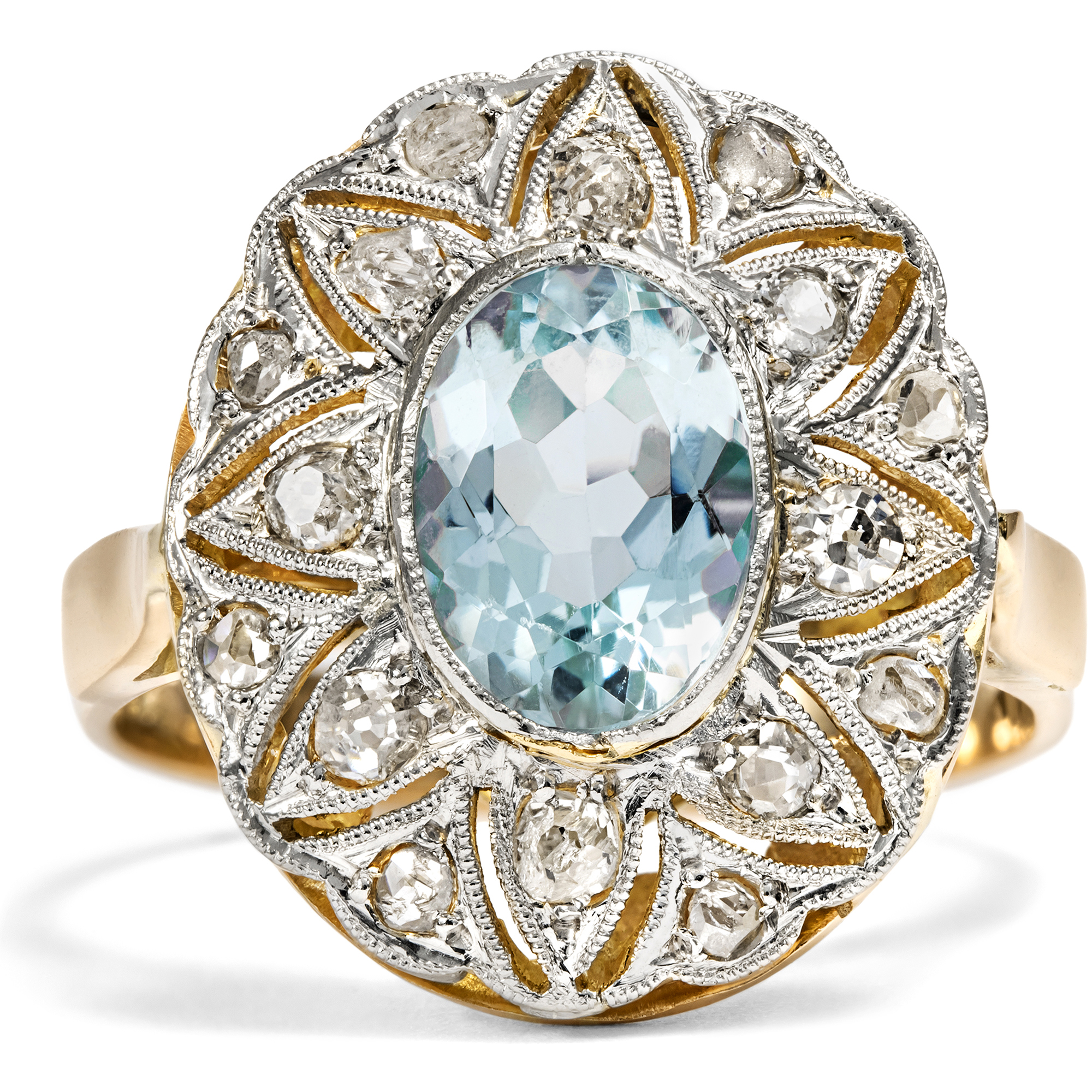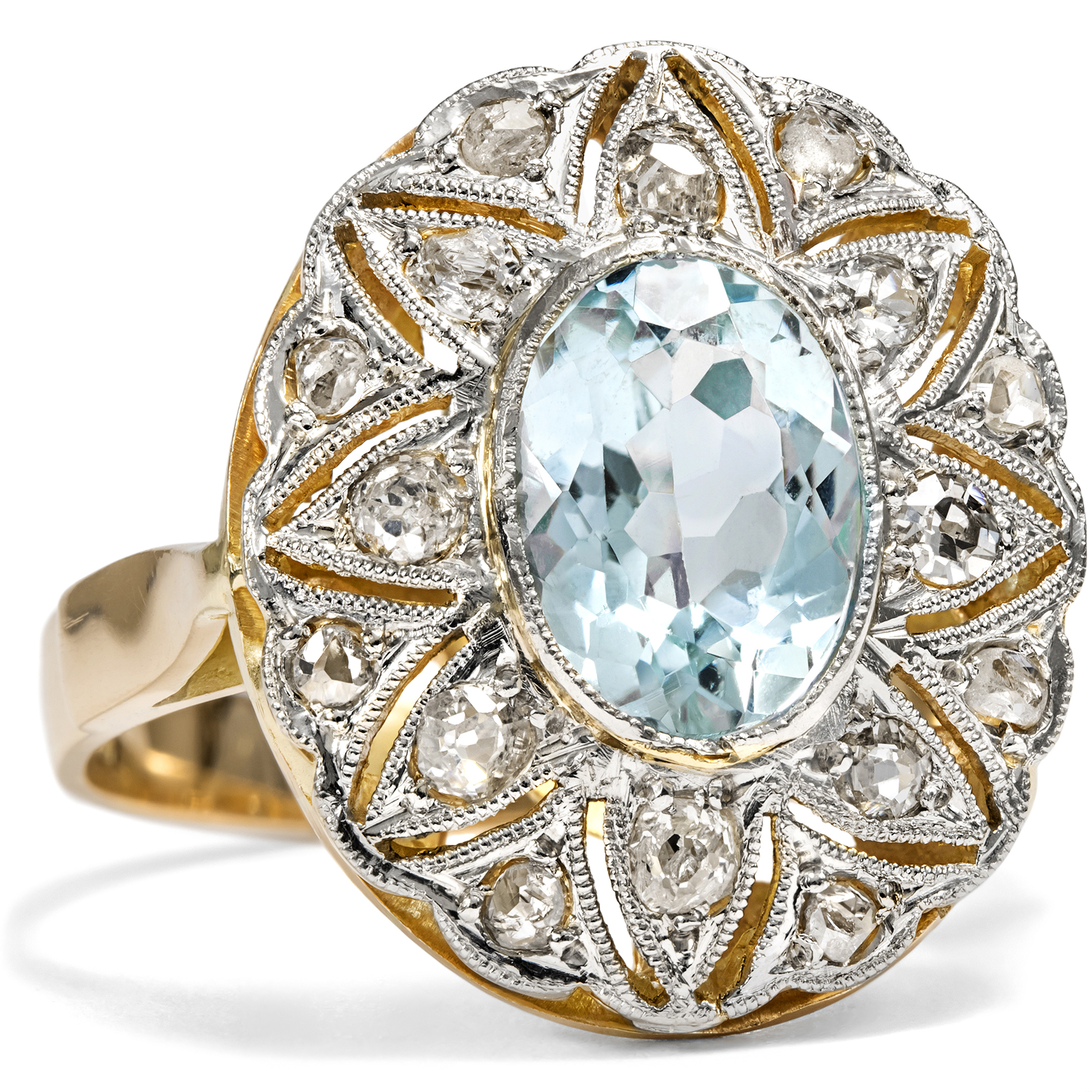 Die Bezeichnung „Cocktailring“ kam vermutlich erst in den späten 1930er Jahren auf. Zuvor sprach man bei großen, rein schmückenden Ringen meist von einem „Dress Ring“ oder „Dinner Ring“. Ersterer zeichnete sich meist durch einen großen Farbstein aus, der das namensgebende Kleid ergänzen sollte. Zu diesem Thema konnte man 1929 im Harper’s Bazaar lesen: „Man sieht nicht mehr länger, dass an jedem Finger zwei oder drei Ringe getragen werden. Die elegante Gesellschaft trägt einen Diamantreifen als Ehering und einen großen Solitärring, zumeist einen Diamant, als Verlobungsring, und dann vielleicht noch einen weiteren Dress Ring, um die Wirkung des Kleides zu unterstützen.“ Zu welchem eleganten Kleid mag einst eine Dame der Gesellschaft den hier vorliegenden Ring getragen haben? Er fasst in seinem Zentrum einen wasserblauen Aquamarin im ovalen Facettenschliff. Ein Kranz aus Diamanten und blütenartig gesägte Ornamente lassen den natürlichen Edelstein wie in Spitze gebettet wirken. Während der Ringkopf durch eine Schicht aus Platin hell glänzt, belässt die Schiene aus Roségold dem Ring eine gewisse Wärme. Der elegante Ring aus den 1930er Jahren hat sich sehr gut erhalten. Er eignet sich auch als Verlobungsring.