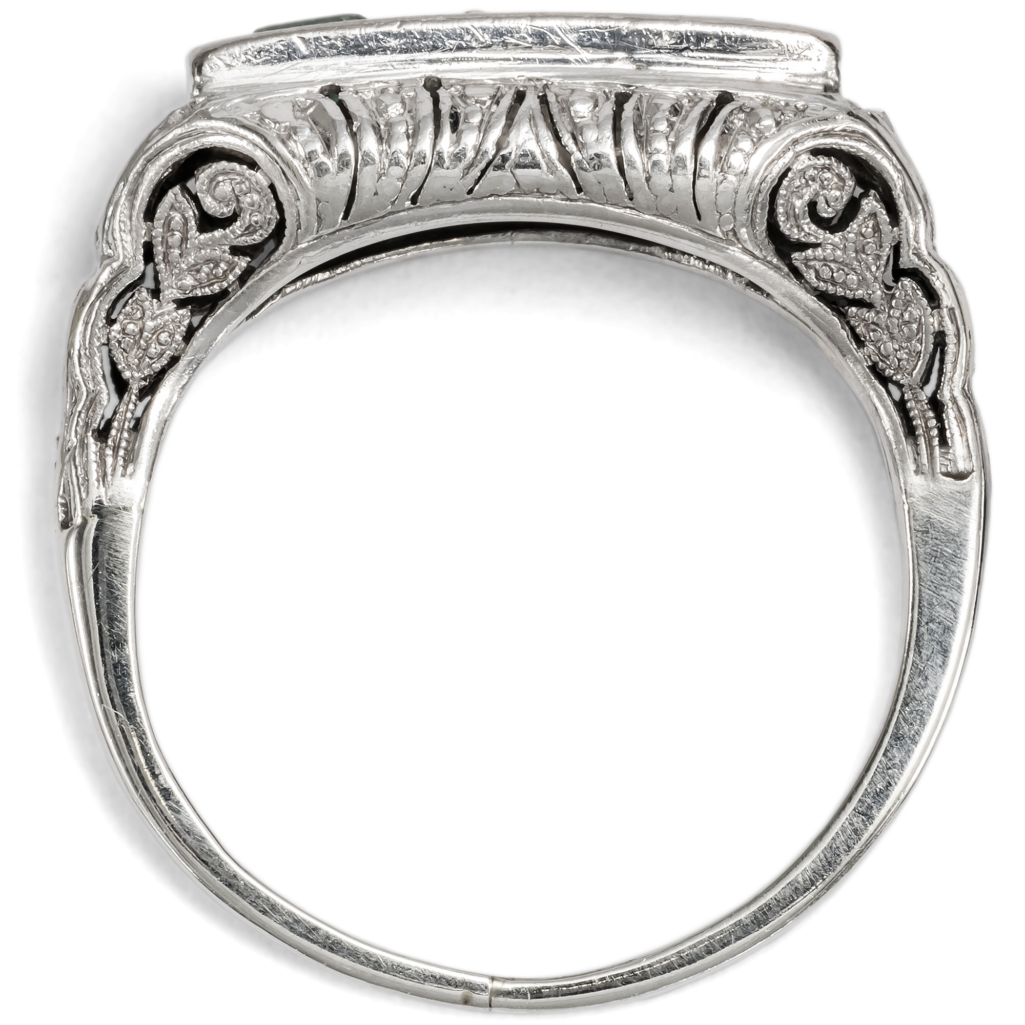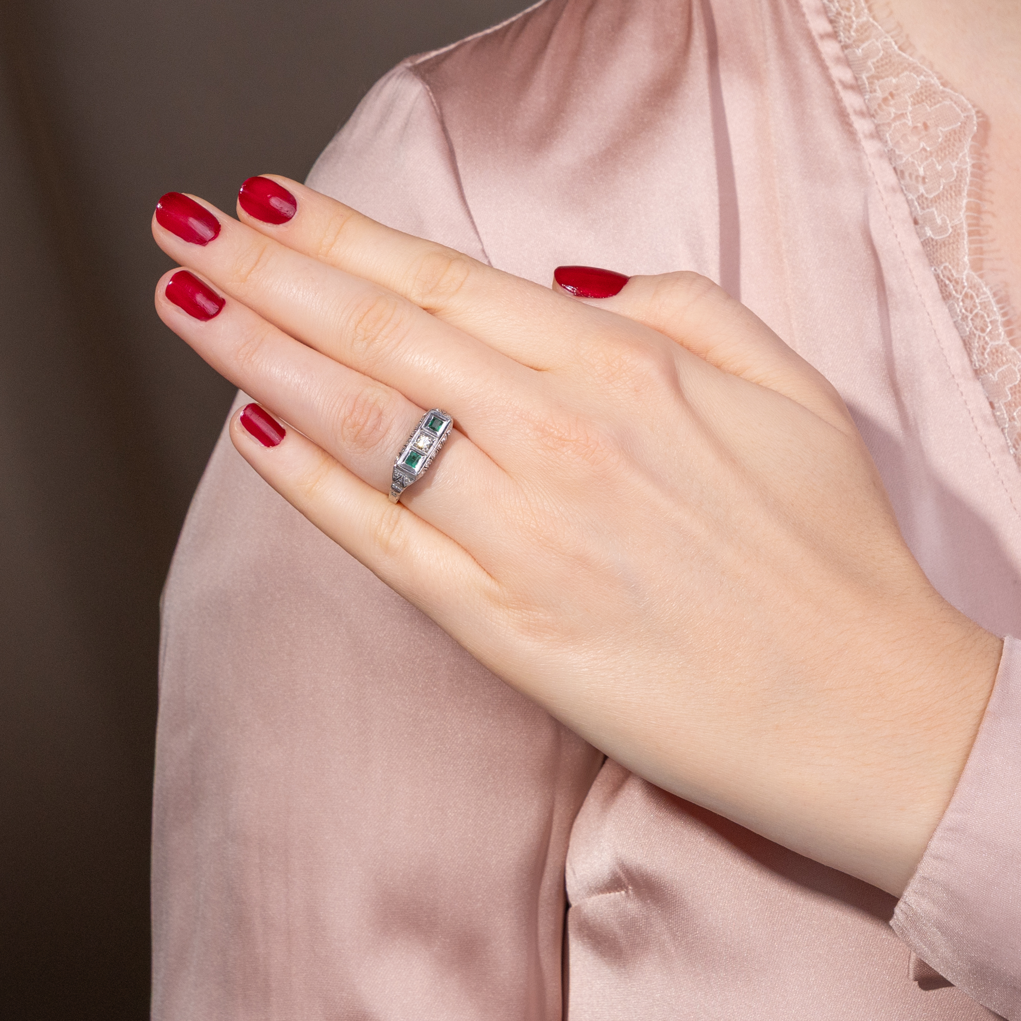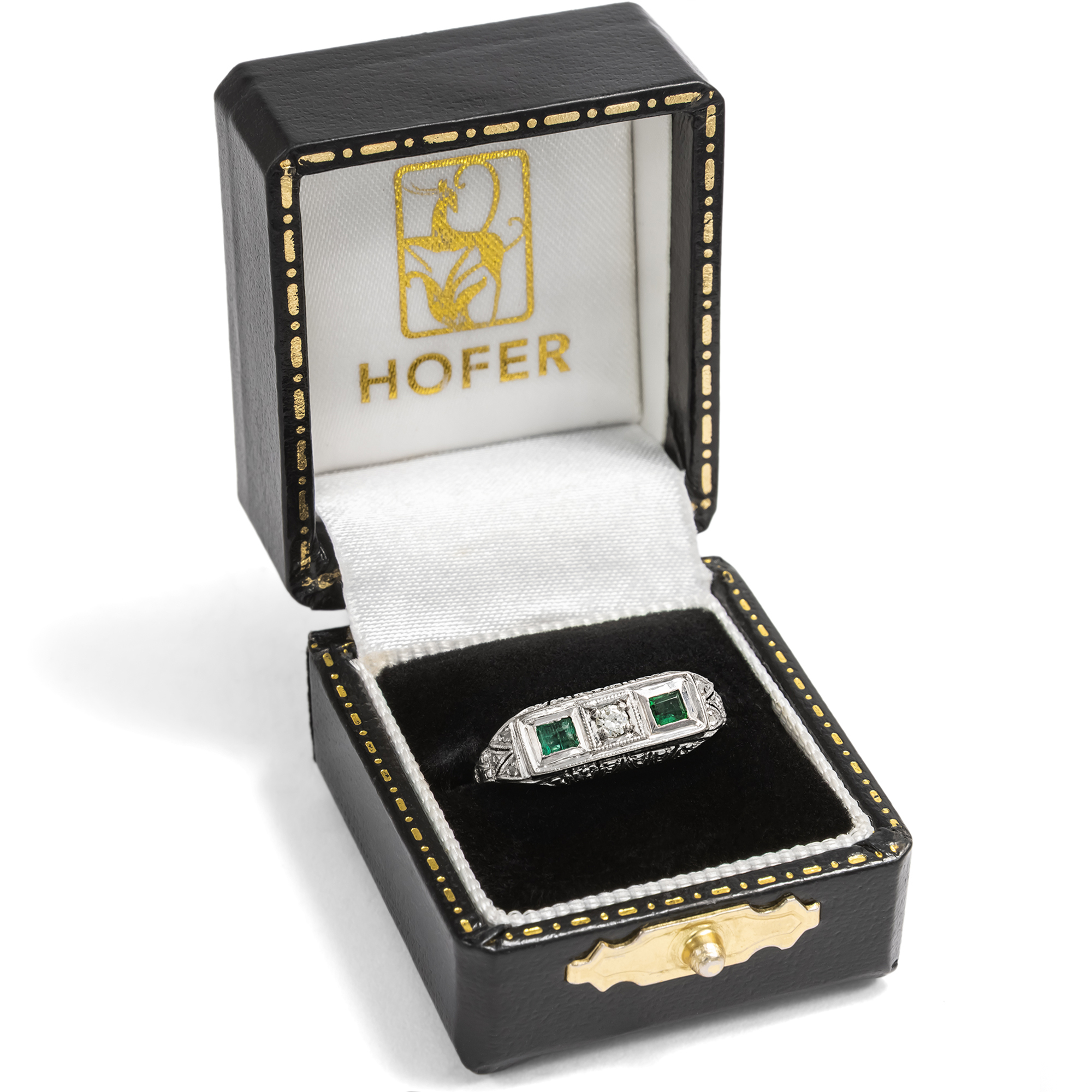 Hell glänzt der Mond am wolkenlosen Himmel über dem Garten der Fitzgeralds. Das Grammophon spielt die neuesten Hits vom Broadway, und elegante junge Frauen in langen, schmalen Kleidern und Männer im schwarzen Smoking stehen beisammen, tanzen, lachen und nippen an ihren Cocktails. Soeben reichen Ober kleine Portionen Lobster Thermidor als Imbiss, schenken gut gekühlten Champagner nach, und die zahllosen Sterne über dem Umland von New York funkeln um die Wette. Ihr Licht spiegelt sich im Teich – neben den elektrischen Laternen und Lampions der Festdekoration. Die Stunde nach Mitternacht ist ausgelassen und sorgenfrei, man schwelgt im Überfluss. Noch eben im Theater in der Stadt, hat die Festgesellschaft nun der Fahrt in schnellen Automobilen zur Gartenparty gefolgt – alles ist in Bewegung, getrieben von der Modernität der Zeit. Dann, endlich, tritt die Hausherrin auf. Zur Feier des Tages in weißer Robe, angetan mit wenig, doch exquisitem Schmuck: ein traumhaftes Collier und ein strahlender Ring – ein Feuer aus grünem Licht und Helligkeit, modern wie die Zeit und von erlesenem Geschmack, wie alles um sie herum. Die Festgesellschaft hält inne, schaut, und ein leises Gemurmel schwillt an zu Applaus und dem gemeinsamen Ruf: „Hurra! Willkommen!“ All diese Emotionen der zunächst reichen und sorglosen Jahre um 1930 scheinen in dem hier vorliegenden eleganten Ring versammelt. Das Schmuckstück ist aus 14-karätigem Weißgold gefertigt. Seinen quer gelagerten Ringkopf schmücken zwei blassgrüne Smaragde, zwischen denen ein Altschliffdiamant gefasst ist. Die Seiten des ansteigenden Ringkopfes sind mit feinen floralen Gravuren und Sägearbeiten verziert. Seiner Formensprache und Verarbeitung nach wurde der Ring mit hoher Wahrscheinlichkeit in den Vereinigten Staaten gefertigt. Zu uns gelangte das elegante Schmuckstück aus Bielefeld.
