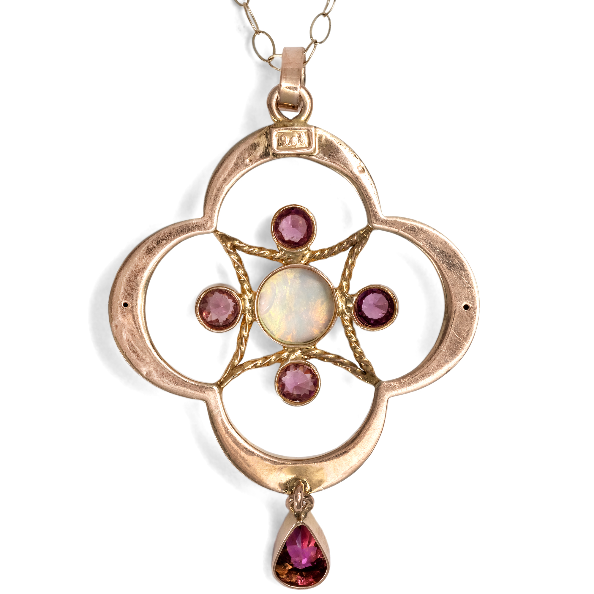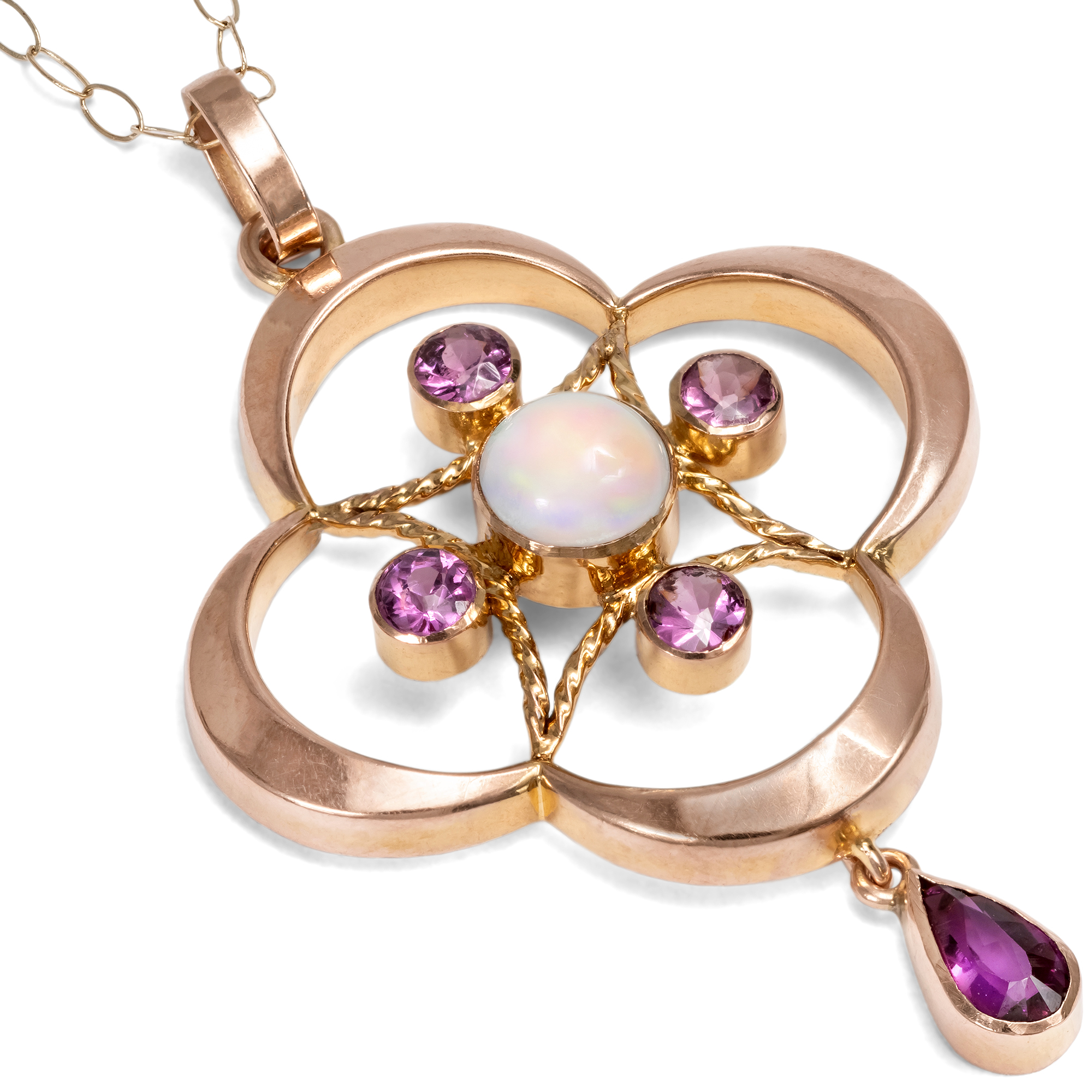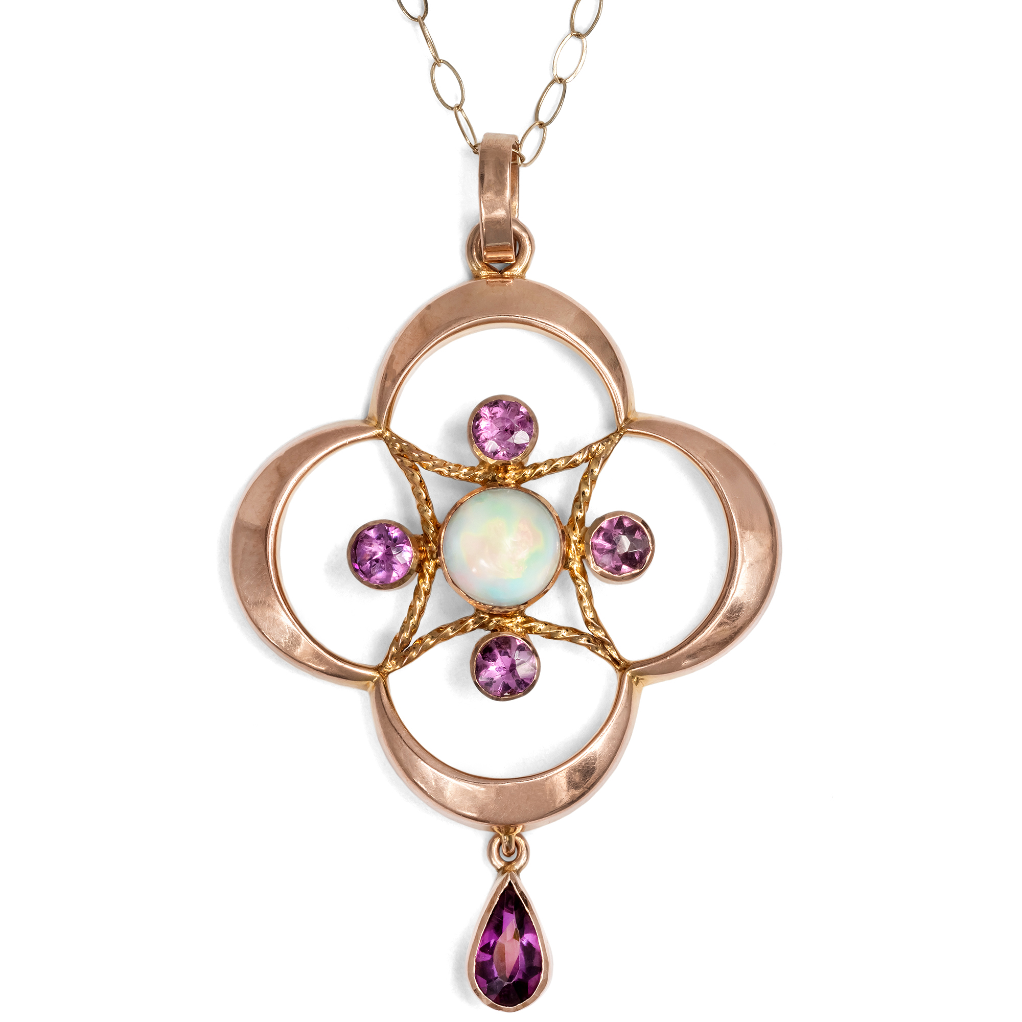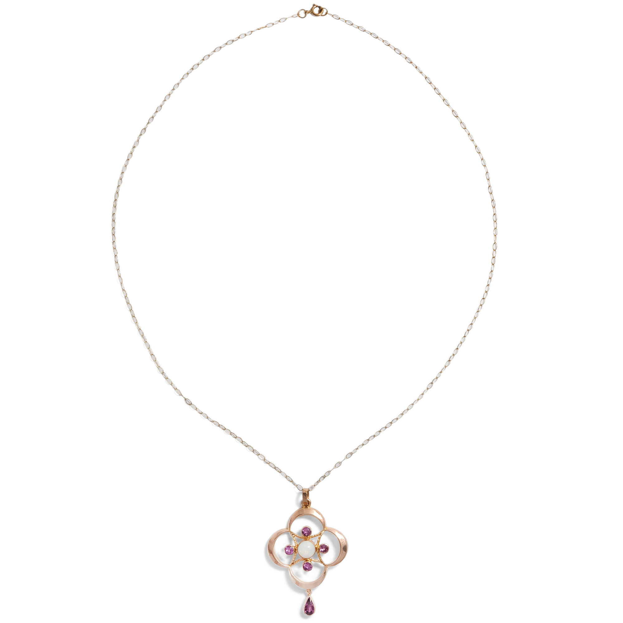 Die Regierungszeit von König Eduard VII. war kurz, doch von unübersehbarem Glanz. Zwischen 1901 und 1910 stand das britische Empire auf dem Höhepunkt seiner Macht und wirtschaftlichen Stärke. Schmuckstücke dieser Jahre wurden in bislang ungeahnter Zahl gefertigt und zeichnen sich noch heute durch ihre unverwechselbare Eleganz aus. Auch im Schmuck bewahrte sich England seinen eigenen Stil. Zwar beeinflusst von den Entwicklungen auf dem Kontinent, entwickelte sich doch ein charakteristisch britischer Geschmack. Der Jugendstil brachte florale Leichtigkeit, die schwungvolle Asymmetrie wurde jedoch nur selten übernommen. Der vorliegende Anhänger aus 9-karätigem Gold ist ein typisches Beispiel dieser Epoche. Der Entwerfer spielte geschickt mit geometrischen Formen: Der Anhänger zeigt einen Vierpass, dessen Zentrum von einer Raute aus gekordelten Goldstäben gefüllt wird. Ein schillernder Opal mit irisierendem Farbspiel bildet den Mittelpunkt, umrahmt von vier Granaten. Ein abgehängter Granattropfen verleiht dem Stück eine verspielte Note. So entstand ein reizvolles Schmuckstück von anmutiger Form, das noch heute sehr gut erhalten ist.