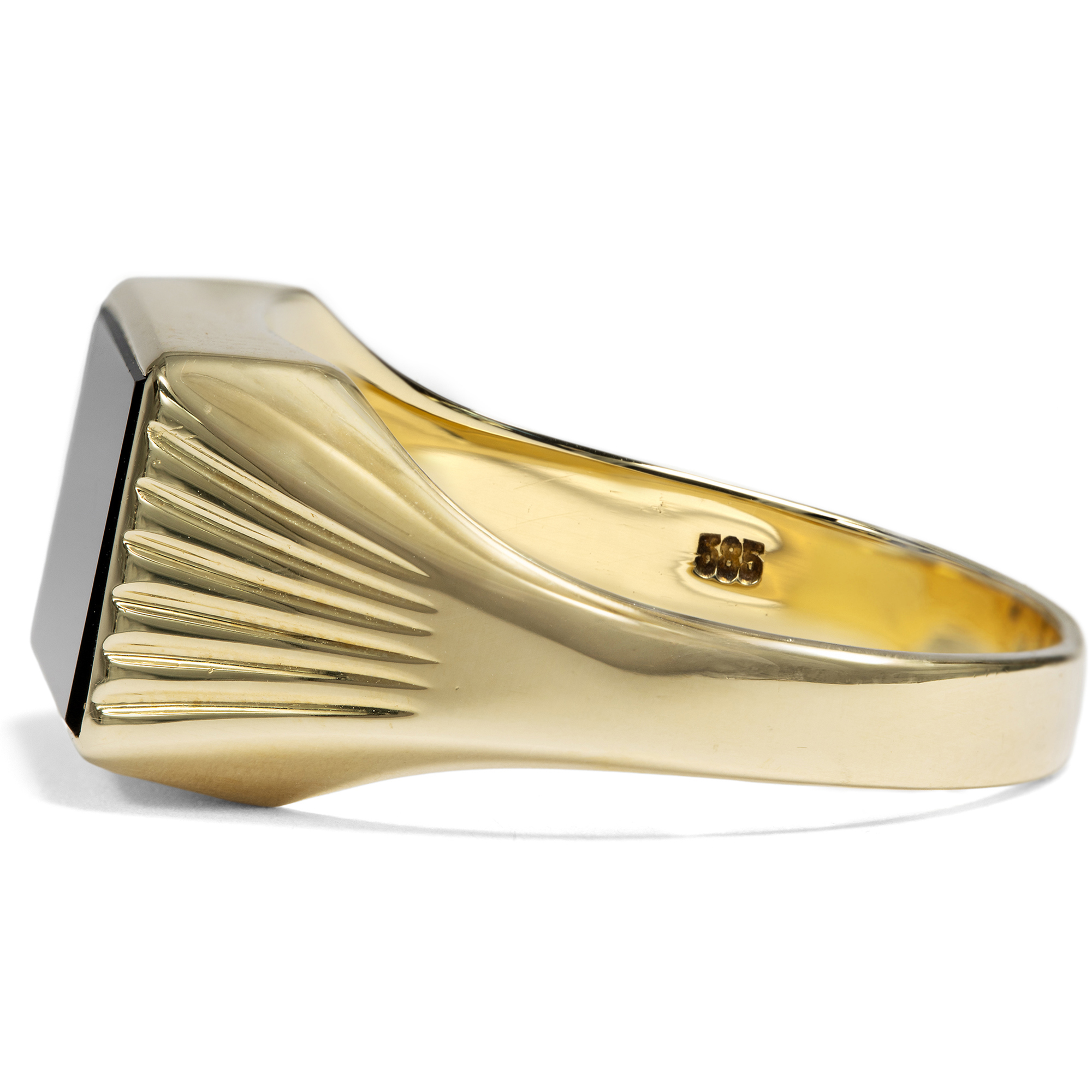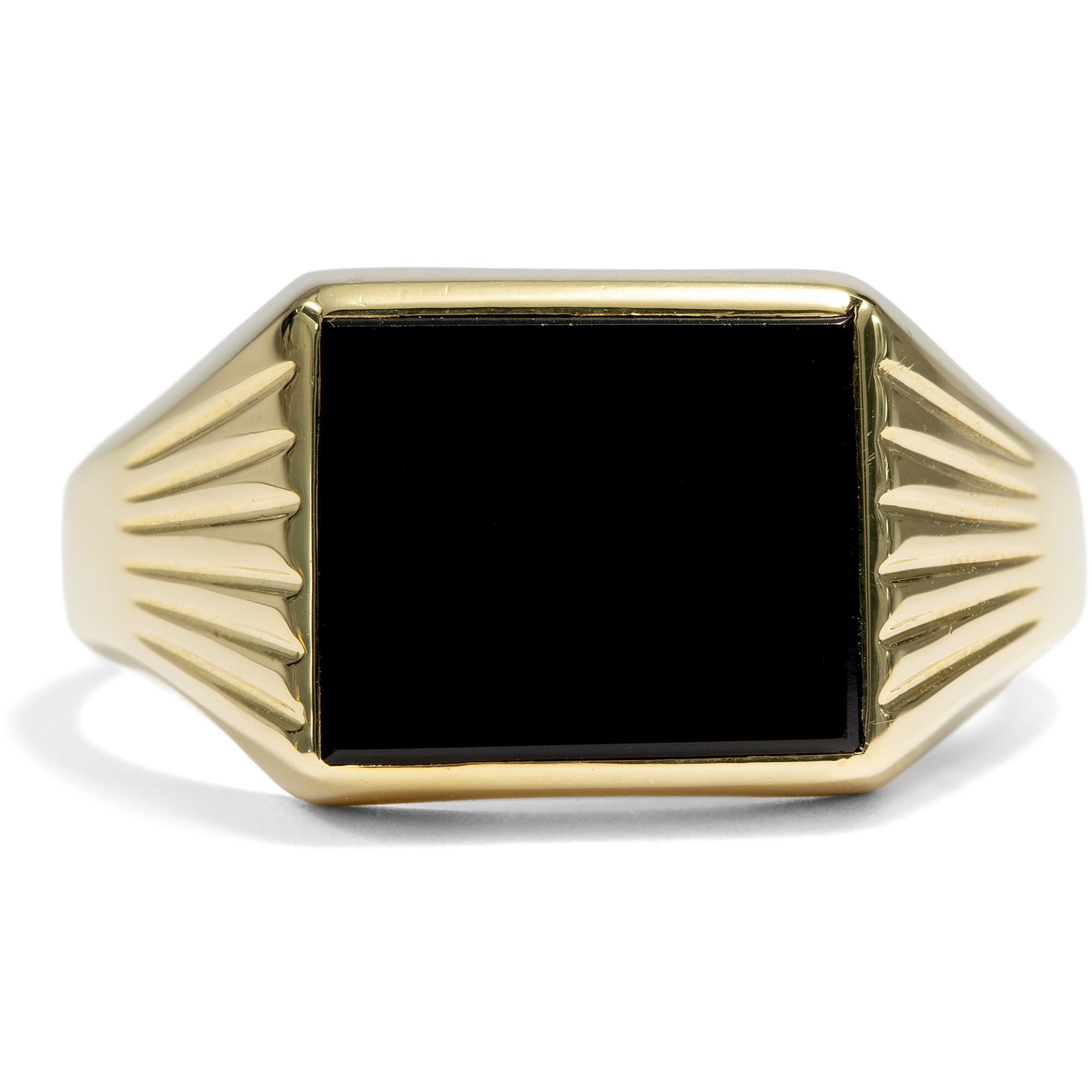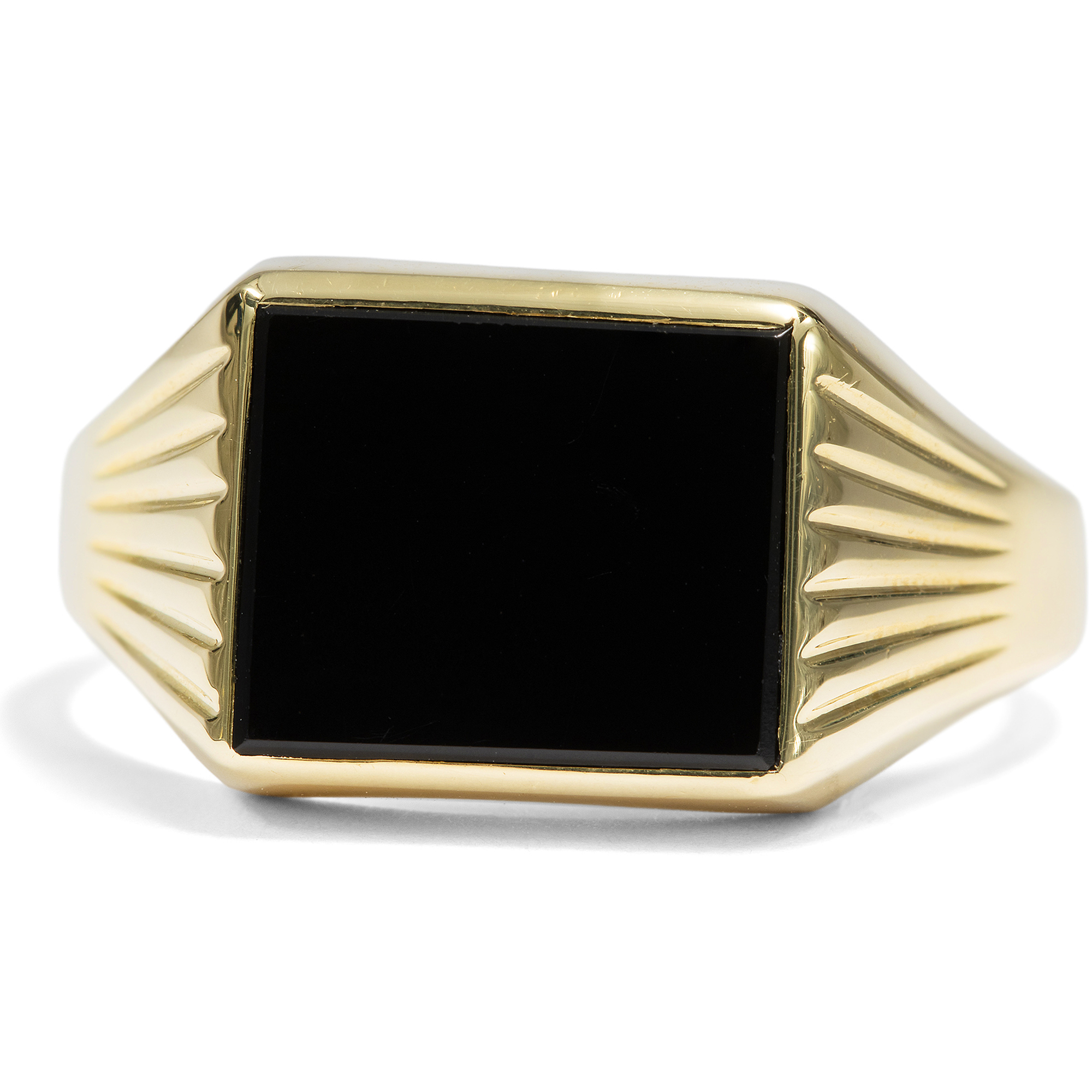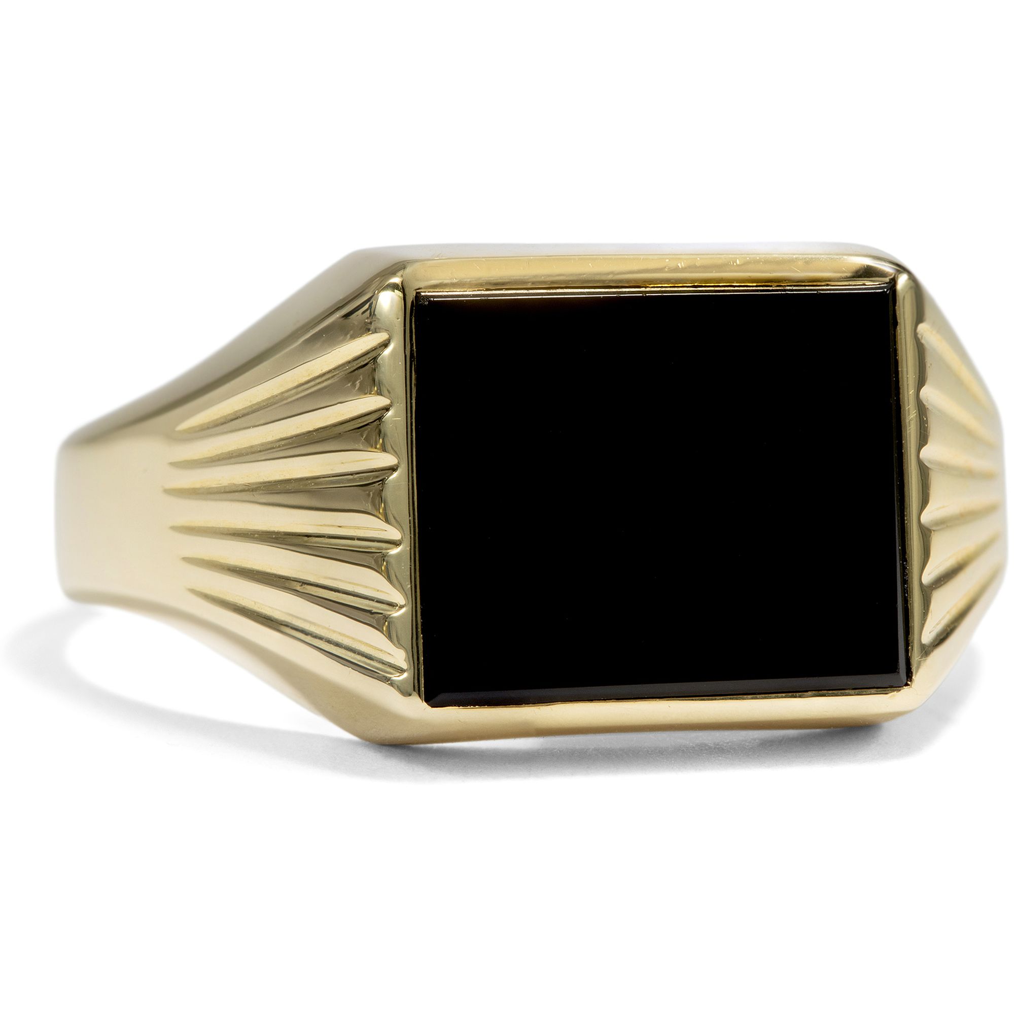 Beim Betrachten alter Familienfotos fällt auf: Herrenringe waren in der deutschen Nachkriegszeit ein Statussymbol. Kaum eine Erstkommunion, Firmung oder Hochzeit fand ohne sie statt – ebenso wenig wie ohne stilvolle Kleidung. Heute sind beide seltener geworden, insbesondere der auffällige Herrenring. Dabei haben sich zahlreiche ungewöhnliche historische Modelle bis heute erhalten. Besonders Ringe mit schwarzem Onyx waren äußerst beliebt und galten als Must-have für den Herrn von Welt. Eine rechteckige Onyxplatte ist hier in Gelbgold gefasst und bildet das tiefschwarze Zentrum dieses Rings, dessen Schulterpartien sich elegant in einem zarten Relief auffächern. Der Ring ist schlicht gehalten, frei von überflüssigem Zierrat und mit einer stabilen Schiene entworfen. Ein schönes Stück aus den 1960er Jahren, das aus Berlin-Charlottenburg zu uns kam.