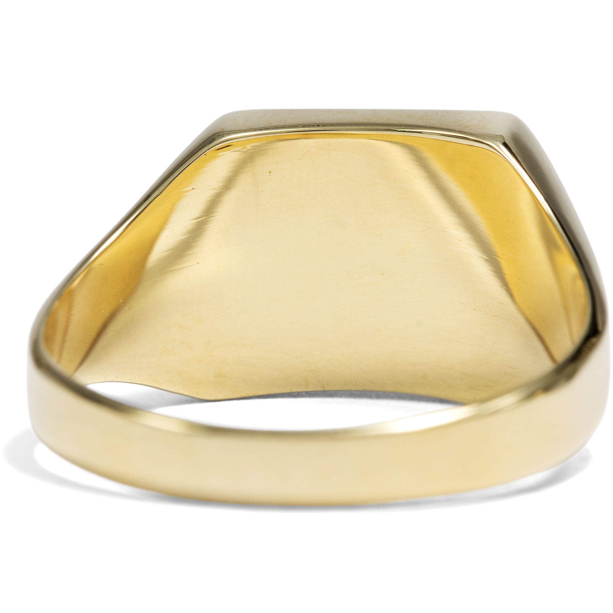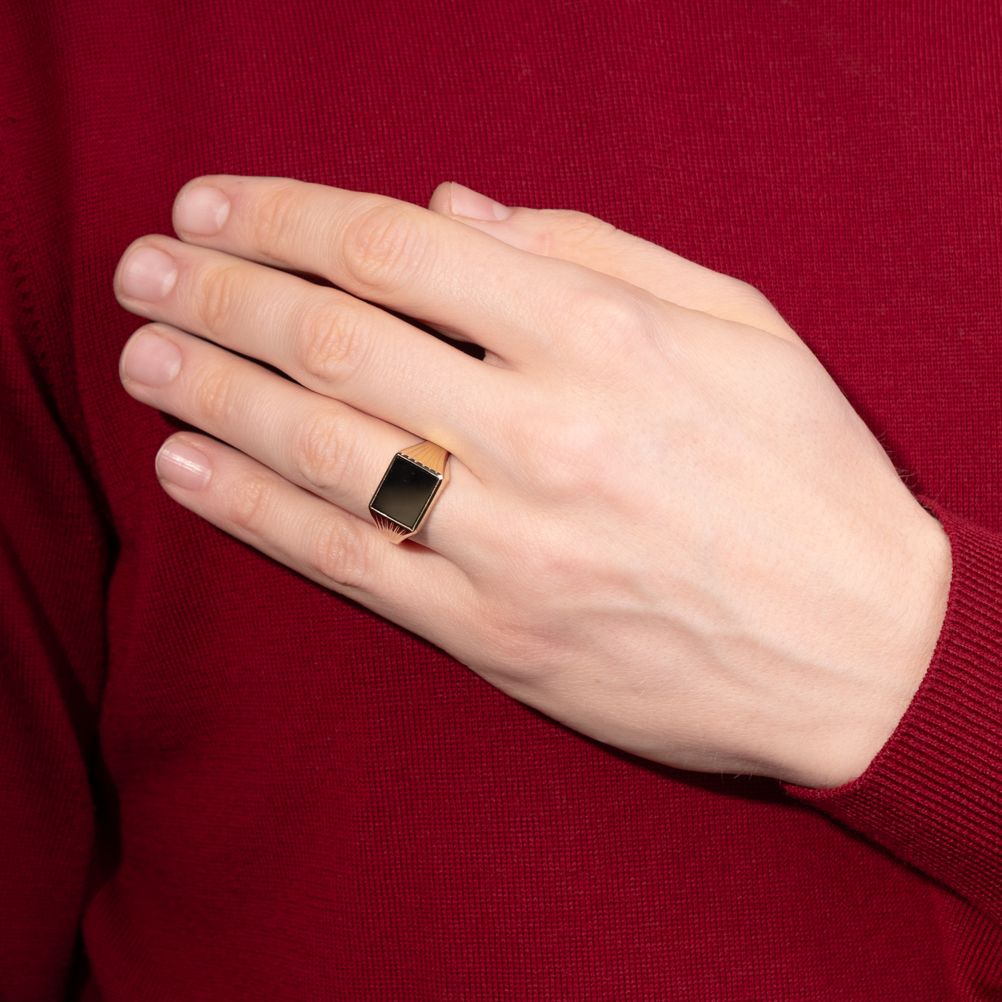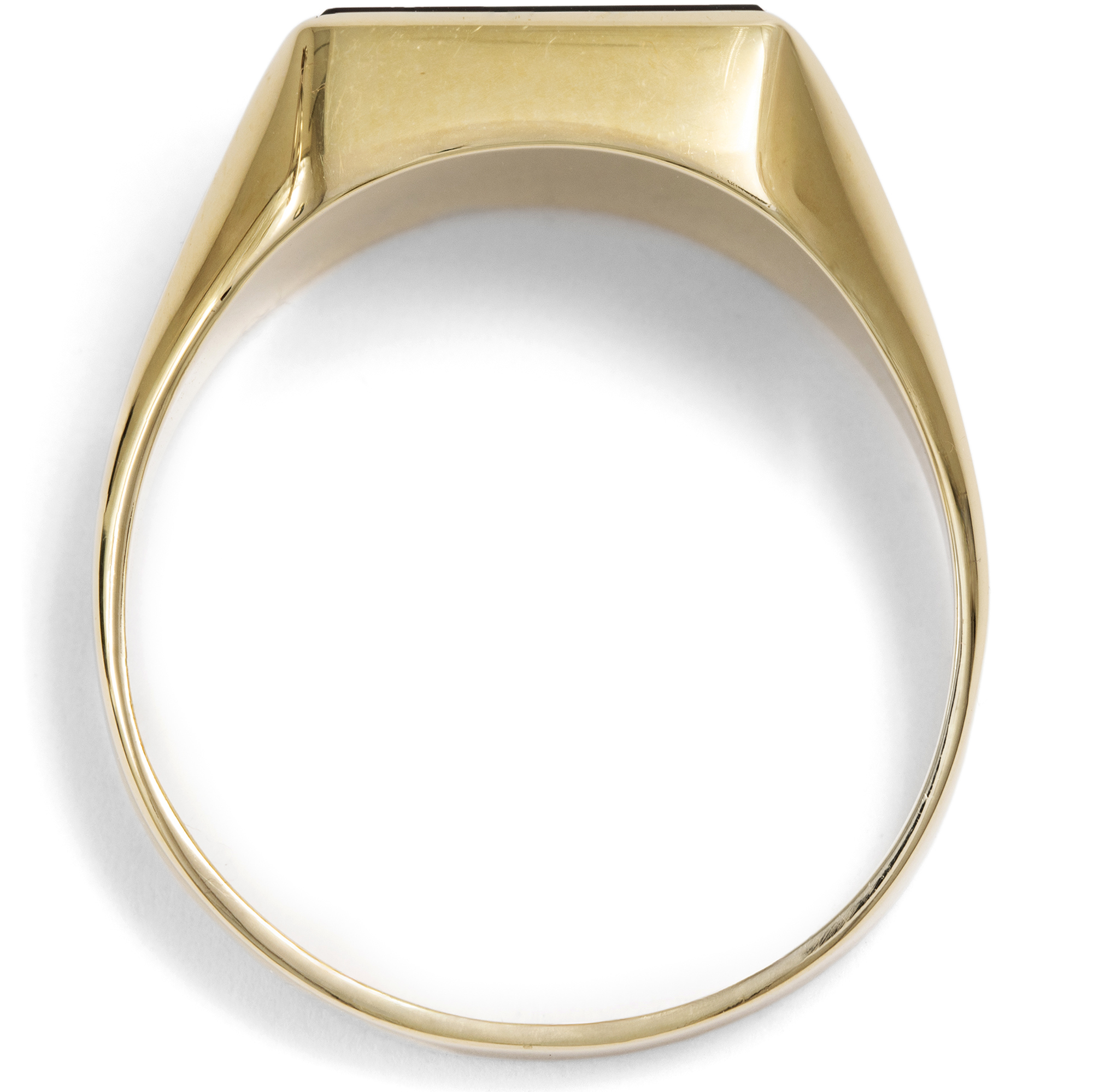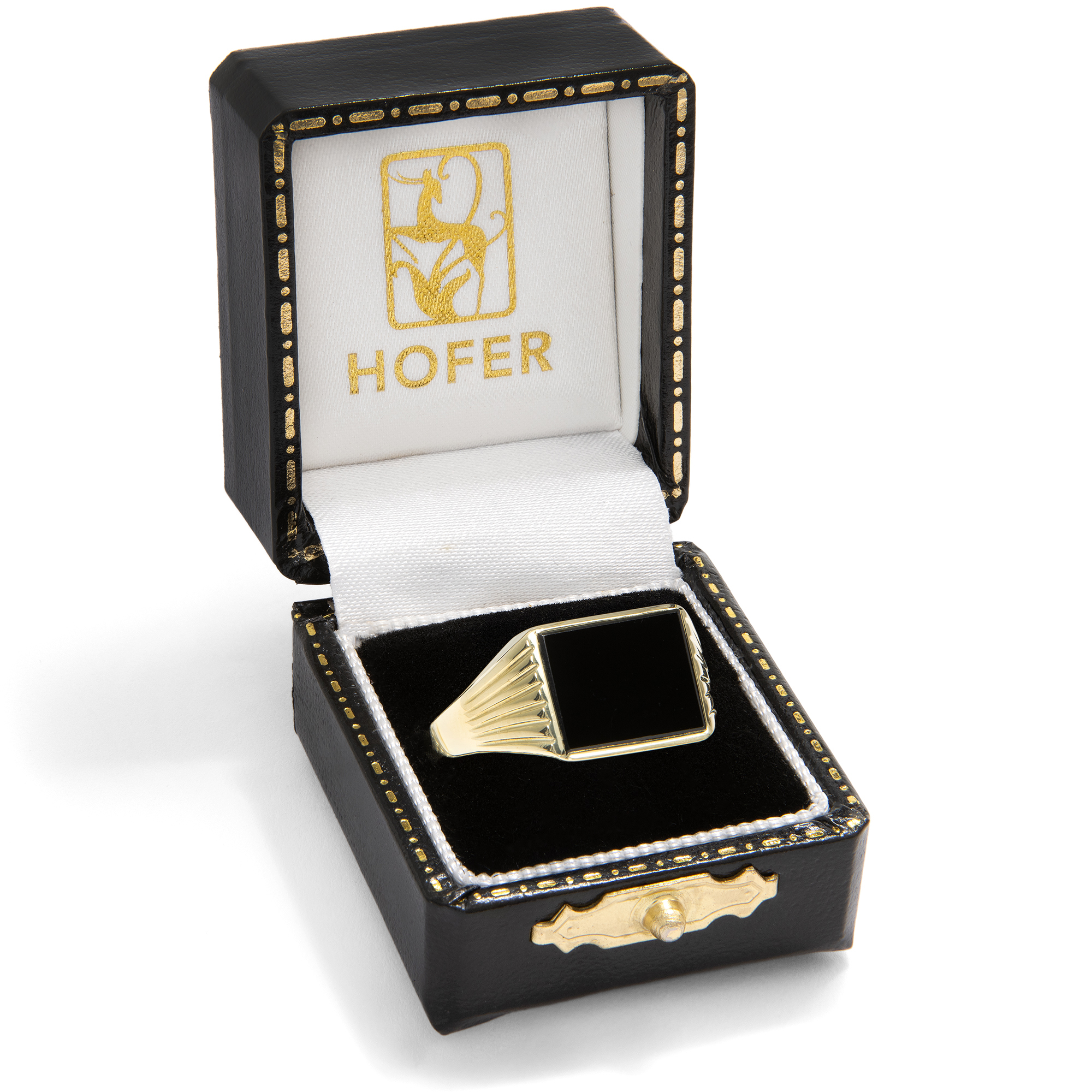 Beim Betrachten alter Familienfotos fällt auf: Herrenringe waren in der deutschen Nachkriegszeit ein Statussymbol. Kaum eine Erstkommunion, Firmung oder Hochzeit fand ohne sie statt – ebenso wenig wie ohne stilvolle Kleidung. Heute sind beide seltener geworden, insbesondere der auffällige Herrenring. Dabei haben sich zahlreiche ungewöhnliche historische Modelle bis heute erhalten. Besonders Ringe mit schwarzem Onyx waren äußerst beliebt und galten als Must-have für den Herrn von Welt. Eine rechteckige Onyxplatte ist hier in Gelbgold gefasst und bildet das tiefschwarze Zentrum dieses Rings, dessen Schulterpartien sich elegant in einem zarten Relief auffächern. Der Ring ist schlicht gehalten, frei von überflüssigem Zierrat und mit einer stabilen Schiene entworfen. Ein schönes Stück aus den 1960er Jahren, das aus Berlin-Charlottenburg zu uns kam.