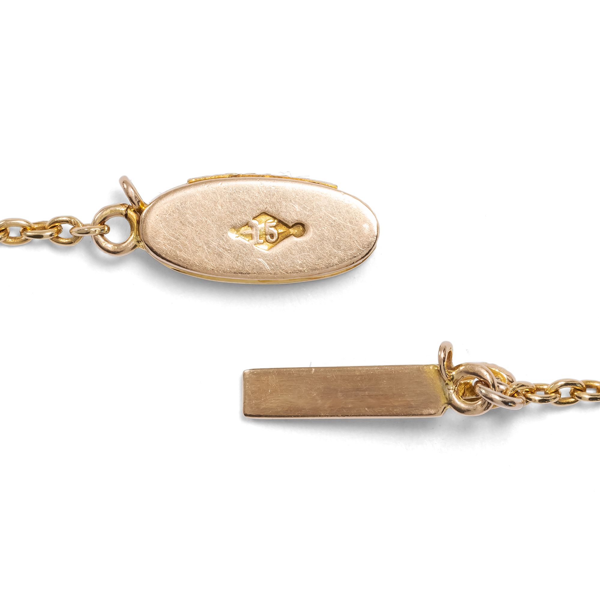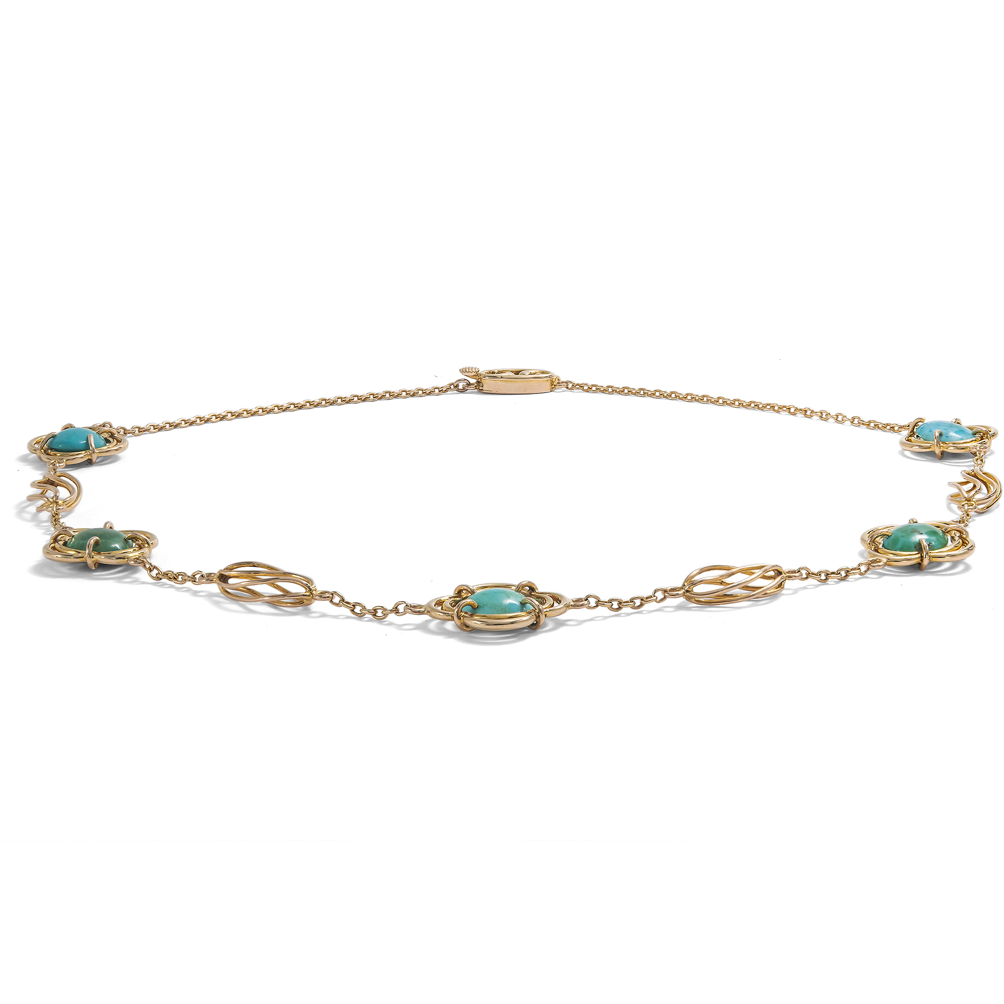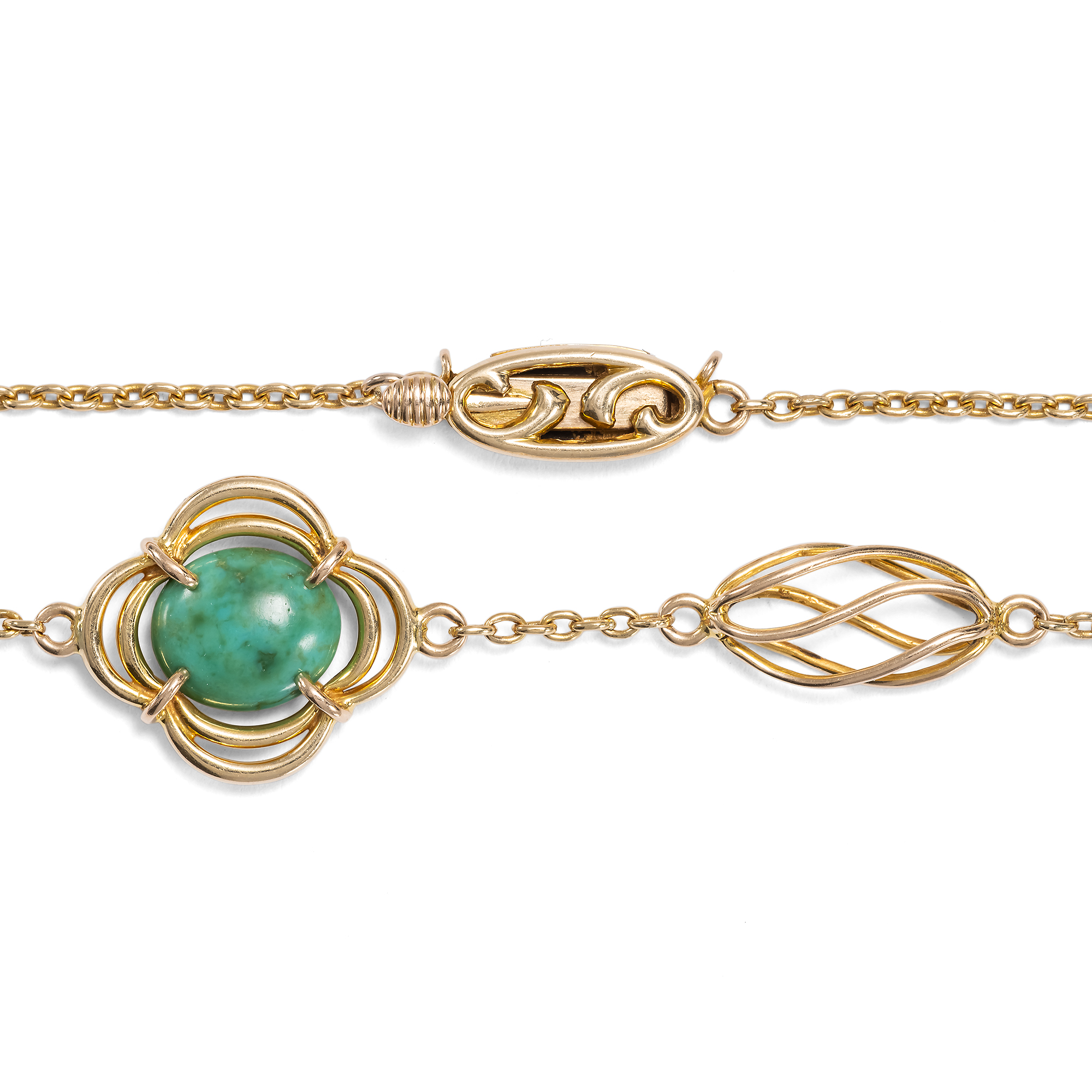 Viele englische Schmuckstücke der Zeit um die Jahrhundertwende zeichnen sich durch ihren Sinn für Form und Material aus. Während manche Werke jener Epoche durch reichen Edelsteinbesatz und ornamentale Fülle auffallen, bevorzugen andere eine betont flächige Gestaltung und eine ruhige, harmonische Farbigkeit – Ausdruck eines neuen, modernen Geschmacks. Das vorliegende Collier gehört zu dieser zweiten Gruppe. Fünf Türkise, jeweils von lebendiger Maserung, wechseln sich mit sogenannten Cage-Gliedern ab, ovalen Gittern aus gebogenen Golddrähten, und schaffen so einen ausgewogenen Rhythmus aus Farbe und Struktur. Der zurückhaltende Entwurf verzichtet auf übermäßigen Zierrat und lenkt den Blick auf das Zusammenspiel von Form, Fläche und Material. In seiner klaren und zugleich organischen Gestaltung steht das Collier in der Tradition der britischen Arts & Crafts-Bewegung, deren Wurzeln im 19. Jahrhundert liegen. Diese Bewegung verband ästhetische und handwerkliche Ideale und suchte nach einer neuen Ehrlichkeit im Umgang mit Material und Gestaltung. Besonders im Schmuck zeigte sich dieser Anspruch durch eine betonte Flächigkeit, die Reduktion des Dekors und den Einsatz natürlicher Farbsteine – Merkmale, die auch hier deutlich werden. Wir haben das Collier in London entdeckt. Der Hersteller ist unbekannt, doch spricht die Gestaltung und die Stempelung eindeutig für den Ursprungsort Großbritannien. Wir datieren das wohlerhaltene Stück in die Jahre um 1905.