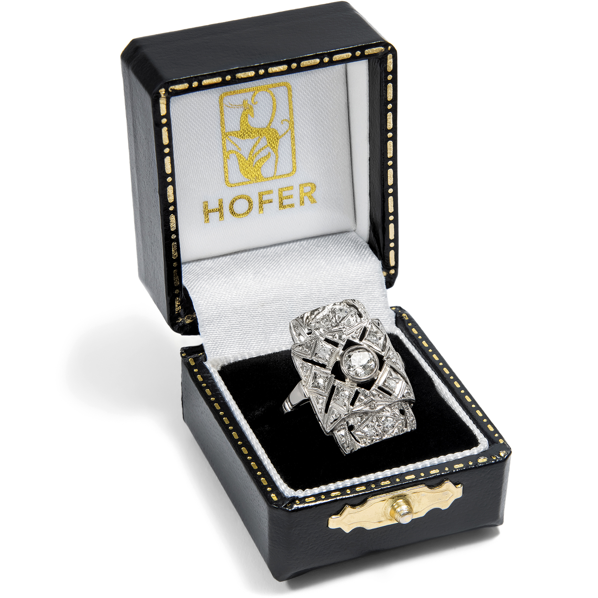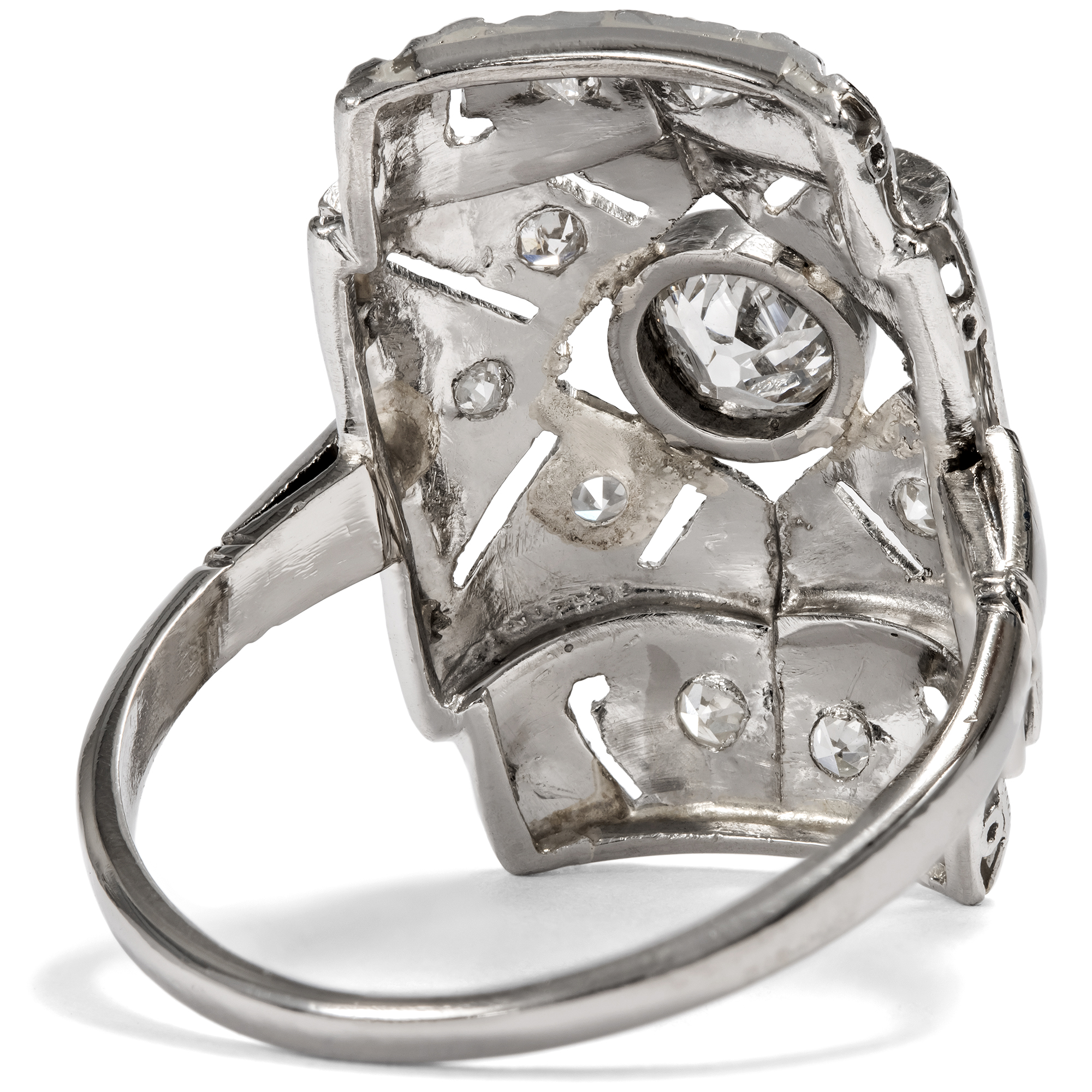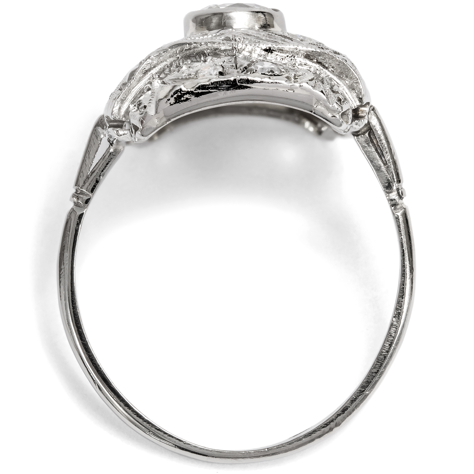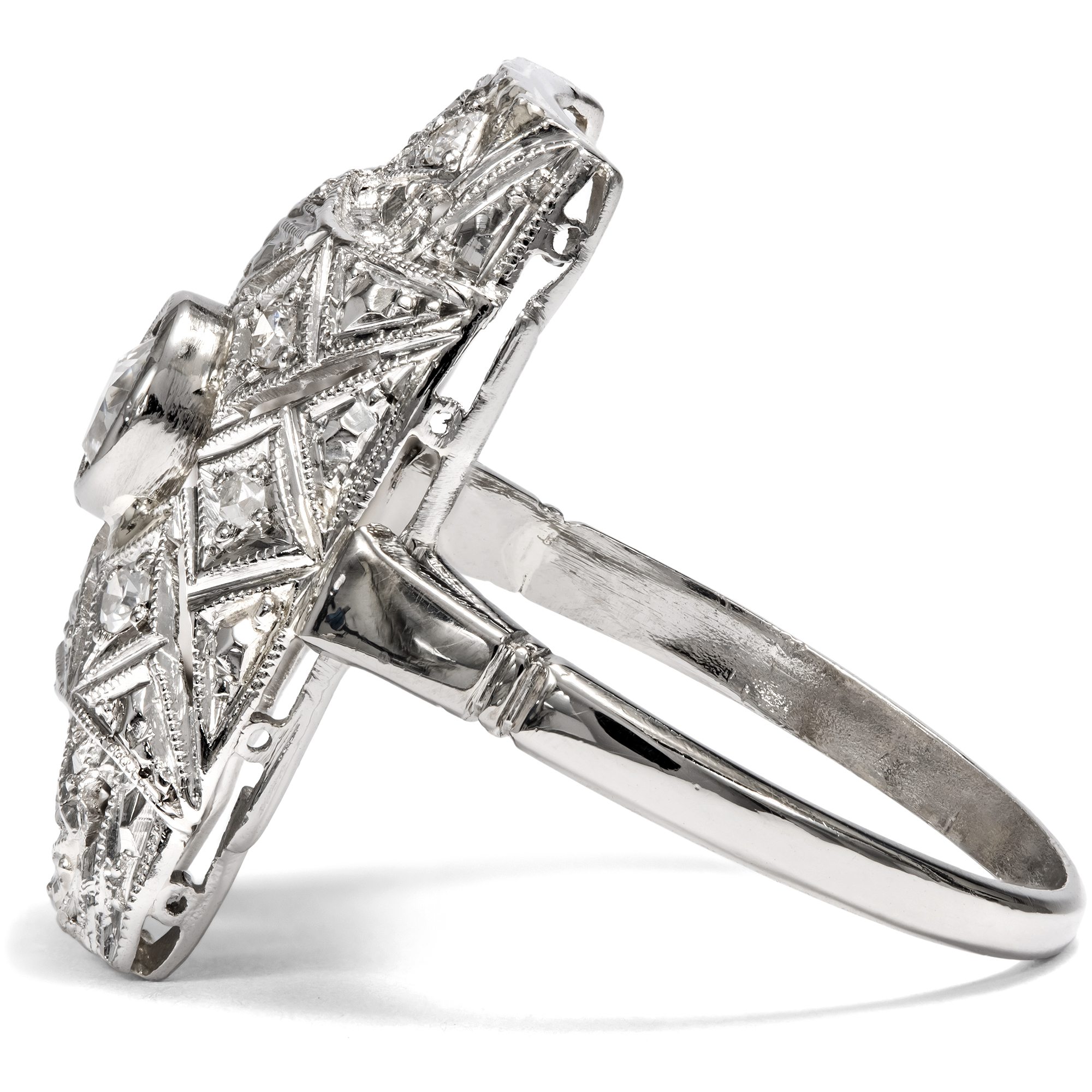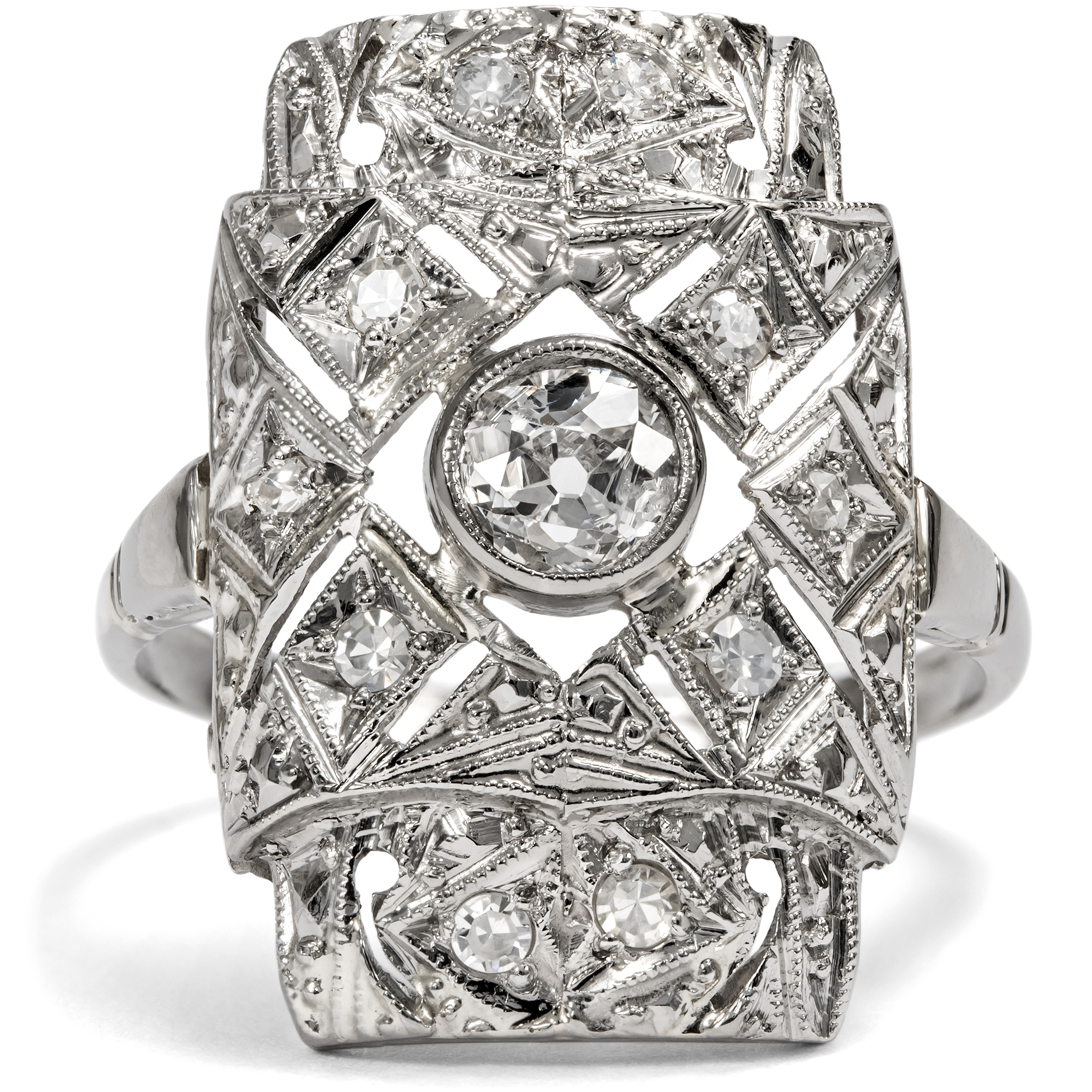 Kühle, graphische Schmuckstücke in einheitlich weißer Farbigkeit bestimmten die Auslagen der Juweliere in den Jahren des Art Déco. Beide Eigenschaften eigneten sich nicht nur dafür, sondern bedingten geradezu eine interessante Oberflächenbearbeitung der Schmuckstücke. Dies können wir auch beim vorliegenden Ring beobachten, der dem Typus eines sog. „Plaque-Rings“ entspricht. In der Mitte des rechteckigen Ringkopfes ist ein schöner Diamant im Altschliff in einer ringsherum geschlossenen Zarge gefasst. Der Stein hat etwa 0,45 ct Gewicht und ist im historischen sog. „Old Mine Cut“ geschliffen. Er ist damit deutlich älter als der Ring selbst, wahrscheinlich wurde er in der ersten Hälfte des 19. Jahrhunderts geschliffen. In dem hier vorliegenden Ring fand er dann eine neue Verwendung. Dieses Vorgehen ist typisch für Schmuck des Art Déco, denn die Zeit litt ja durchaus unter ökonomischen Zwängen. Symmetrisch platzierte Schattenfugen, von Millegriffe gesäumt, verwandeln die Fläche des gelängten und leicht gewölbten Ringkopfes in geometrische Muster, die mit kleineren Diamanten besetzt sind. Zeittypisch ist der Ring aus Weißgold geschmiedet. Der Ring ist gut erhalten, und durch seine flache Bauweise und seine unempfindlichen Materialien ist er auch heute noch alltagstauglich tragbar. Zu uns kam er aus Hamburg.
