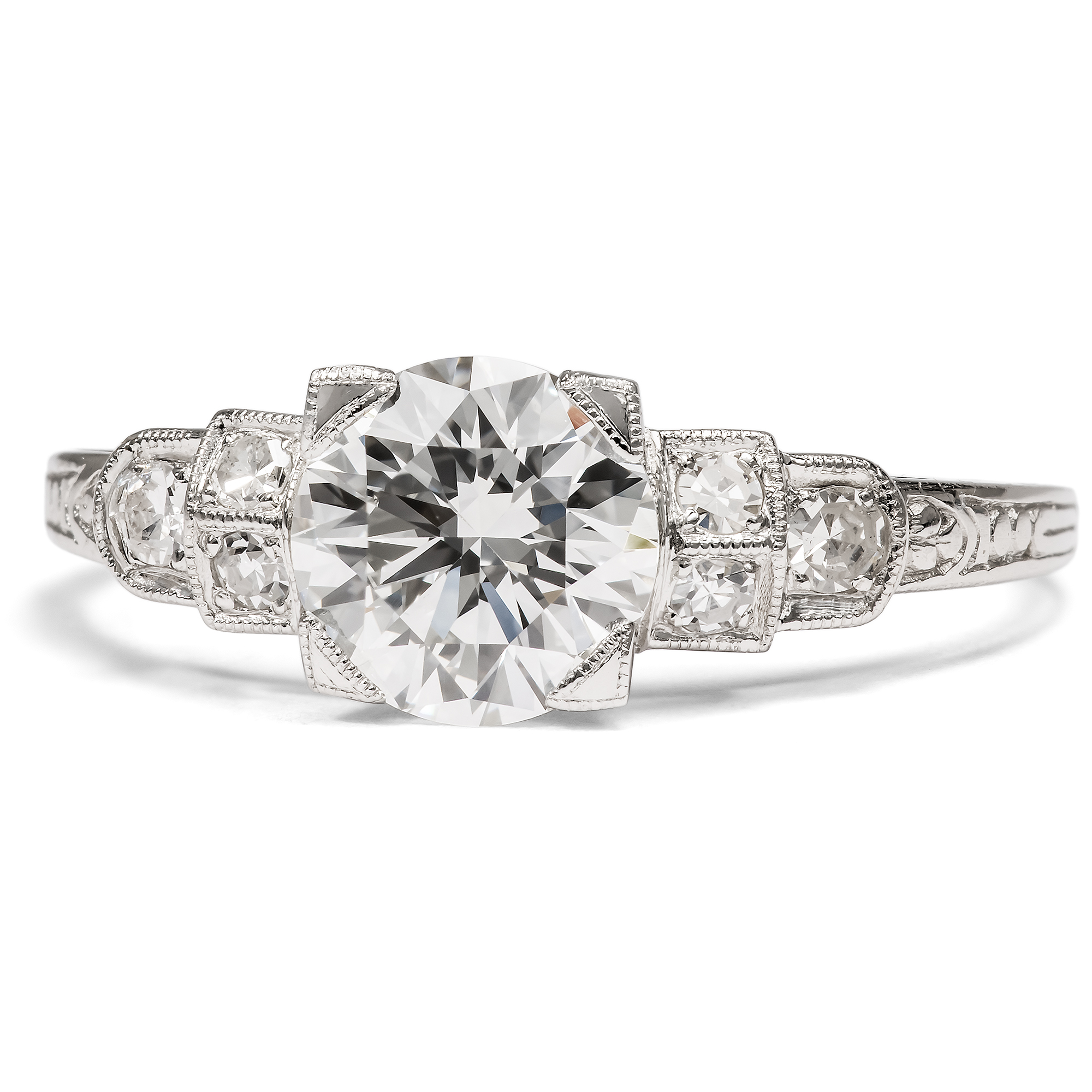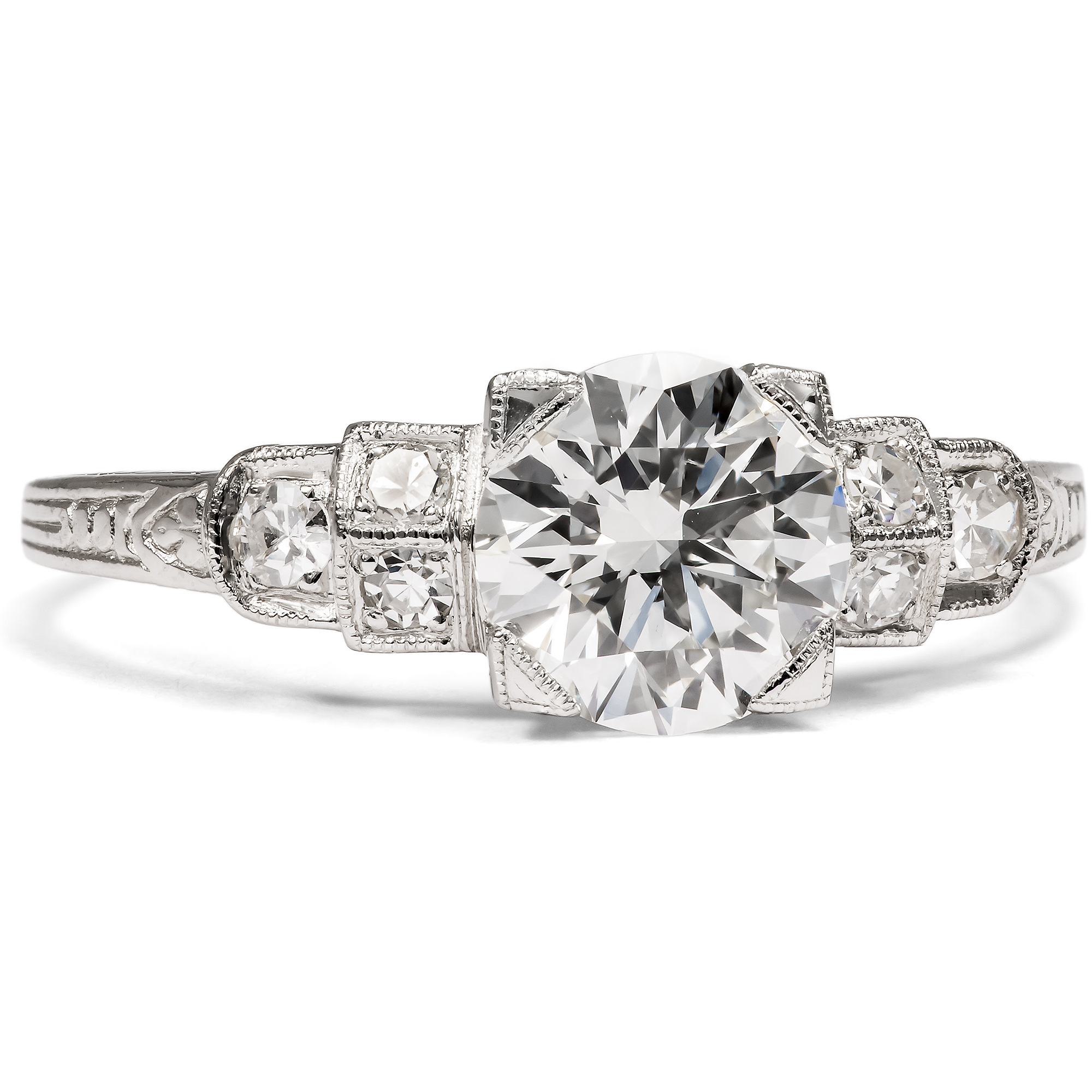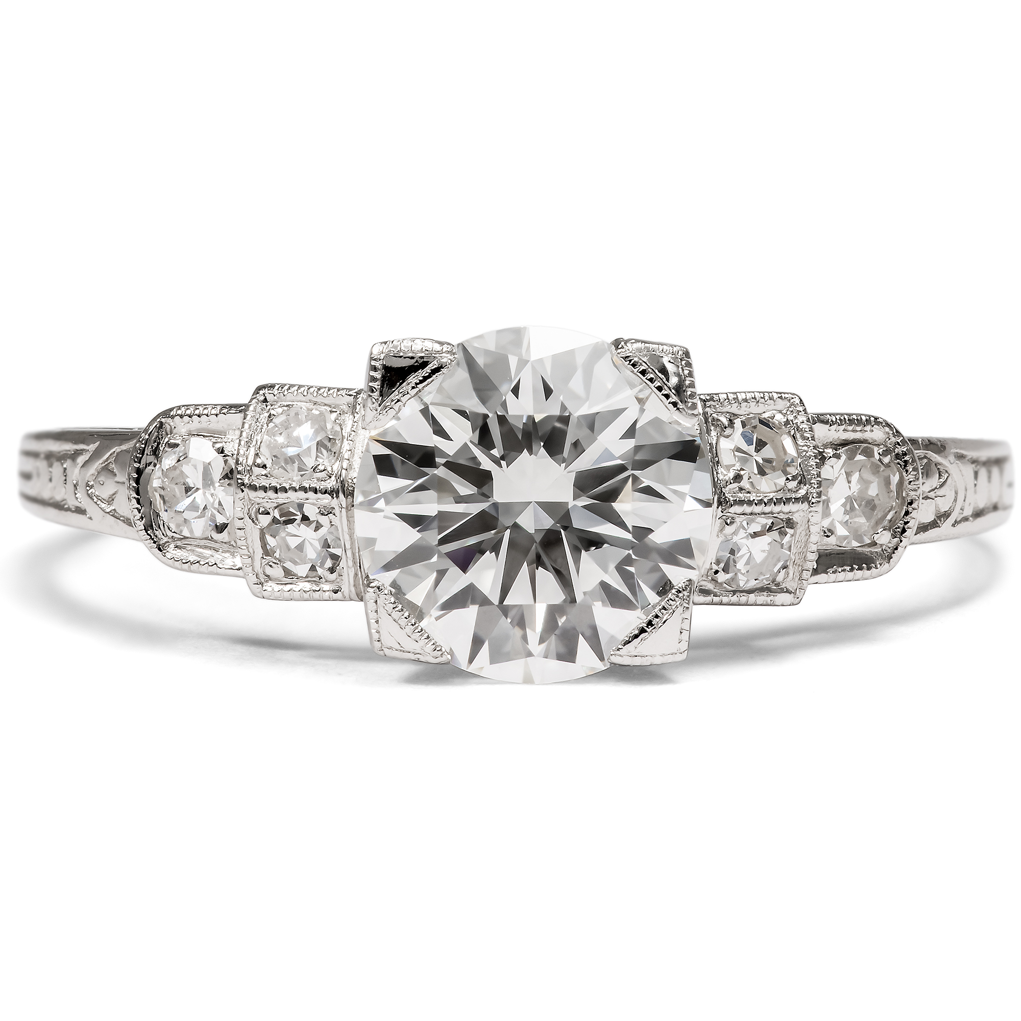 Unter allen Edelsteinen, unter allen Schätzen der Natur sticht ein Stein besonders hervor: Der Diamant ist seit jeher der König aller Juwelen, der Inbegriff kostbaren Schmucks. Sein Feuer, sein Glanz, doch auch seine reine weiße Farbe machen ihn zum begehrtesten Edelstein, zum Star jeden Schmucks. Der hier vorliegende Ring aus unserer Werkstatt ist dazu geschaffen, einen ausgesuchten Diamanten optimal zu präsentieren. In unserer täglichen Arbeit mit antiken Schmuckstücken haben wir zahlreiche wunderbare Diamantringe gesehen. Viele rückten ihre Edelsteine verführerisch ins rechte Licht und gefielen uns durch ihre Formensprache oder ihren Entwurf. Für alle Kunden, die jedoch lieber einen neuen, bislang ungetragenen Ring suchen, haben wir all diese Eigenschaften in einem Stück zusammengefasst: Dieser Ring ist die Essenz – wie wir finden – aus eleganter Form und besten Materialien und vielleicht die schönste Weise, einen Diamanten zu tragen. Der Ring weitet sich in seinem Aufbau in mehreren abgetreppten Stufen. Kleinere Diamanten bereiten von der Ringschiene her den Weg, bis, von vier flachen Krappen gehalten, der große Diamant in der Mitte des Ringes erstrahlt. Im hier vorliegenden Ring aus Platin ist ein Vintage-Brillant gefasst. Der Stein, der in den Jahren um 1960 geschliffen wurde, begeistert mit einem Gewicht von 1,18 Karat in lupenreiner Qualität bei weißer Farbe (Wesselton, H). Der Entwurf des Ringes orientiert sich an den Formen des Art Déco. Grundlage ist eine elegante Geometrie aus Quadraten und Kreisen, die ineinander verschränkt und gestaffelt den Ring und seine Schauseite komponieren. Wir wollen mit diesem Entwurf an das Berlin der 1920er Jahre erinnern, als die Stadt Metropole des Films, des Theaters und zahlreicher Revuen war und im Scheinwerferlicht der Bühnen erstrahlte. In der Seitenansicht des Ringes sind feine Gravuren zu entdecken, welche die Flächen in sanften Reliefs beleben. Durch seine Konstruktion lässt der Ring zudem viel Licht an die Diamanten, um sie optimal funkeln zu lassen. Zugleich ist er flach entworfen und selbst der große Diamant bleibt nah am Finger, sodass der Ring angenehm tragbar ist.