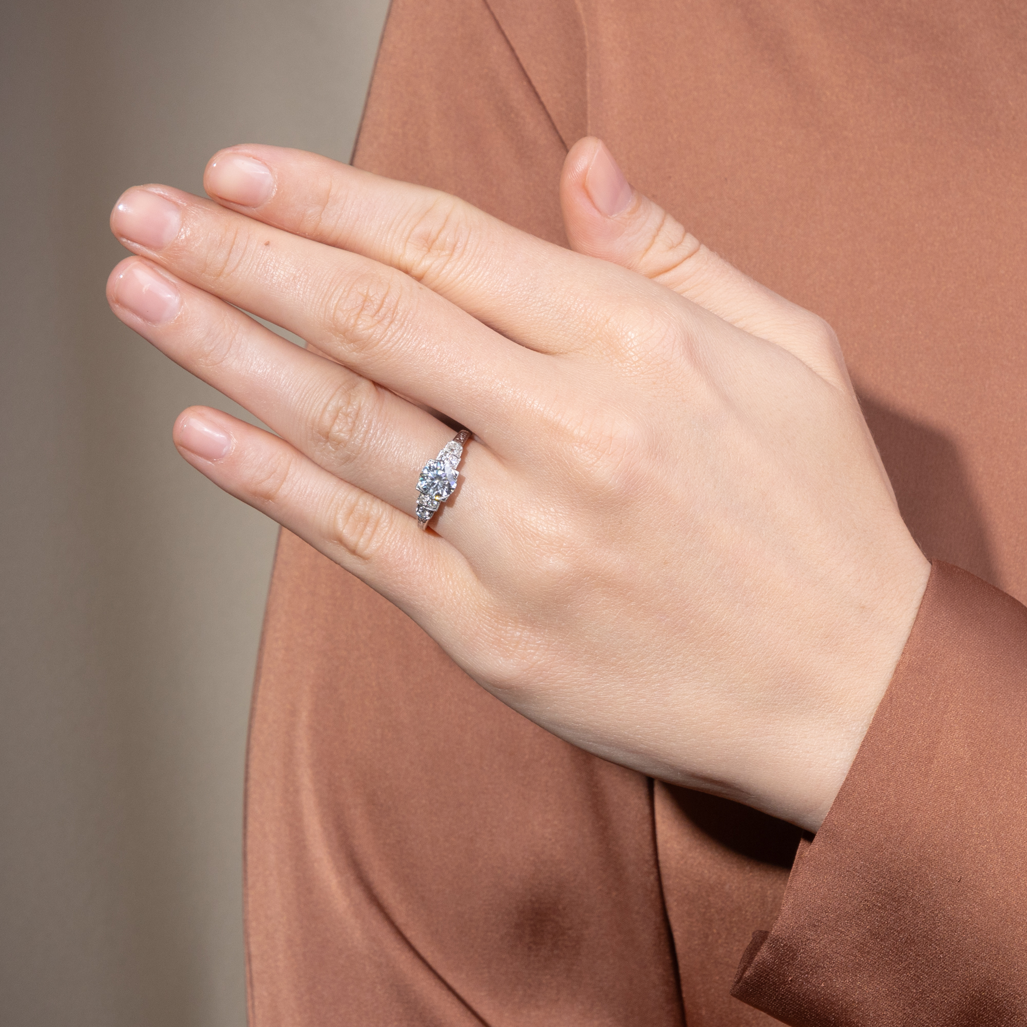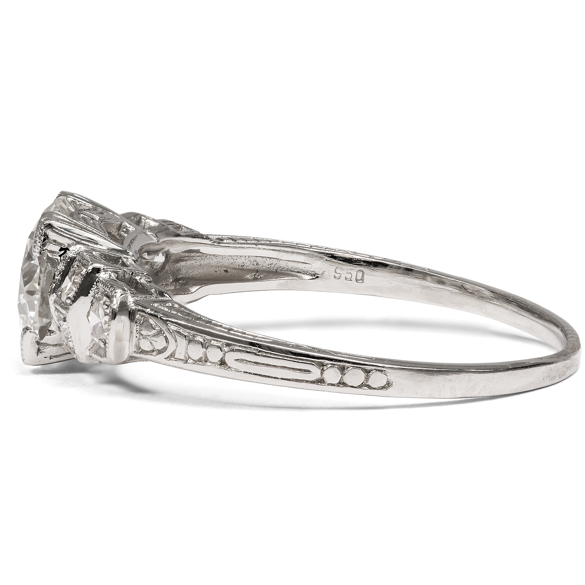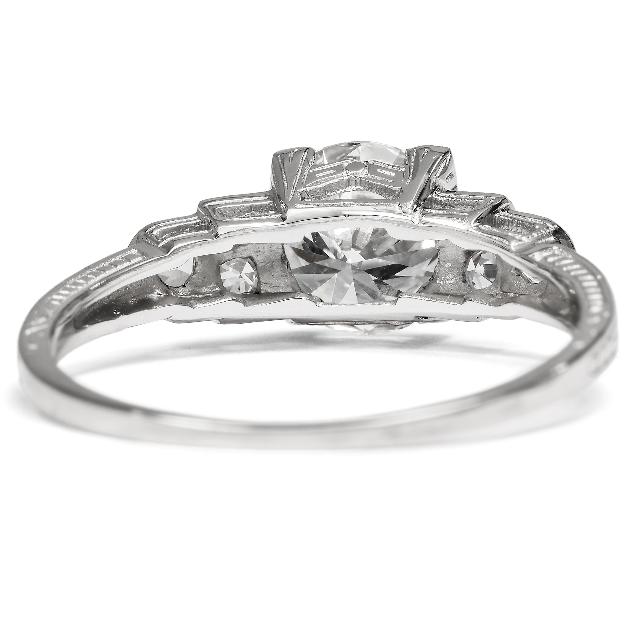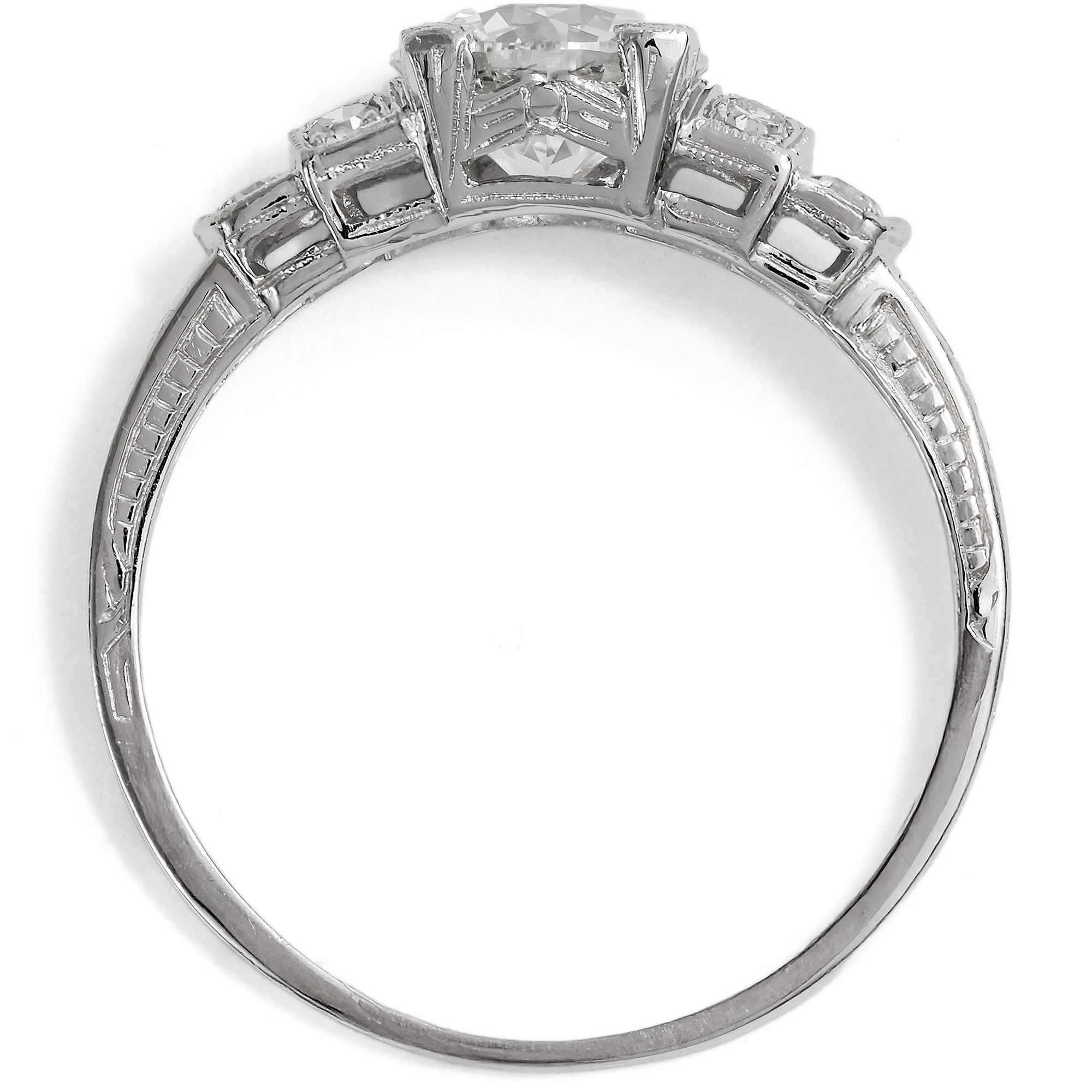 Unter allen Edelsteinen, unter allen Schätzen der Natur sticht ein Stein besonders hervor: Der Diamant ist seit jeher der König aller Juwelen, der Inbegriff kostbaren Schmucks. Sein Feuer, sein Glanz, doch auch seine reine weiße Farbe machen ihn zum begehrtesten Edelstein, zum Star jeden Schmucks. Der hier vorliegende Ring aus unserer Werkstatt ist dazu geschaffen, einen ausgesuchten Diamanten optimal zu präsentieren. In unserer täglichen Arbeit mit antiken Schmuckstücken haben wir zahlreiche wunderbare Diamantringe gesehen. Viele rückten ihre Edelsteine verführerisch ins rechte Licht und gefielen uns durch ihre Formensprache oder ihren Entwurf. Für alle Kunden, die jedoch lieber einen neuen, bislang ungetragenen Ring suchen, haben wir all diese Eigenschaften in einem Stück zusammengefasst: Dieser Ring ist die Essenz – wie wir finden – aus eleganter Form und besten Materialien und vielleicht die schönste Weise, einen Diamanten zu tragen. Der Ring weitet sich in seinem Aufbau in mehreren abgetreppten Stufen. Kleinere Diamanten bereiten von der Ringschiene her den Weg, bis, von vier flachen Krappen gehalten, der große Diamant in der Mitte des Ringes erstrahlt. Im hier vorliegenden Ring aus Platin ist ein Vintage-Brillant gefasst. Der Stein, der in den Jahren um 1960 geschliffen wurde, begeistert mit einem Gewicht von 1,18 Karat in lupenreiner Qualität bei weißer Farbe (Wesselton, H). Der Entwurf des Ringes orientiert sich an den Formen des Art Déco. Grundlage ist eine elegante Geometrie aus Quadraten und Kreisen, die ineinander verschränkt und gestaffelt den Ring und seine Schauseite komponieren. Wir wollen mit diesem Entwurf an das Berlin der 1920er Jahre erinnern, als die Stadt Metropole des Films, des Theaters und zahlreicher Revuen war und im Scheinwerferlicht der Bühnen erstrahlte. In der Seitenansicht des Ringes sind feine Gravuren zu entdecken, welche die Flächen in sanften Reliefs beleben. Durch seine Konstruktion lässt der Ring zudem viel Licht an die Diamanten, um sie optimal funkeln zu lassen. Zugleich ist er flach entworfen und selbst der große Diamant bleibt nah am Finger, sodass der Ring angenehm tragbar ist.