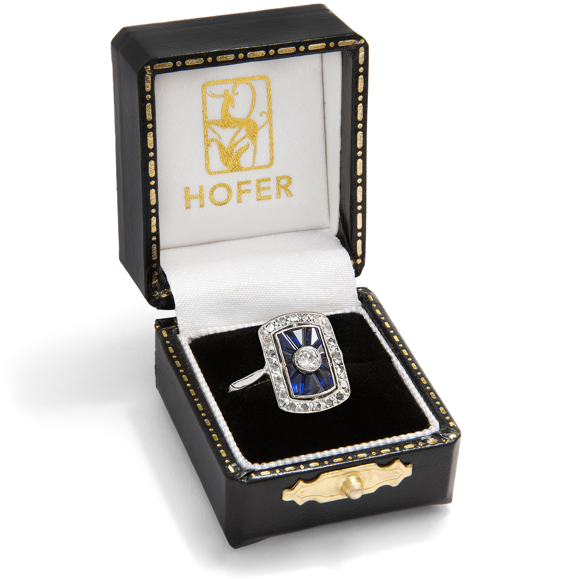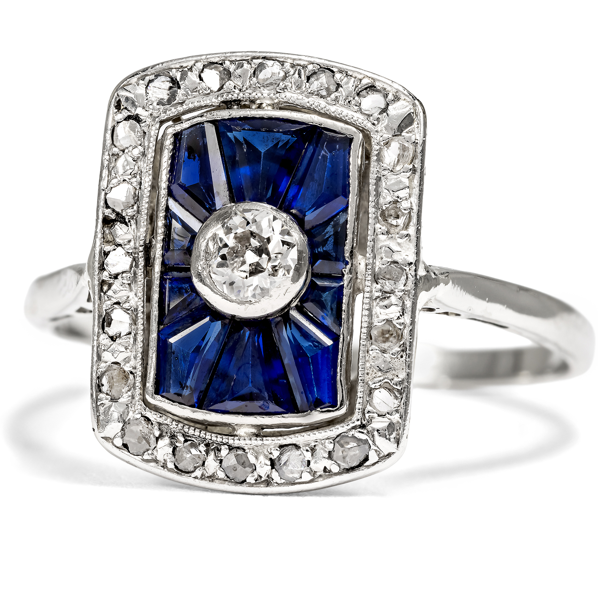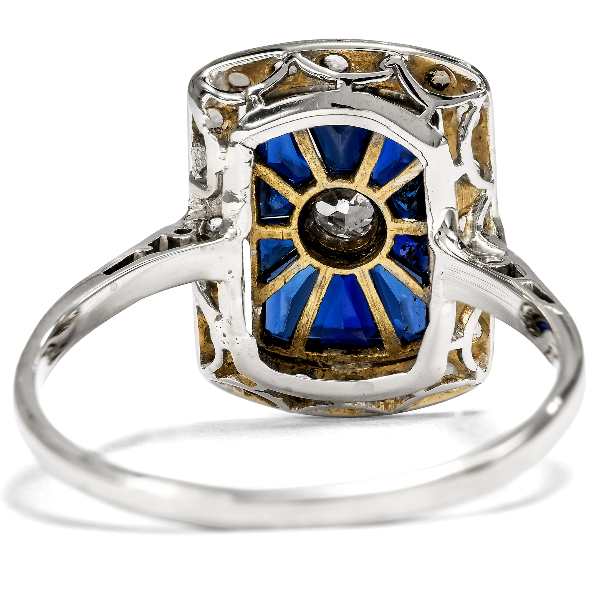 Synthetische Edelsteine, vor allem Saphire und Rubine, waren eine große Mode in den ersten Jahrzehnten des 20. Jahrhunderts. Die Technik ihrer Herstellung hatte Auguste Verneuil 1891 entwickelt. Seine im Labor entwickelten Rubine, später kamen auch Saphire hinzu, waren in der Struktur und Farbe kaum noch von natürlichen Steinen zu unterscheiden. Schnell wurden synthetische Edelsteine zum dernier cri der Modewelt. Denn sie ermöglichten ganz neuartige Entwürfe, deren Umsetzung zuvor die fehlende Verfügbarkeit von Edelsteinen in gleichmäßiger Qualität verhindert hatte. Der hier vorliegende Ring ist ein schönes Beispiel für eine solche Art Schmuck, der ohne die Erfindung der Edelsteinsynthese wohl nie umgesetzt worden wäre. Das Schaustück des Ringes ist in Form eines Schildes entworfen, gestreckt und rechteckig, wobei die kürzeren Seiten leicht gerundet nach außen ausschwingen. Ein äußerer Rahmen aus Diamanten im Rosenschliff umschließt ein intensiv blau leuchtendes Feld aus synthetischen Saphiren. Die Steine sind passend eingeschliffen, dicht an dicht gesetzt, sodass kein Fassrand, keine Krappen sichtbar sind. Allein ihr tiefes Blau leuchtet hier und scheint im Rahmen der Diamanten zu schweben. Die Mitte wiederum – und hierüber sind die Saphire dann auch befestigt – besetzt ein funkelnder Diamant im historischen Altschliff mit etwa 0,10 Karat Gewicht. Der Schliff der Saphire ist aufwendig und verbraucht viel Material. Steine von genau der gleichen, bestmöglichen Farbe zu finden, wäre mit natürlichen Steinen sehr, sehr schwierig geworden. Mit synthetischen Saphiren gelang hier jedoch ein ganz neuer Look – ein moderner, so zuvor ungesehener Entwurf, der heute noch überzeugt. Passend zur Verwendung der Synthesen ist der Ring selbst aus hochkarätigem Weißgold gefertigt, einer damals ebenso neuartigen, neu entwickelten Goldlegierung, die erst in den 1920er Jahren weitere Verbreitung fand. Da auch der Entwurf ganz klar in die Epoche des Art Déco weist, datieren wir diesen Ring in die Jahre um 1930.