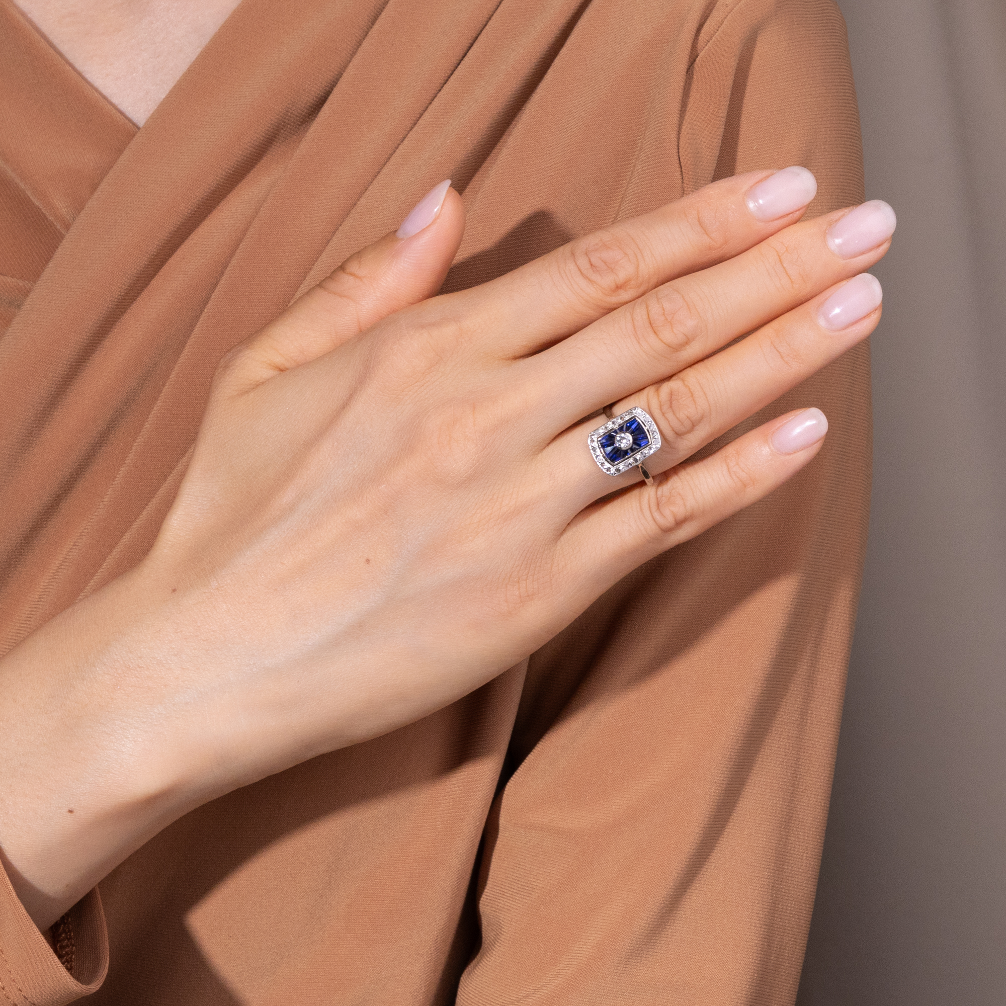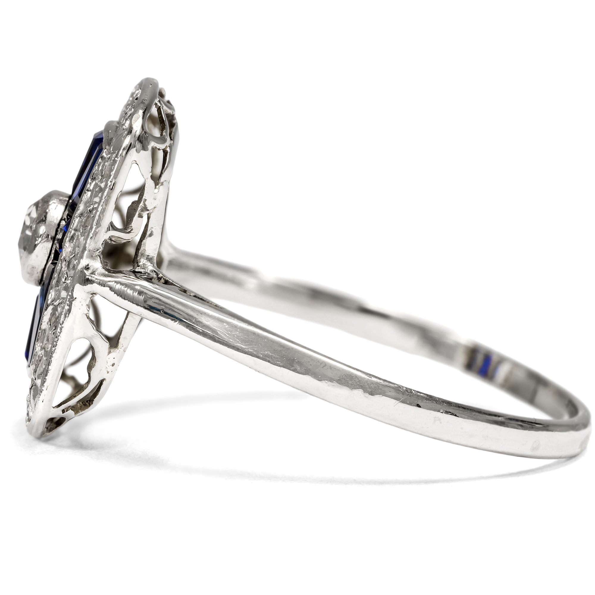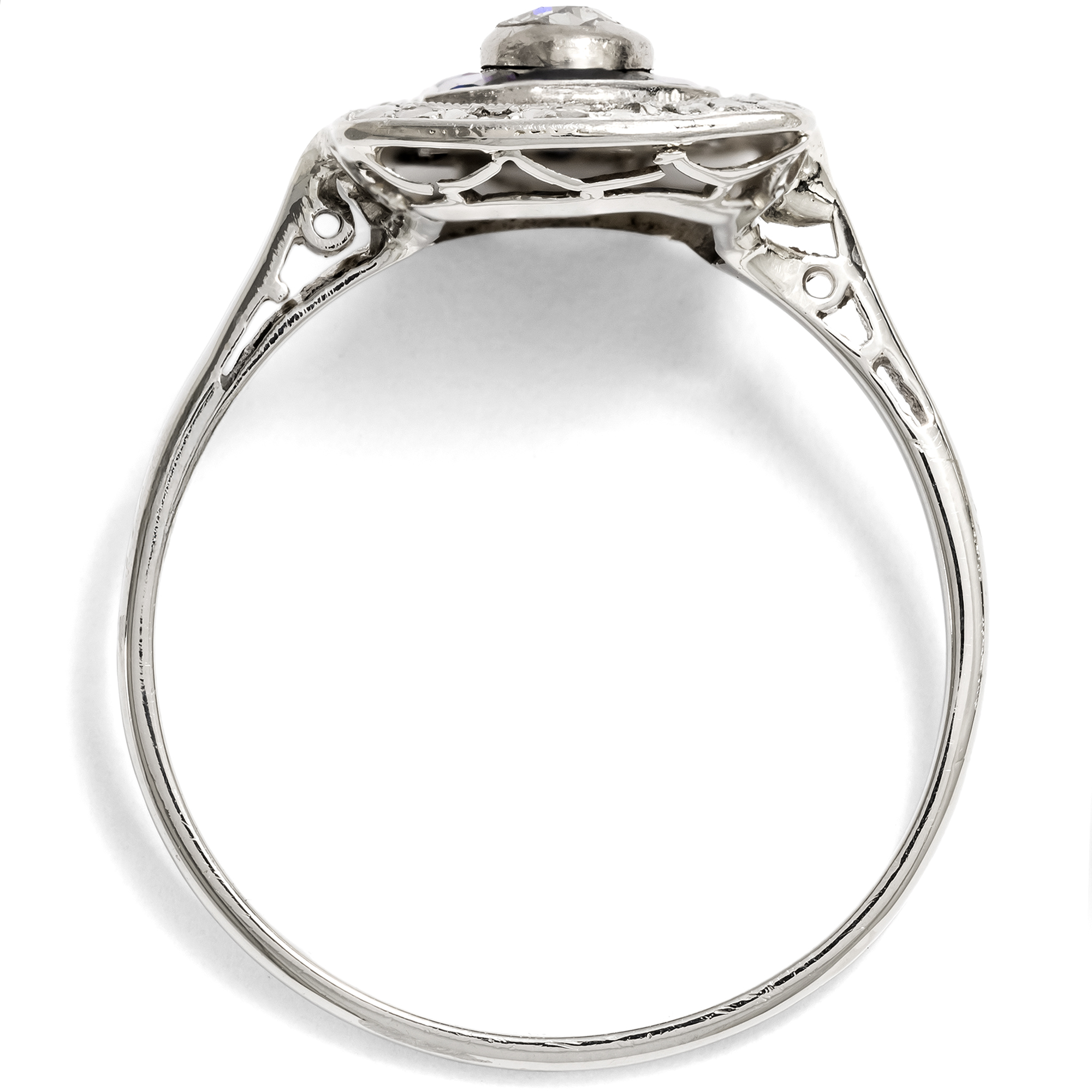 Synthetische Edelsteine, vor allem Saphire und Rubine, waren eine große Mode in den ersten Jahrzehnten des 20. Jahrhunderts. Die Technik ihrer Herstellung hatte Auguste Verneuil 1891 entwickelt. Seine im Labor entwickelten Rubine, später kamen auch Saphire hinzu, waren in der Struktur und Farbe kaum noch von natürlichen Steinen zu unterscheiden. Schnell wurden synthetische Edelsteine zum dernier cri der Modewelt. Denn sie ermöglichten ganz neuartige Entwürfe, deren Umsetzung zuvor die fehlende Verfügbarkeit von Edelsteinen in gleichmäßiger Qualität verhindert hatte. Der hier vorliegende Ring ist ein schönes Beispiel für eine solche Art Schmuck, der ohne die Erfindung der Edelsteinsynthese wohl nie umgesetzt worden wäre. Das Schaustück des Ringes ist in Form eines Schildes entworfen, gestreckt und rechteckig, wobei die kürzeren Seiten leicht gerundet nach außen ausschwingen. Ein äußerer Rahmen aus Diamanten im Rosenschliff umschließt ein intensiv blau leuchtendes Feld aus synthetischen Saphiren. Die Steine sind passend eingeschliffen, dicht an dicht gesetzt, sodass kein Fassrand, keine Krappen sichtbar sind. Allein ihr tiefes Blau leuchtet hier und scheint im Rahmen der Diamanten zu schweben. Die Mitte wiederum – und hierüber sind die Saphire dann auch befestigt – besetzt ein funkelnder Diamant im historischen Altschliff mit etwa 0,10 Karat Gewicht. Der Schliff der Saphire ist aufwendig und verbraucht viel Material. Steine von genau der gleichen, bestmöglichen Farbe zu finden, wäre mit natürlichen Steinen sehr, sehr schwierig geworden. Mit synthetischen Saphiren gelang hier jedoch ein ganz neuer Look – ein moderner, so zuvor ungesehener Entwurf, der heute noch überzeugt. Passend zur Verwendung der Synthesen ist der Ring selbst aus hochkarätigem Weißgold gefertigt, einer damals ebenso neuartigen, neu entwickelten Goldlegierung, die erst in den 1920er Jahren weitere Verbreitung fand. Da auch der Entwurf ganz klar in die Epoche des Art Déco weist, datieren wir diesen Ring in die Jahre um 1930.
