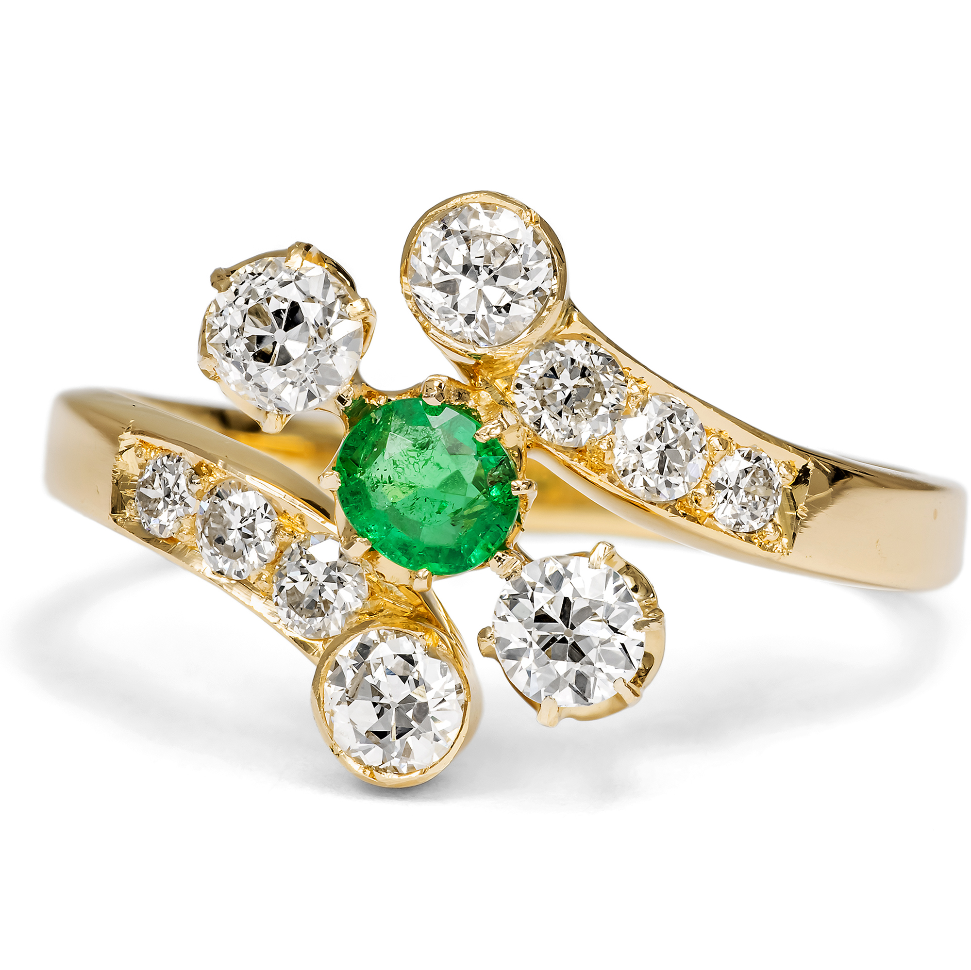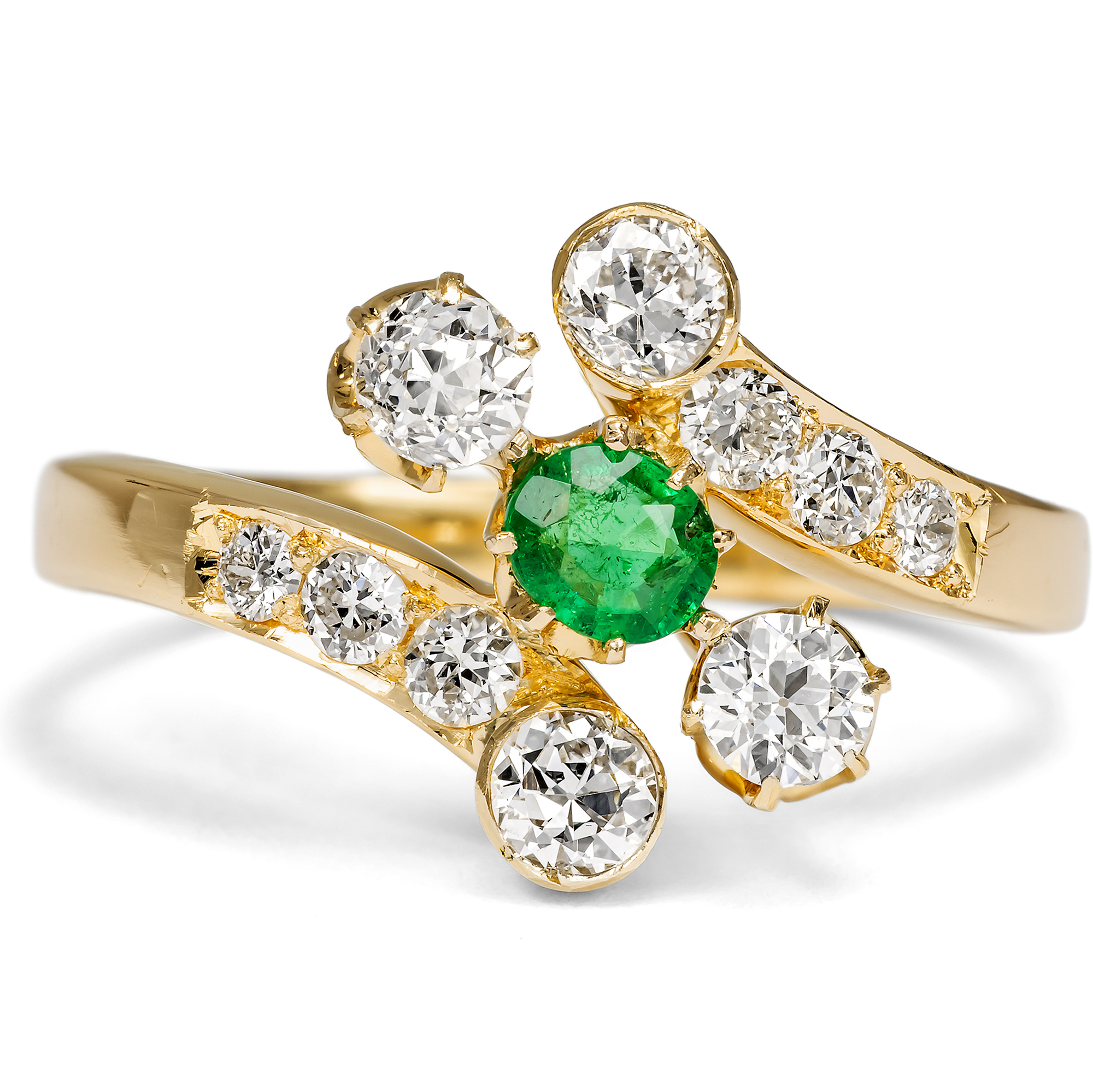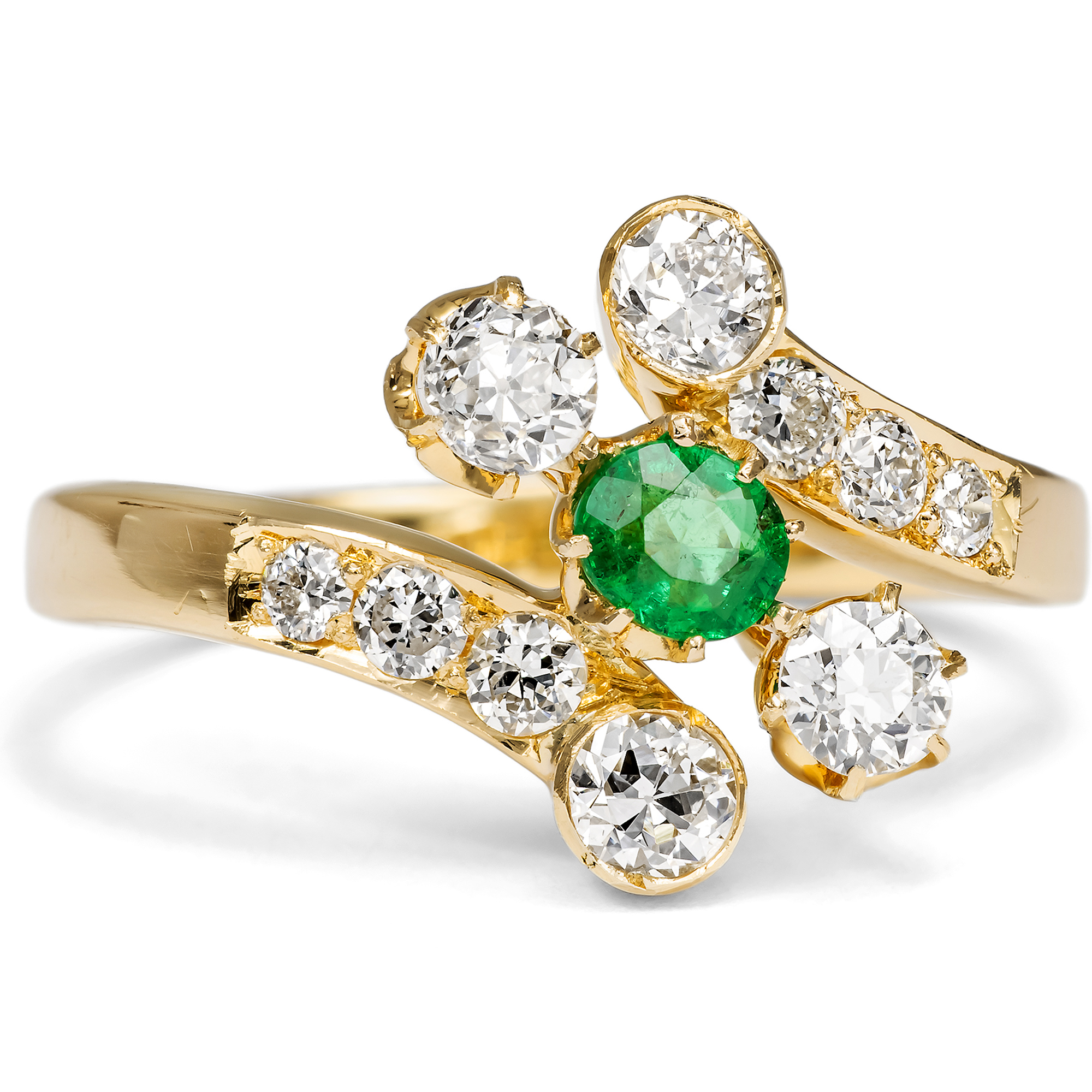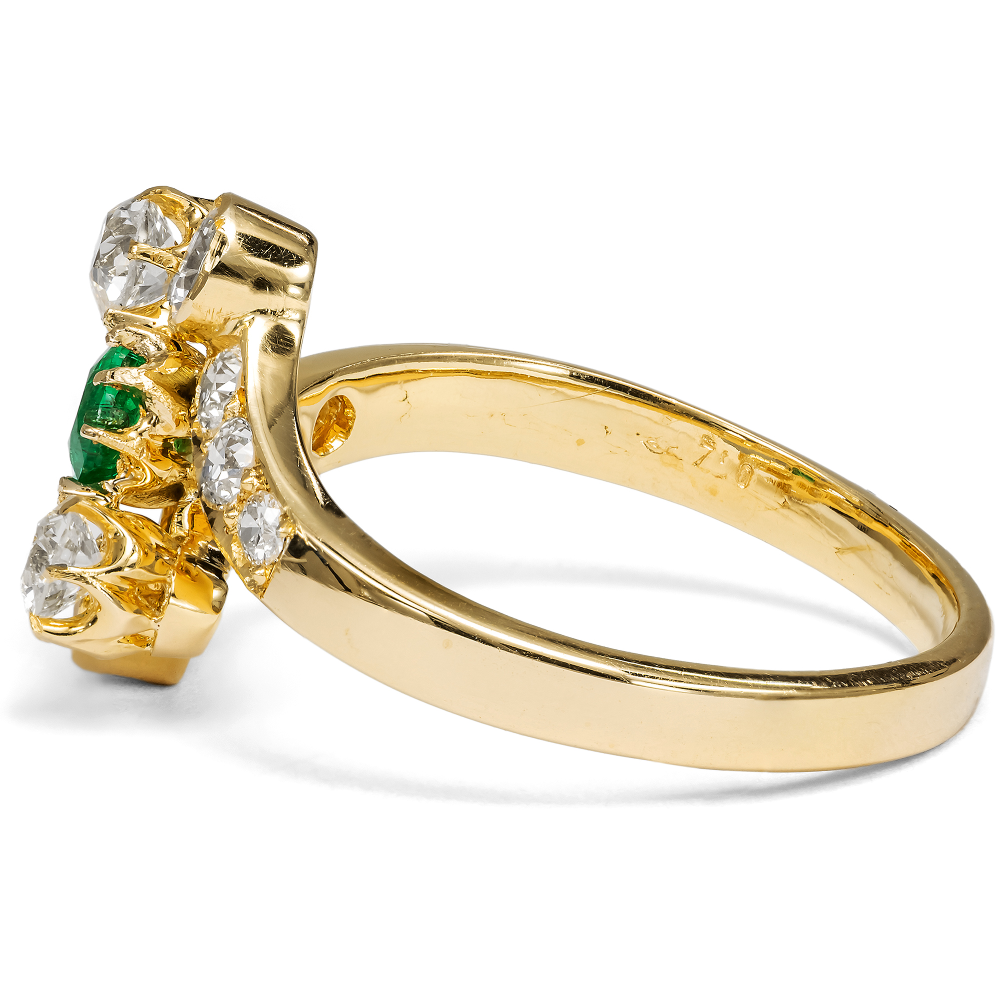 Dieser elegante Ring des späten 19. Jahrhunderts präsentiert in seiner Mitte einen oval facettierten Smaragd aus Kolumbien von lebhaft grüner Farbe in einer goldenen Krappenfassung. Begleitet wird der kostbare Edelstein von zwei großen Diamanten im Altschliff von sehr guter Qualität. Gefasst sind alle Steine in hochkarätiges Gold. Jeder der hier verarbeiteten Edelsteine ist handgeschliffen und individuell geformt, was den Reiz des Ringes ausmacht und ihn klar von modernen Juwelenarbeiten unterscheidet. Das Arrangement als den drei mittleren Steinen wird von einer geschwungenen Ringschiene gehalten. Hier sind weitere acht Diamanten eingelassen, sodass insgesamt etwa ein Karat Diamanten in diesem Ring verarbeitet ist. Der Smaragd gehört seit jeher zu den beliebtesten Edelsteinen. In der Sprache der Juwelen kommt dem Edelsteinbesatz dieses Ringes neben seiner Schönheit aber auch eine symbolische Bedeutung zu. So steht seit dem Mittelalter der Smaragd wegen seiner frischen Farbe für eine beginnende, junge, sozusagen hoffnungsvoll „ergrünende“ Liebe, während der Diamant die Dauer einer Verbindung versinnbildlicht. So eignet sich der Ring wunderbar als Geschenk an einen Menschen, den man ins Herz geschlossen hat. Der Ring fand hier in Berlin zu uns. Ausweislich seiner Punzierung ist er sehr wahrscheinlich im damaligen Deutschen Kaiserreich entstanden.
