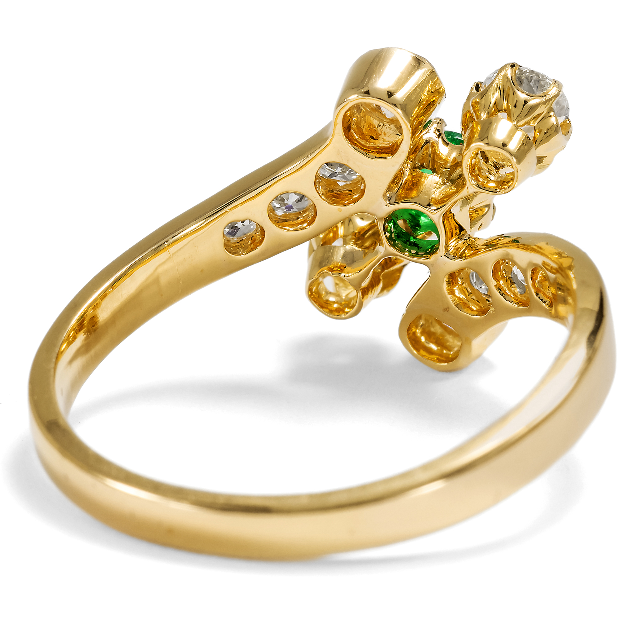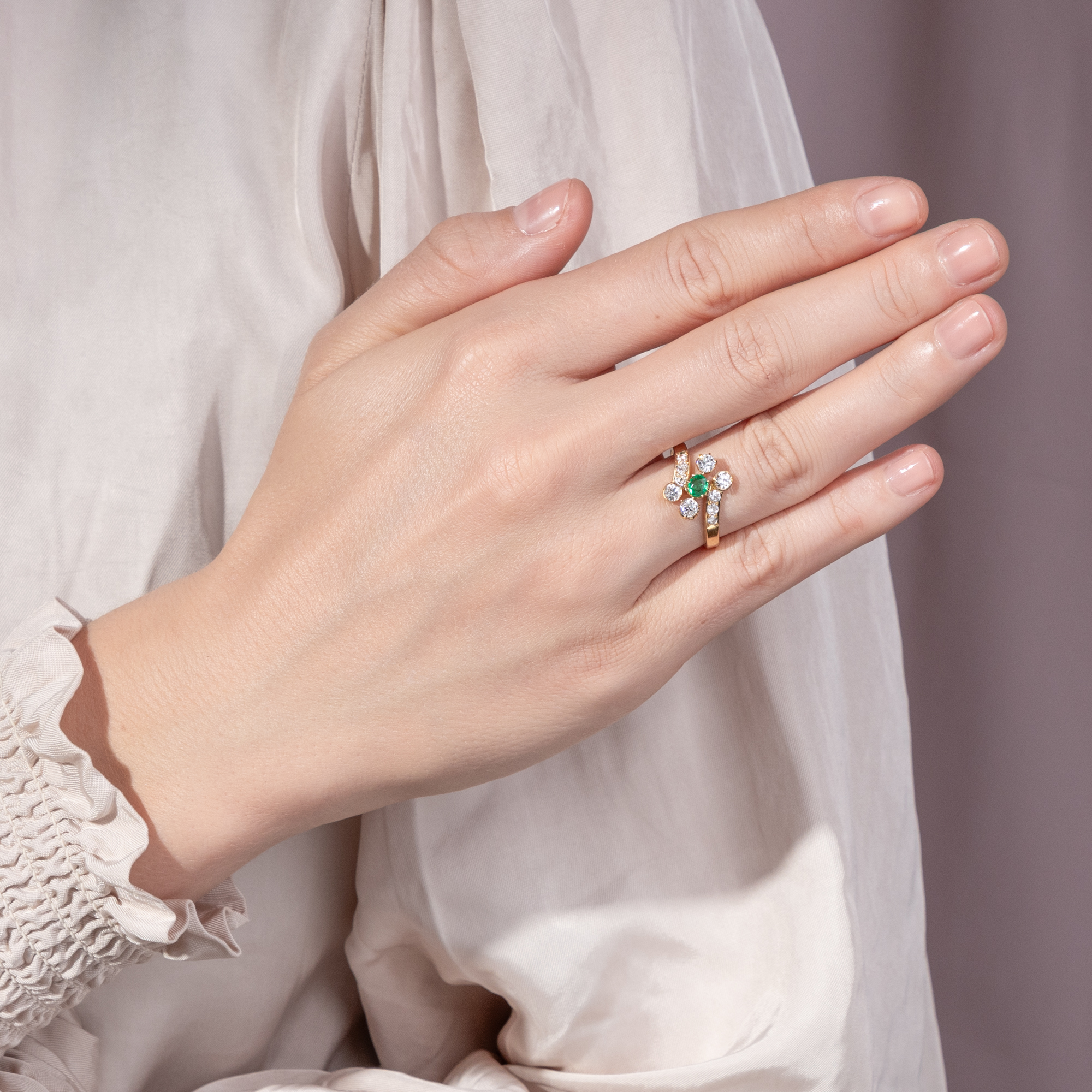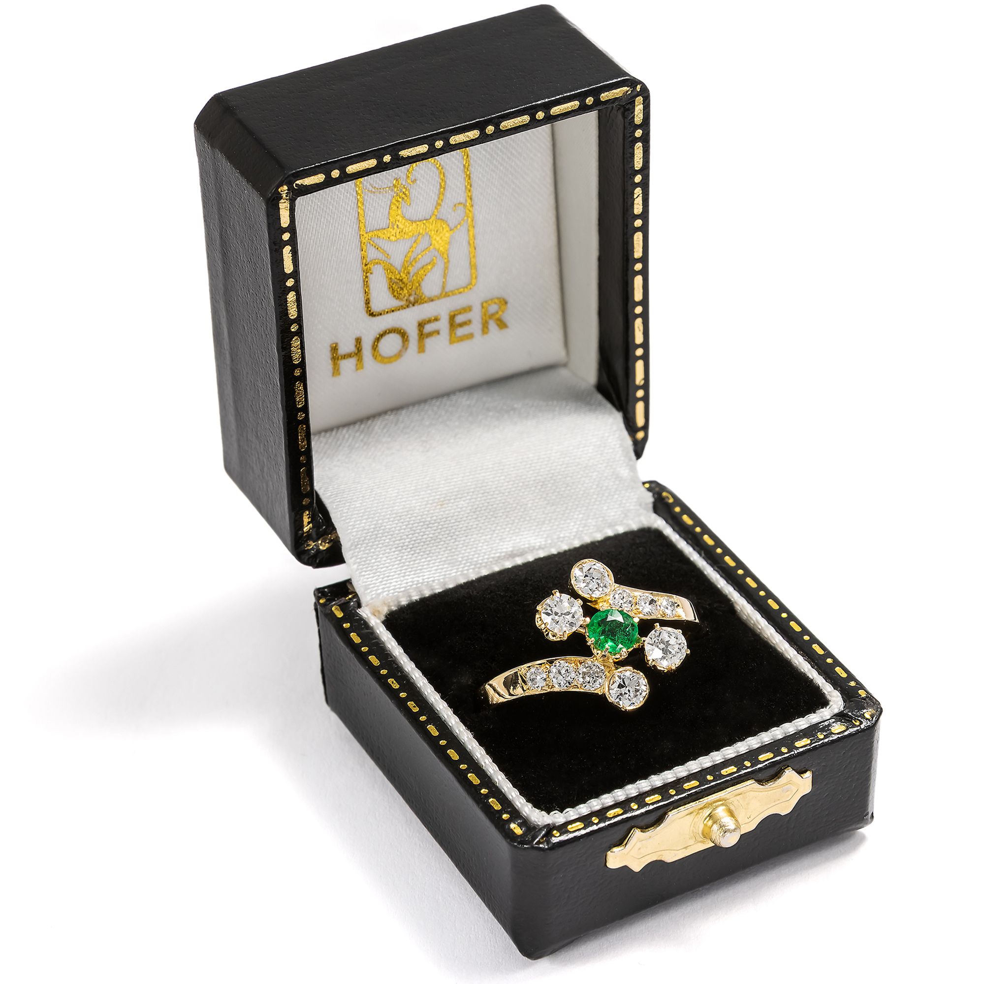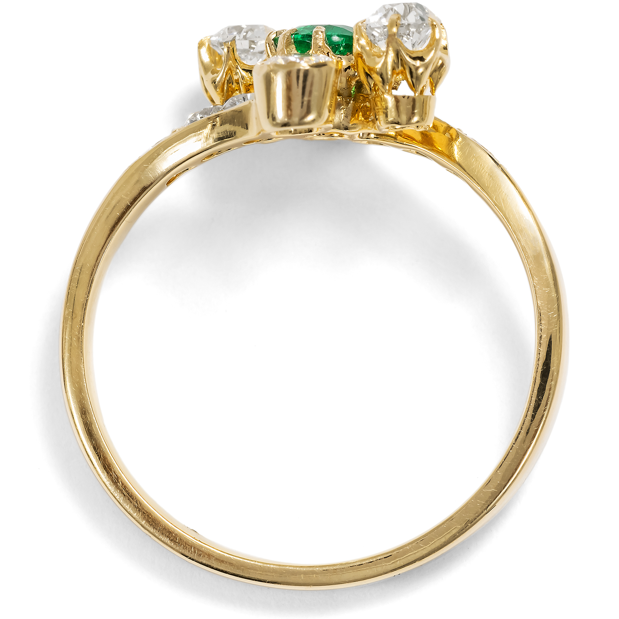 Dieser elegante Ring des späten 19. Jahrhunderts präsentiert in seiner Mitte einen oval facettierten Smaragd aus Kolumbien von lebhaft grüner Farbe in einer goldenen Krappenfassung. Begleitet wird der kostbare Edelstein von zwei großen Diamanten im Altschliff von sehr guter Qualität. Gefasst sind alle Steine in hochkarätiges Gold. Jeder der hier verarbeiteten Edelsteine ist handgeschliffen und individuell geformt, was den Reiz des Ringes ausmacht und ihn klar von modernen Juwelenarbeiten unterscheidet. Das Arrangement als den drei mittleren Steinen wird von einer geschwungenen Ringschiene gehalten. Hier sind weitere acht Diamanten eingelassen, sodass insgesamt etwa ein Karat Diamanten in diesem Ring verarbeitet ist. Der Smaragd gehört seit jeher zu den beliebtesten Edelsteinen. In der Sprache der Juwelen kommt dem Edelsteinbesatz dieses Ringes neben seiner Schönheit aber auch eine symbolische Bedeutung zu. So steht seit dem Mittelalter der Smaragd wegen seiner frischen Farbe für eine beginnende, junge, sozusagen hoffnungsvoll „ergrünende“ Liebe, während der Diamant die Dauer einer Verbindung versinnbildlicht. So eignet sich der Ring wunderbar als Geschenk an einen Menschen, den man ins Herz geschlossen hat. Der Ring fand hier in Berlin zu uns. Ausweislich seiner Punzierung ist er sehr wahrscheinlich im damaligen Deutschen Kaiserreich entstanden.