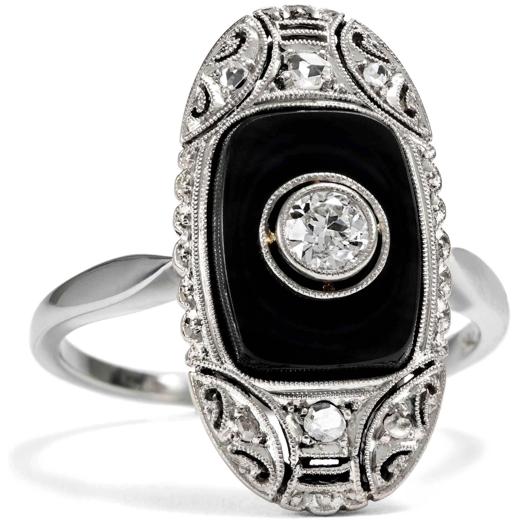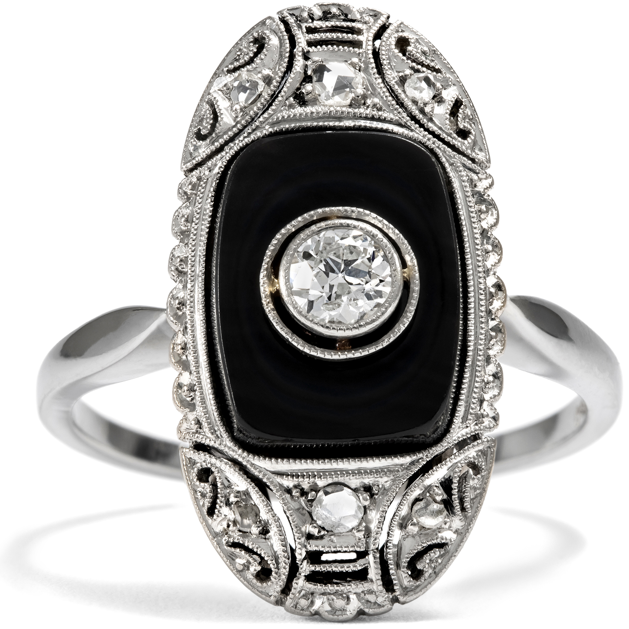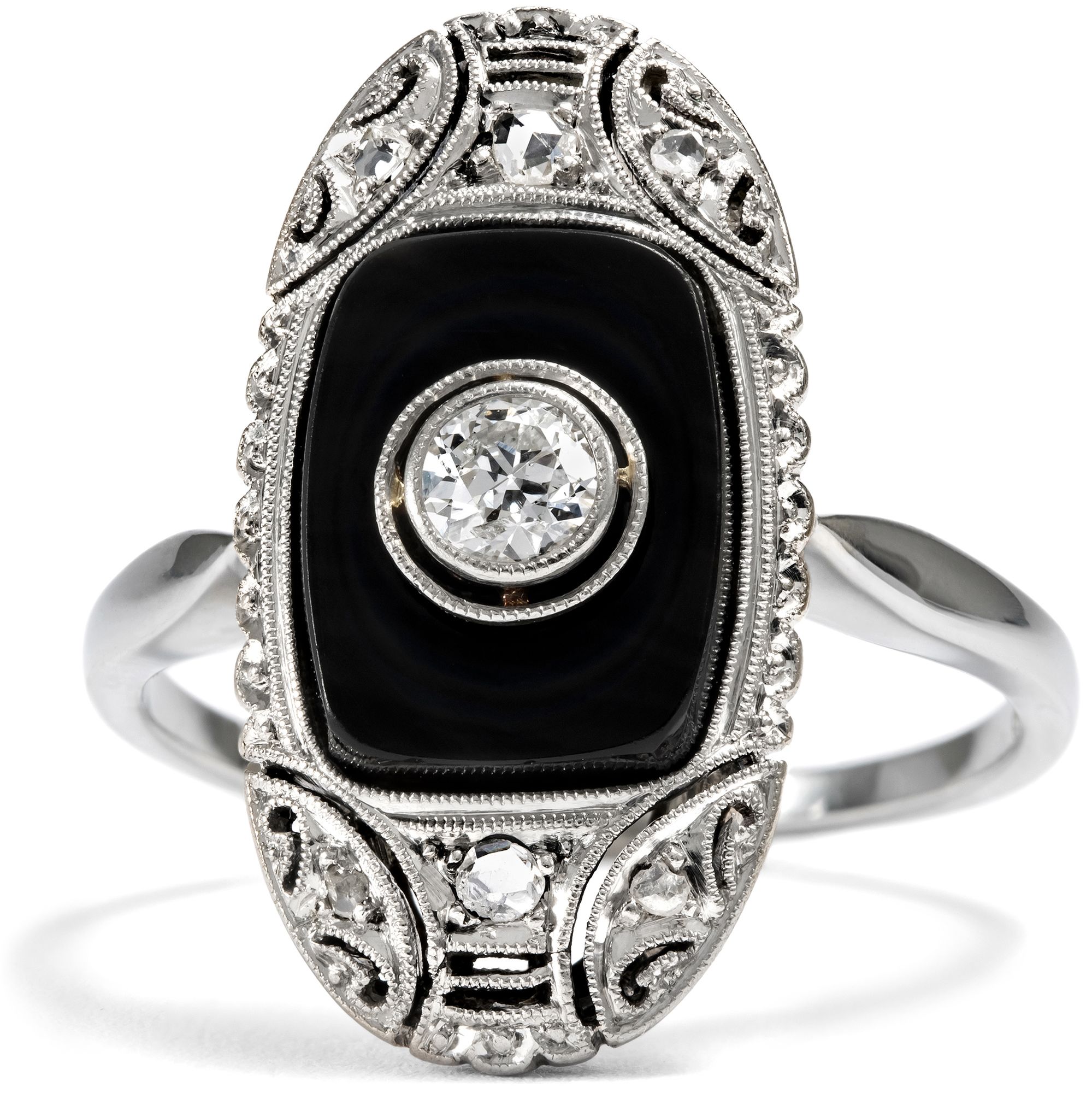 Die Farbe Schwarz, einst der Trauer vorbehalten, avancierte im frühen 20. Jahrhundert zur eleganten Modefarbe. Bereits um 1920 finden wir in antiken Schmuckkatalogen erste Schmuckstücke, die Onyx zu ihrem Hauptstein machten. Schnell entstand ein neuer Ringtypus mit einem polierten Onyx als Ringkopf, in den ein kontrastierender Diamant oder eine Perle eingefasst war. Wie vieles, das heute zeitlos erscheint, galt aber auch der Onyxring einst als ungewöhnlich und gewagt. Noch im Katalog des Jahres 1924 der Firma S. Kind & Sons aus Philadelphia findet sich ein Ring wie der hier vorliegende unter der Überschrift „Odd Jeweled Rings“, übersetzt etwa: Ungewöhnliche edelsteinbesetzte Ringe. Dazu wird bemerkt: „Women who prefer rings that are somewhat different will appreciate the rings on this page“. Bereits im nächsten Katalog für das Jahr 1925 wurde dasselbe Modell aber schon auf der Seite „Richly Jeweled Rings“ angepriesen, auf der Seite mit den populärsten und luxuriösesten Modellen. Der hier vorgestellte Ring ist in genau jenen Jahren entstanden, auch wenn er nicht aus den USA, sondern aus Deutschland stammt, wie die Punze im Ring nahelegt. In seiner Mitte präsentiert der Ring einen Altschliff-Diamanten von etwa 0,15 Karat. Der Diamant ist von weißer Farbe, die im Kontrast zu dem ihn umgebenden schwarzen Onyx wunderbar hell wirkt. Eine aufwändige Rahmung mit Millegriffs und Diamantrosen umgibt das Mittelfeld. Schöne geometrische Ornamente im Zeitgeschmack beleben die Spitzen des schiffchenförmigen Ringkopfs. Der Ring ist sehr gut erhalten. Er fand hier in Berlin zu uns.