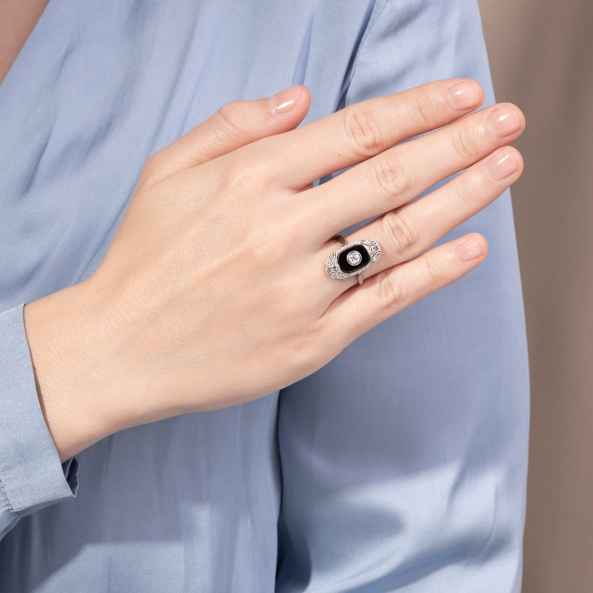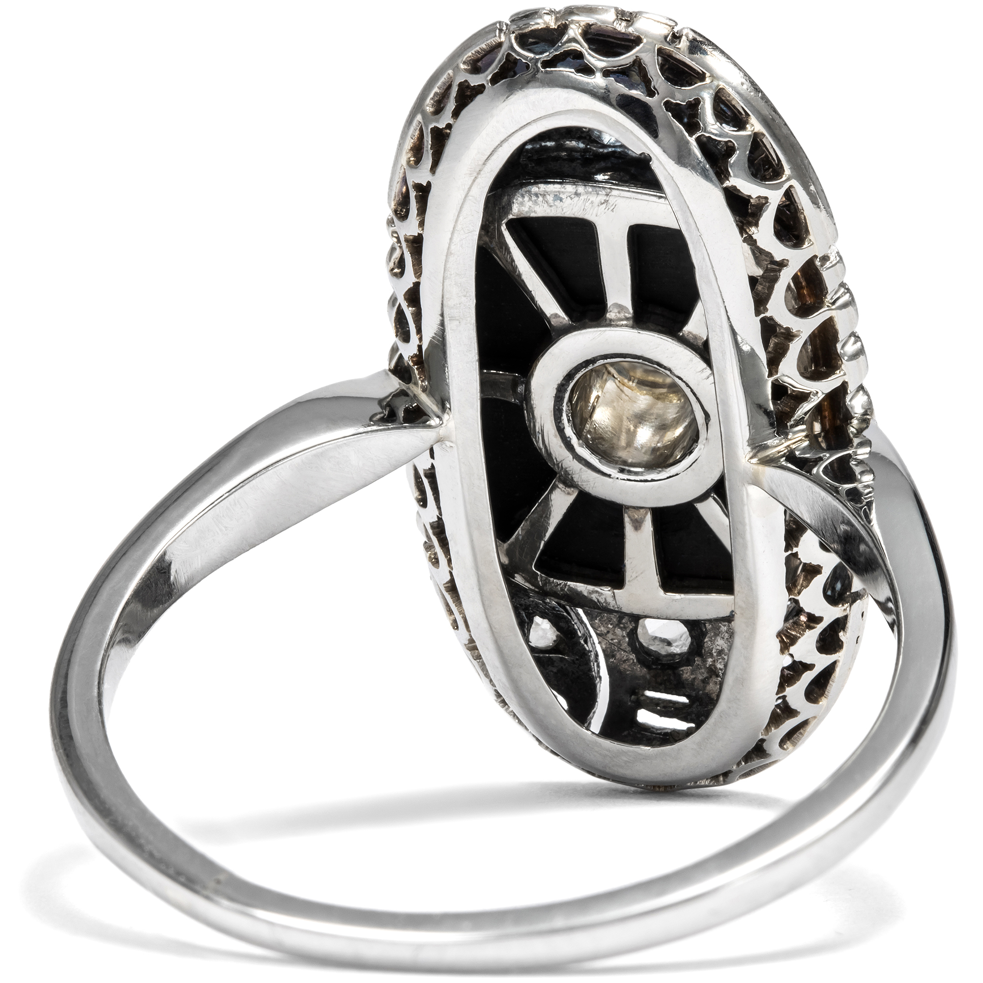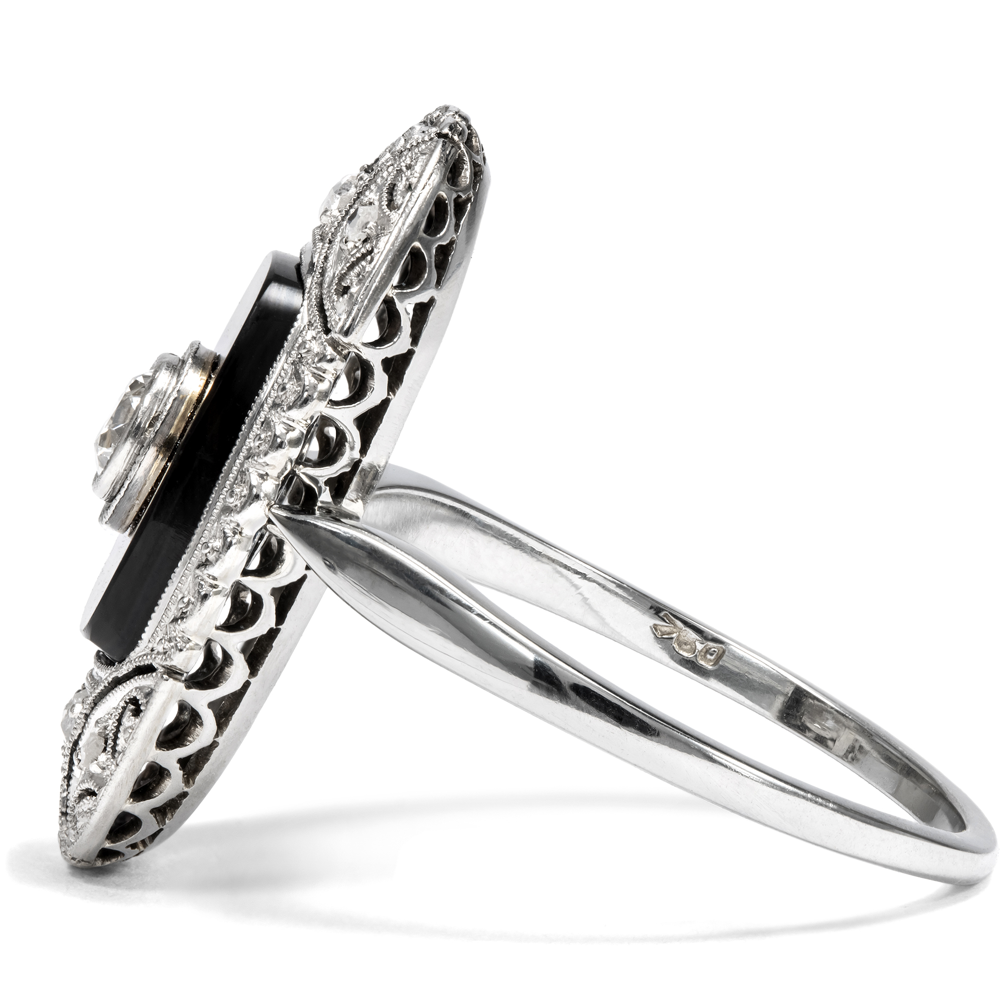 Die Farbe Schwarz, einst der Trauer vorbehalten, avancierte im frühen 20. Jahrhundert zur eleganten Modefarbe. Bereits um 1920 finden wir in antiken Schmuckkatalogen erste Schmuckstücke, die Onyx zu ihrem Hauptstein machten. Schnell entstand ein neuer Ringtypus mit einem polierten Onyx als Ringkopf, in den ein kontrastierender Diamant oder eine Perle eingefasst war. Wie vieles, das heute zeitlos erscheint, galt aber auch der Onyxring einst als ungewöhnlich und gewagt. Noch im Katalog des Jahres 1924 der Firma S. Kind & Sons aus Philadelphia findet sich ein Ring wie der hier vorliegende unter der Überschrift „Odd Jeweled Rings“, übersetzt etwa: Ungewöhnliche edelsteinbesetzte Ringe. Dazu wird bemerkt: „Women who prefer rings that are somewhat different will appreciate the rings on this page“. Bereits im nächsten Katalog für das Jahr 1925 wurde dasselbe Modell aber schon auf der Seite „Richly Jeweled Rings“ angepriesen, auf der Seite mit den populärsten und luxuriösesten Modellen. Der hier vorgestellte Ring ist in genau jenen Jahren entstanden, auch wenn er nicht aus den USA, sondern aus Deutschland stammt, wie die Punze im Ring nahelegt. In seiner Mitte präsentiert der Ring einen Altschliff-Diamanten von etwa 0,15 Karat. Der Diamant ist von weißer Farbe, die im Kontrast zu dem ihn umgebenden schwarzen Onyx wunderbar hell wirkt. Eine aufwändige Rahmung mit Millegriffs und Diamantrosen umgibt das Mittelfeld. Schöne geometrische Ornamente im Zeitgeschmack beleben die Spitzen des schiffchenförmigen Ringkopfs. Der Ring ist sehr gut erhalten. Er fand hier in Berlin zu uns.