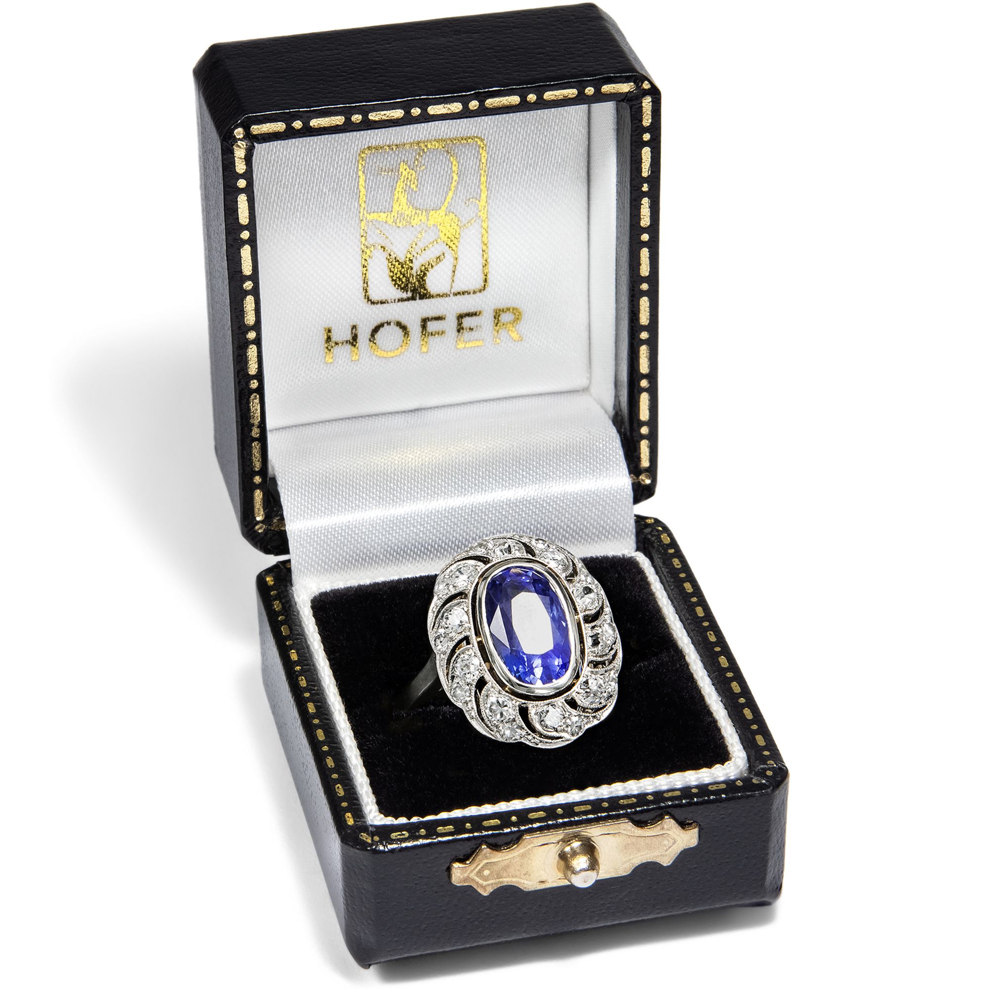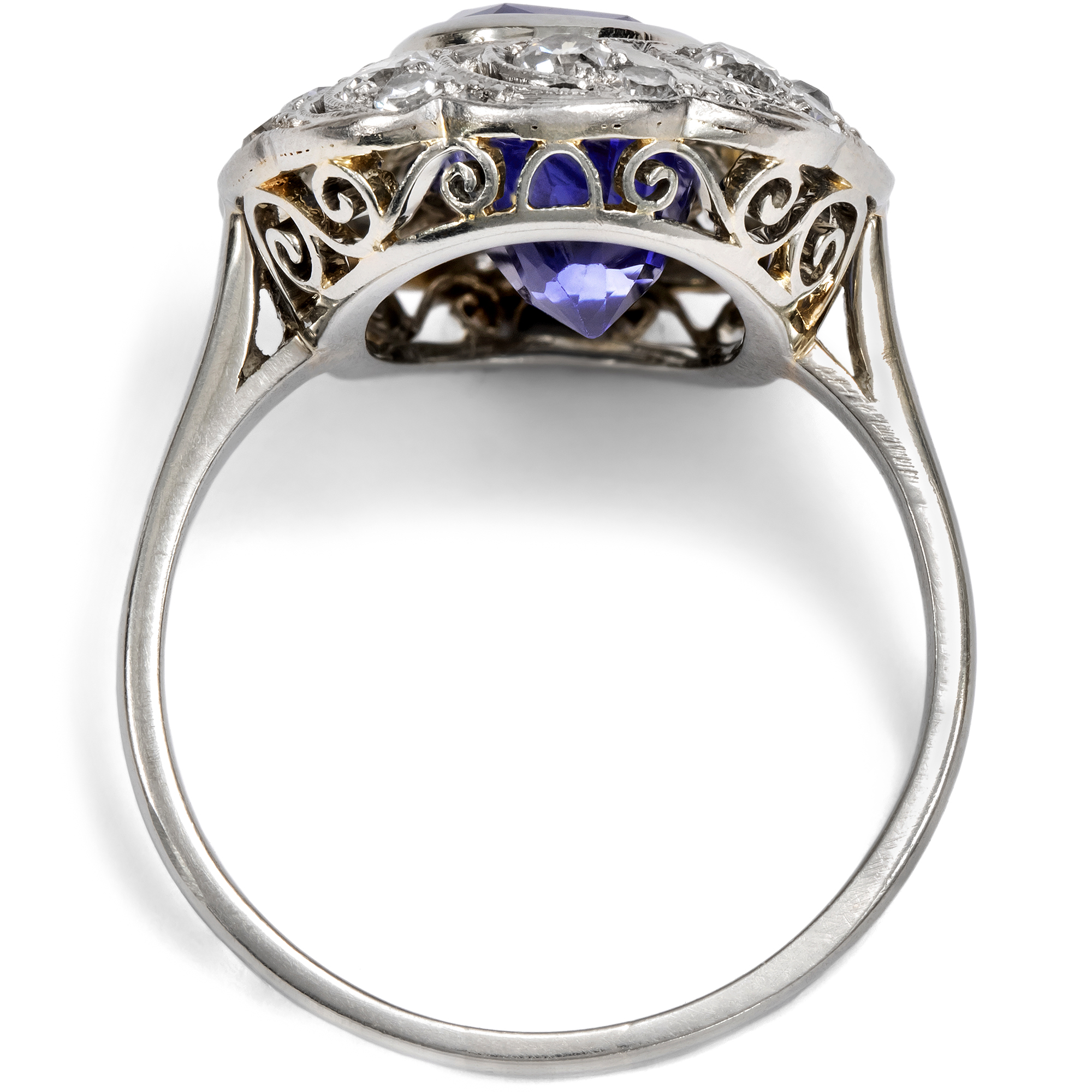 Zu Beginn des 20. Jahrhunderts war die Modefarbe für hochwertigen Juwelenschmuck: Weiß! Diamanten und edelste Edelsteine wurden in weißes Metall gefasst, um einen kühlen, eleganten Look zu erzielen. Hierzu griffen die Goldschmiede, wie schon im 19. Jahrhundert, zunächst auf Silber zurück und zunehmend auf Platin. 1912 gelang es dann der deutschen Firma Dr. Richter & Cie. aus Pforzheim, Weißgold herzustellen – das sogenannte „Weißgold Dorico“, das zu dieser Zeit eine wahre Sensation darstellte: „Weiß ist heute das Losungswort, Weiß ist Mode“, ließ die Leipziger Uhrmacherzeitung 1912 zum neuen Weißgold verkünden. Der hier vorliegende Ring aus den frühen 1920er Jahren ist aus diesem neuartigen Material gefertigt. Im Zentrum des Rings befindet sich ein kostbarer Saphir. Der Stein wiegt rund fünf Karat und ist ein natürlich gewachsener, unbehandelter Saphir von außergewöhnlicher Klarheit und intensiver Farbe. Er strahlt in einem lebendigen Himmelblau – genau im richtigen Maß, ohne zu dunkel zu erscheinen. Dass der Saphir unbehandelt ist, macht seine besondere Qualität und Seltenheit aus, da die Farbe nicht durch künstliche Verfahren verändert wurde. Zwanzig Diamanten in verschiedenen alten Schliffen umgeben den Saphir wie die Blätter einer Blüte. Nur unter der Lupe erkennt man, dass die Diamanten in eine dünne Platte aus Platin gefasst sind, die auf das Weißgold aufgewalzt wurde. Die ersten Weißgoldlegierungen hatten häufig einen leicht warmen Farbton. Die Kombination mit Platin ergab einen noch weißeren Eindruck. Diese Kombination ist daher ein charakteristisches Merkmal des frühen Weißgoldschmucks. Noch unter der Lupe zeigt sich, dass einige Diamanten deutlich älter sind als der Ring selbst. Ihre Schliffe weisen darauf hin, dass sie aus einem älteren Schmuckstück entnommen wurden, um hier ein neues Leben zu beginnen. Es ist möglich, dass auch der Saphir aus dem gleichen Schmuckstück stammt. In der wirtschaftlich angespannten Zeit nach dem Ersten Weltkrieg war es nicht unüblich, Edelsteine und Diamanten wiederzuverwenden und in neuen, zeitgemäßen Schmuckstücken einzusetzen. Das Besondere an diesem Ring ist, dass er die Umstände seiner Entstehungszeit beim ersten Blick völlig vergessen lässt. Die feine Handwerkskunst, die Qualität der verwendeten Materialien und der durchdachte, elegante Entwurf verbinden sich zu einem wunderbaren, kostbaren Schmuckstück, das von Glanz und Schönheit, von Festen und Glück erzählt. Uns hat es sofort verzaubert. Ein unabhängiges Gutachten hat die Qualität der Materialien bestätigt und liegt dem Ring bei.